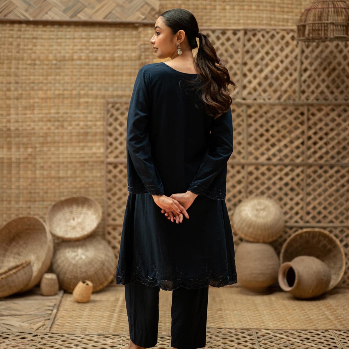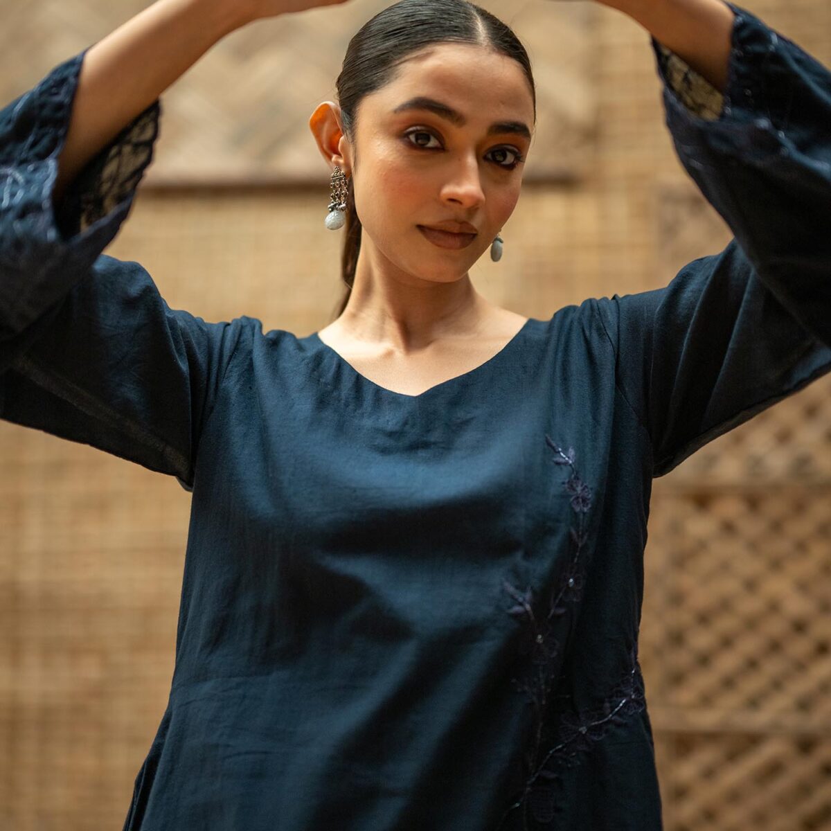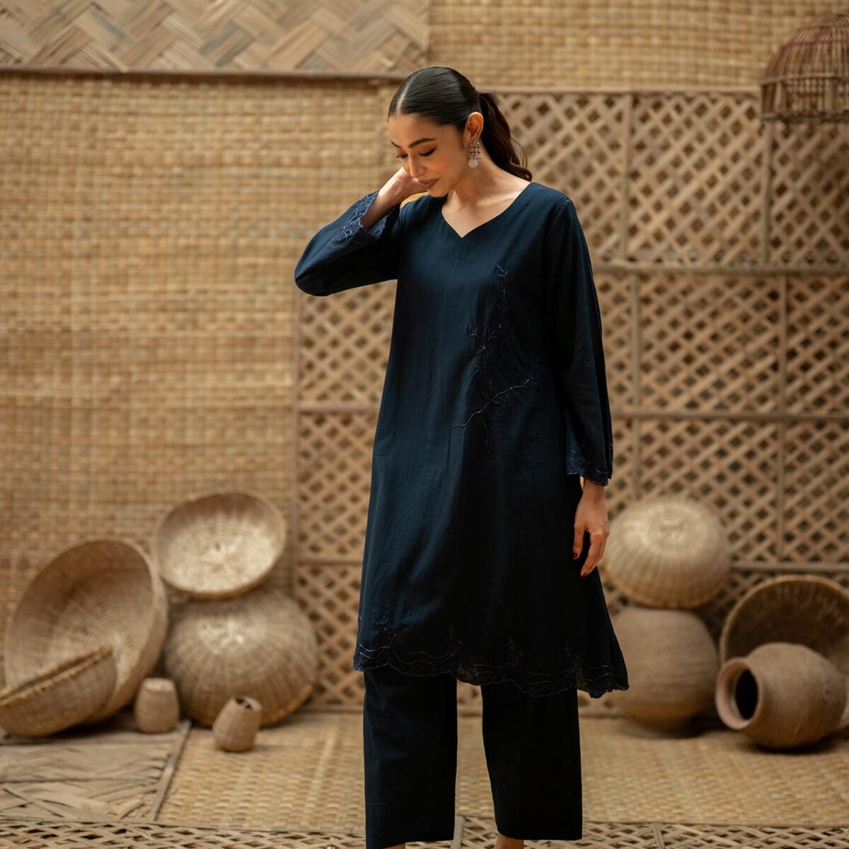 Product Description: Relaxed fit kurta set with beaded cutwork hemline, hand embroidered with thread and bugles. The kurta is paired with relaxed fit pants.
