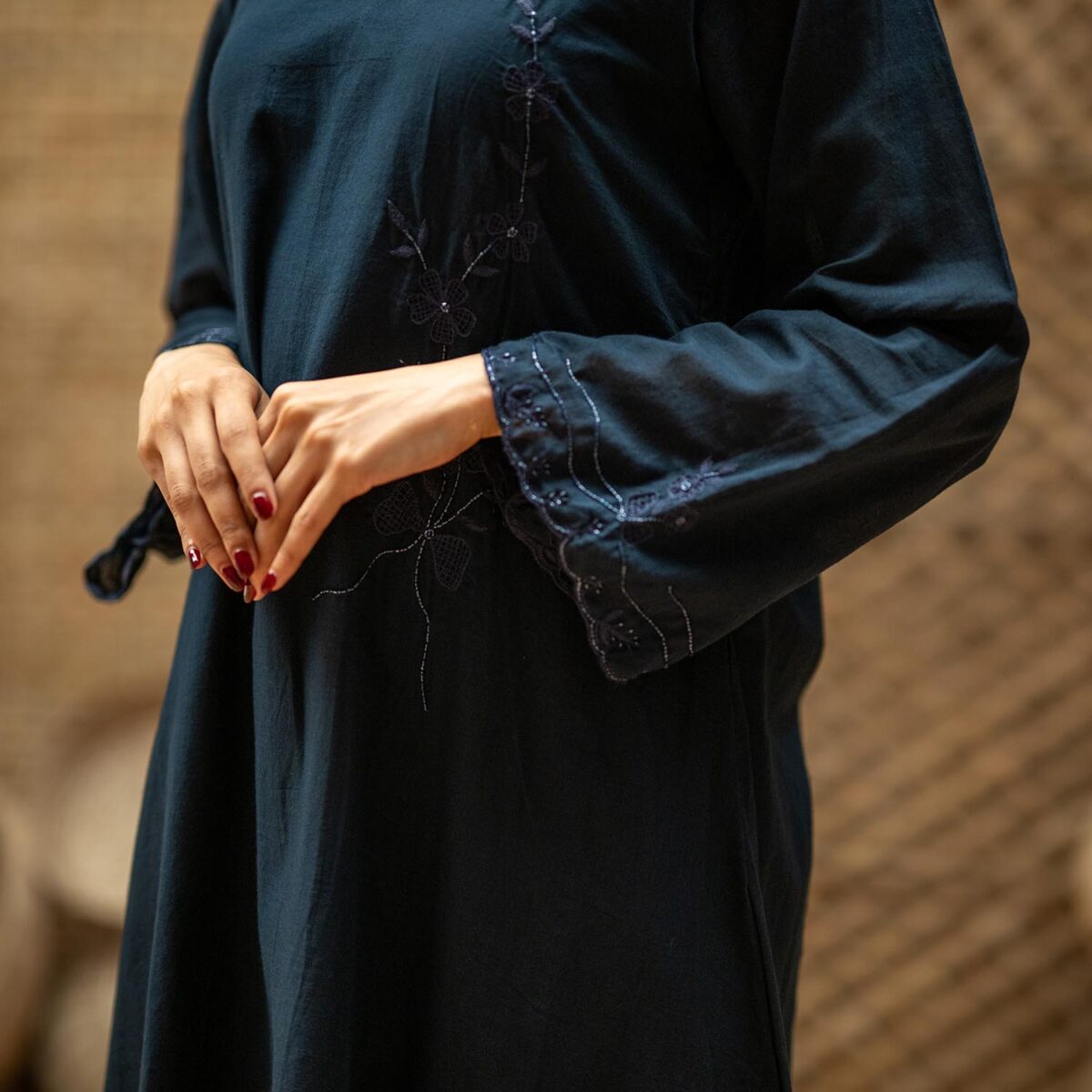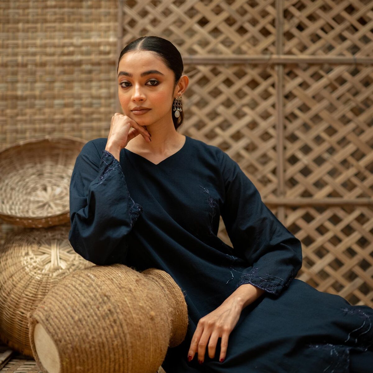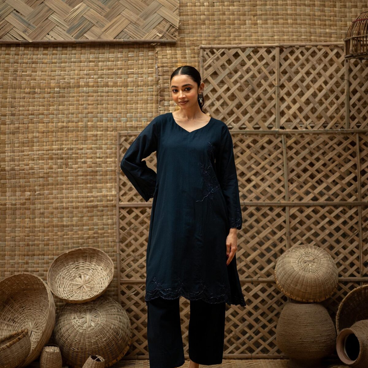 Product Description: Relaxed fit kurta set with beaded cutwork hemline, hand embroidered with thread and bugles. The kurta is paired with relaxed fit pants.
