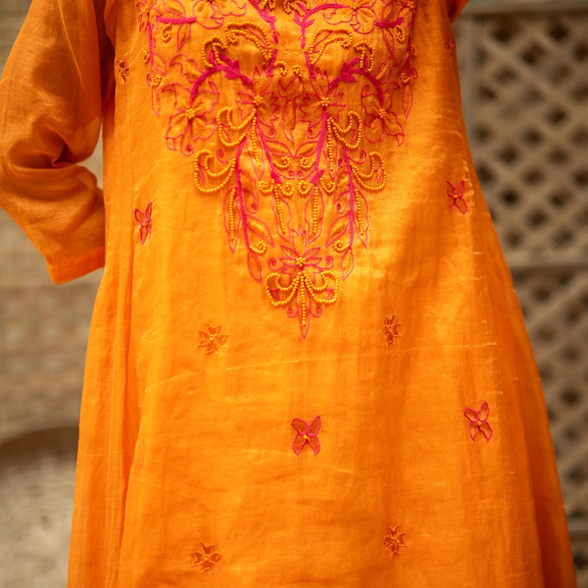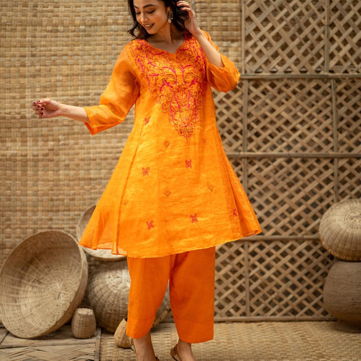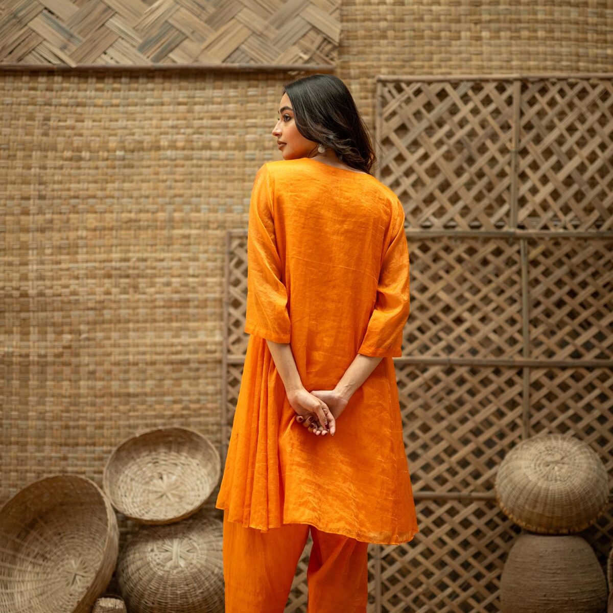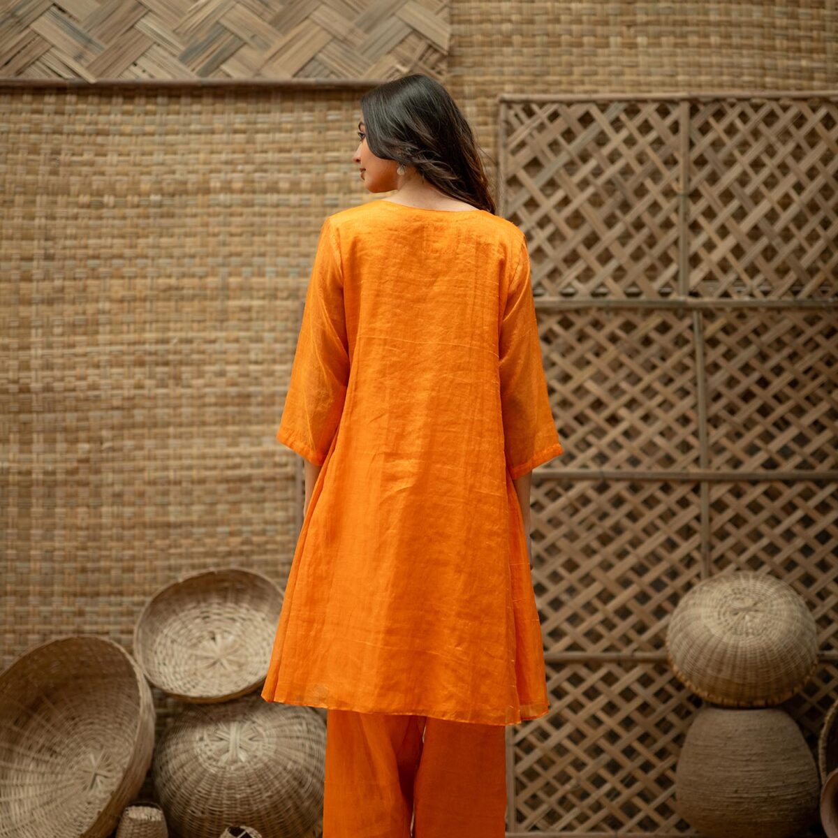 Product Description: Embroidered Tissue Silk kurta- Set of 2, a bold, layered two-piece that celebrates structure ornamentation in beads: the tissue silk kurta opens the set with concentrated embroidery, sculptural A line, a V-neckline and 3/4th sleeves that combine traditional form with modern edge; paired with tissue silk pants that echo the kurta’s finish. The Embroidered Tissue Silk kurta- Set of 2 is crafted for moments that call for confident color, tactile contrasts, and a tailored yet ornate presence.