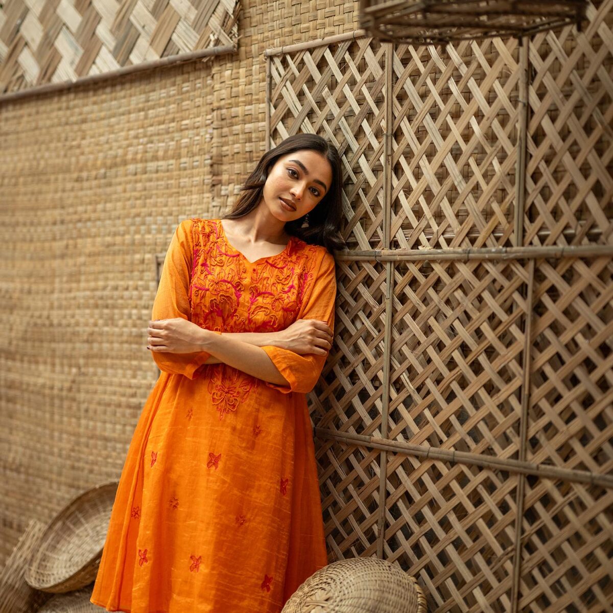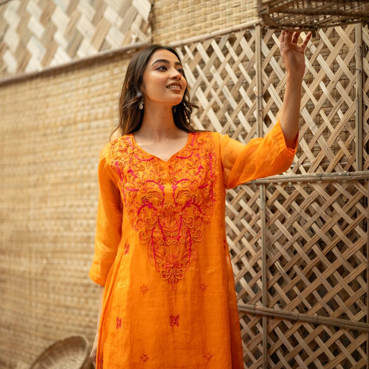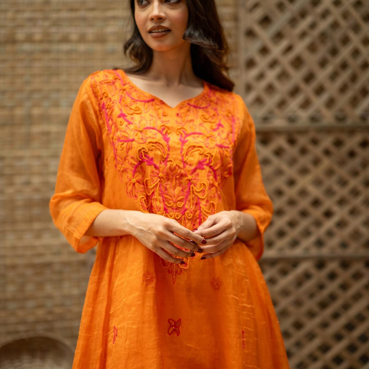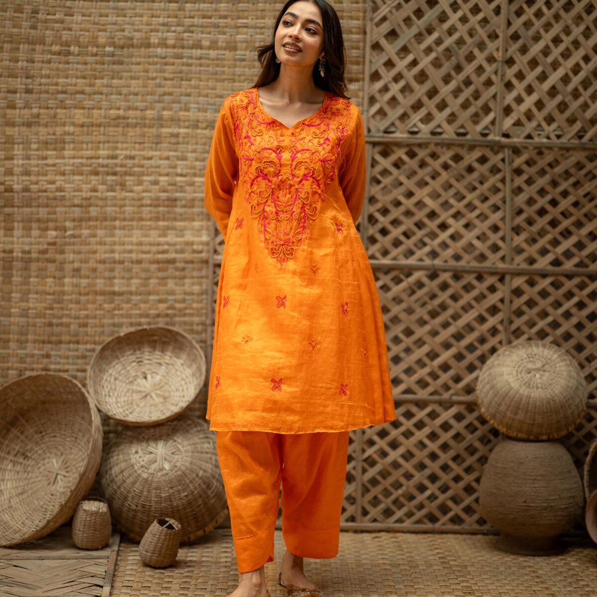 Product Description: Embroidered Tissue Silk kurta- Set of 2, a bold, layered two-piece that celebrates structure ornamentation in beads: the tissue silk kurta opens the set with concentrated embroidery, sculptural A line, a V-neckline and 3/4th sleeves that combine traditional form with modern edge; paired with tissue silk pants that echo the kurta’s finish. The Embroidered Tissue Silk kurta- Set of 2 is crafted for moments that call for confident color, tactile contrasts, and a tailored yet ornate presence.
