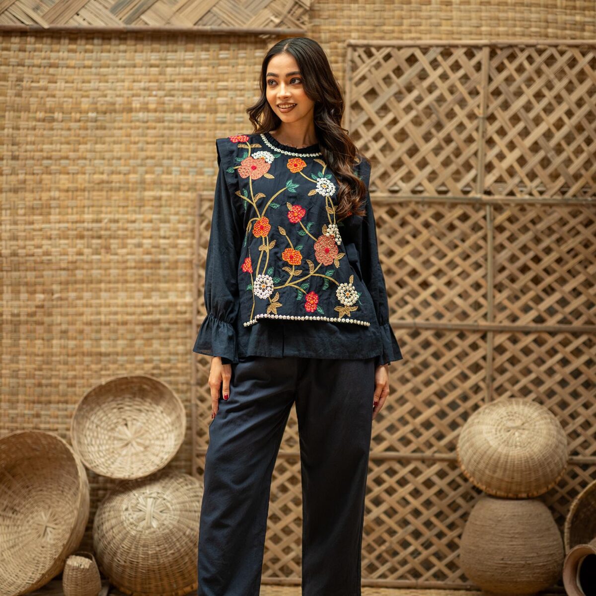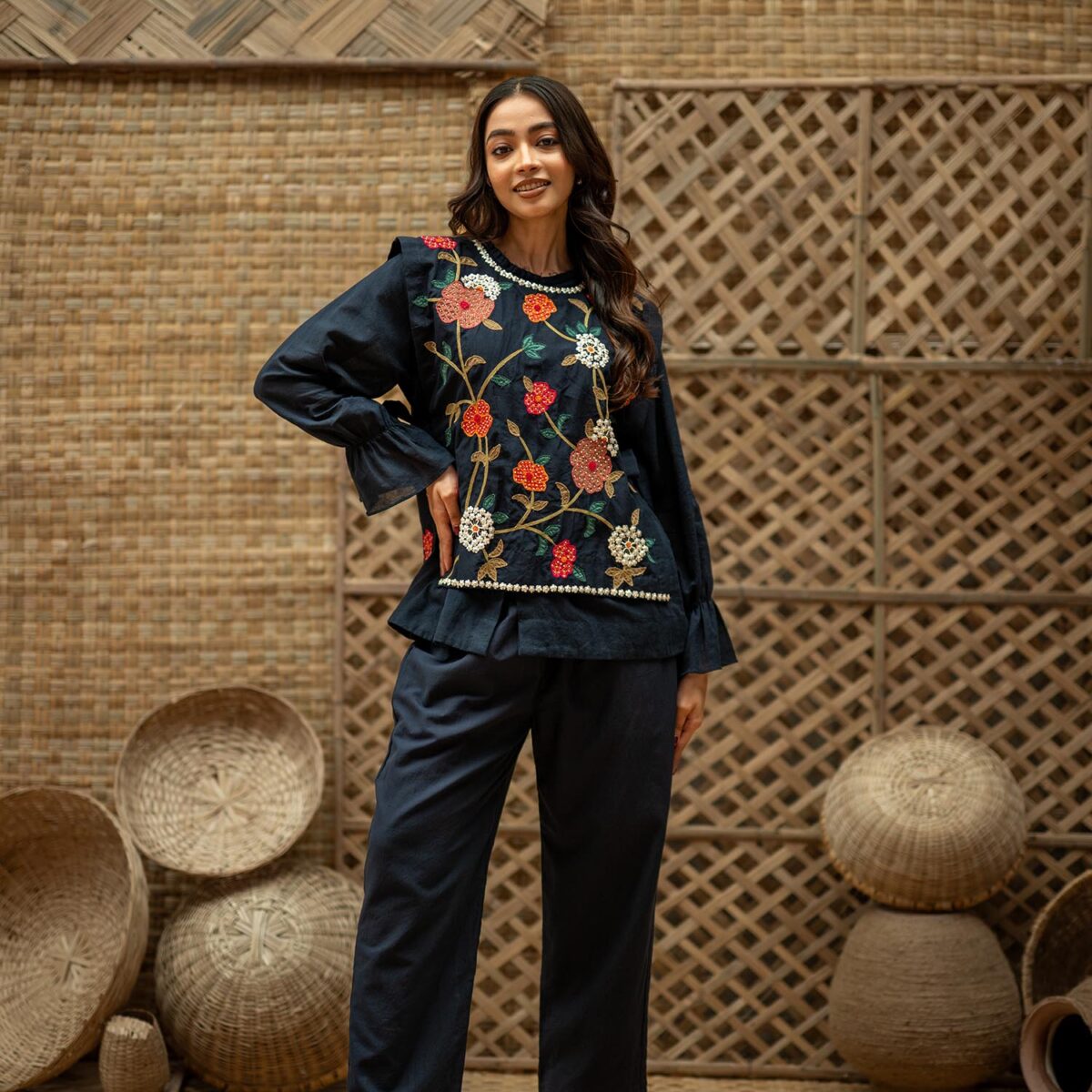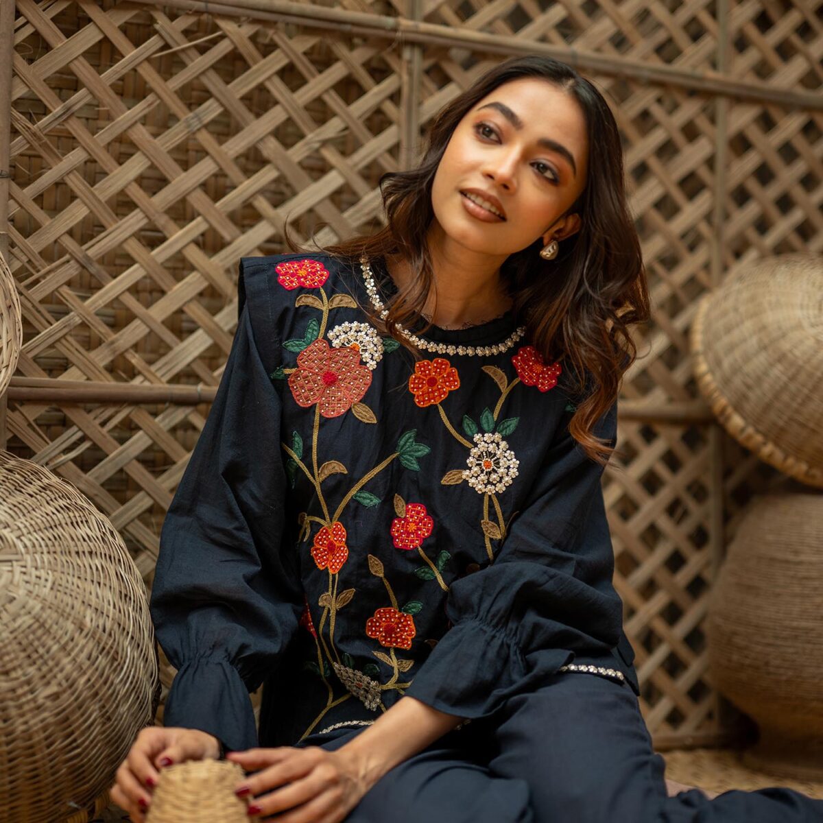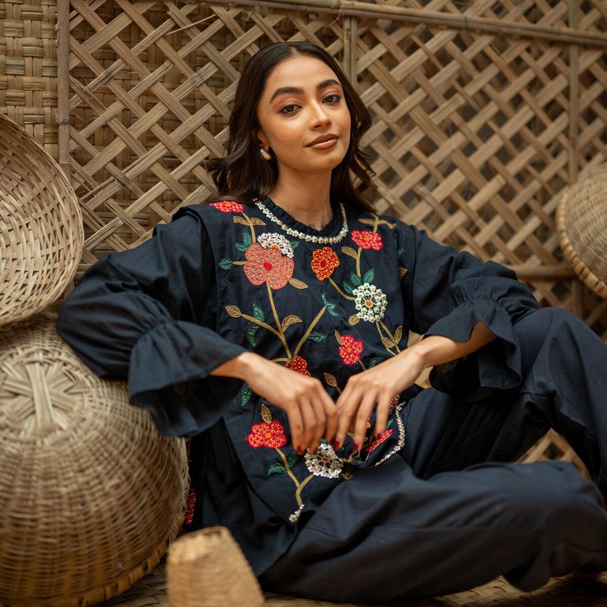 Product Description: Floral Applique and sequin hand embroidered overgarment, with a classic round ruffle neckline shirt and parallel fit trousers, this coord set is a complete 3 piece ensemble perfect for your festive parties.