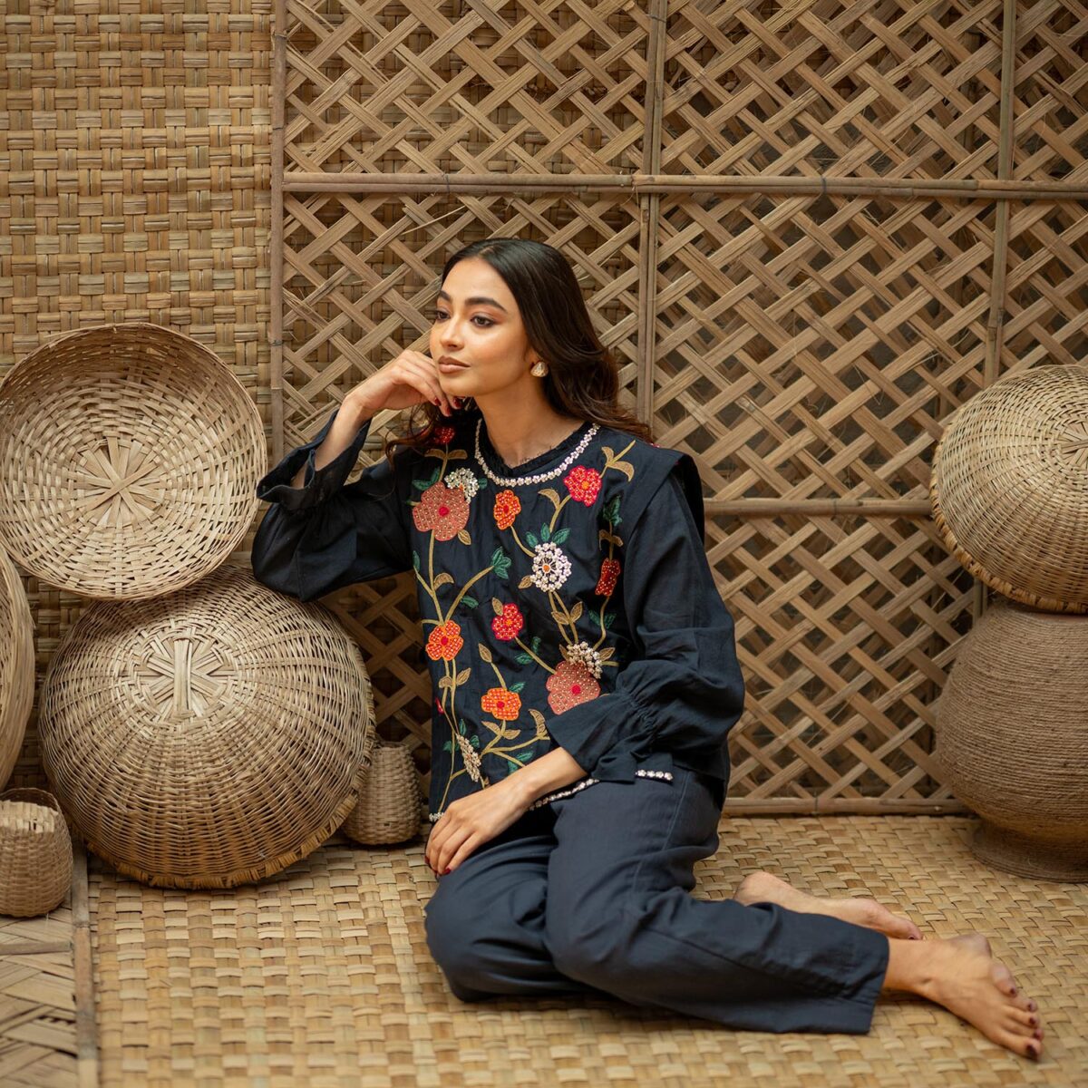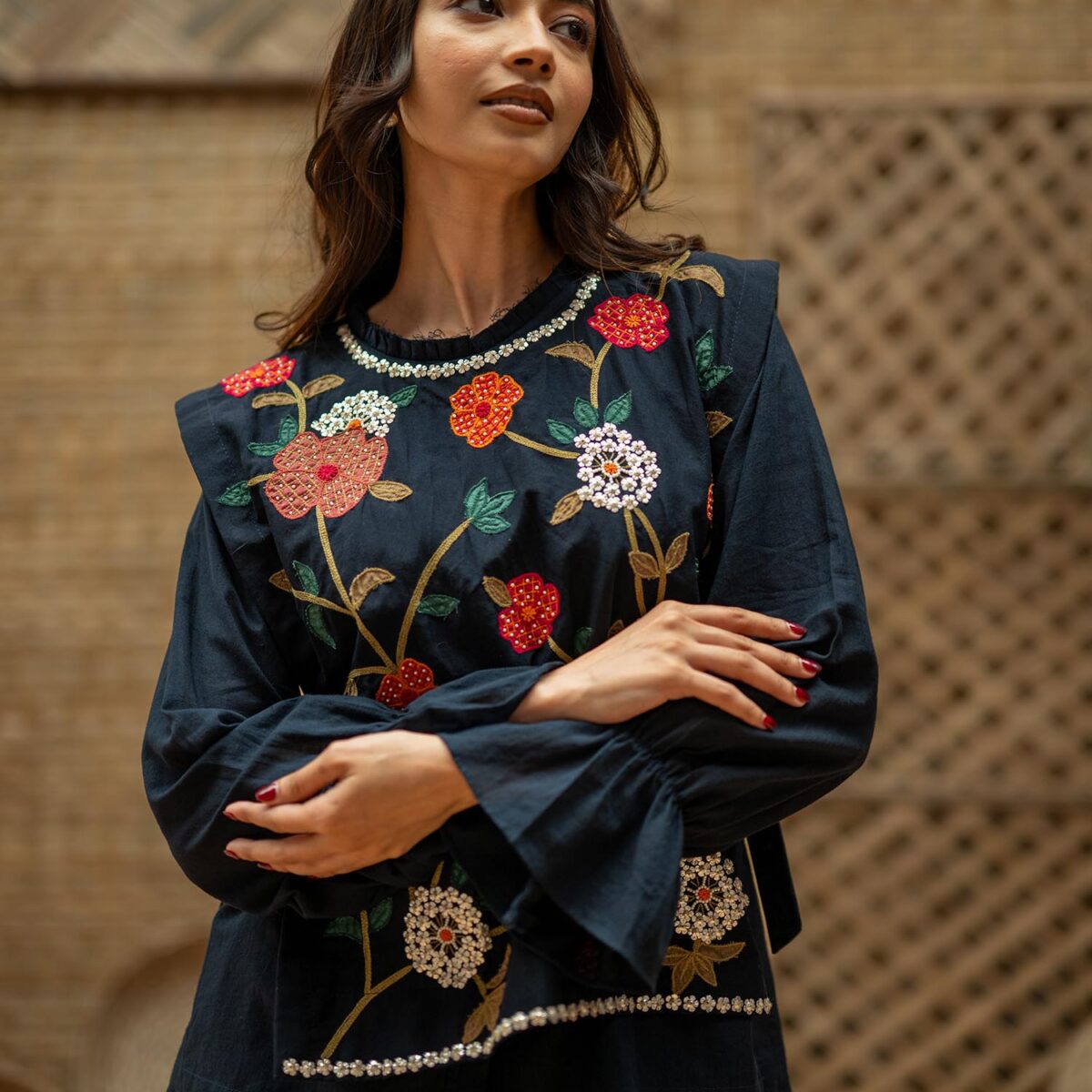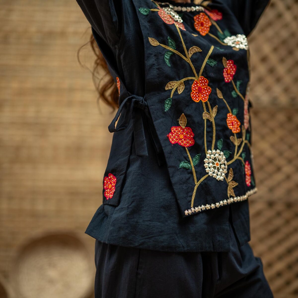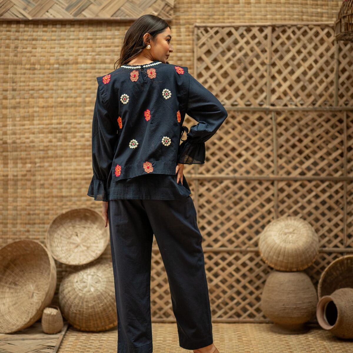 Product Description: Floral Applique and sequin hand embroidered overgarment, with a classic round ruffle neckline shirt and parallel fit trousers, this coord set is a complete 3 piece ensemble perfect for your festive parties.