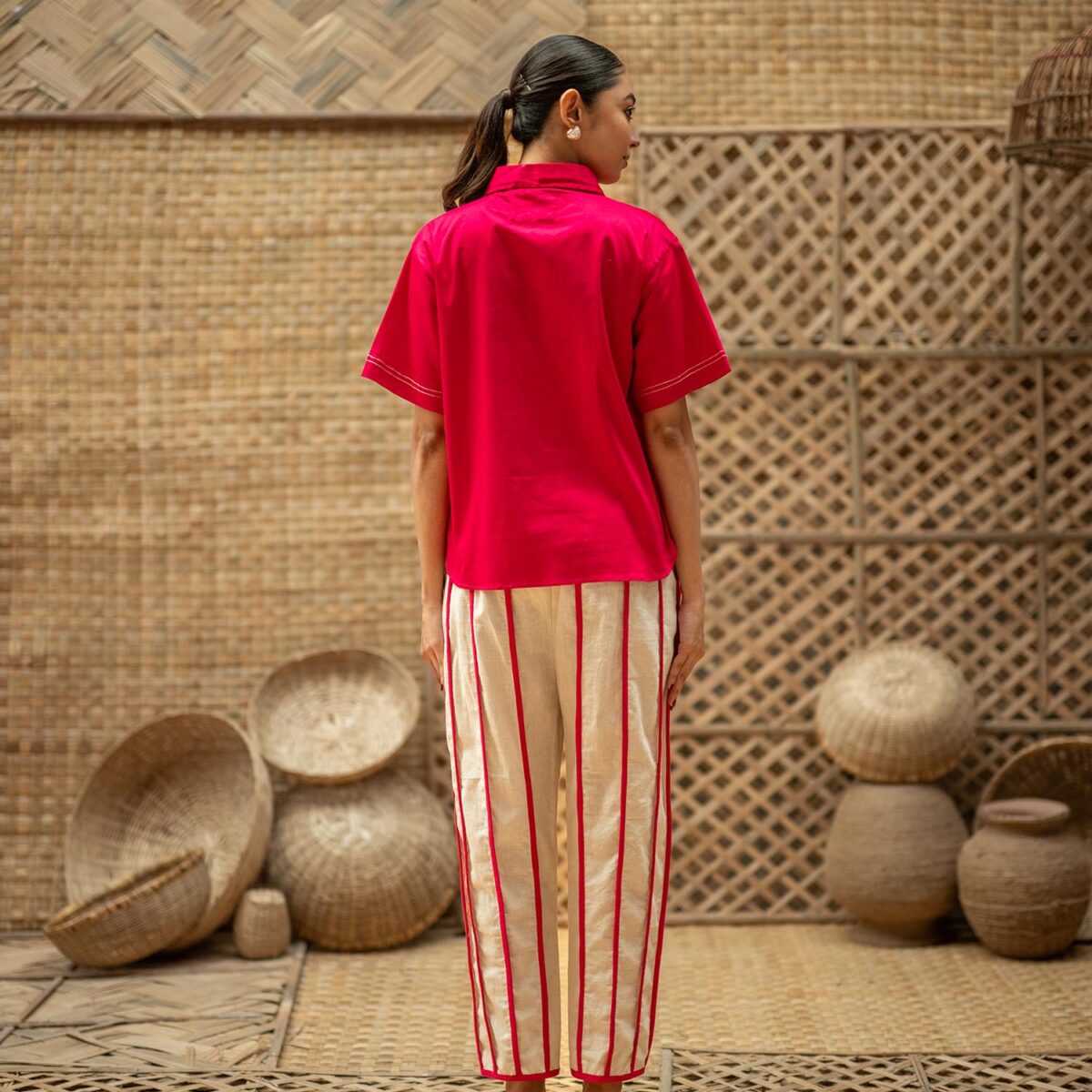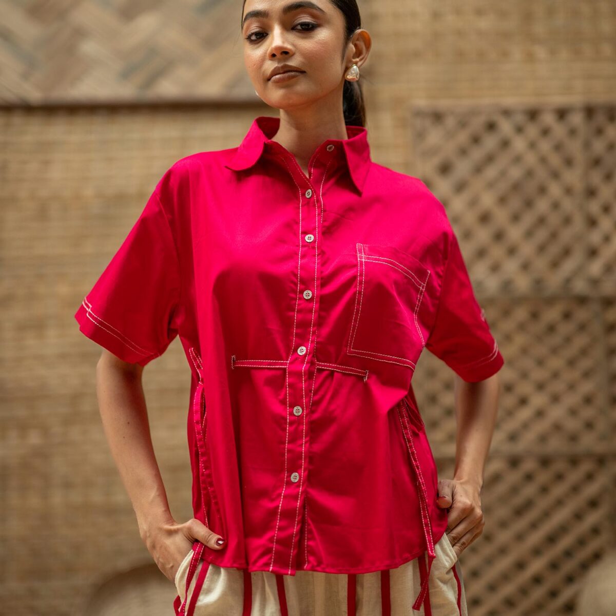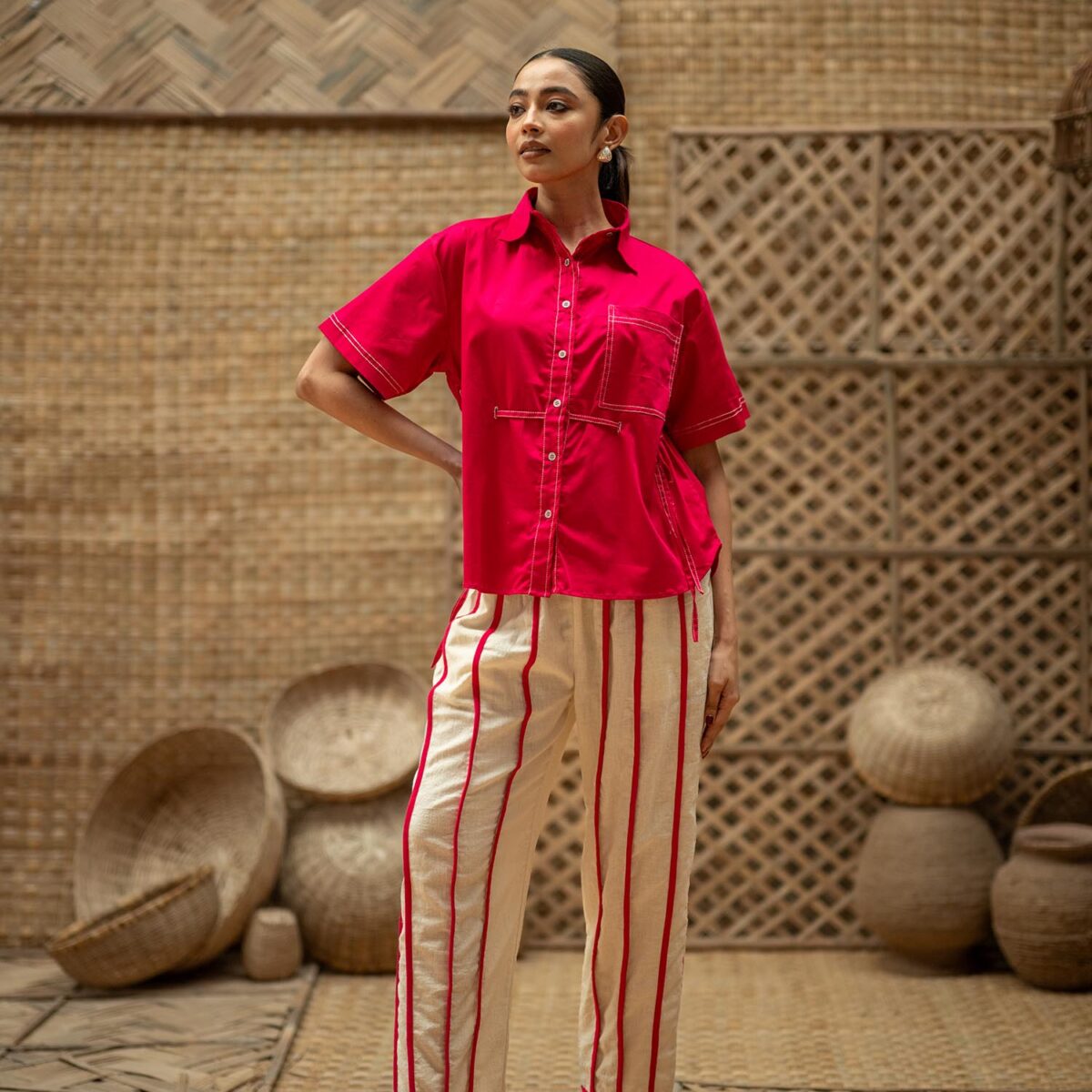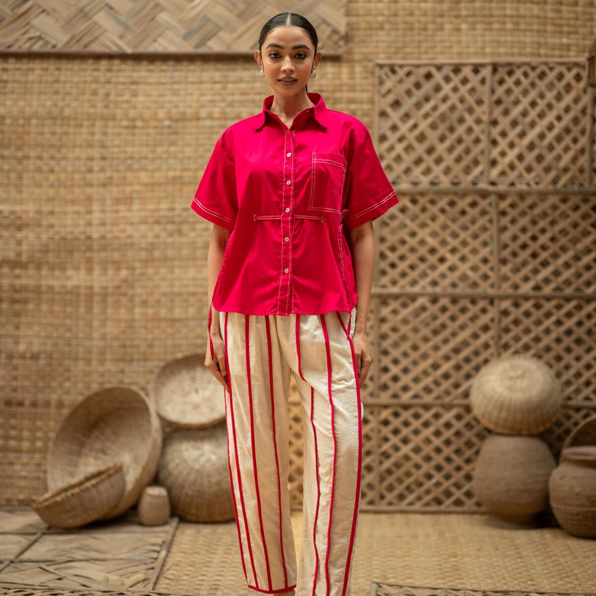 Product Description: Relaxed fit coord set with side tie up on the shirt. The barrel shaped trouser is tailored with contrast cord piping details to reflect a vibrant look.