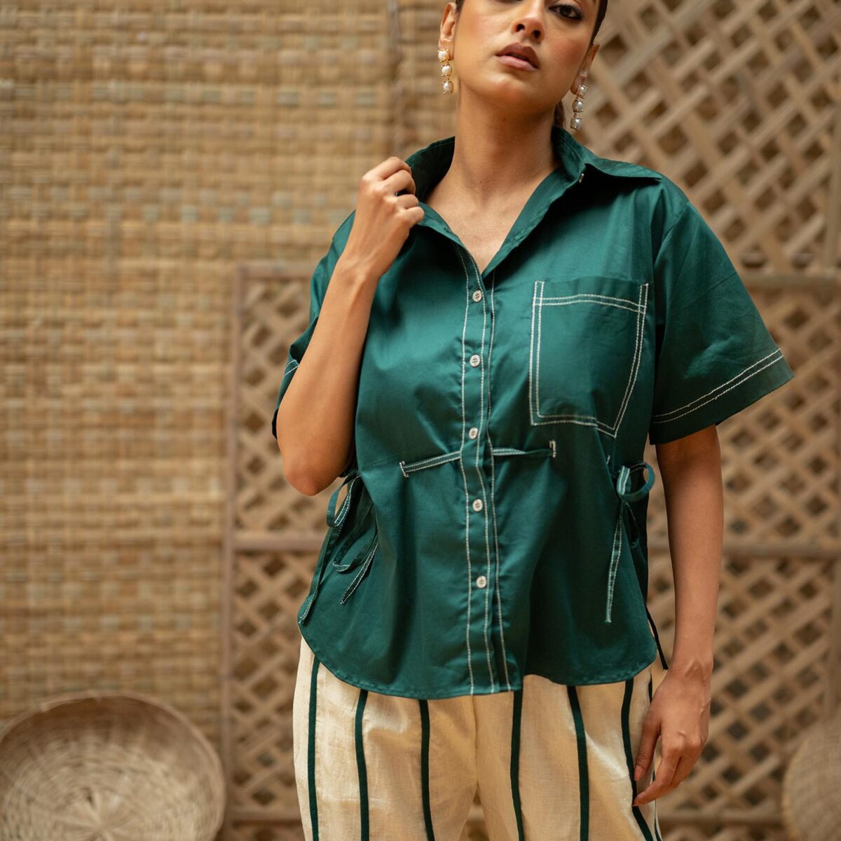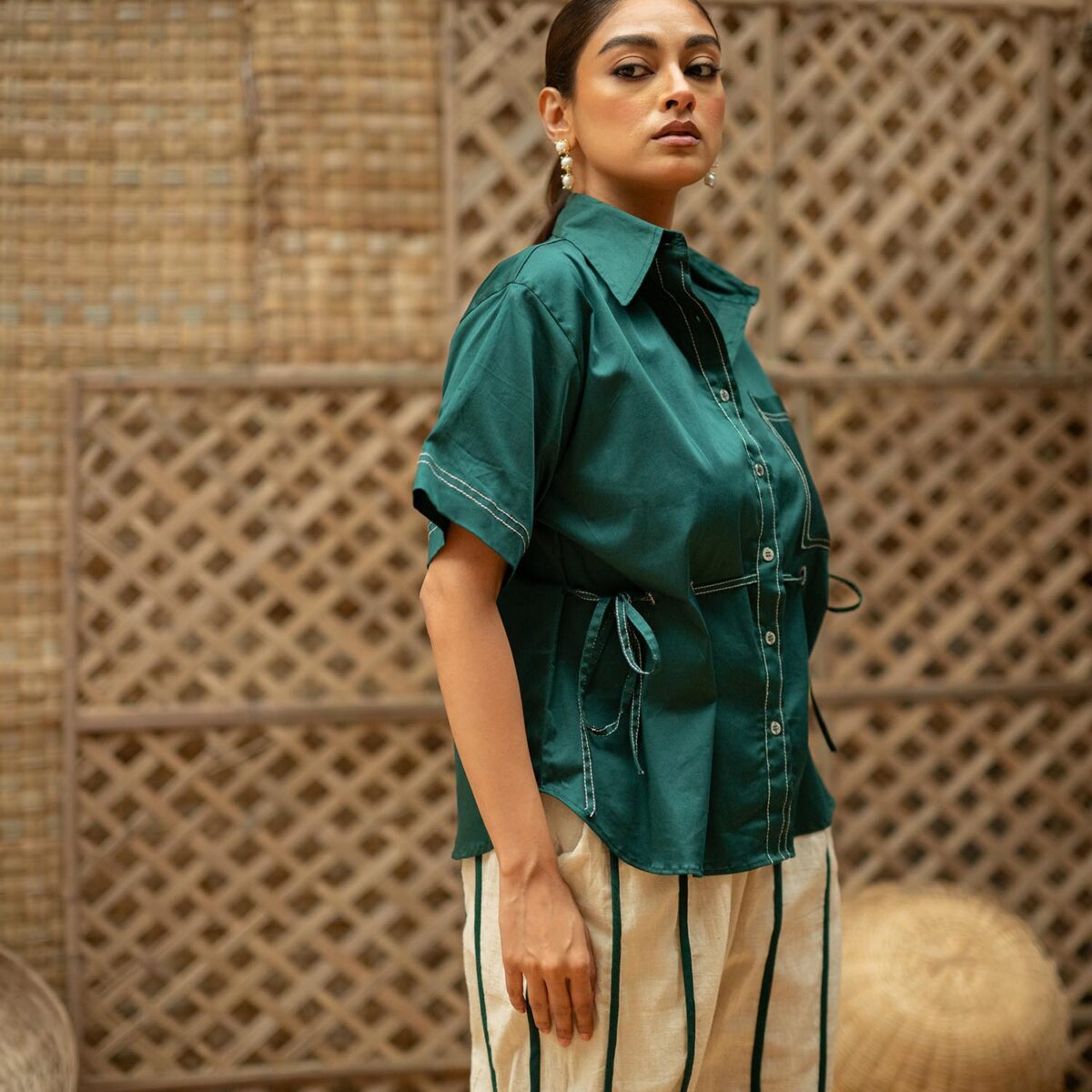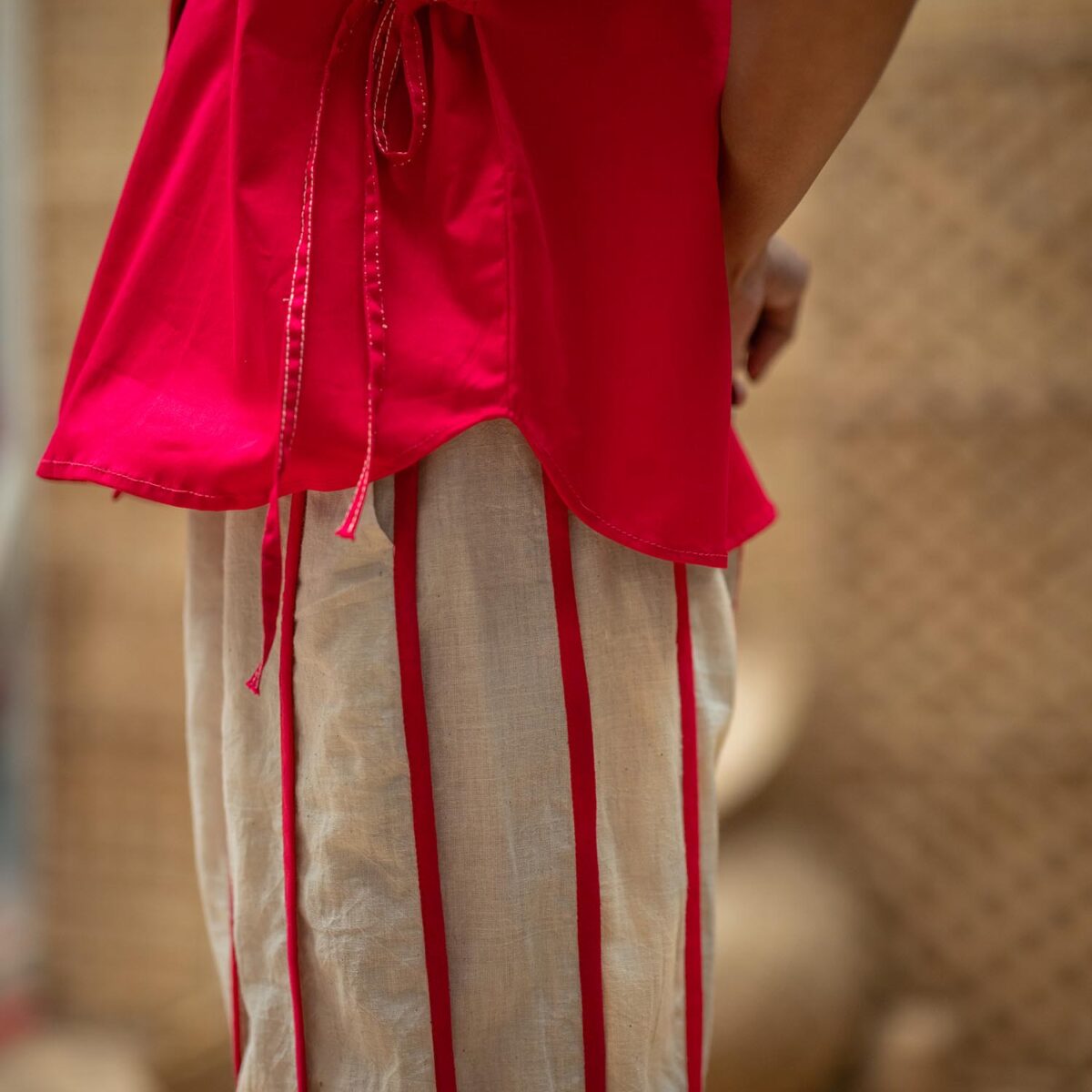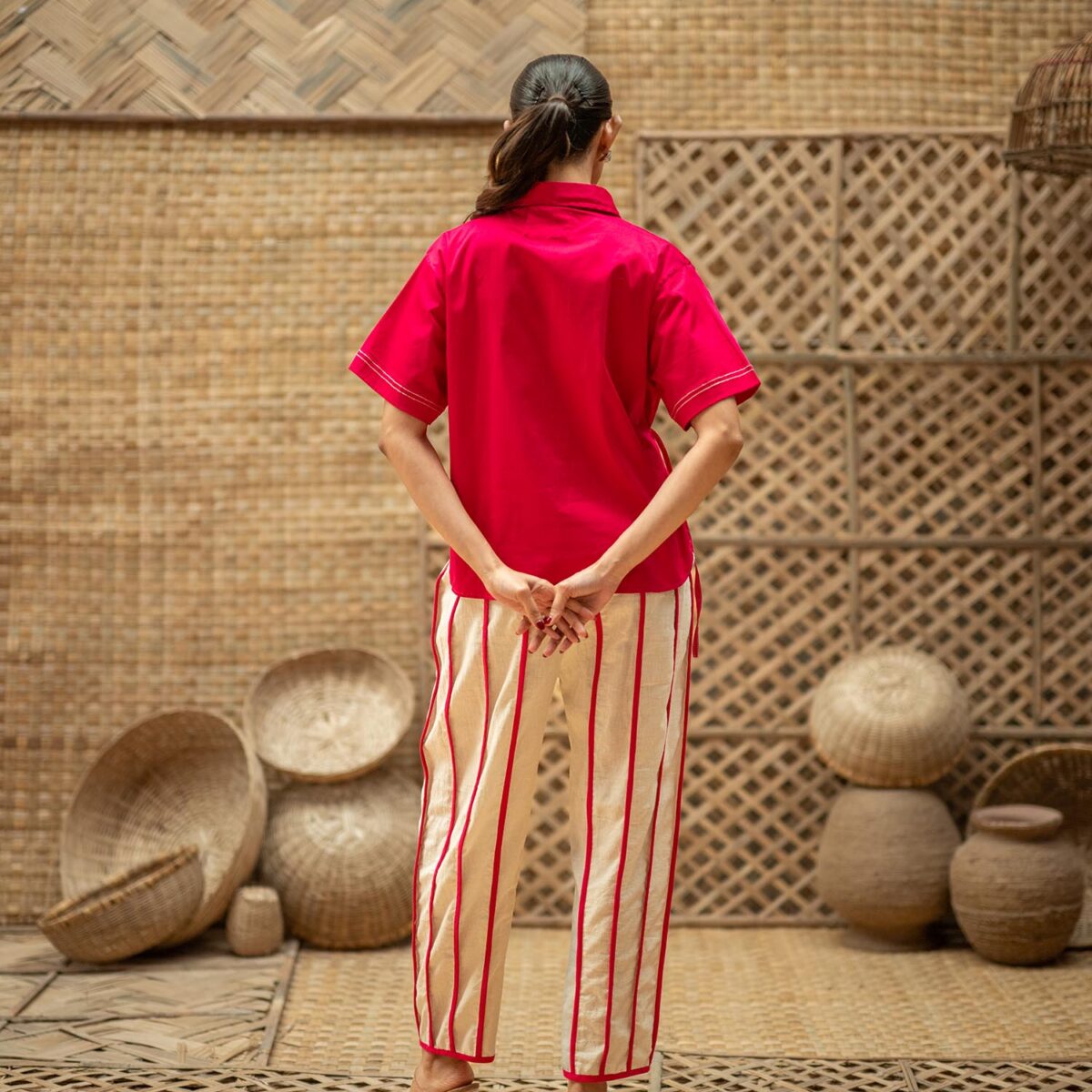 Product Description: Relaxed fit coord set with side tie up on the shirt. The barrel shaped trouser is tailored with contrast cord piping details to reflect a vibrant look.
