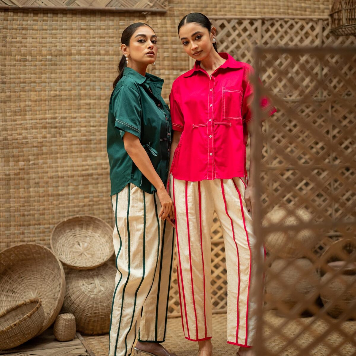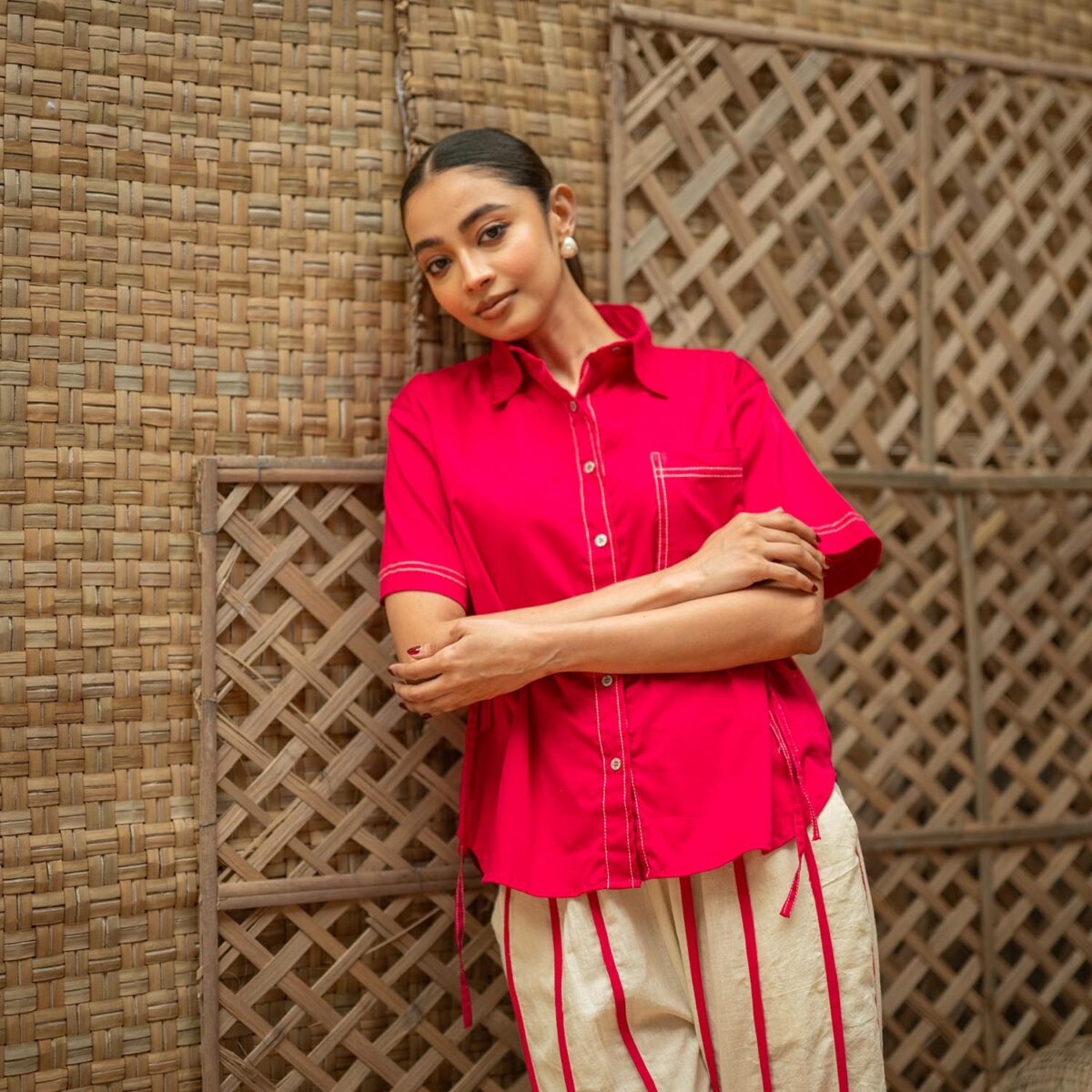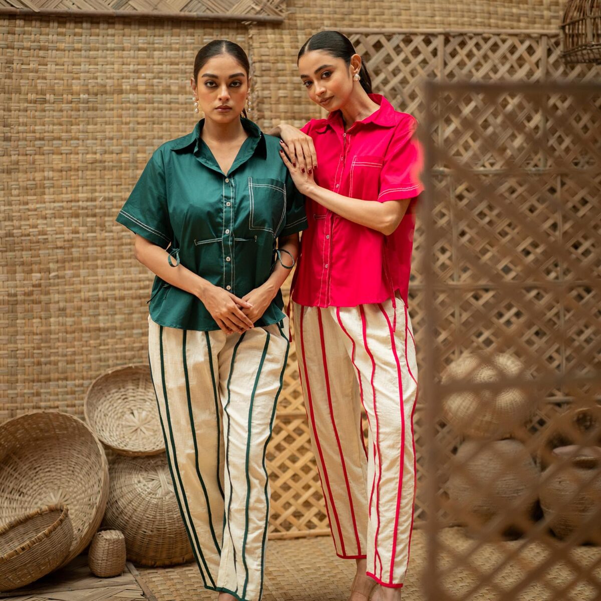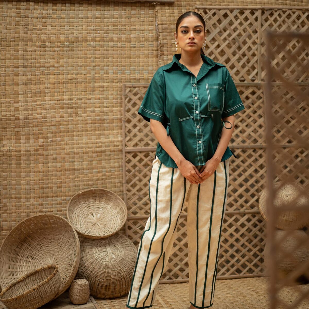 Product Description: Relaxed fit coord set with side tie up on the shirt. The barrel shaped trouser is tailored with contrast cord piping details to reflect a vibrant look.