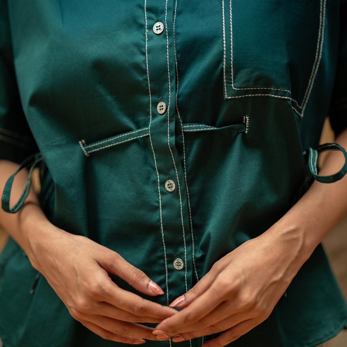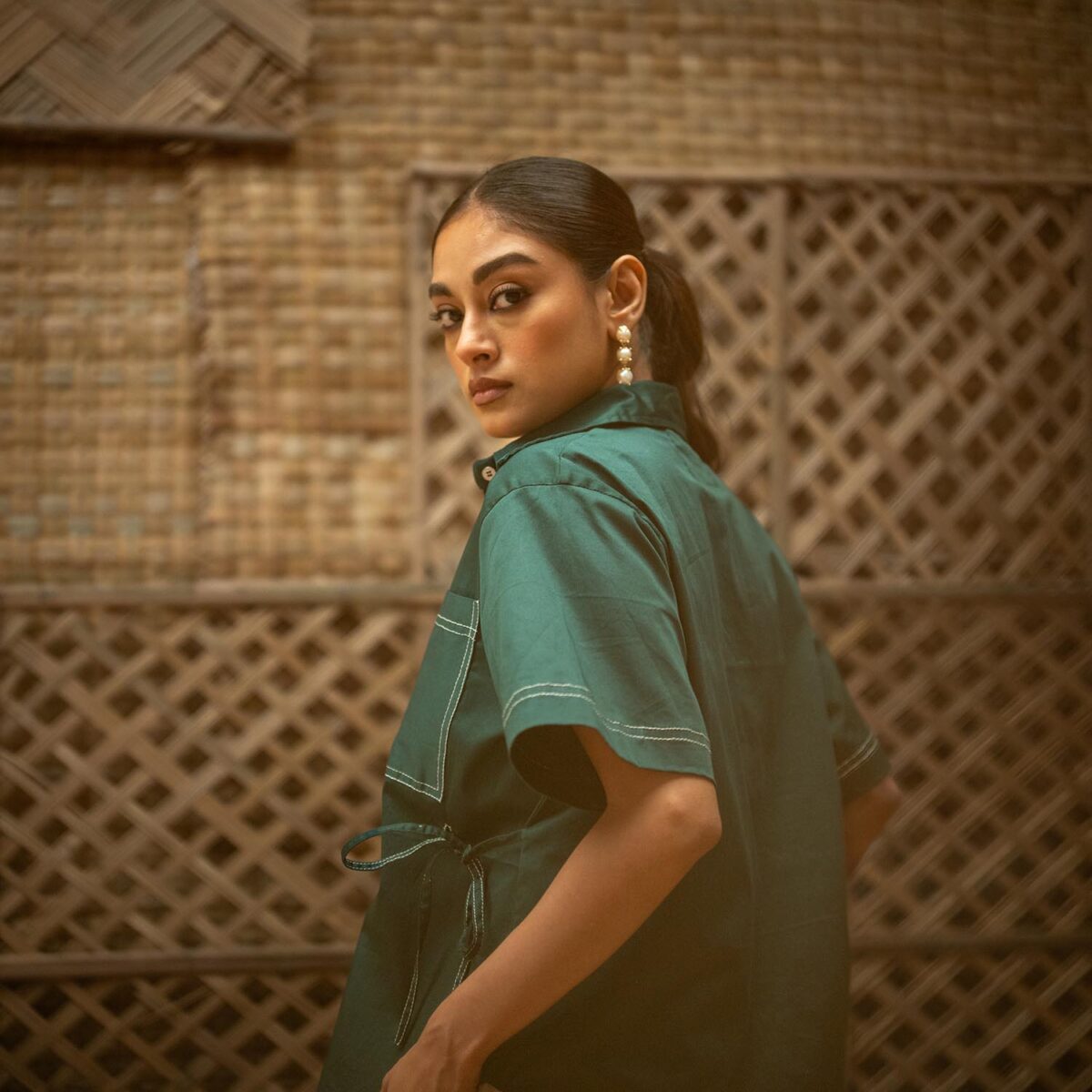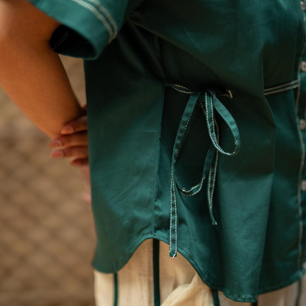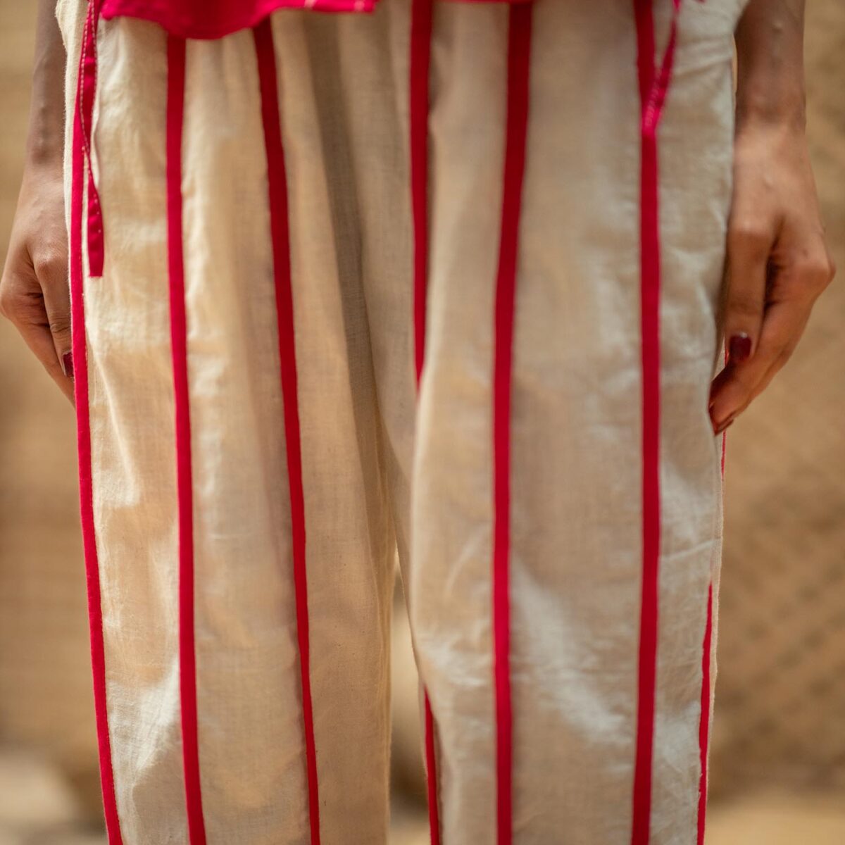 Product Description: Relaxed fit coord set with side tie up on the shirt. The barrel shaped trouser is tailored with contrast cord piping details to reflect a vibrant look.