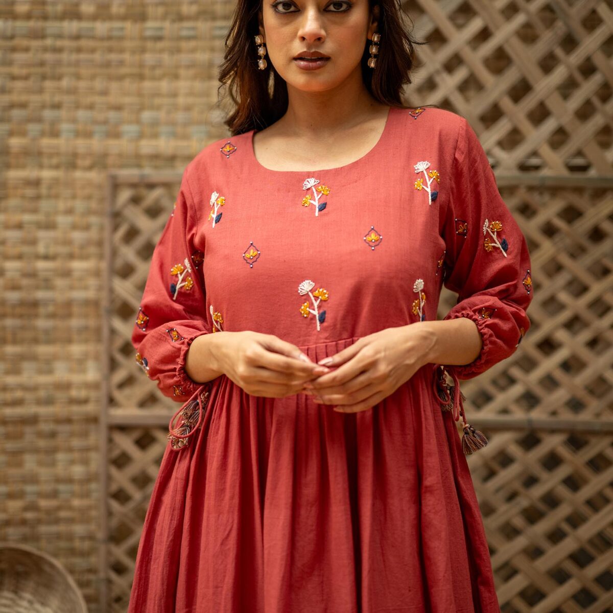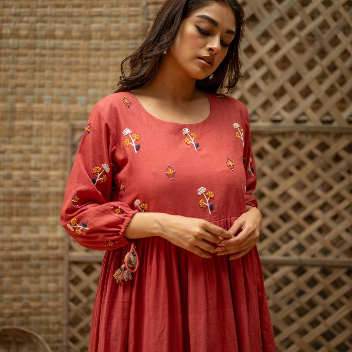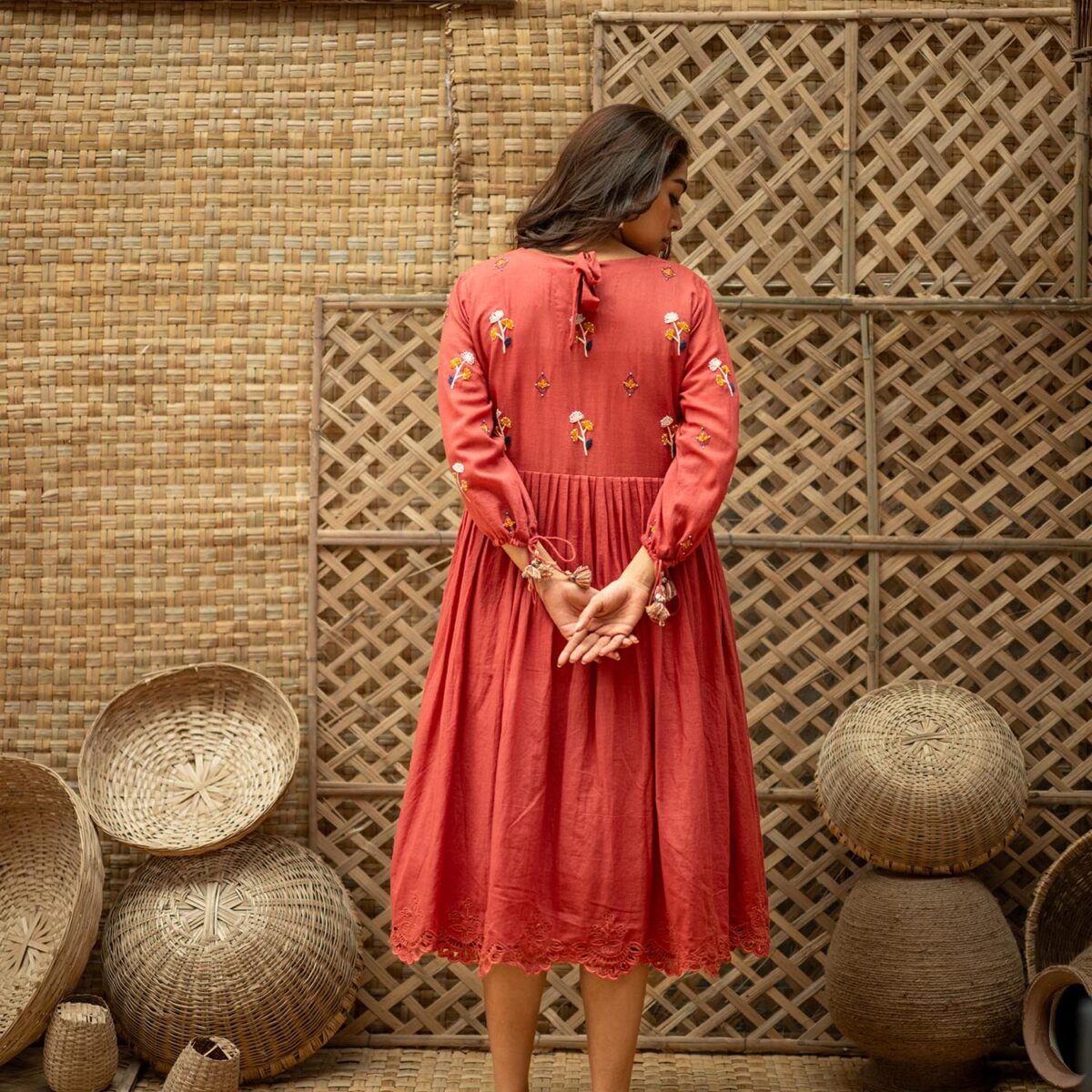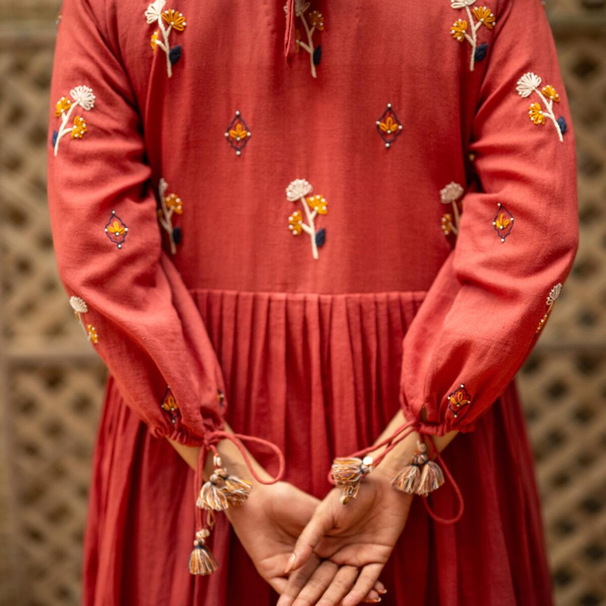 Product Description: Dreamy Midi Dress for the eased out festive season. Hand embroidered yoke, gathered tassels on the sleeve and an aesthetic bow tie up at the back of the neck. The dress is a fit and flare silhouette with knife pleat details at the waist.