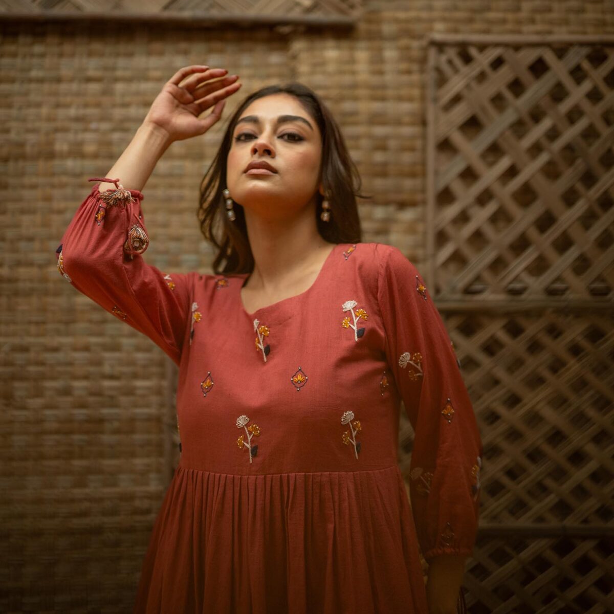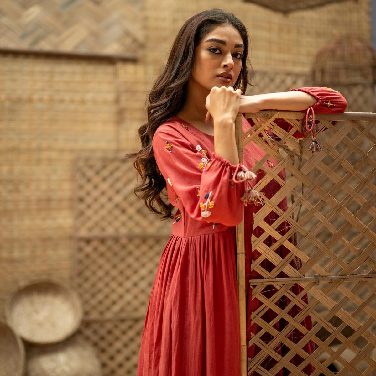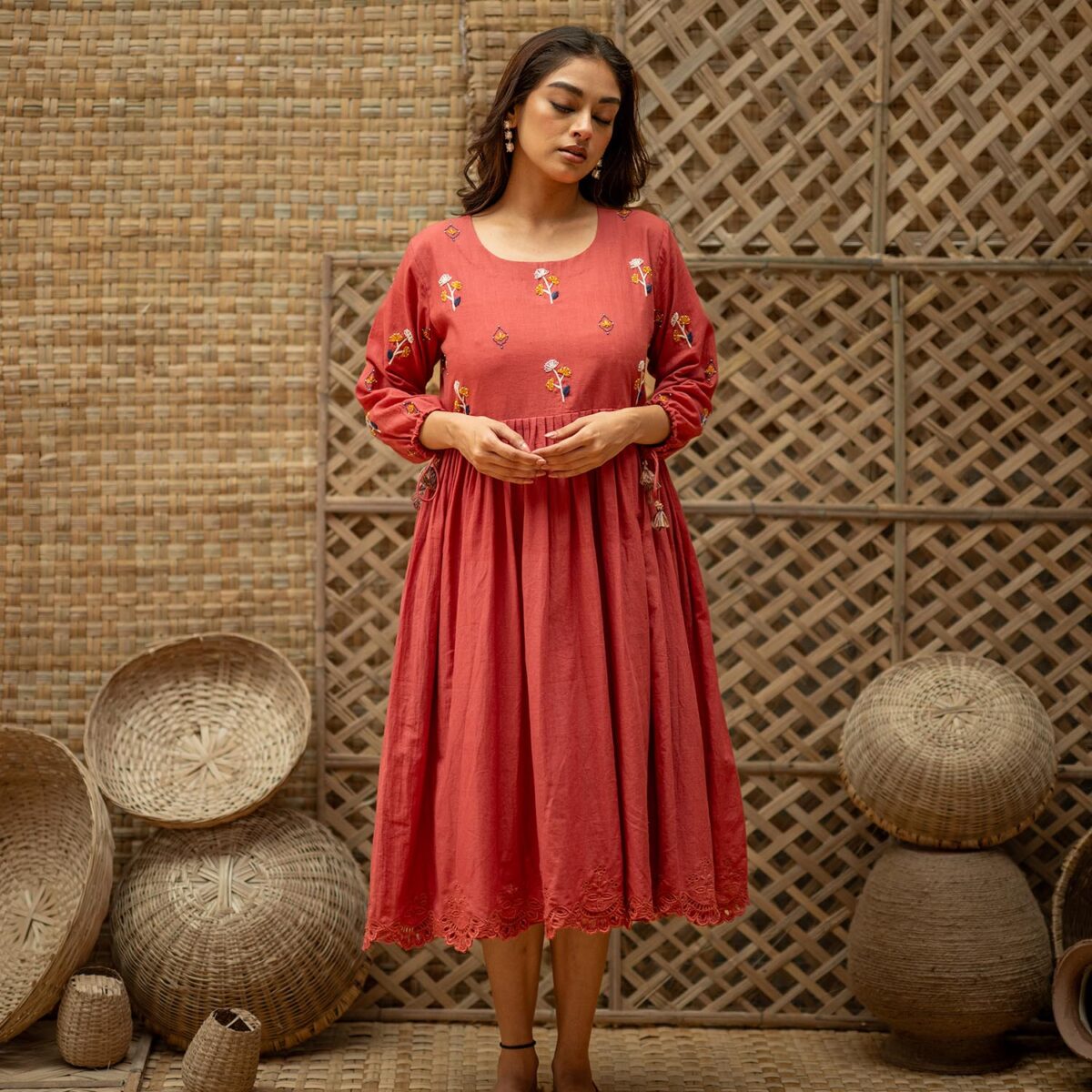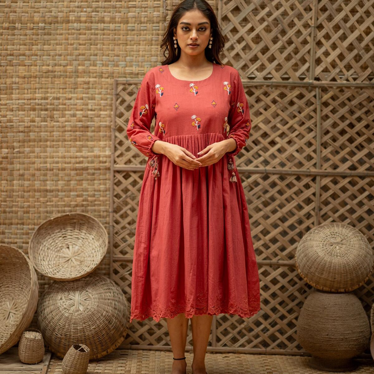 Product Description: Dreamy Midi Dress for the eased out festive season. Hand embroidered yoke, gathered tassels on the sleeve and an aesthetic bow tie up at the back of the neck. The dress is a fit and flare silhouette with knife pleat details at the waist.