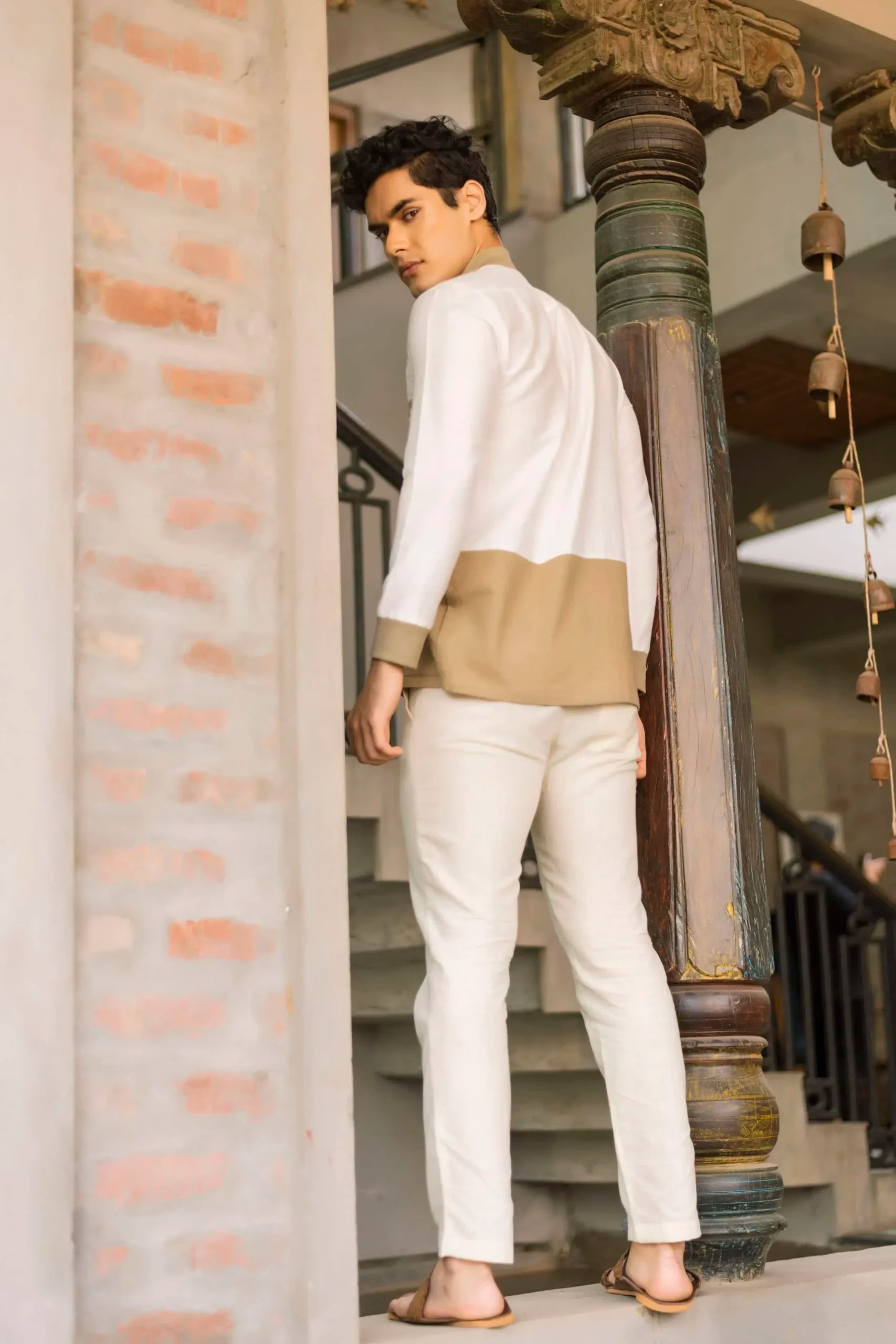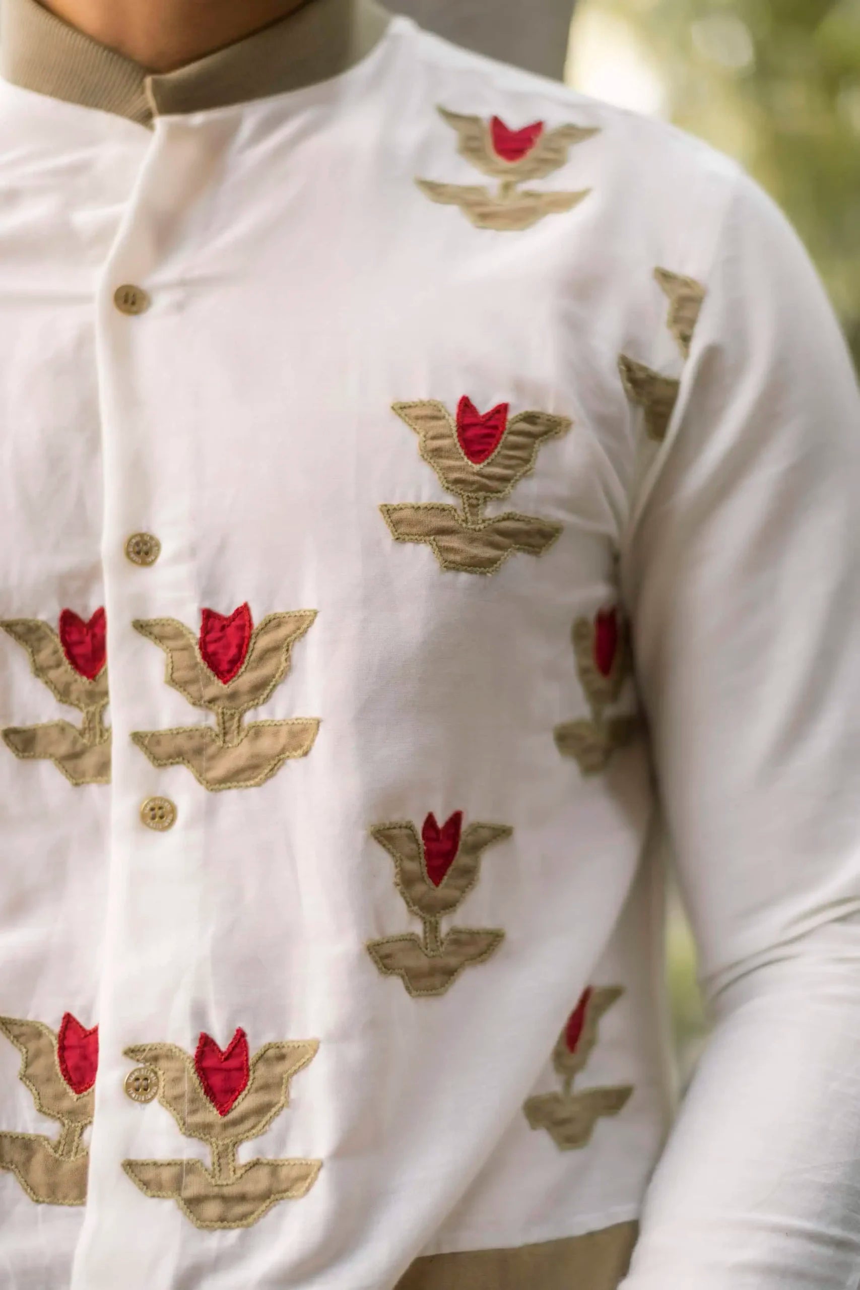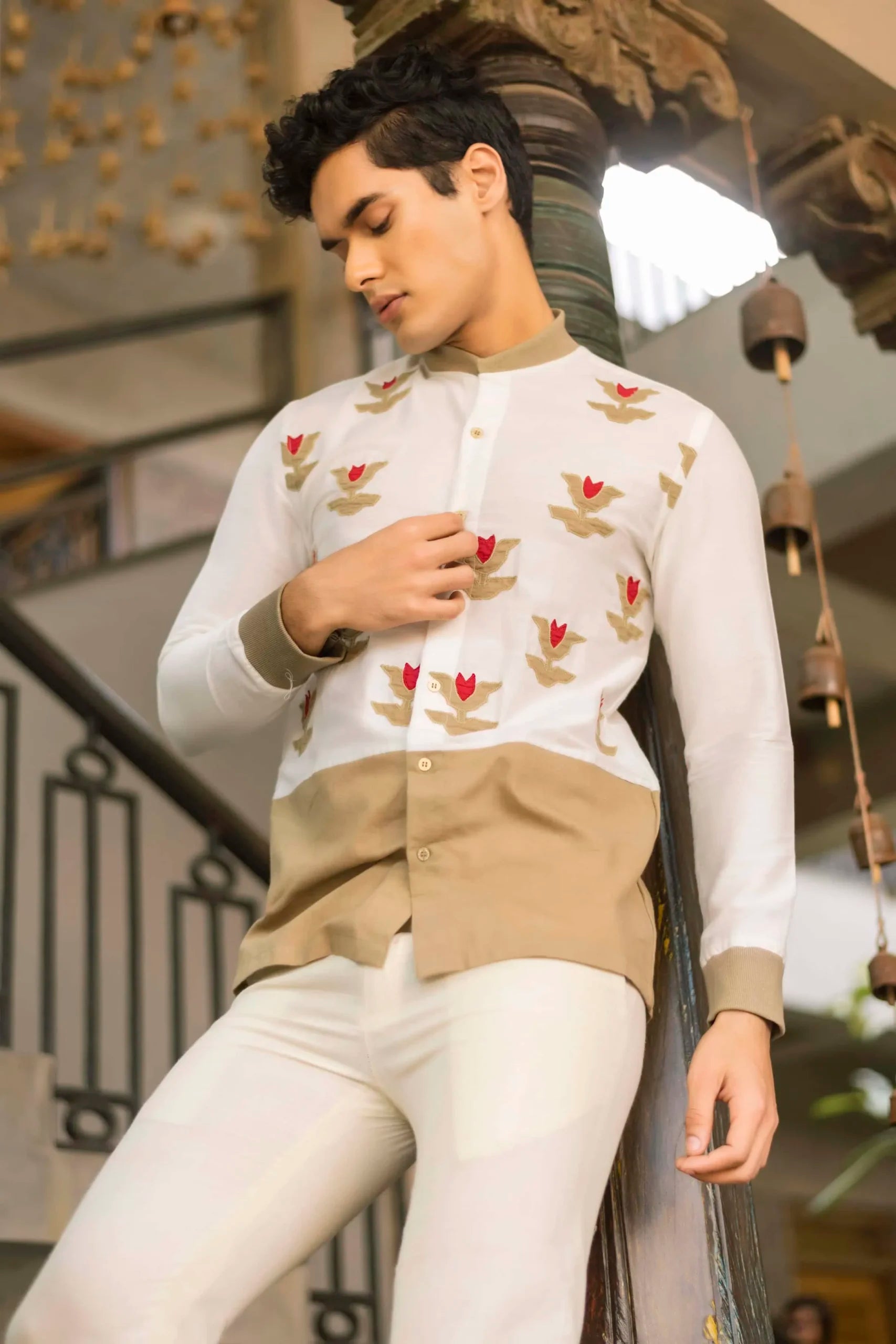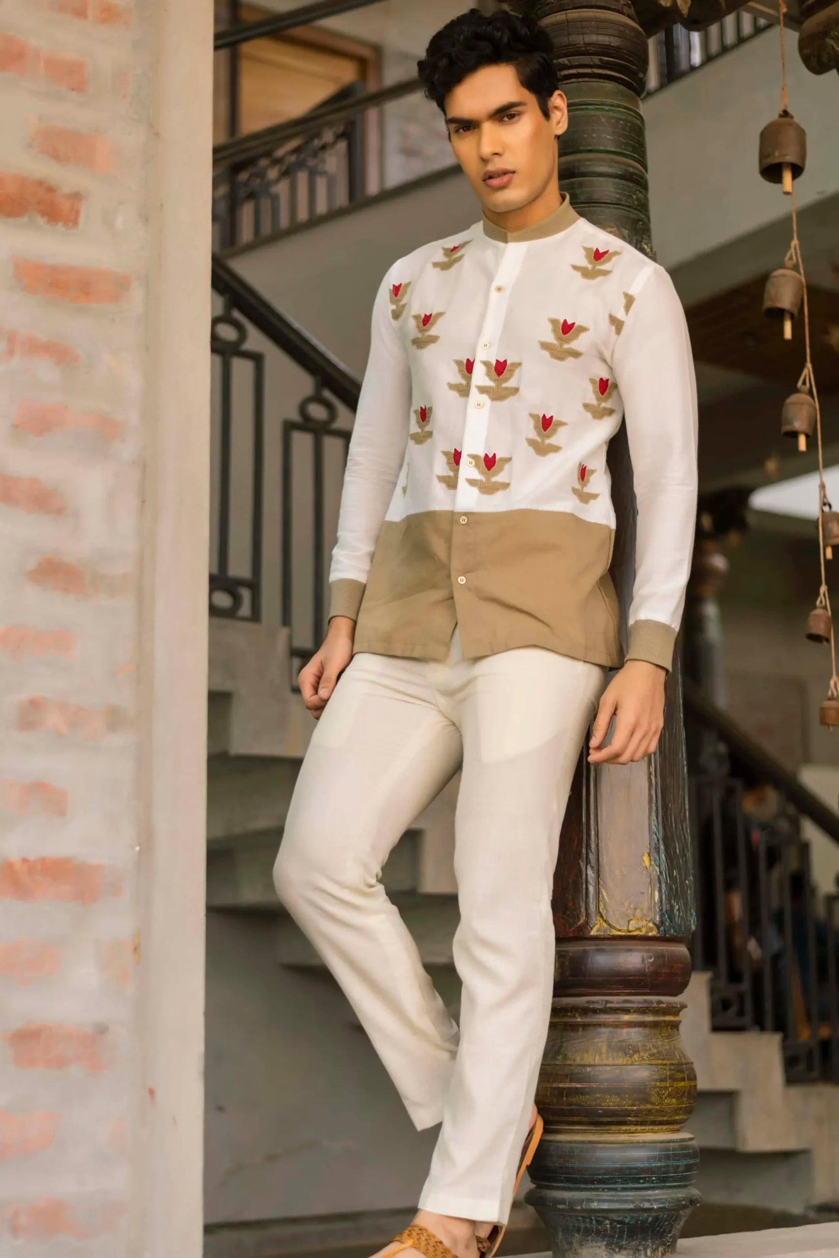 Product Description: Off-white & olive handwoven cotton & cotton silk shirt with a rib collar and applique embroidery.