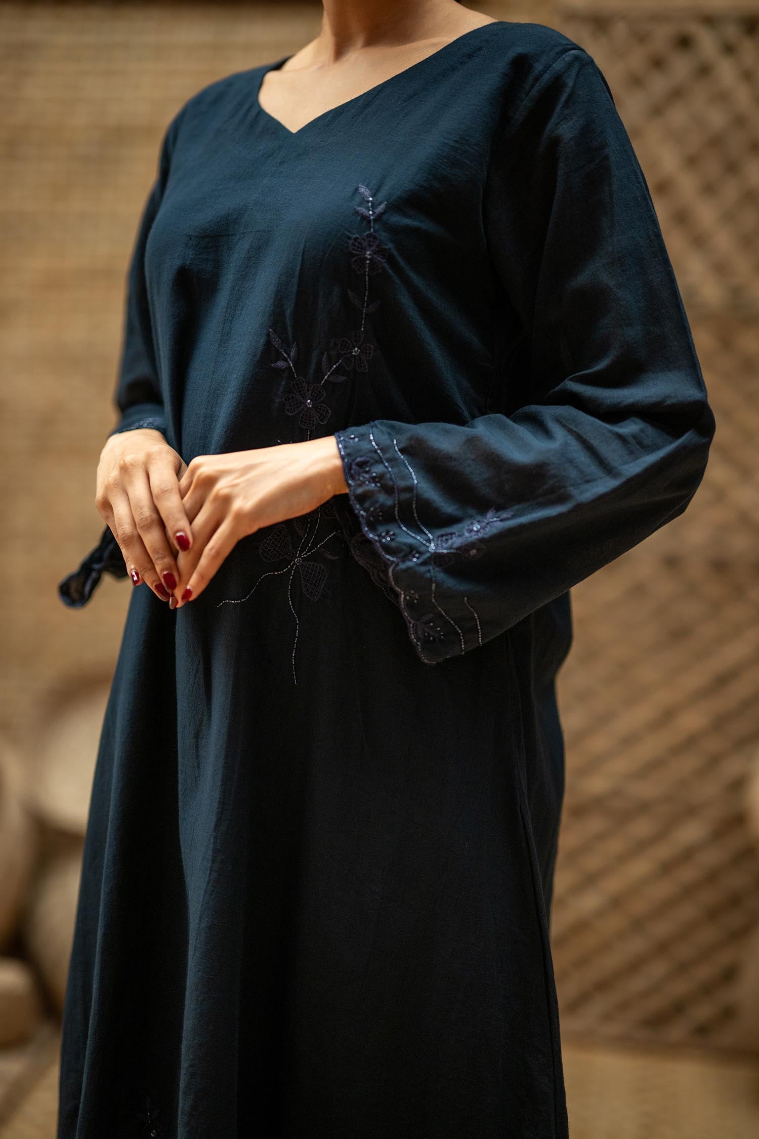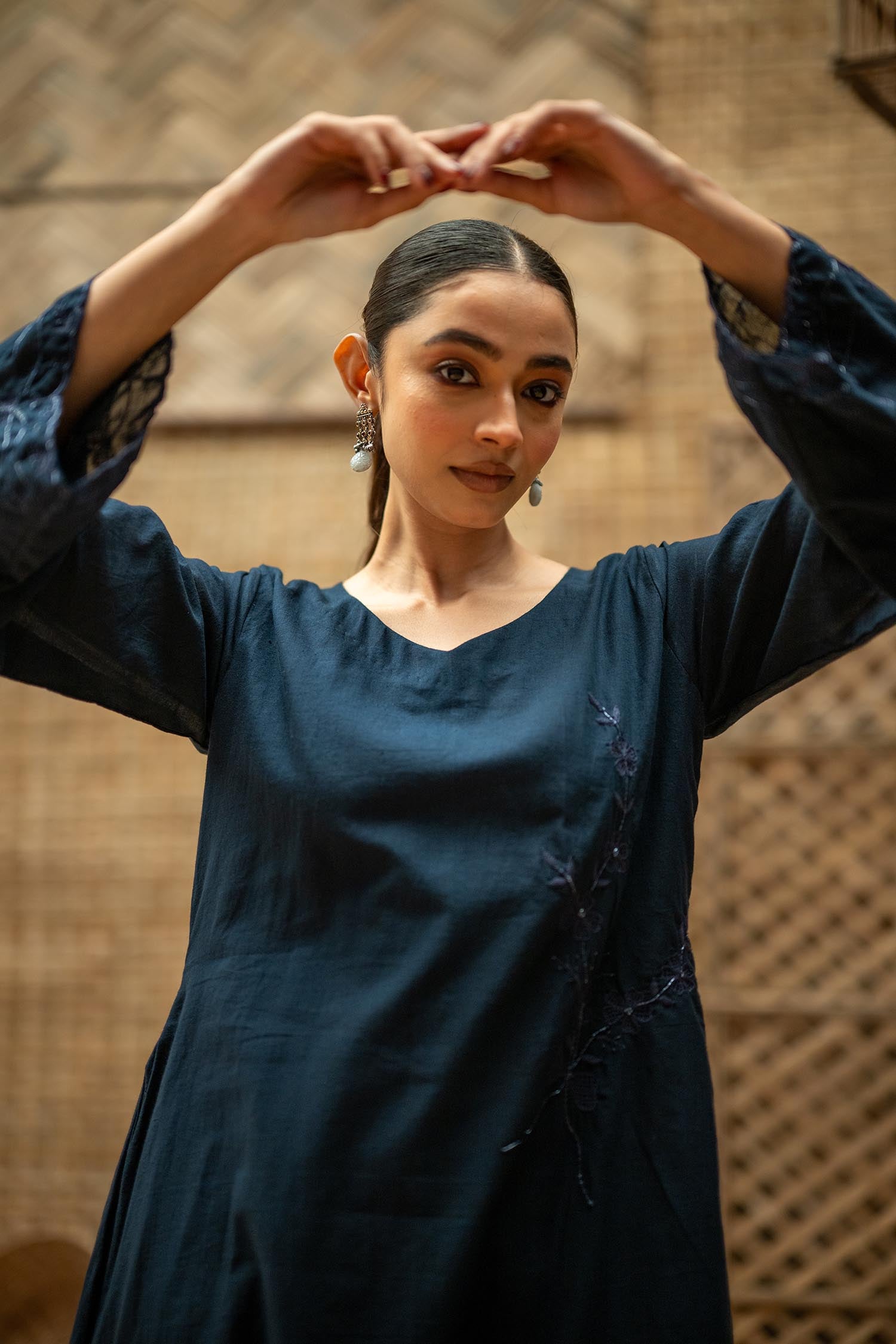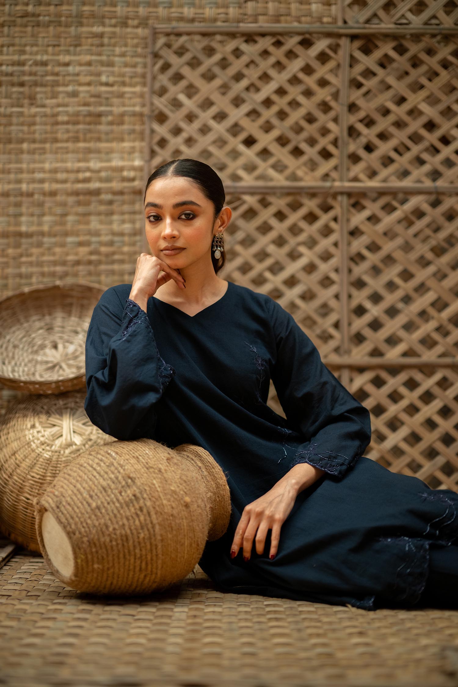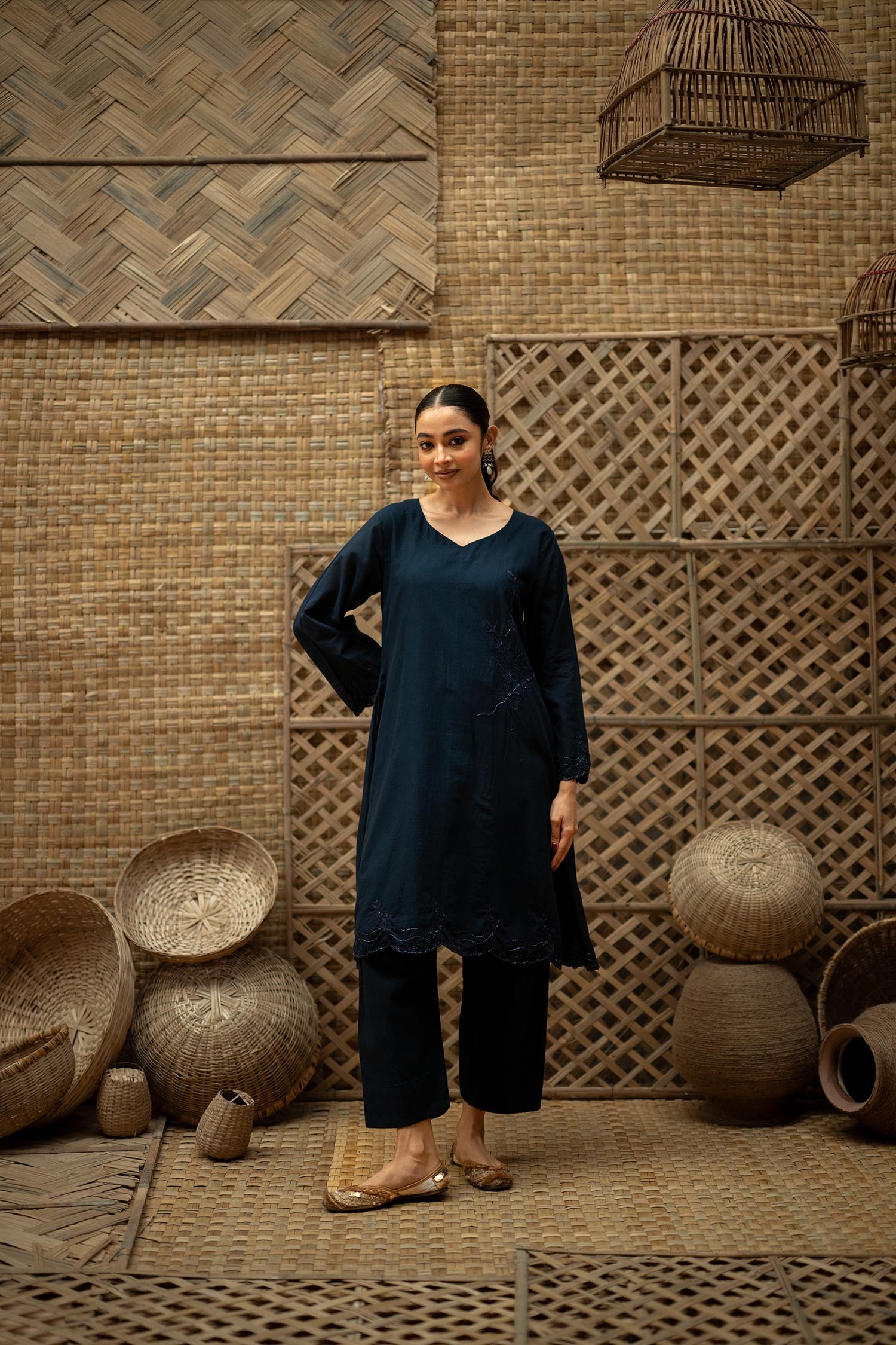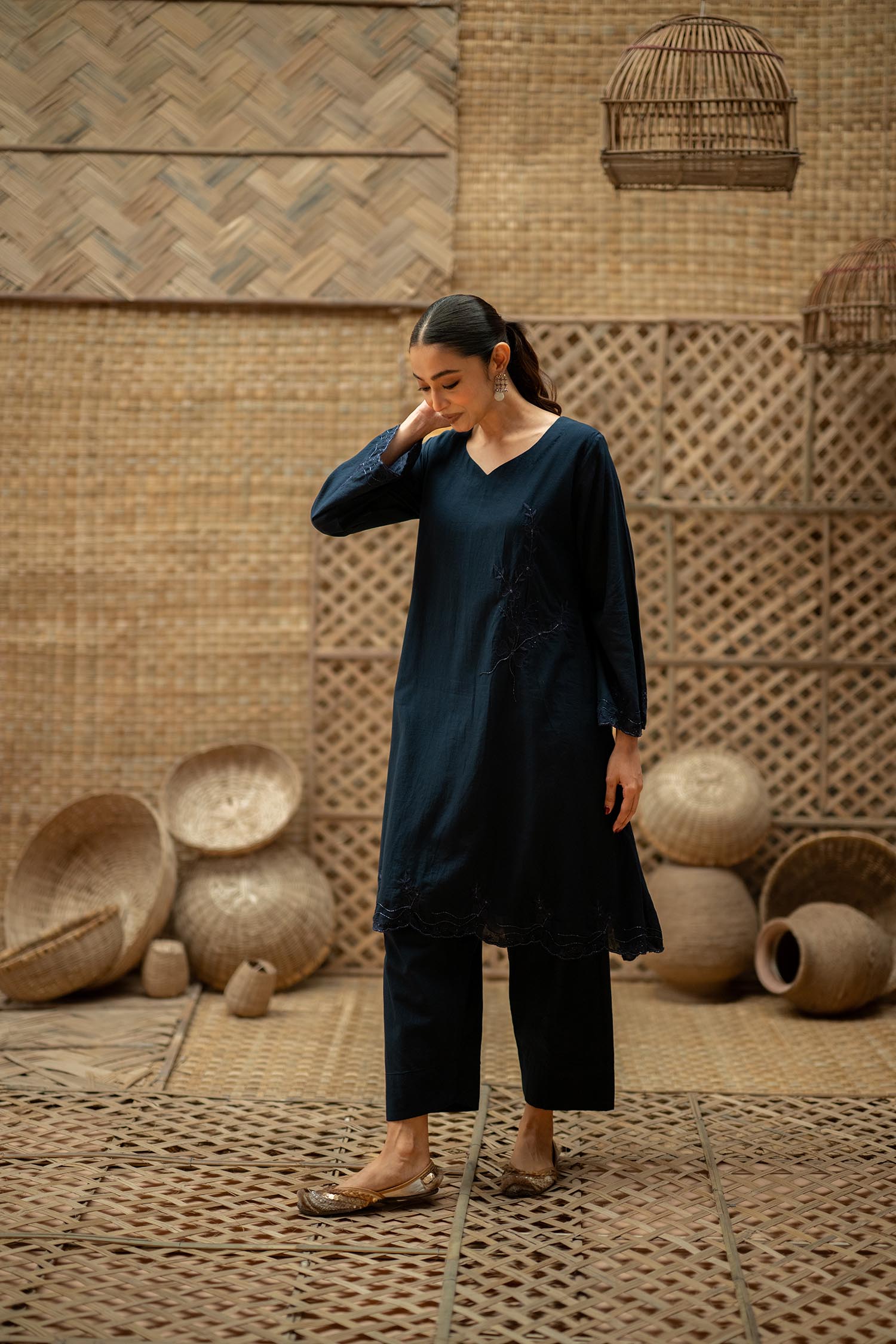 Product Description: Relaxed fit kurta set with beaded cutwork hemline, hand embroidered with thread and bugles. The kurta is paired with relaxed fit pants.