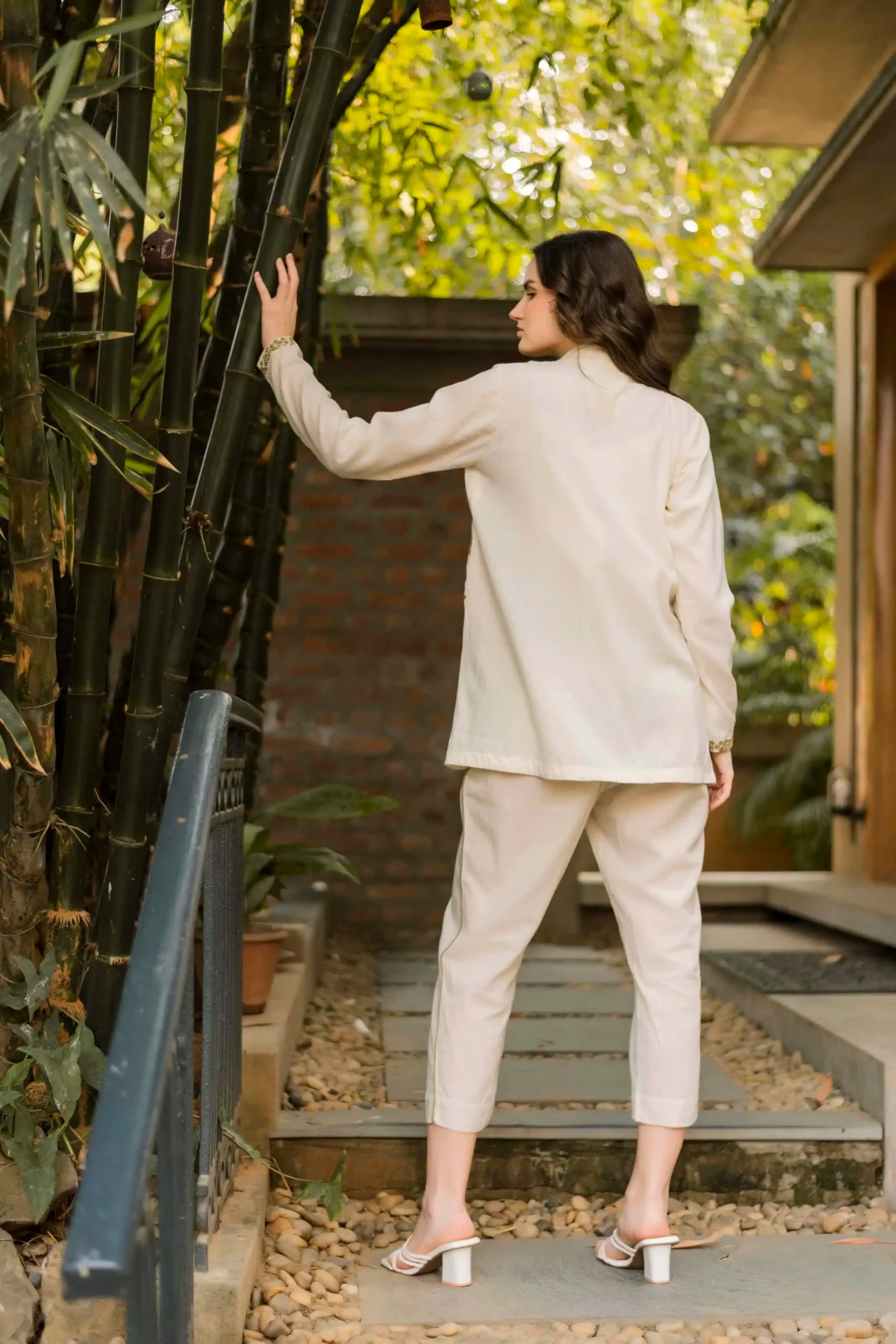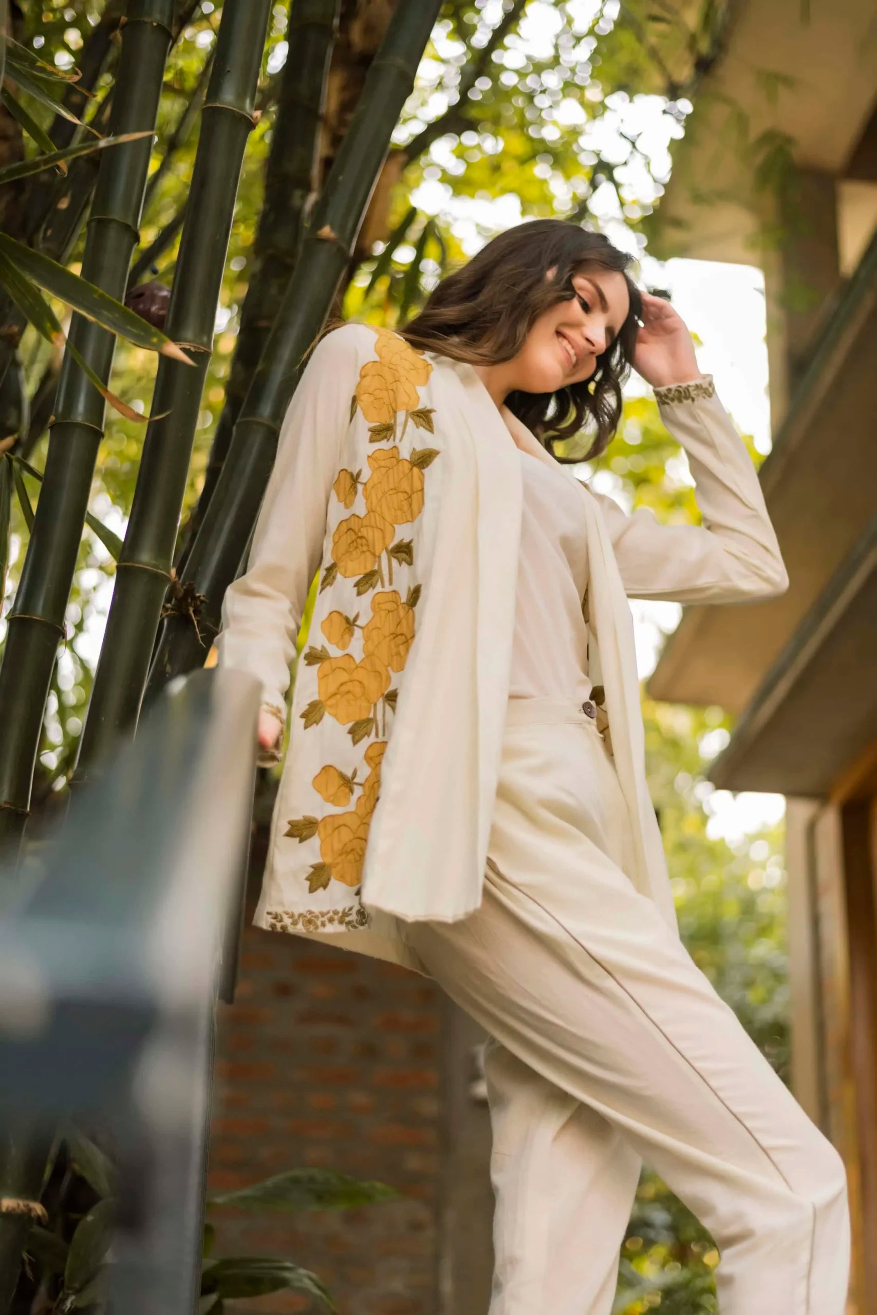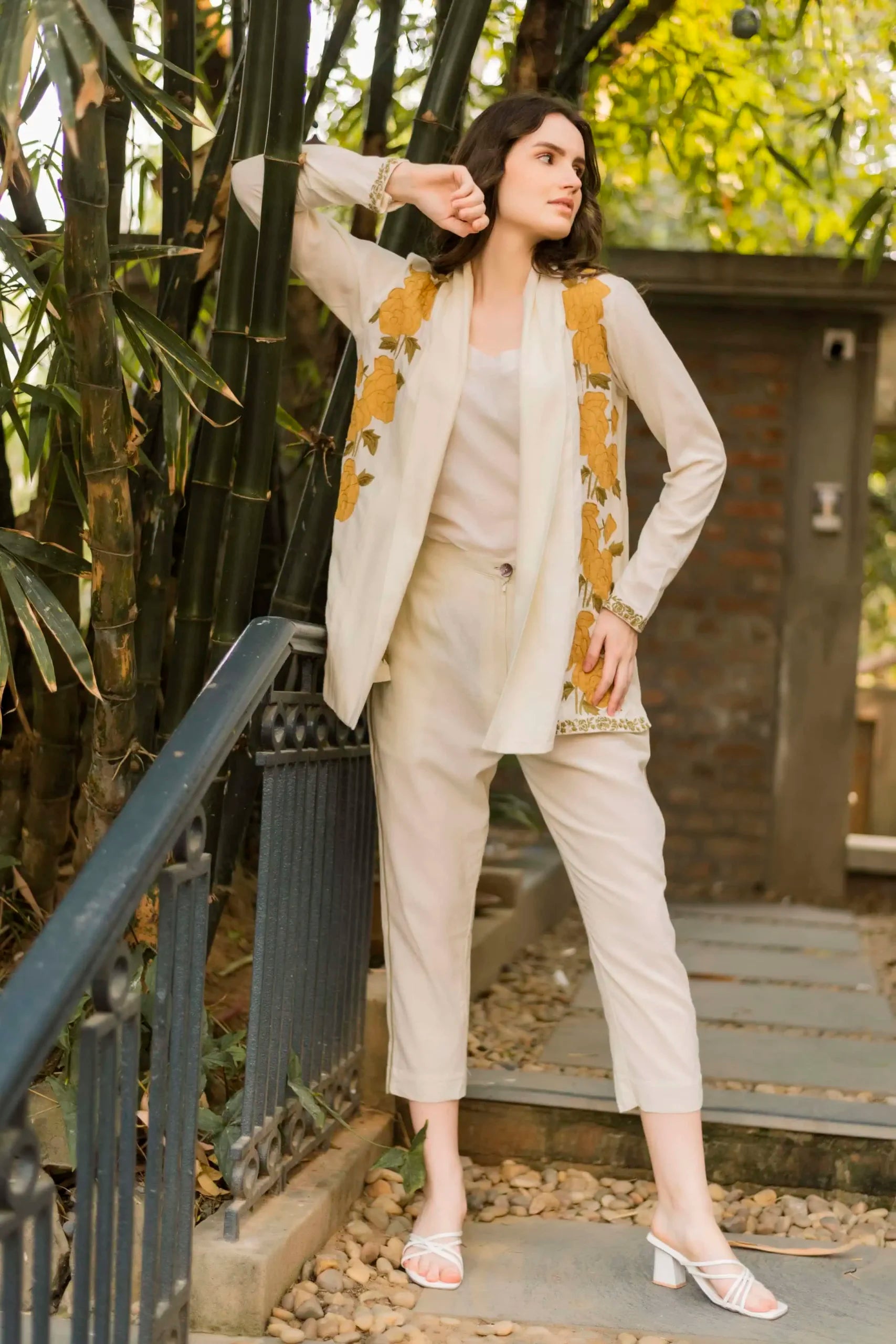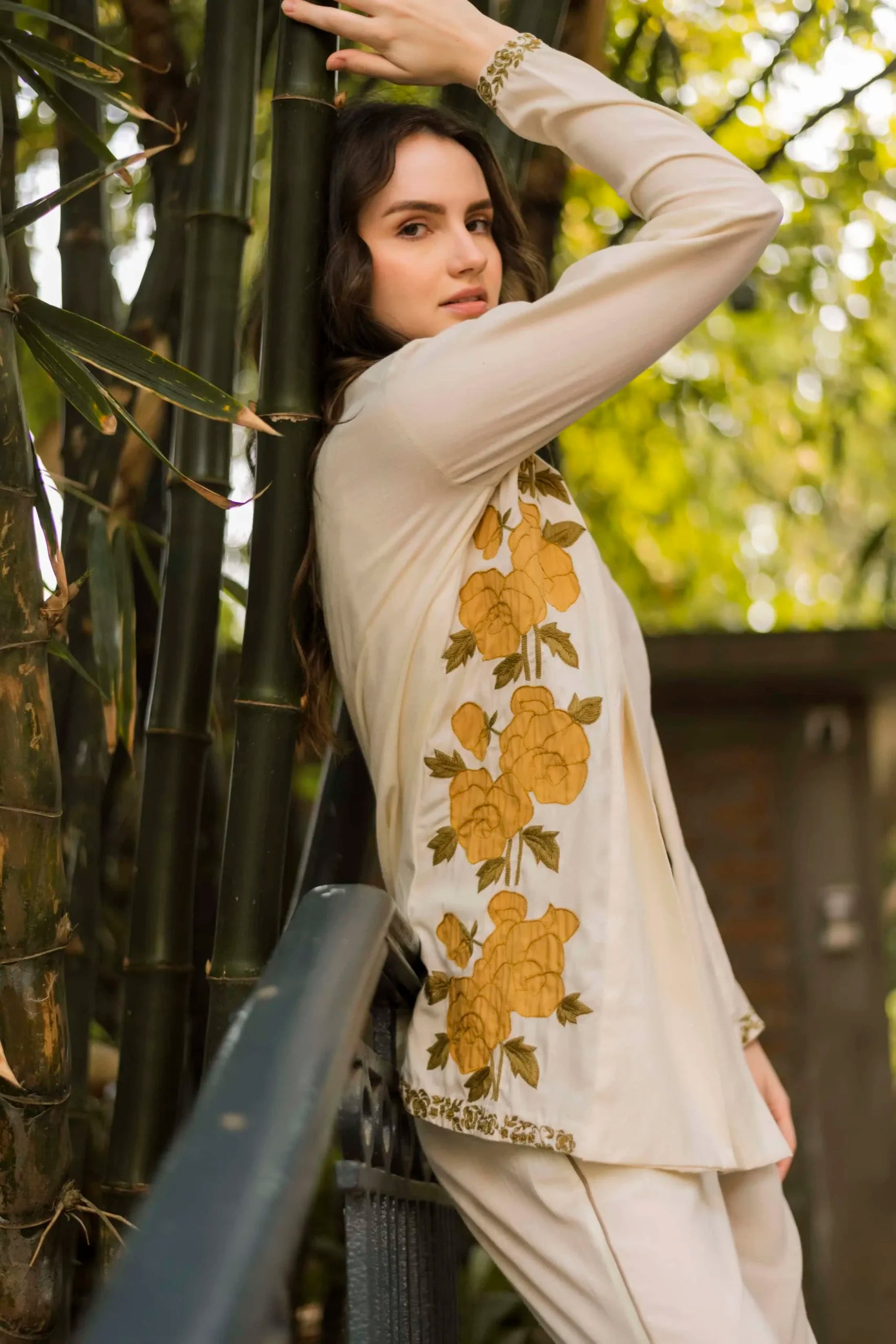 Product Description: Ivory handwoven matka silk shrug with honey thread applique embroidered flowers.