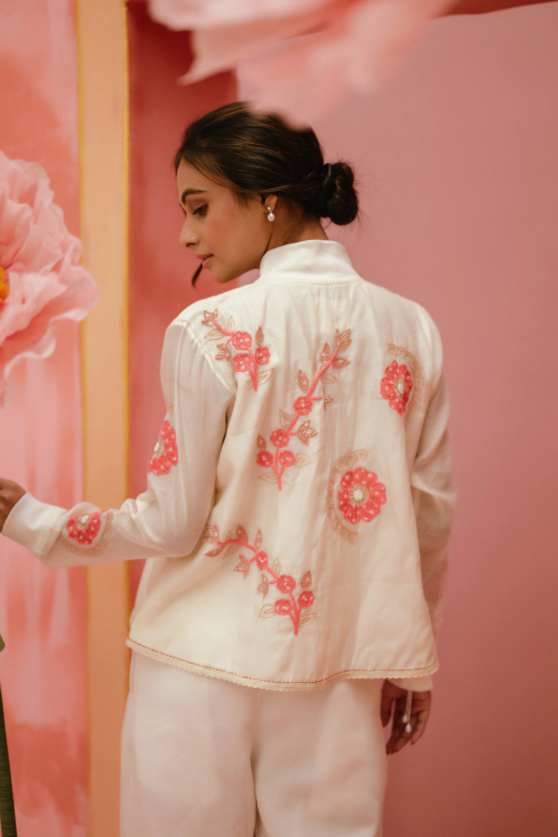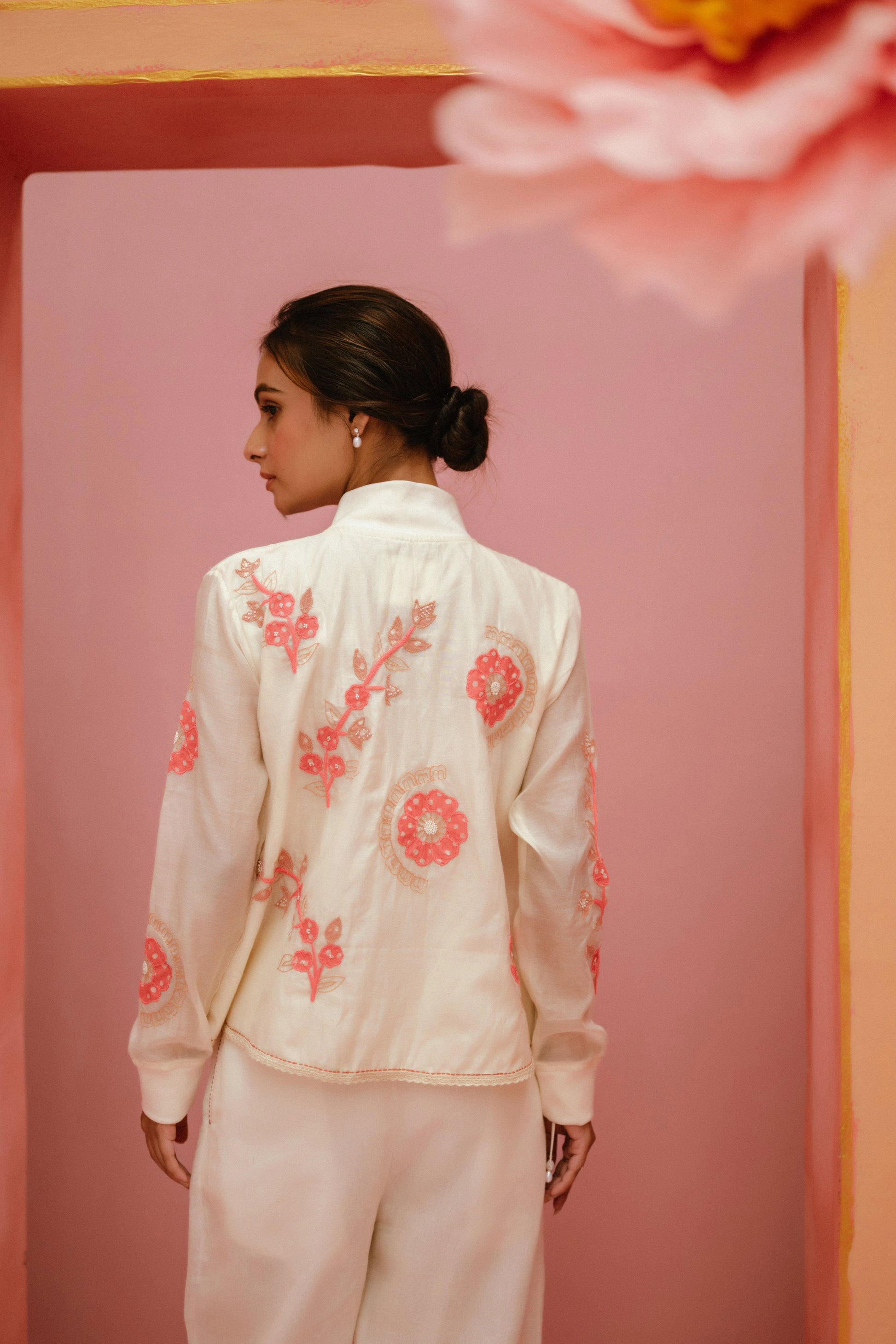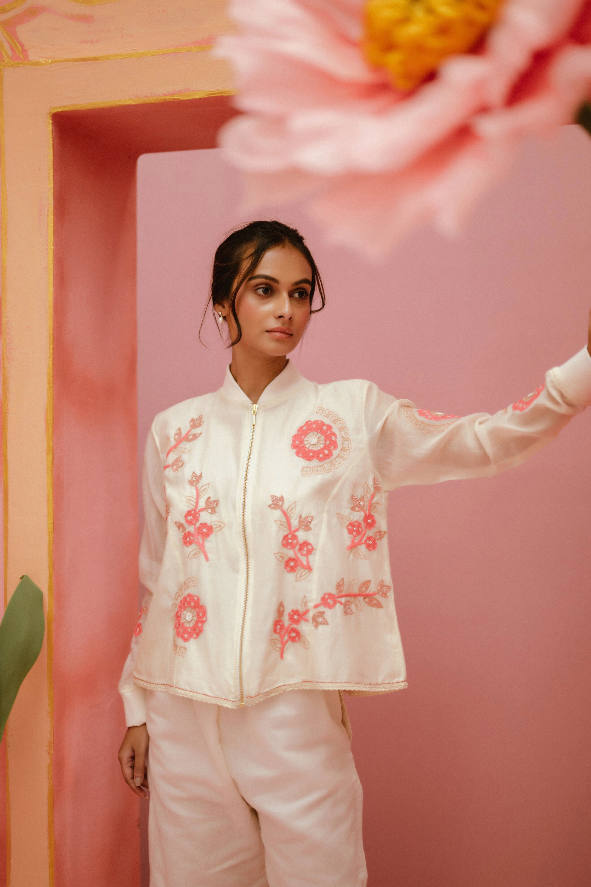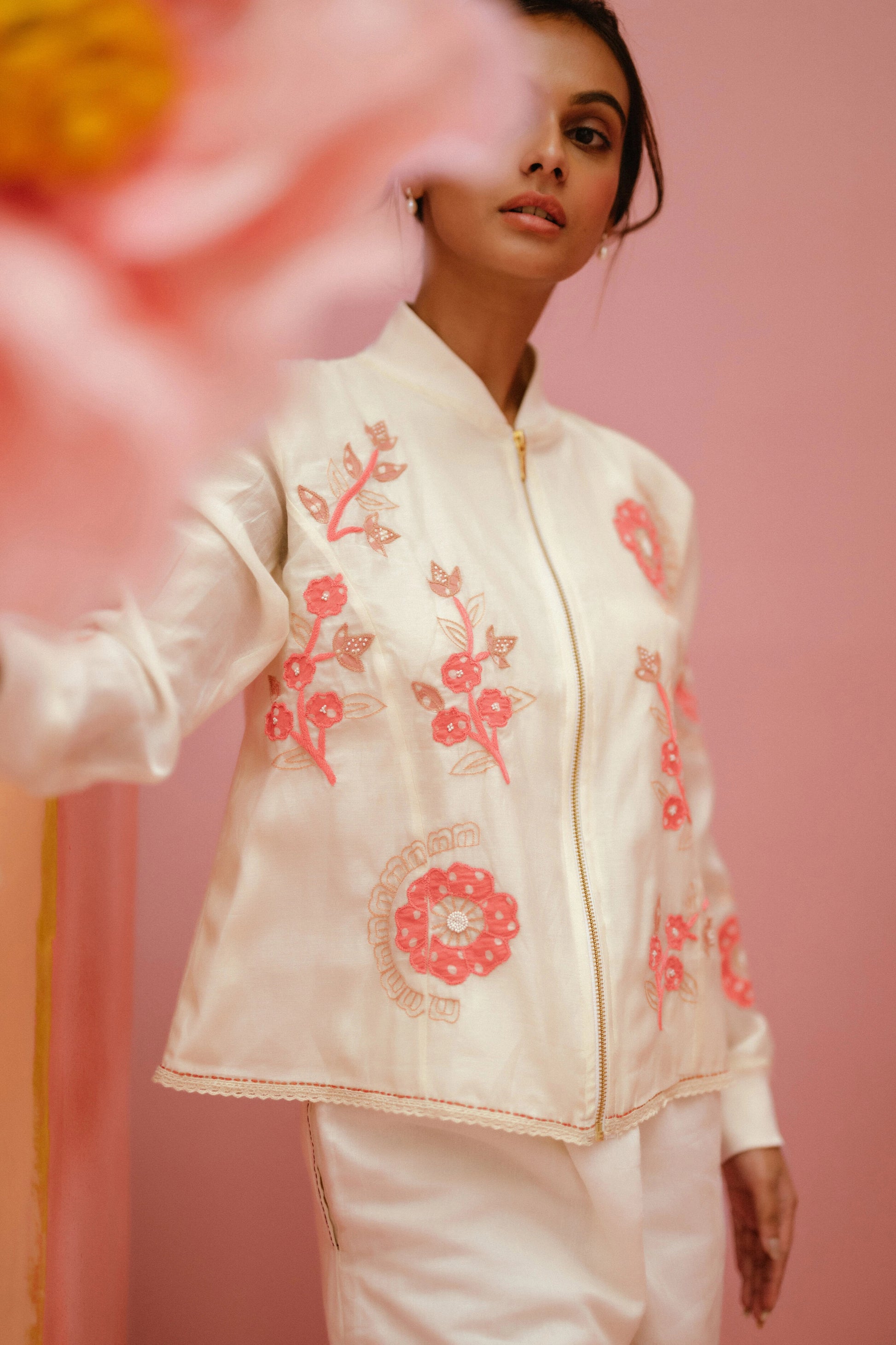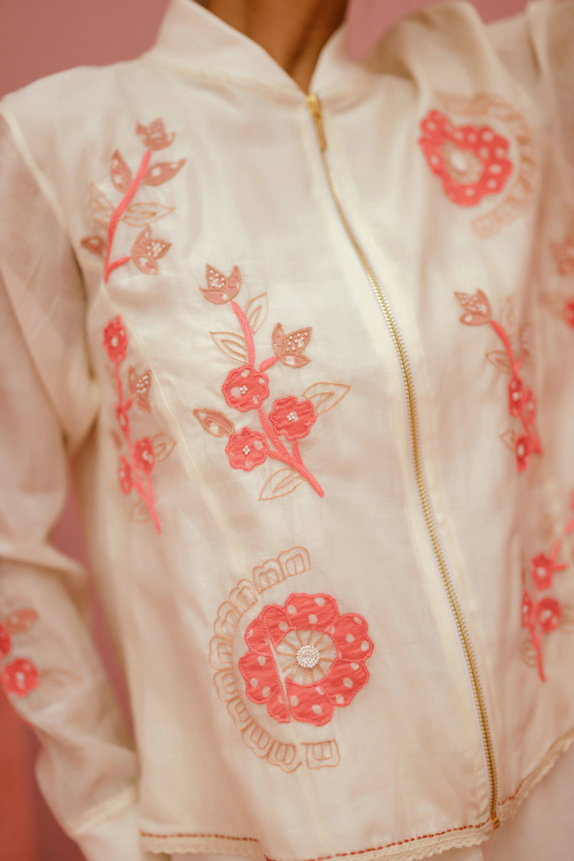 Product Description: Our lightweight cotton silk bomber jacket offers endless layering and styling options. Crafted on a ivory base adorned with block printed appliqued flowers and lace detailing on the hemline.