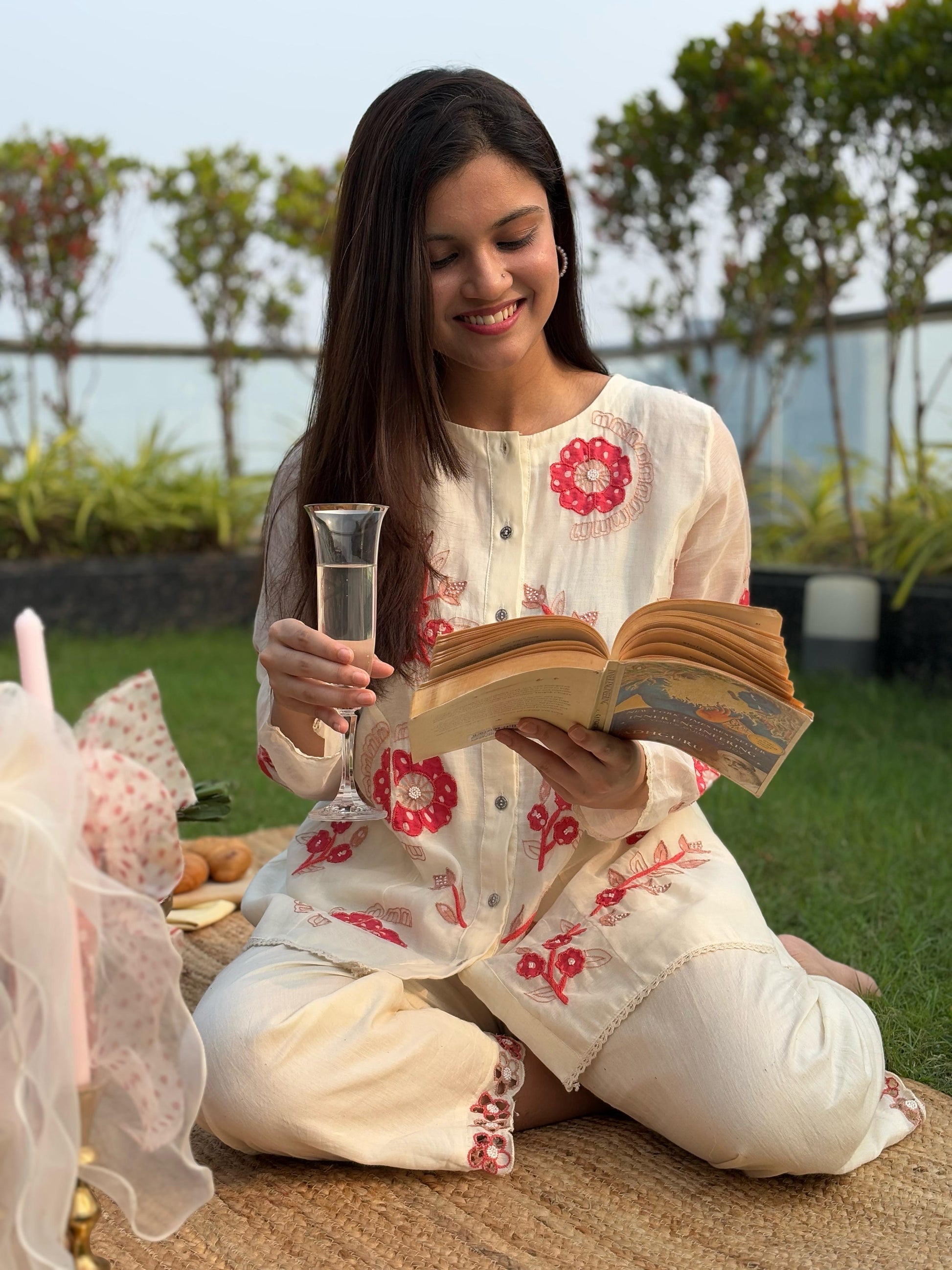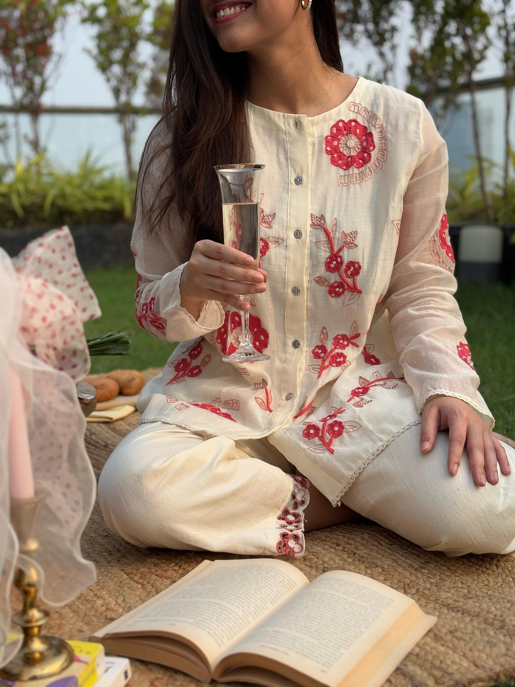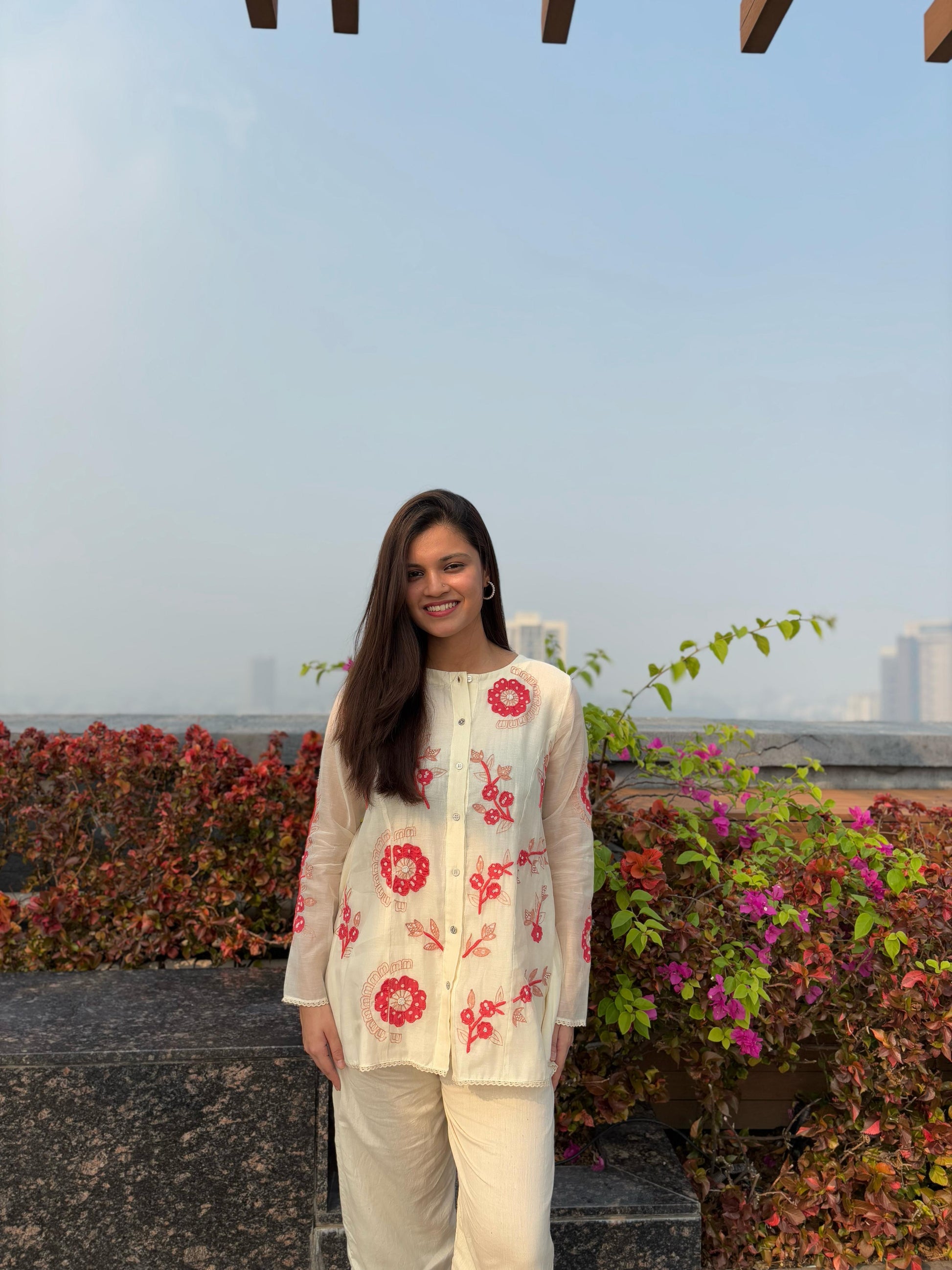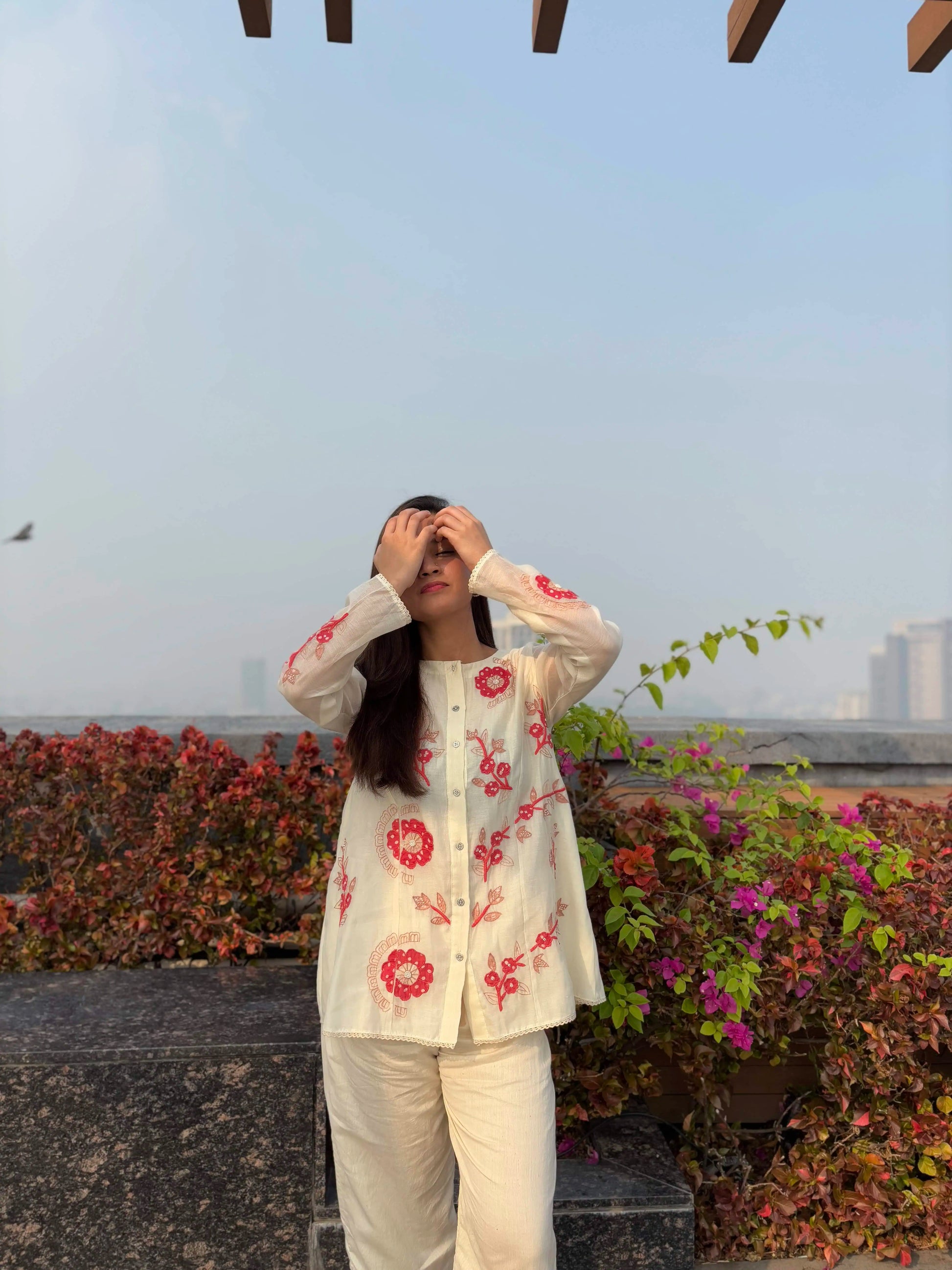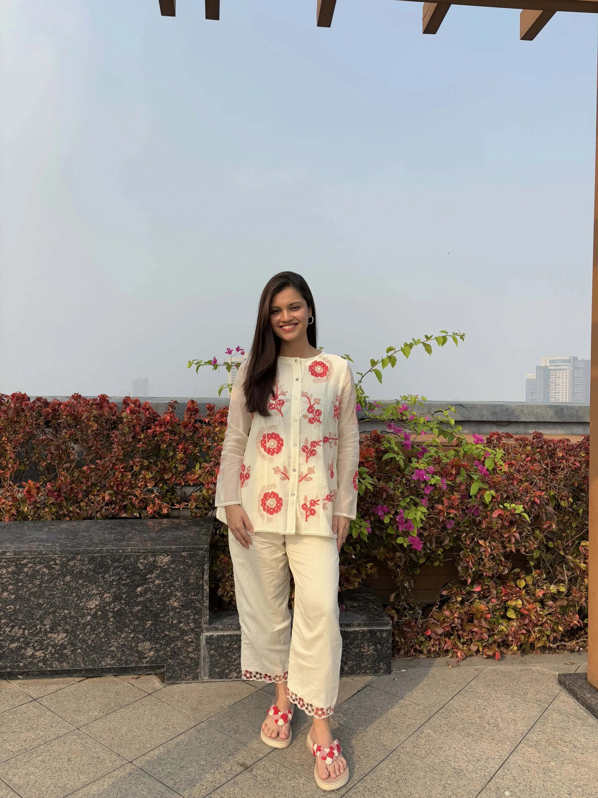 Product Description: Our lightweight cotton silk bomber jacket offers endless layering and styling options. Crafted on a ivory base adorned with block printed appliqued flowers and lace detailing on the hemline.