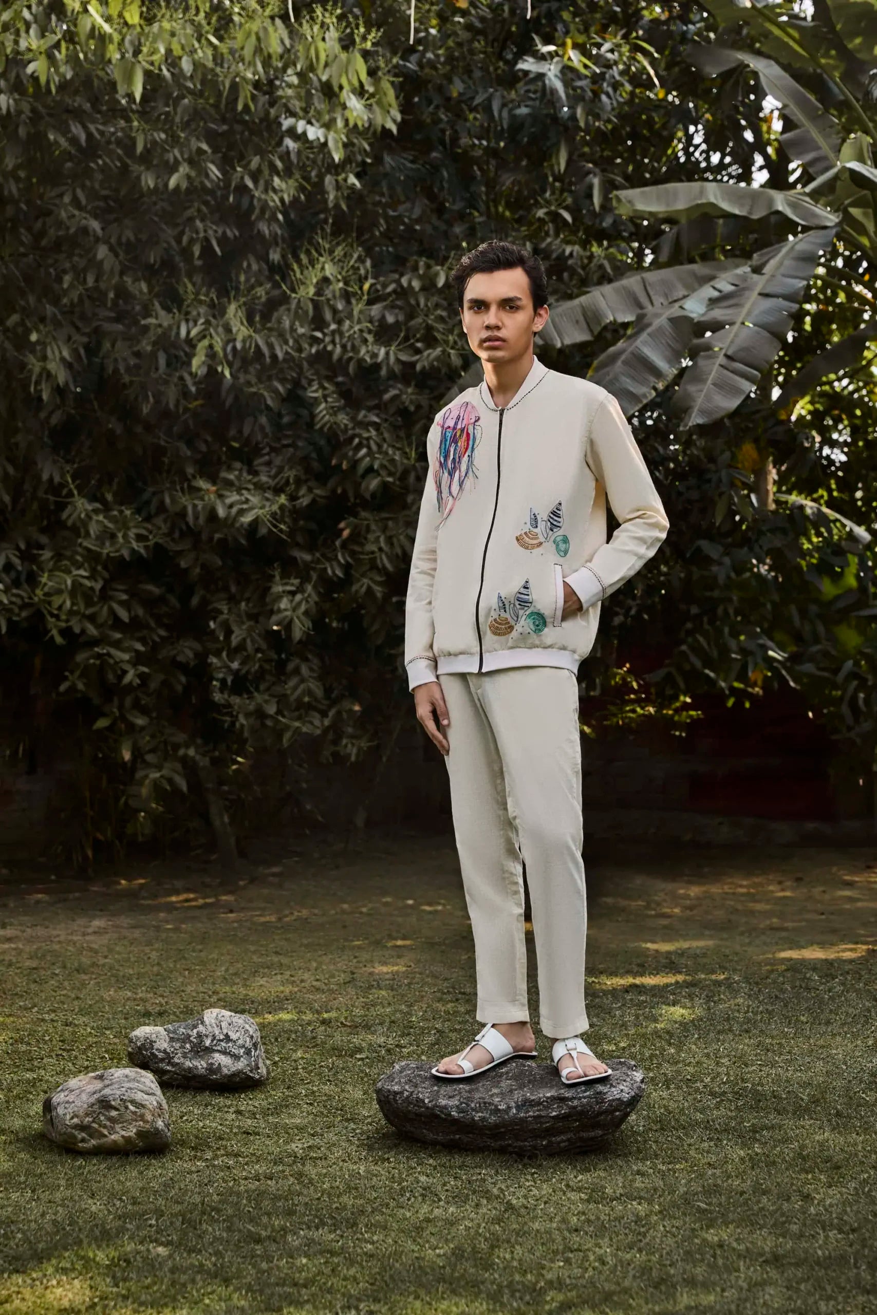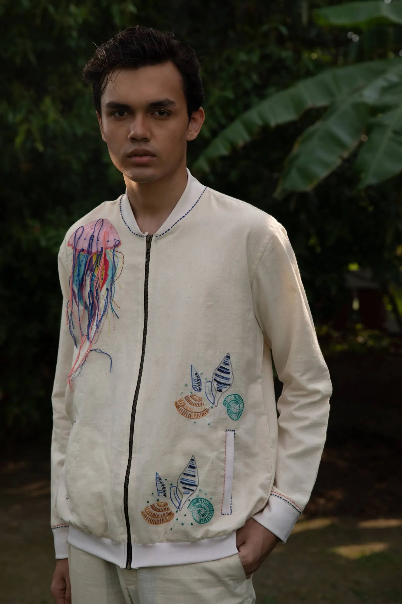 Product Description: Featuring an ivory bomber jacket in handwoven cotton linen base with hand painted print and hand embroidery. Ideal for casual wear and occasions that embrace a carefree spirit.