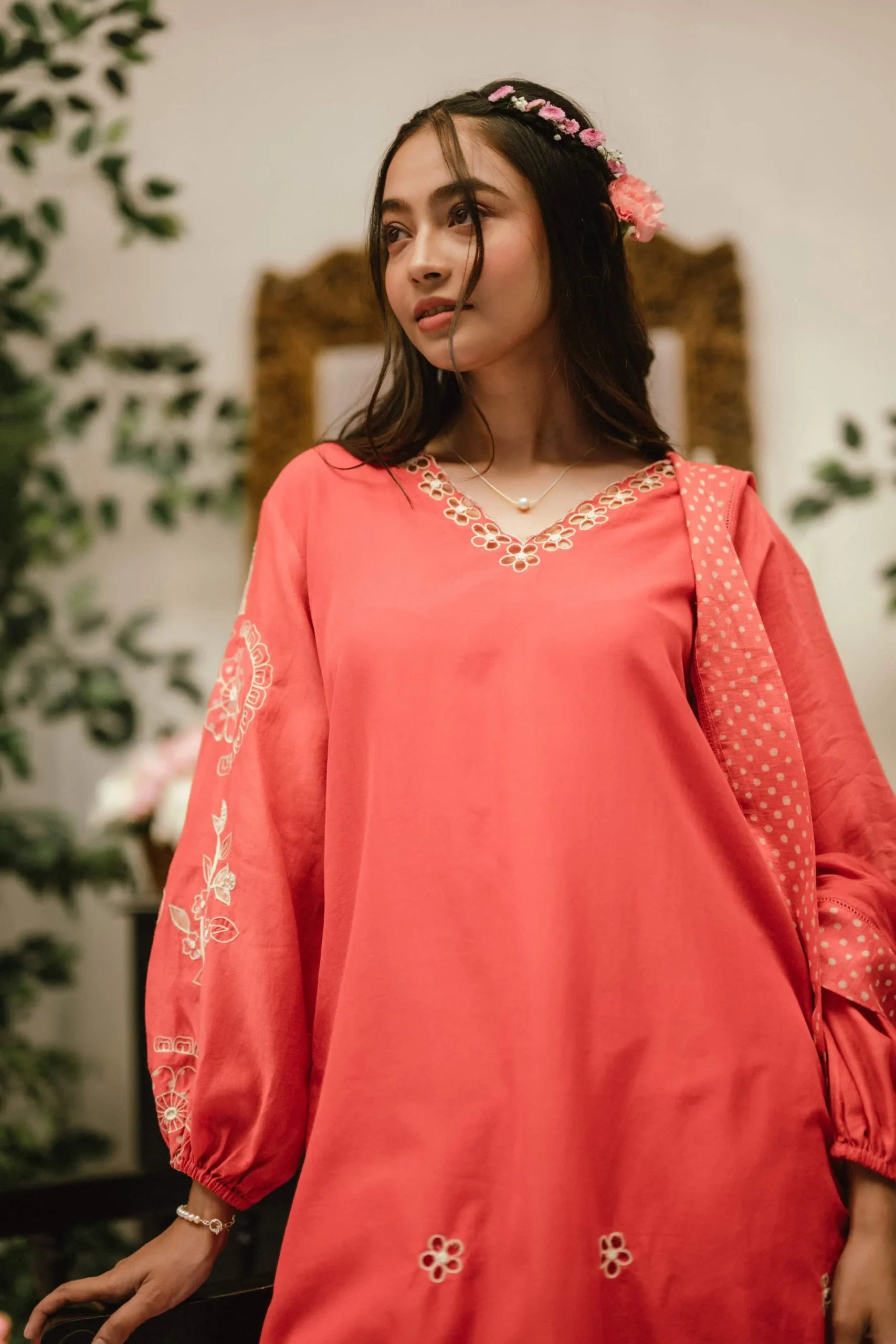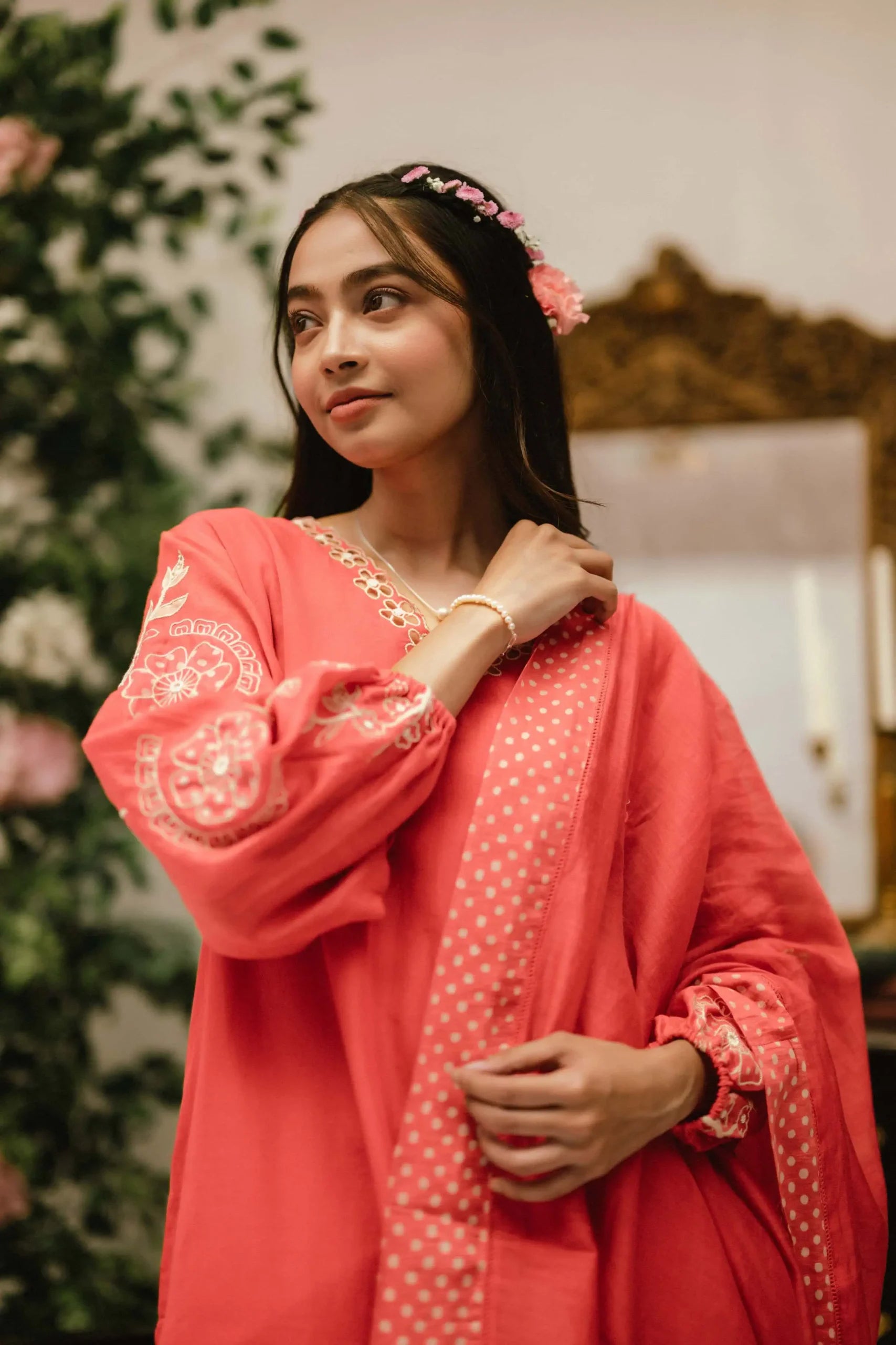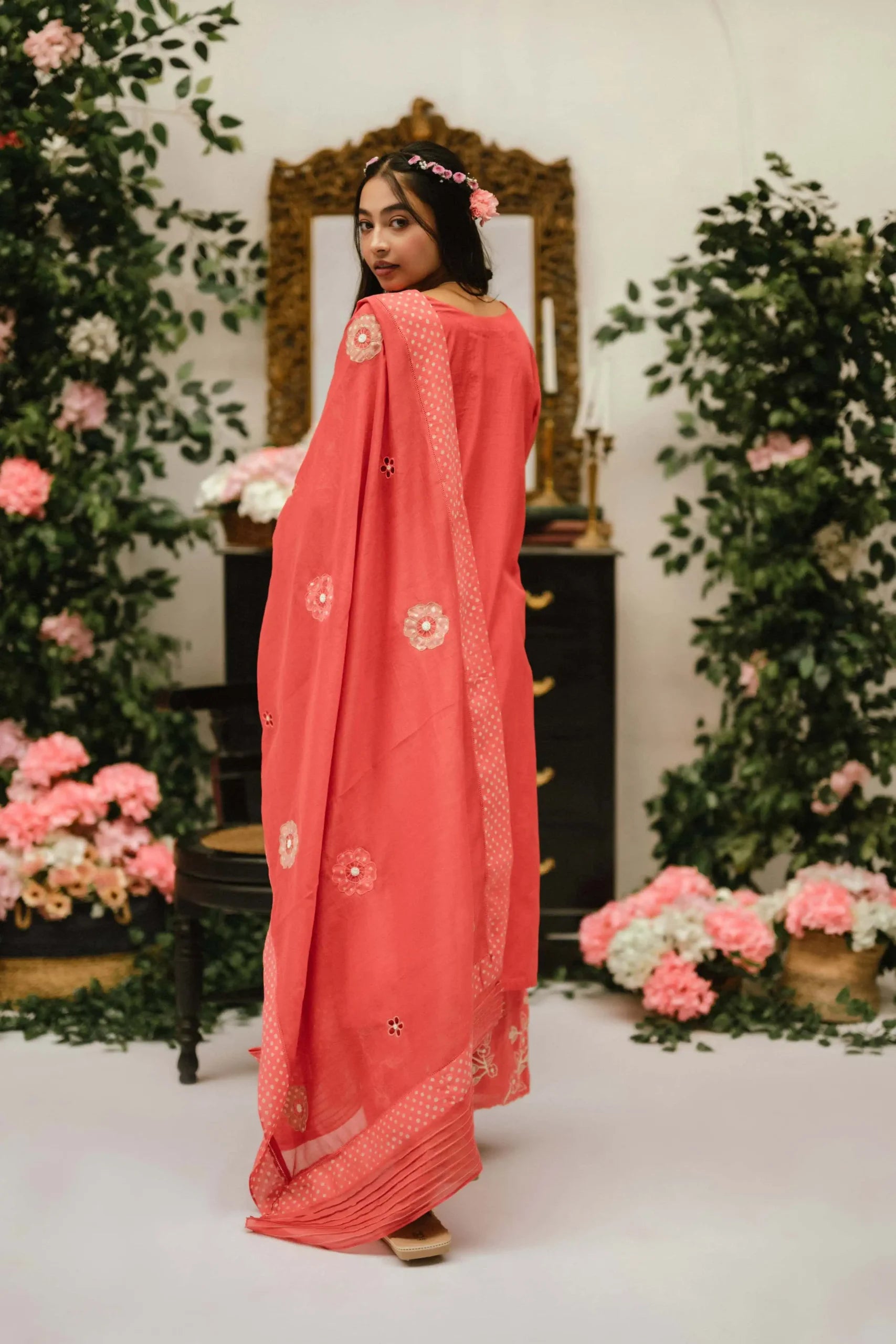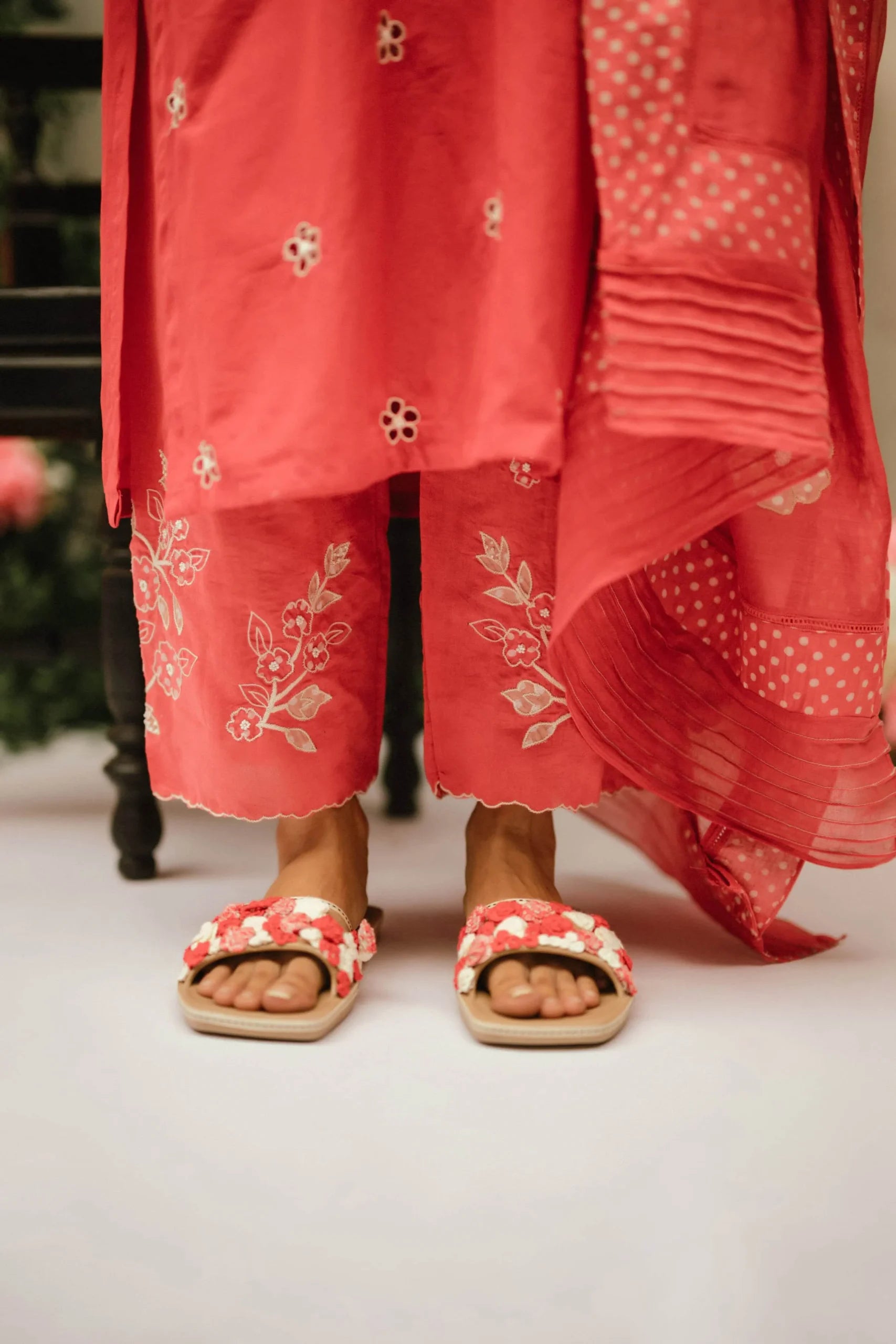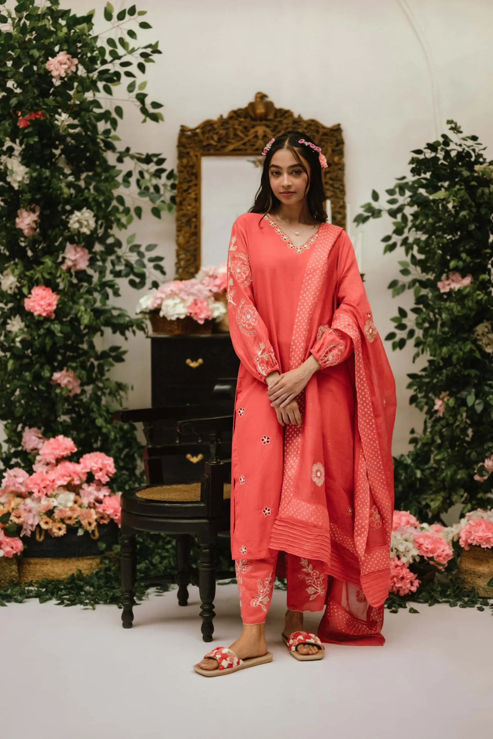 Product Description: Our Barlow is a voice of romantice in the wild! Made in the finest variety of organic cotton with beautiful hand appliqued flowers on the sleeves and pants. Paired with a dreamy, embroidered dupatta to complete the look.