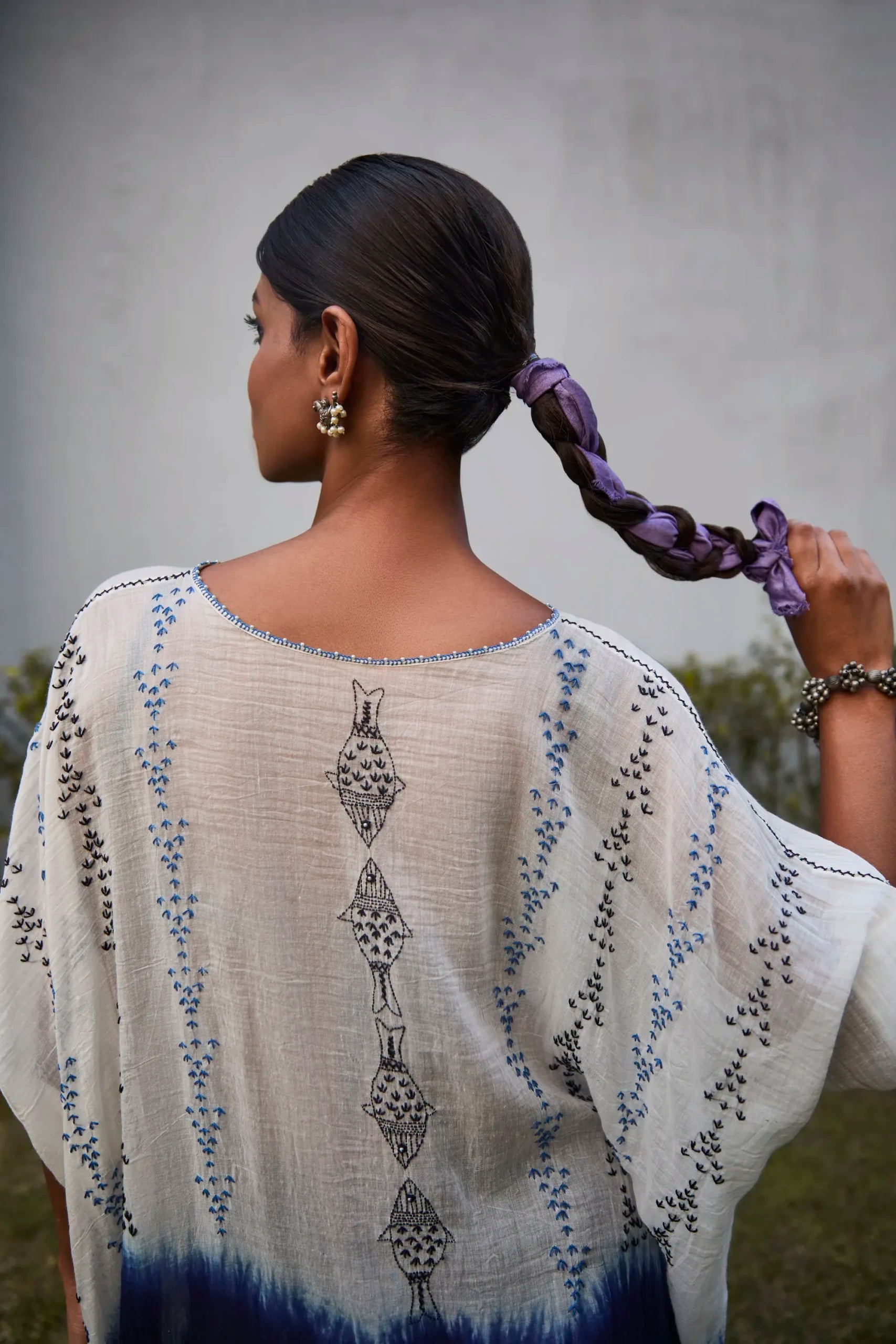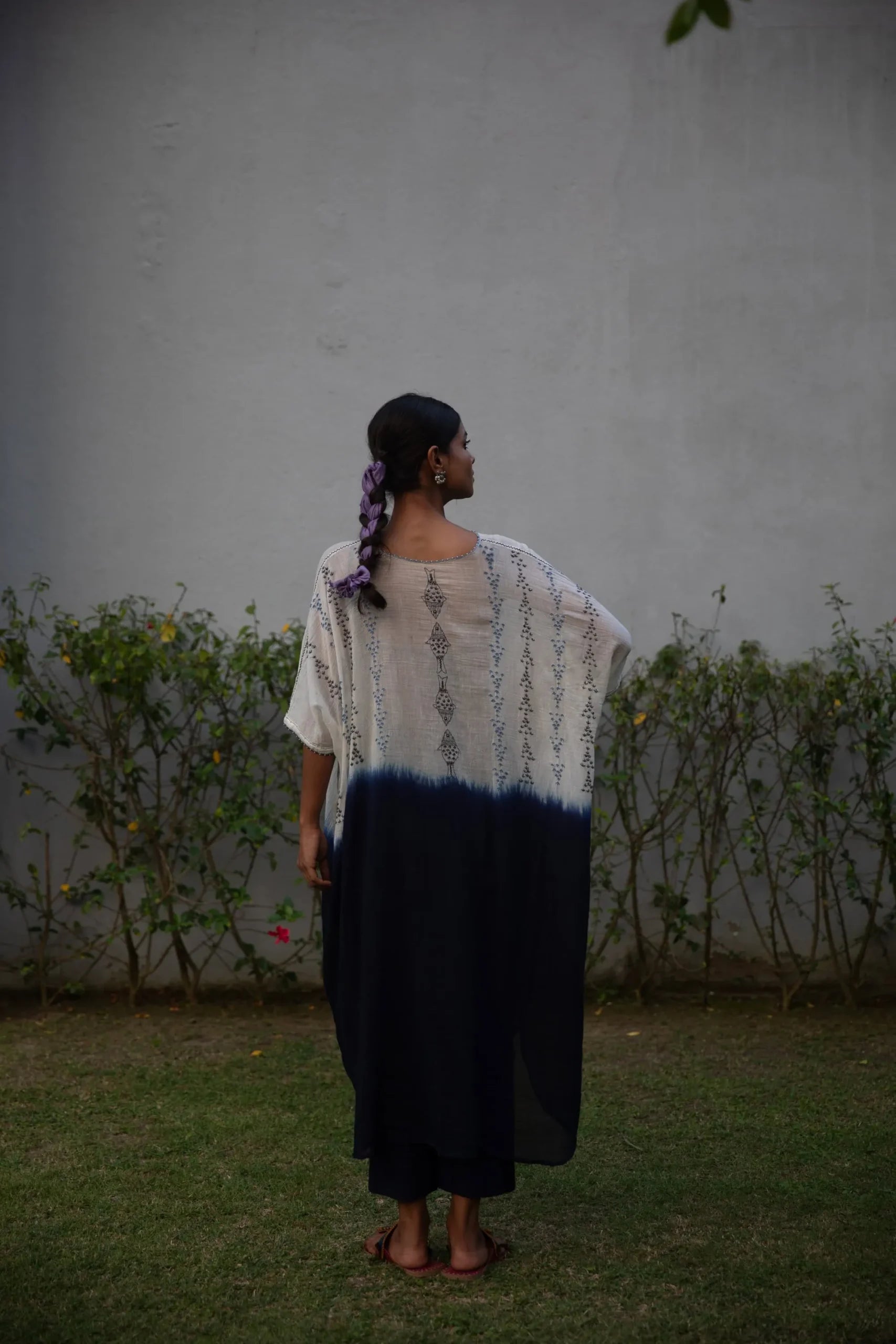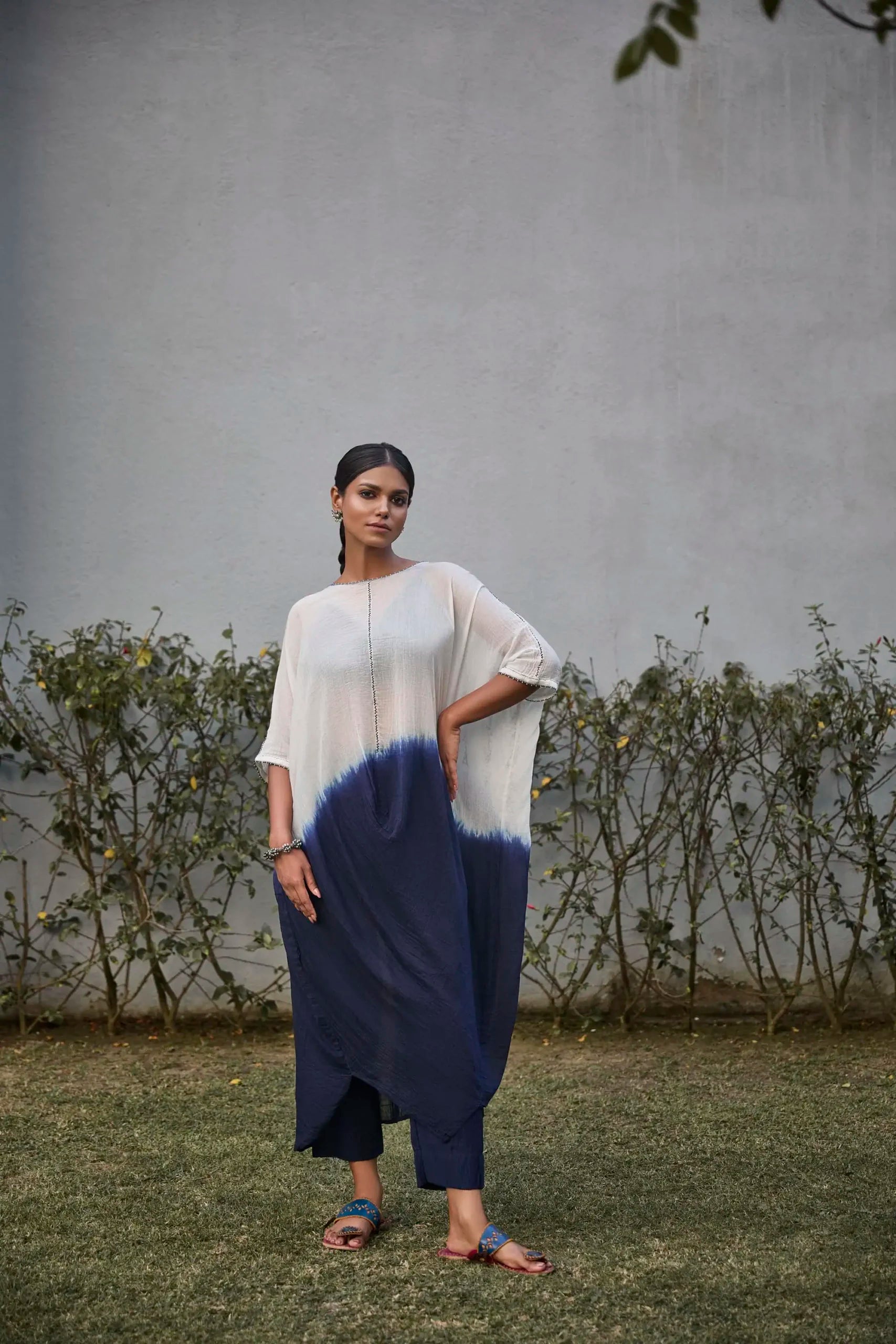 Product Description: Featuring an ivory and blue asymmetrical tunic in handwoven cotton silk base with kantha embroidery. It is paired with striped cotton trousers and a bralette. Accentuate it with minimal jewelry and heels for a complete look.