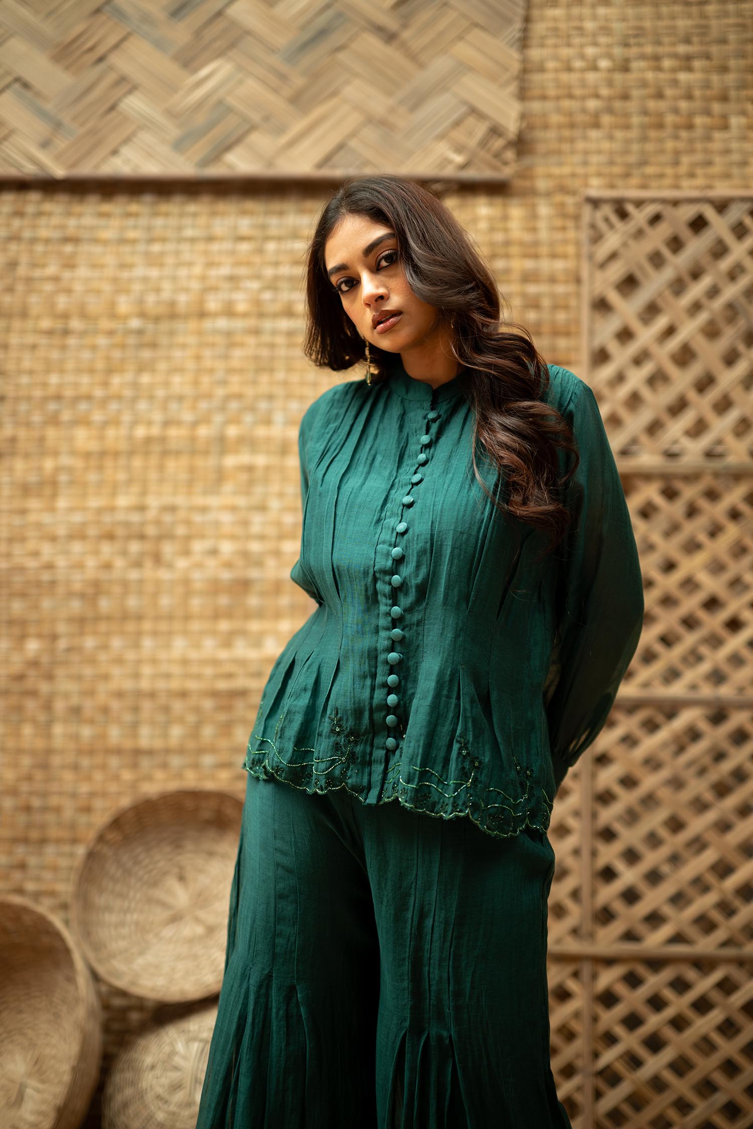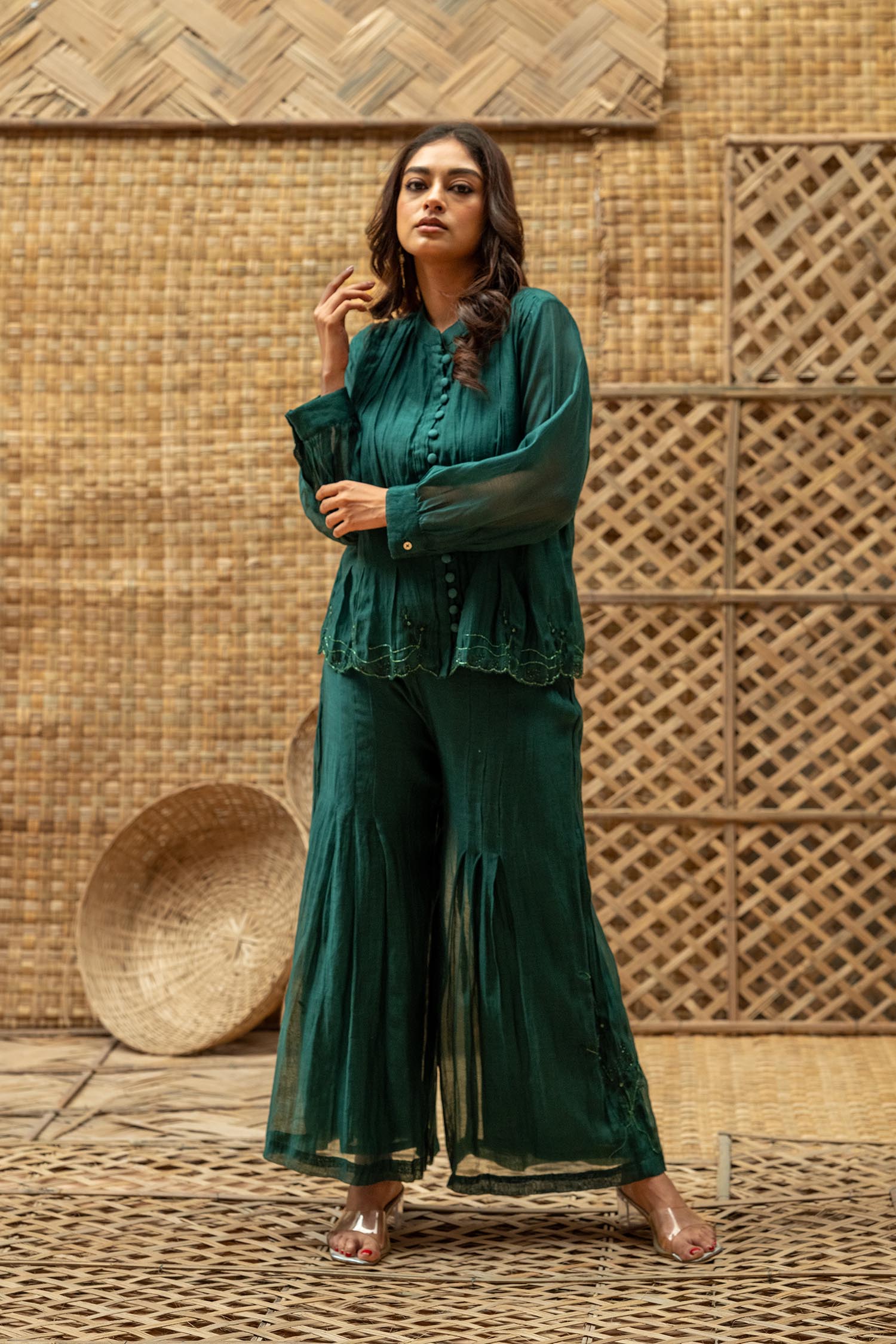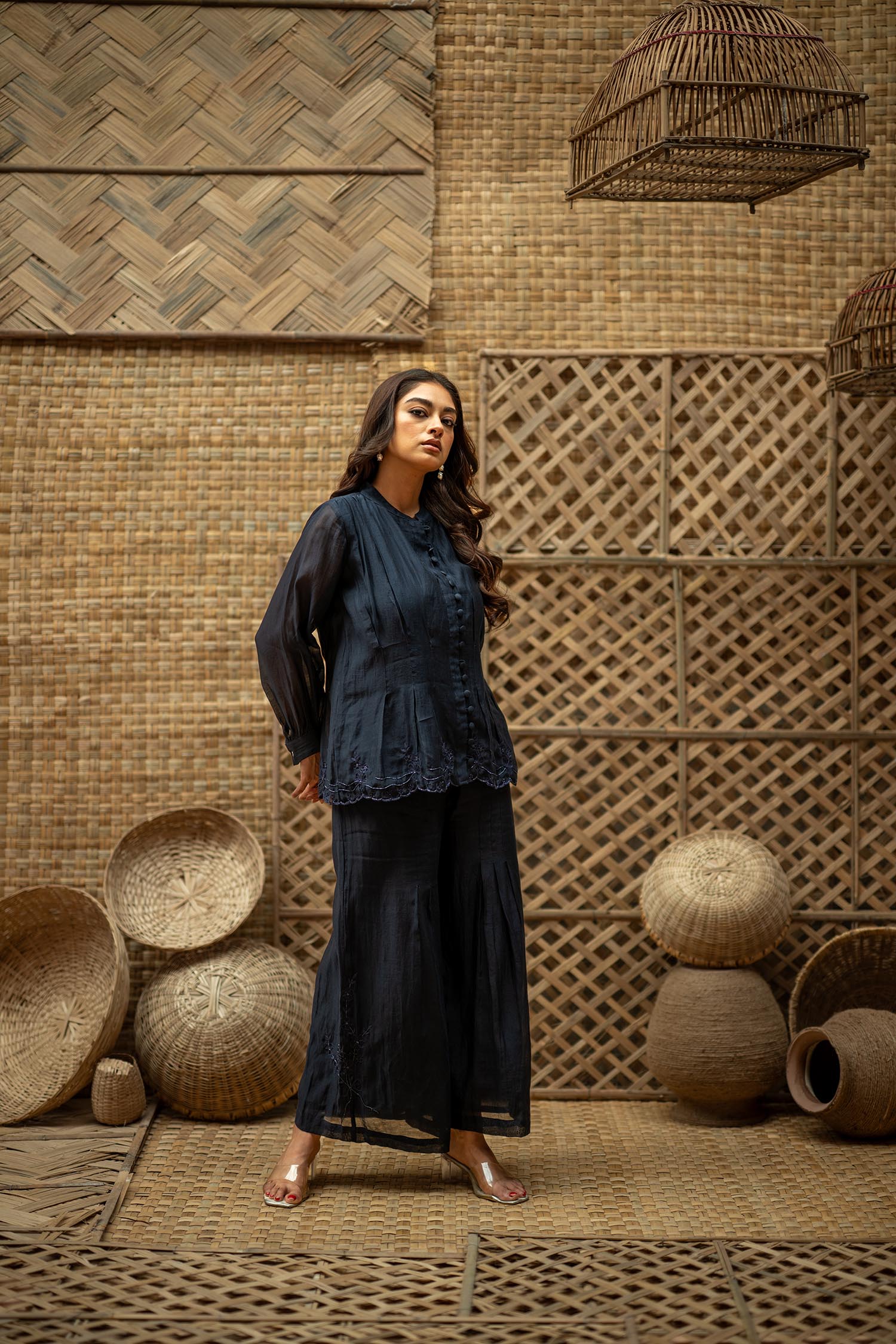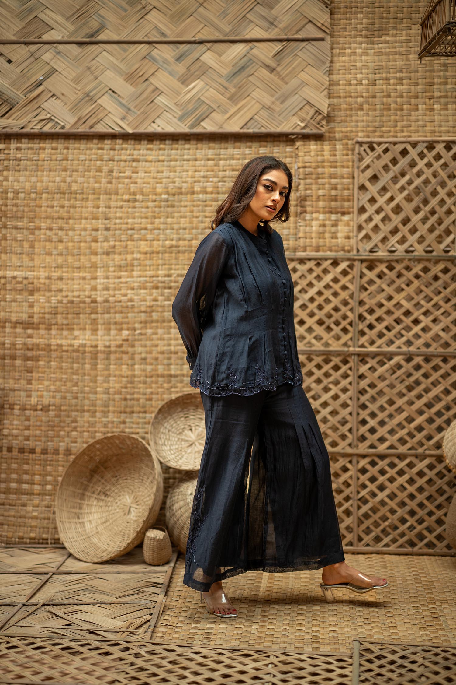 Product Description: Pleated flared top with cutwork hemline. Hand embroidered with thread and glass bugles. Paired with fit and flare pleated pants with embroidery details.