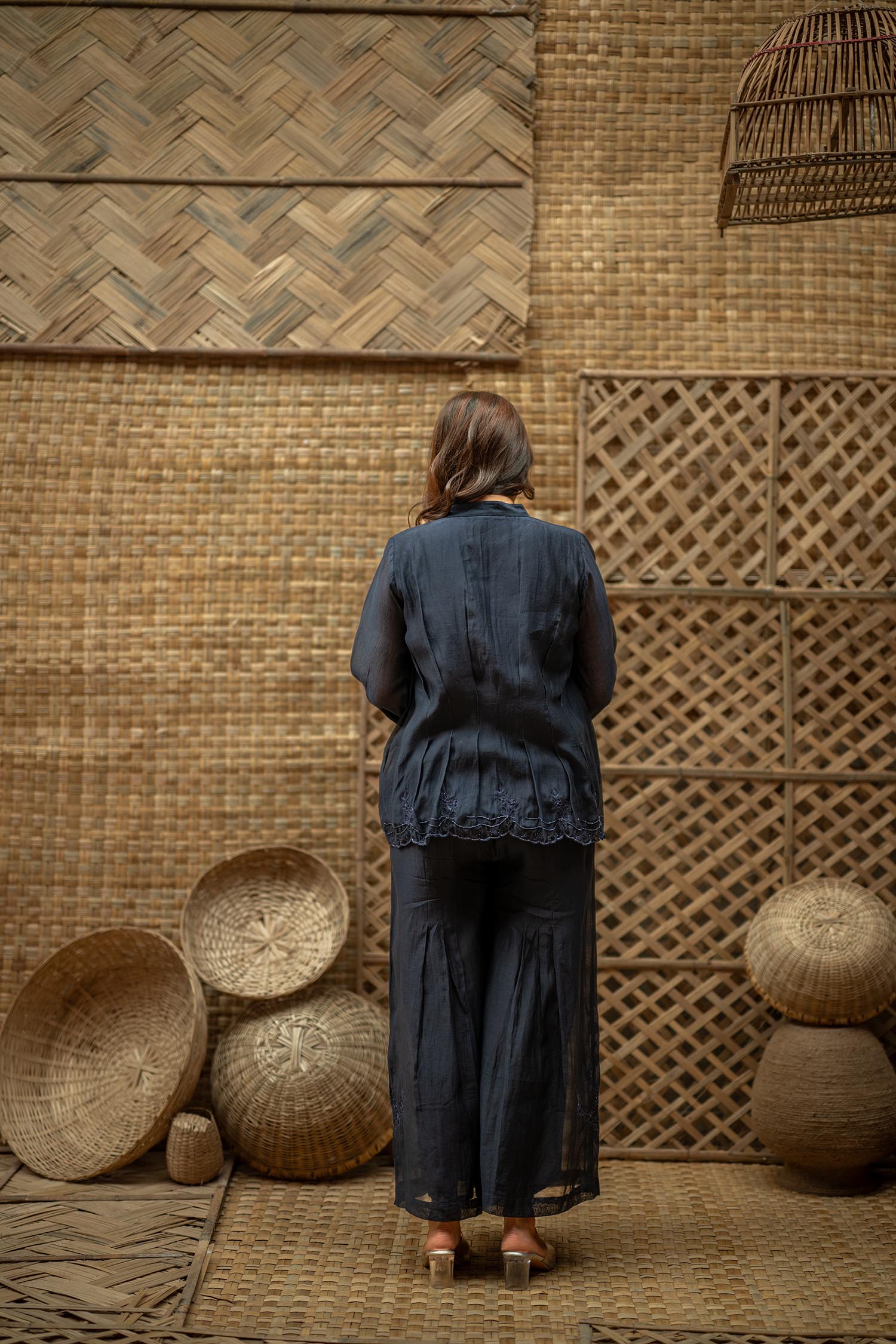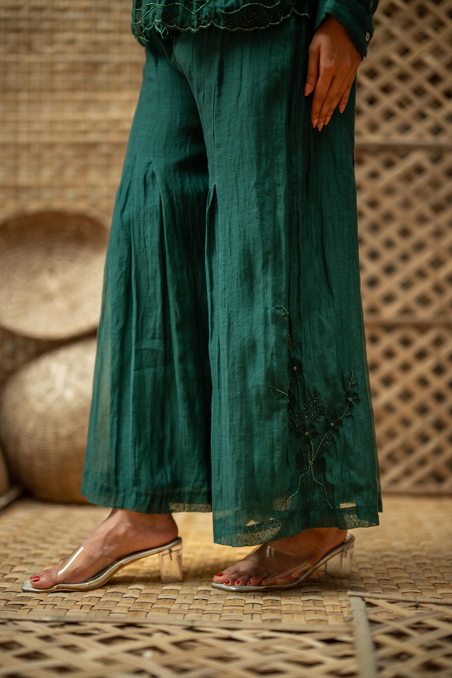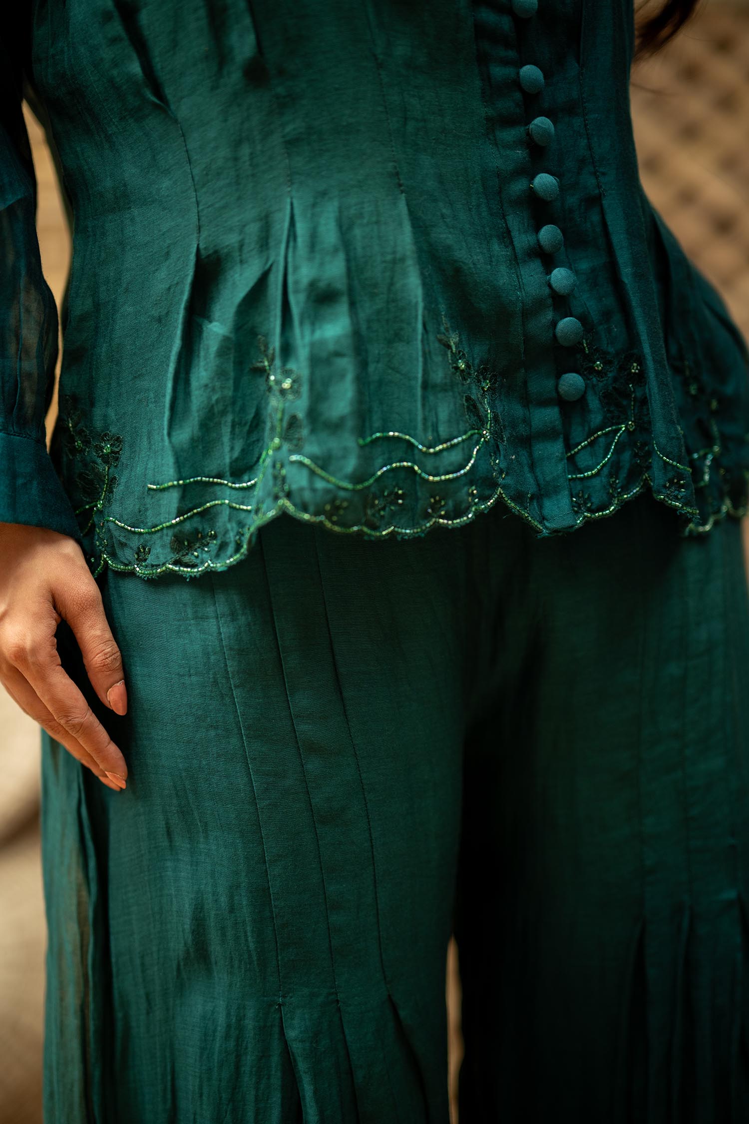 Product Description: Pleated flared top with cutwork hemline. Hand embroidered with thread and glass bugles. Paired with fit and flare pleated pants with embroidery details.