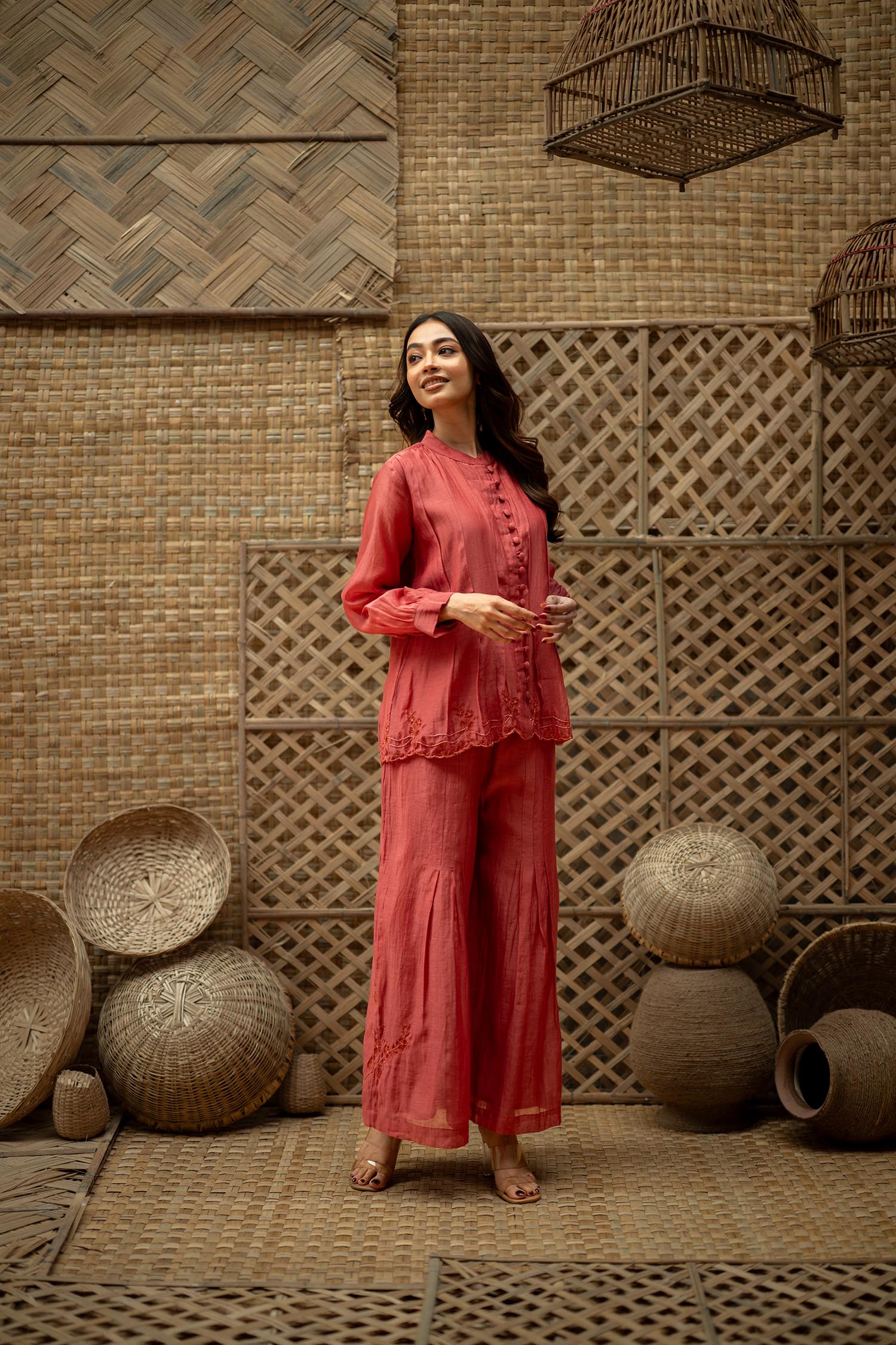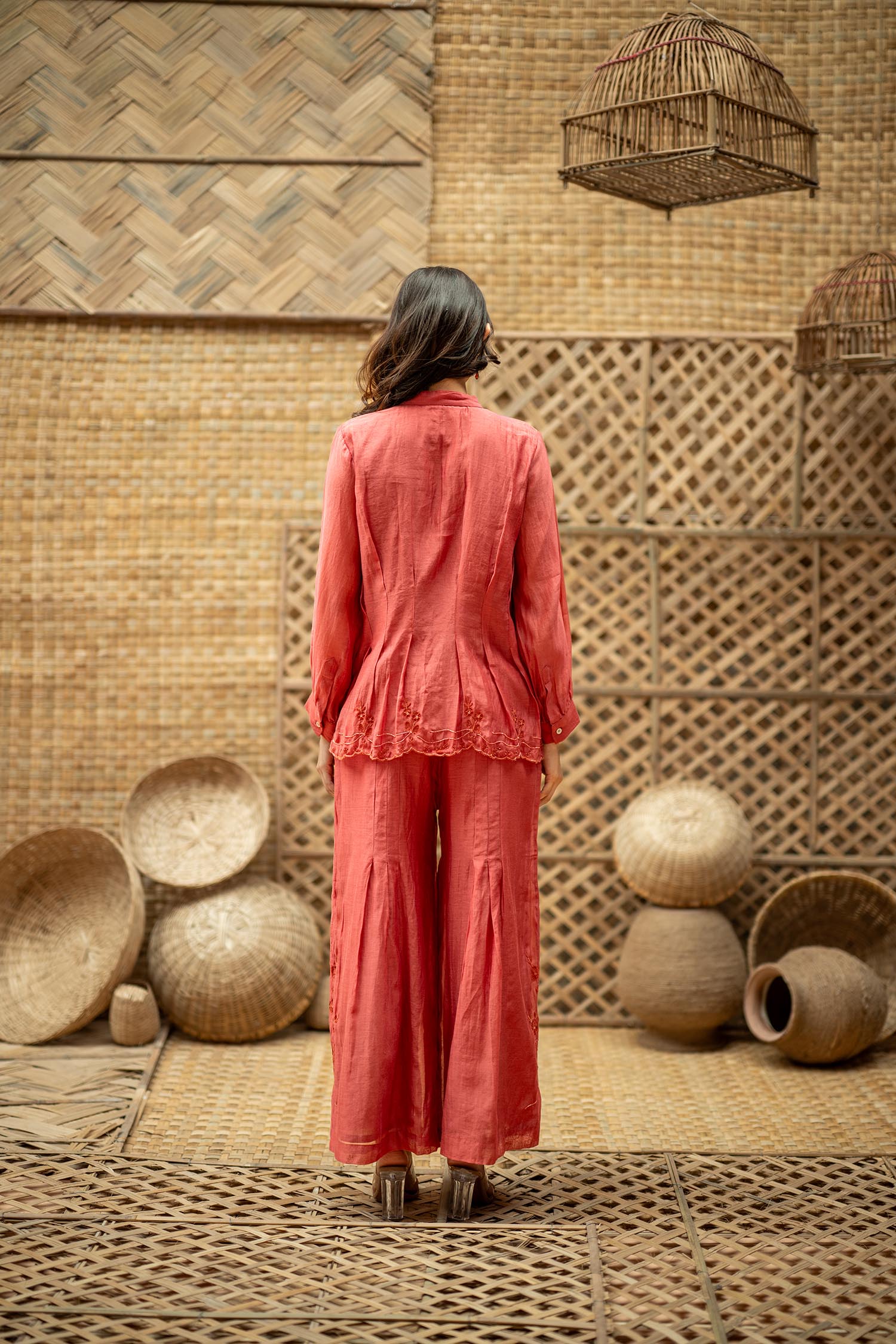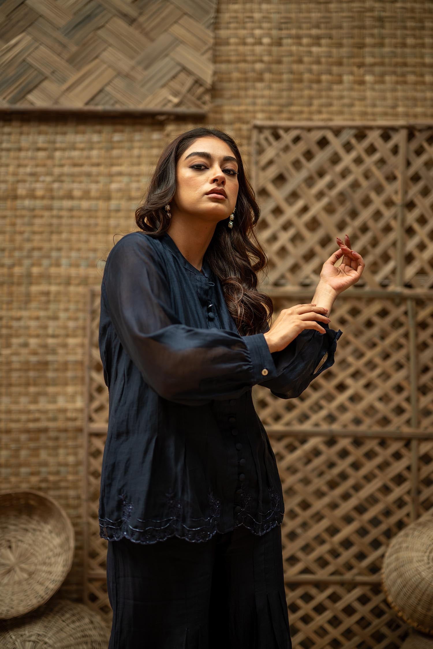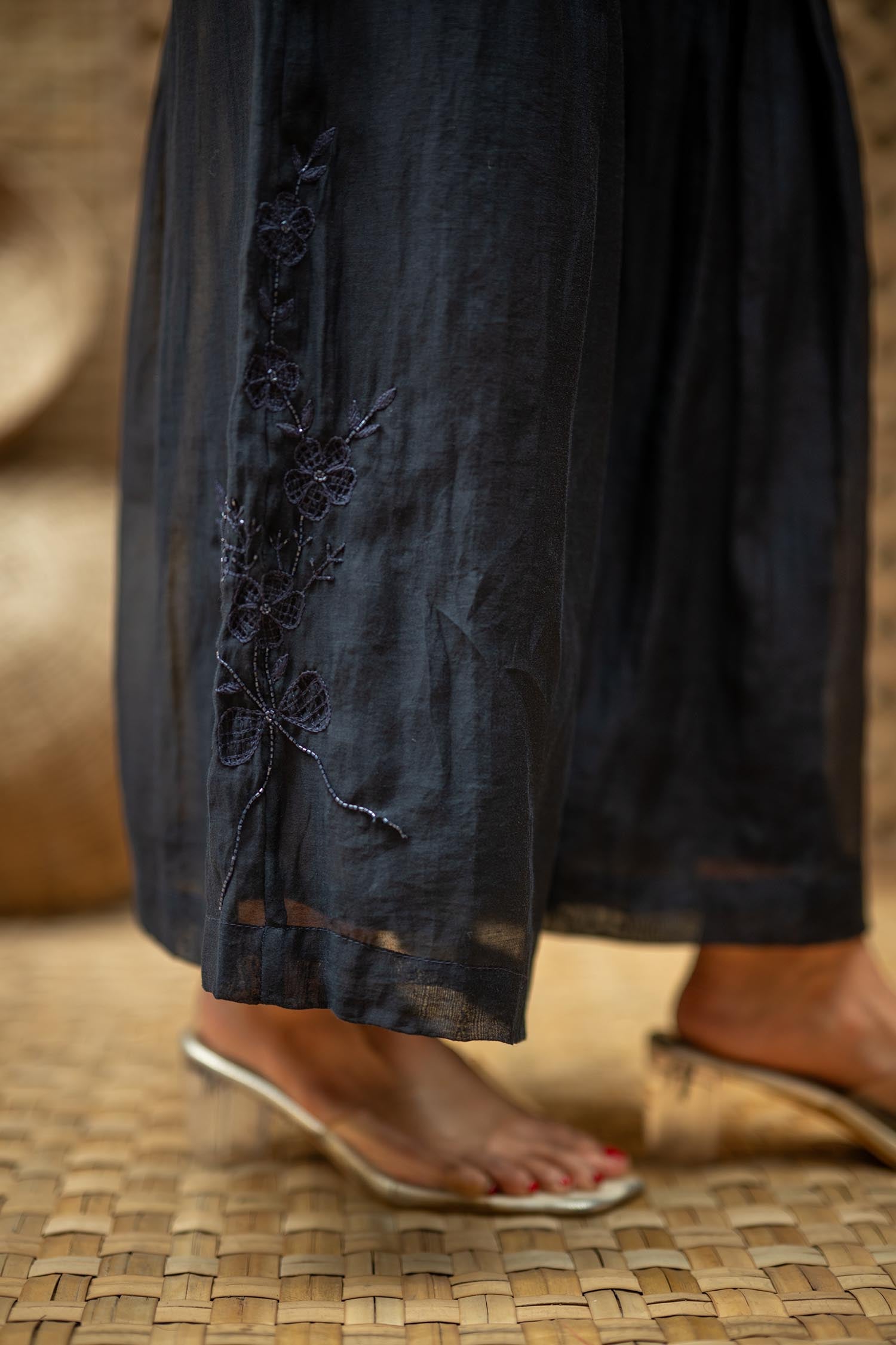 Product Description: Pleated flared top with cutwork hemline. Hand embroidered with thread and glass bugles. Paired with fit and flare pleated pants with embroidery details.