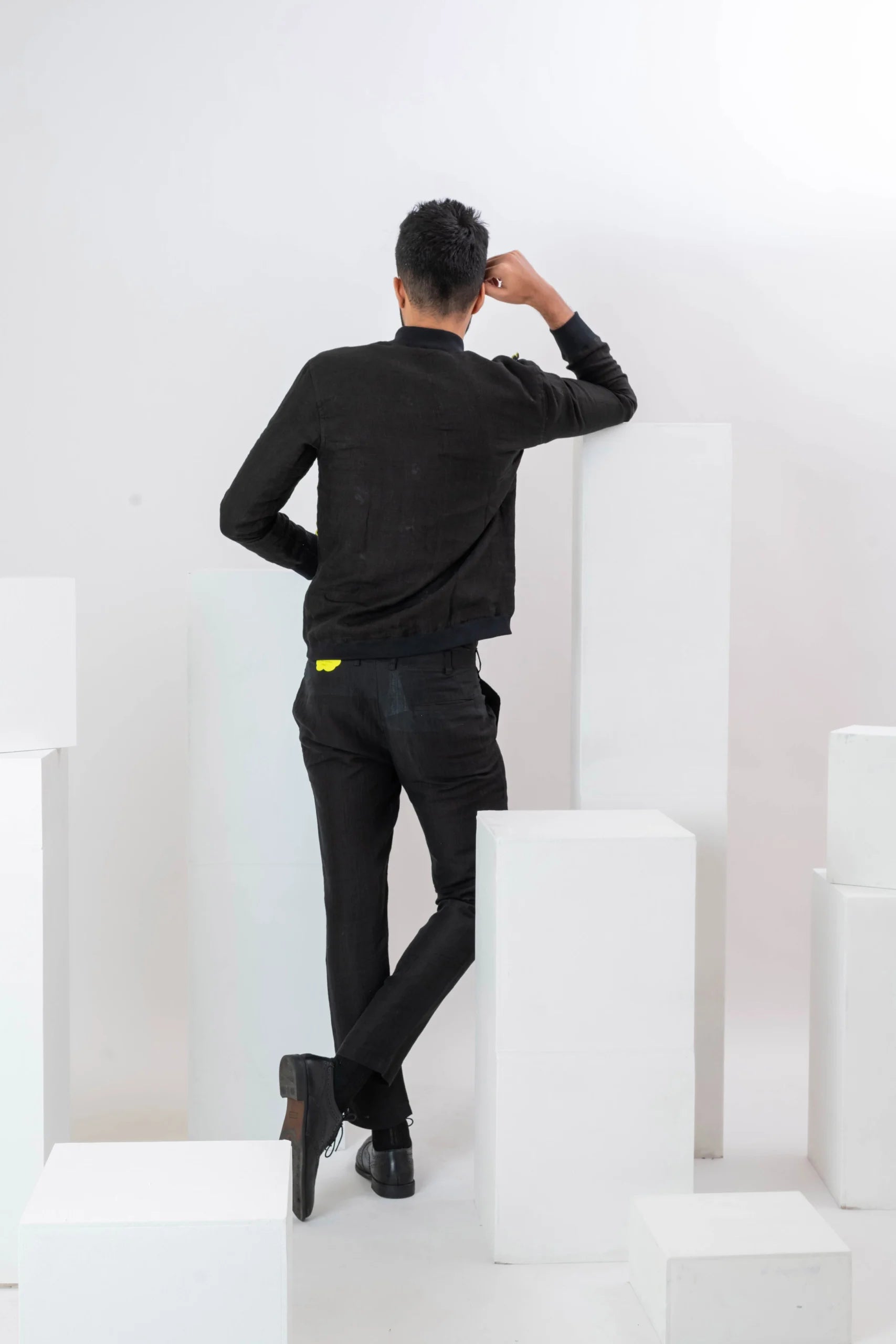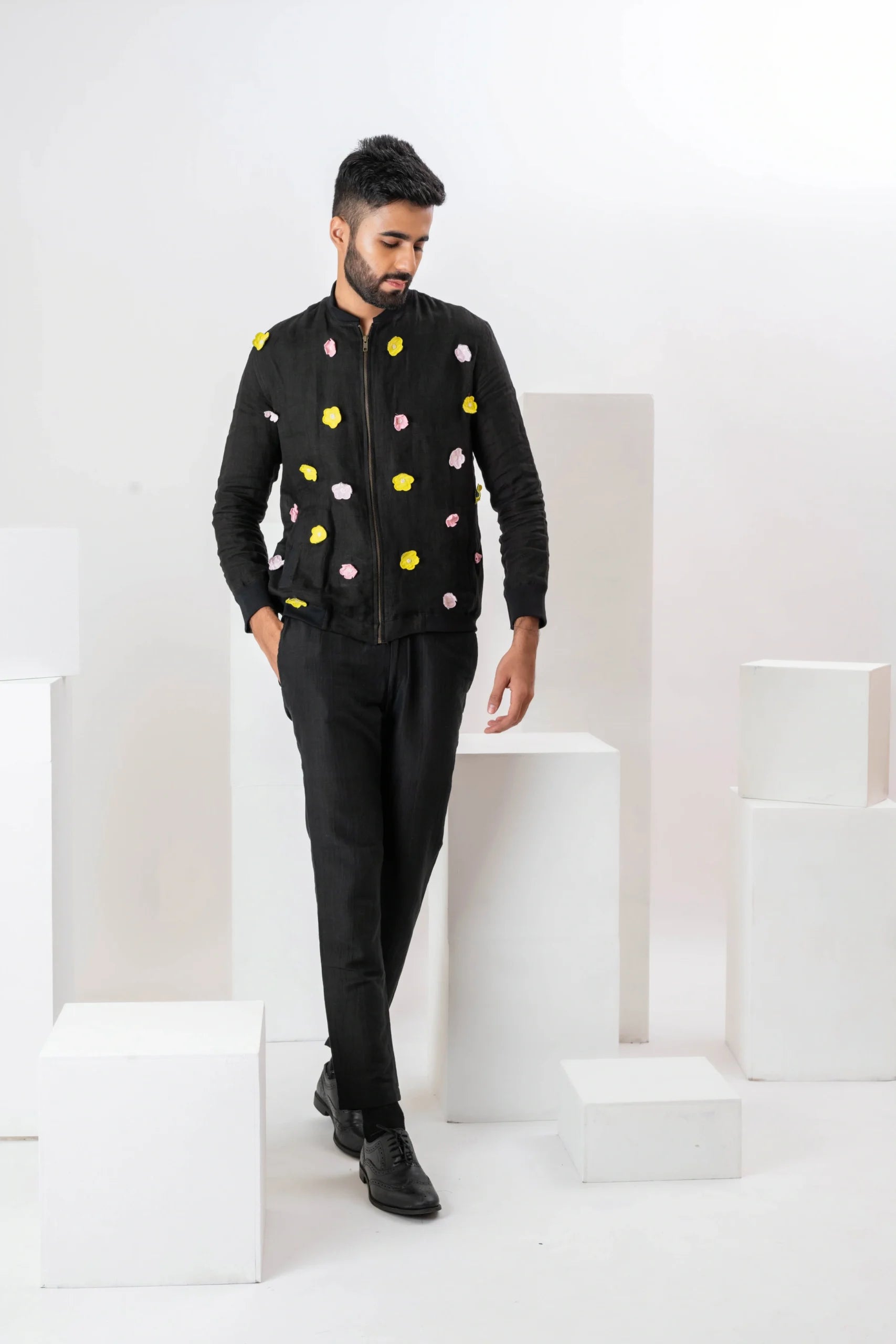 Product Description: Featuring a black bomber jacket in linen base with floral applique work. Perfect wear for a casual outing.