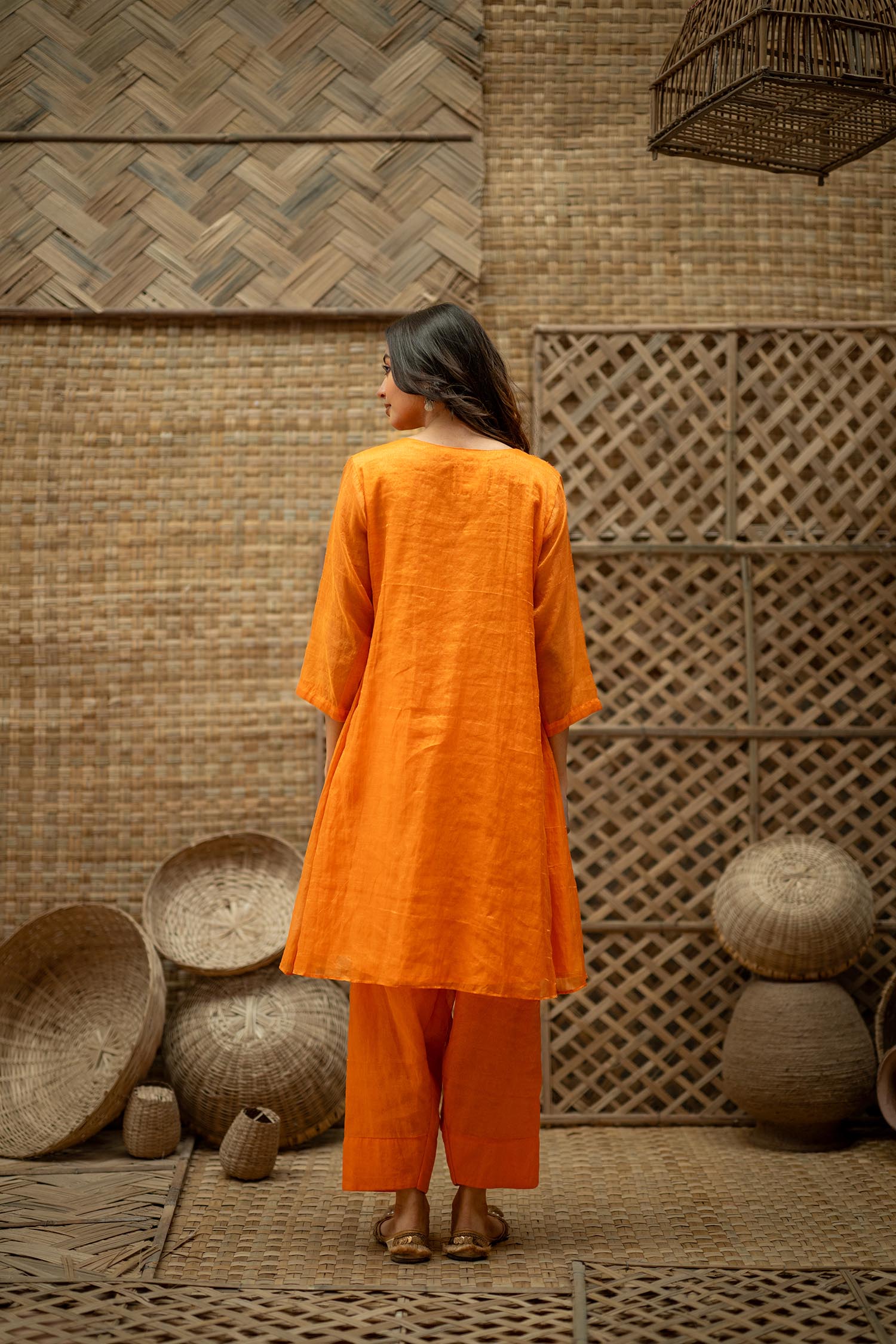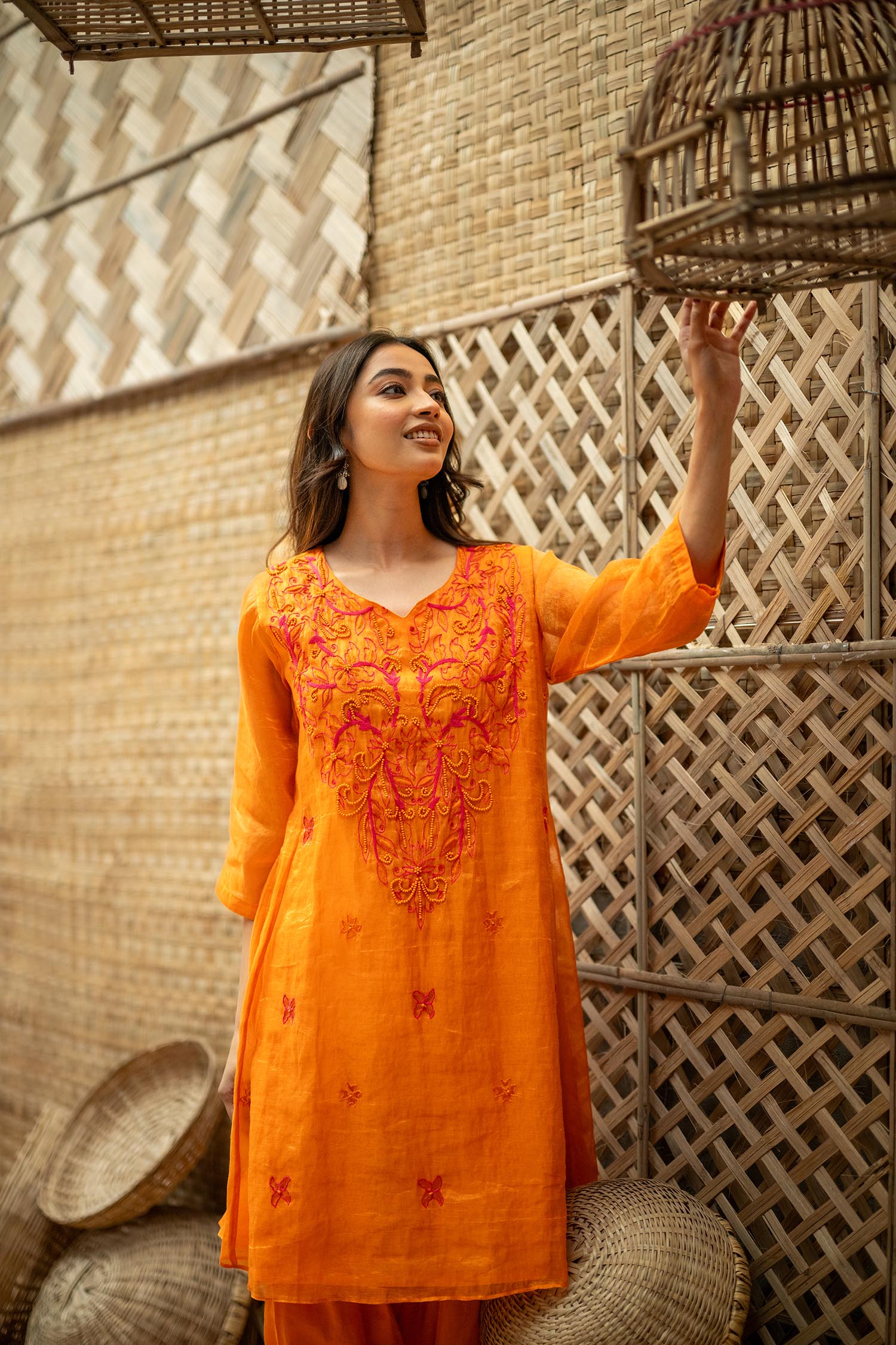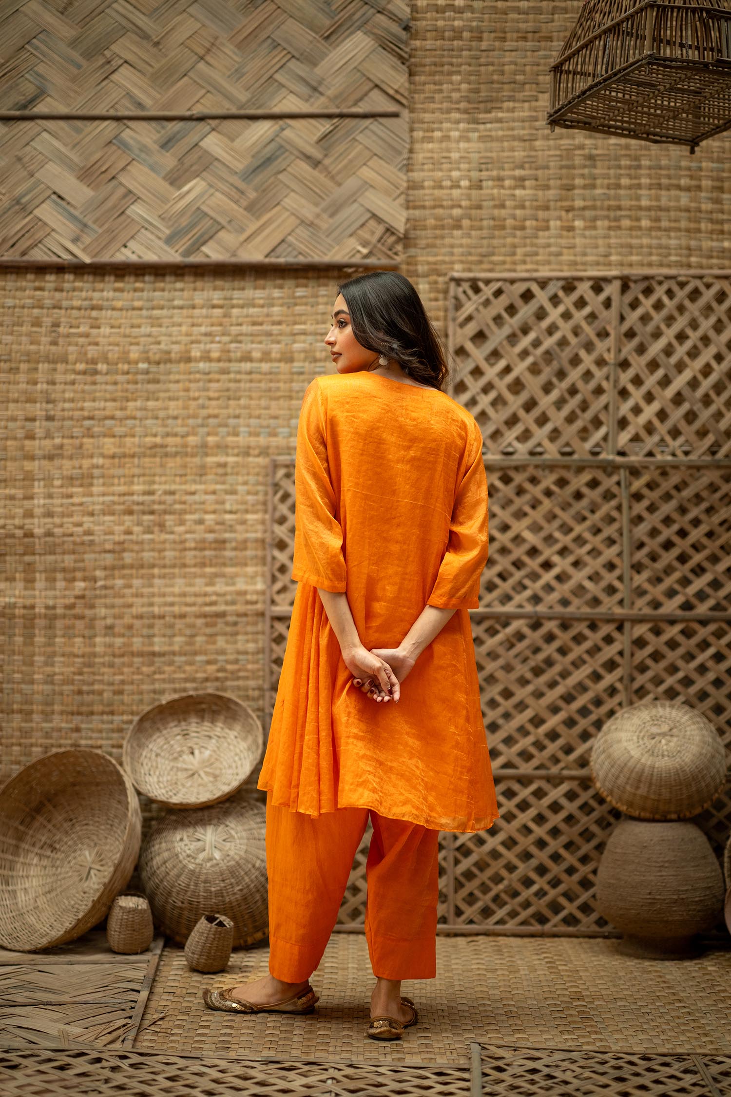 Product Description: Embroidered Tissue Silk kurta- Set of 2, a bold, layered two-piece that celebrates structure ornamentation in beads: the tissue silk kurta opens the set with concentrated embroidery, sculptural A line, a V-neckline and 3/4th sleeves that combine traditional form with modern edge; paired with tissue silk pants that echo the kurta’s finish. The Embroidered Tissue Silk kurta- Set of 2 is crafted for moments that call for confident color, tactile contrasts, and a tailored yet ornate presence.