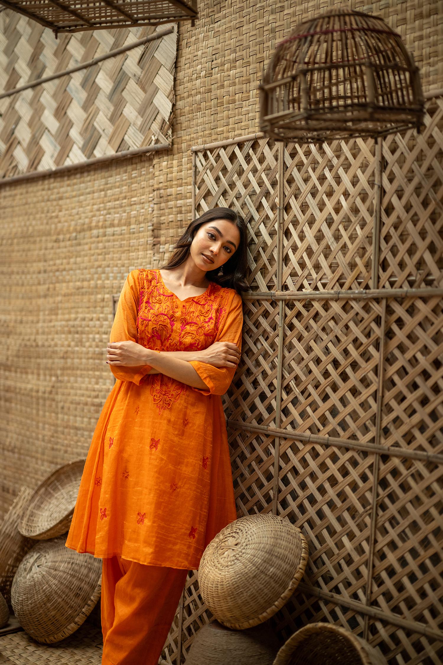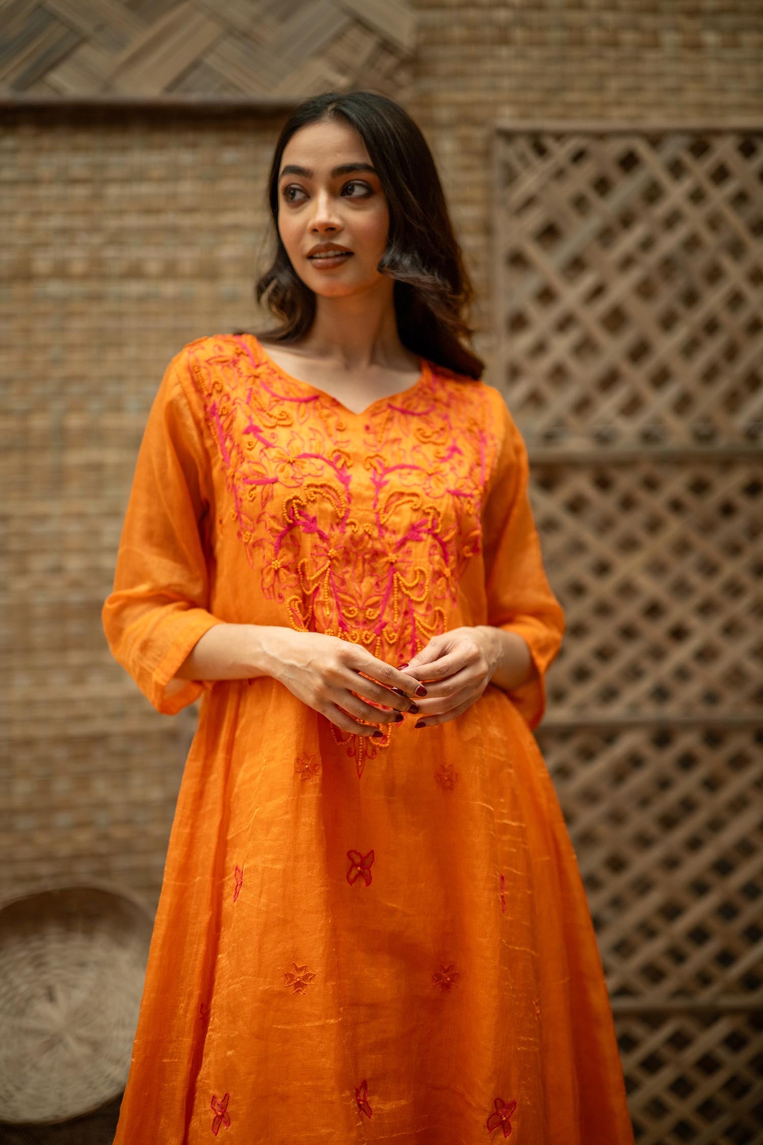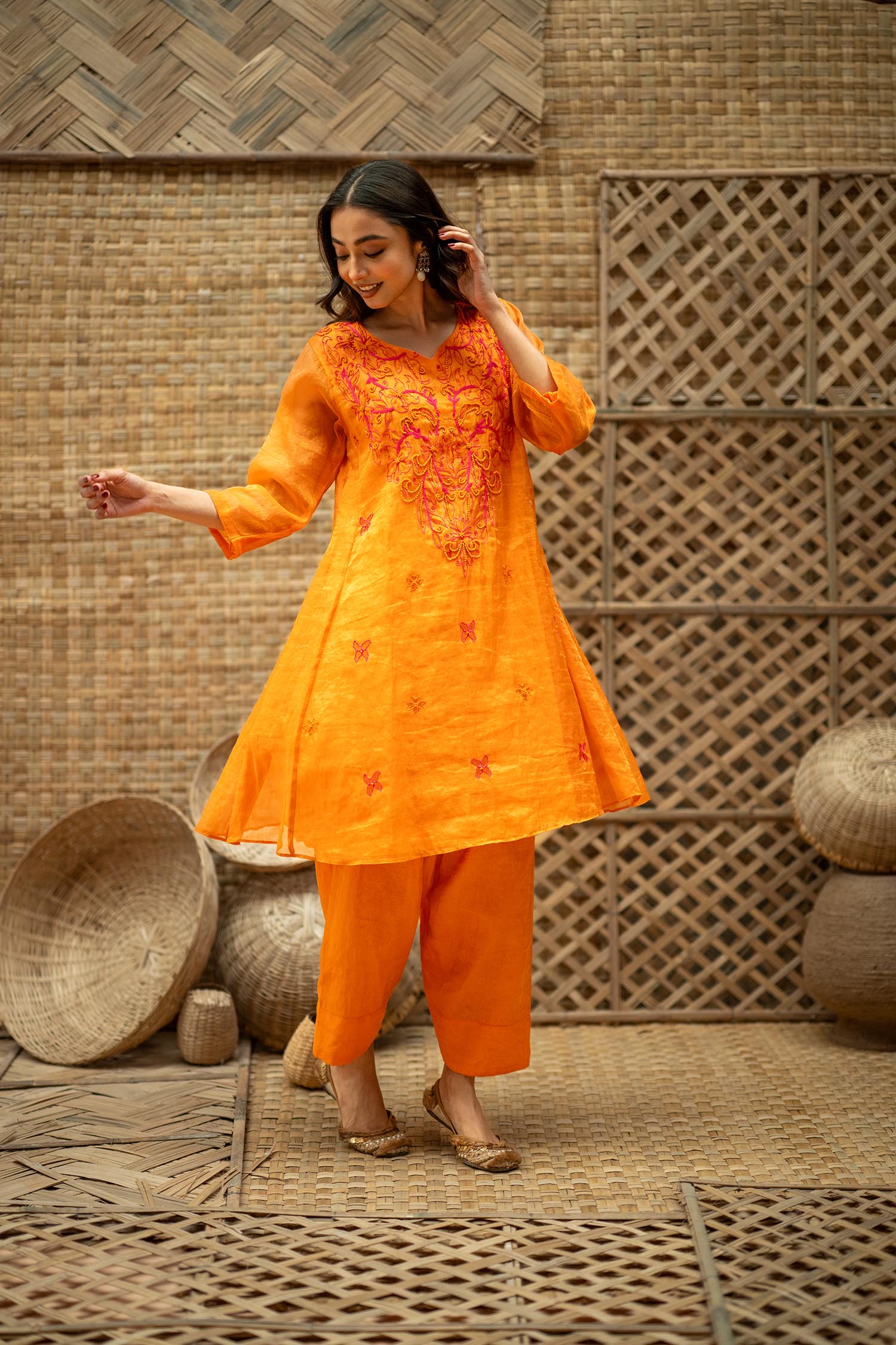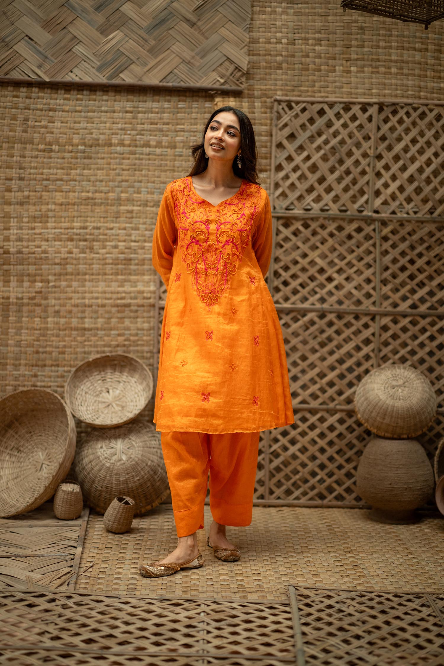 Product Description: Embroidered Tissue Silk kurta- Set of 2, a bold, layered two-piece that celebrates structure ornamentation in beads: the tissue silk kurta opens the set with concentrated embroidery, sculptural A line, a V-neckline and 3/4th sleeves that combine traditional form with modern edge; paired with tissue silk pants that echo the kurta’s finish. The Embroidered Tissue Silk kurta- Set of 2 is crafted for moments that call for confident color, tactile contrasts, and a tailored yet ornate presence.