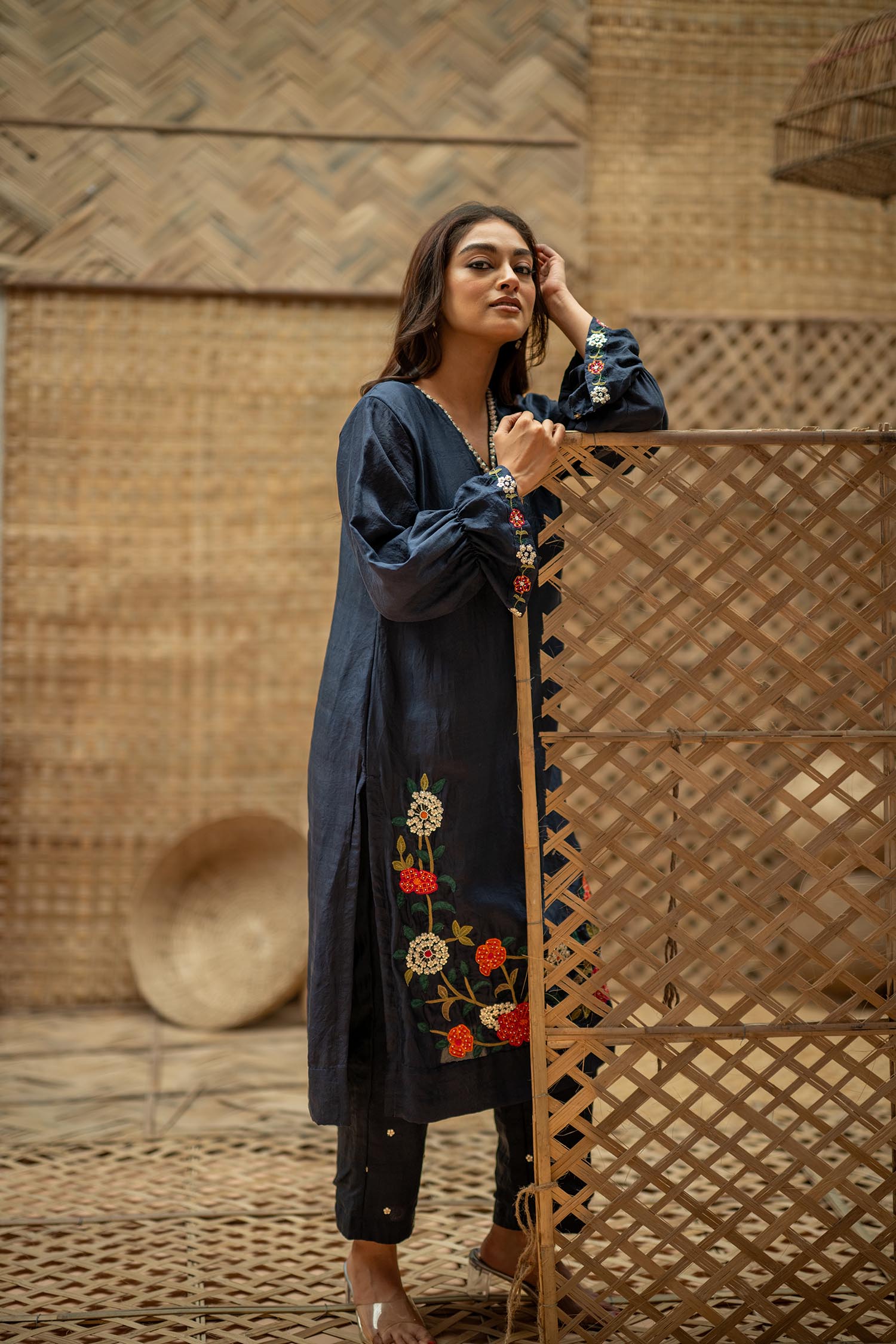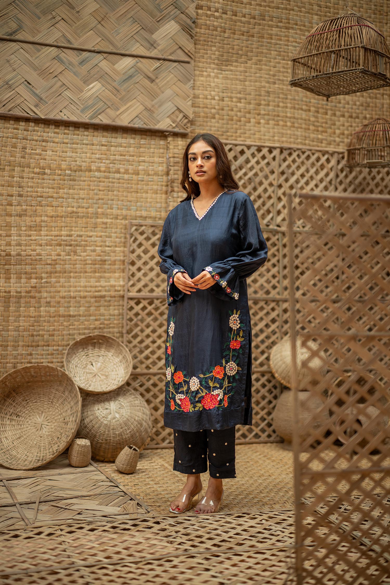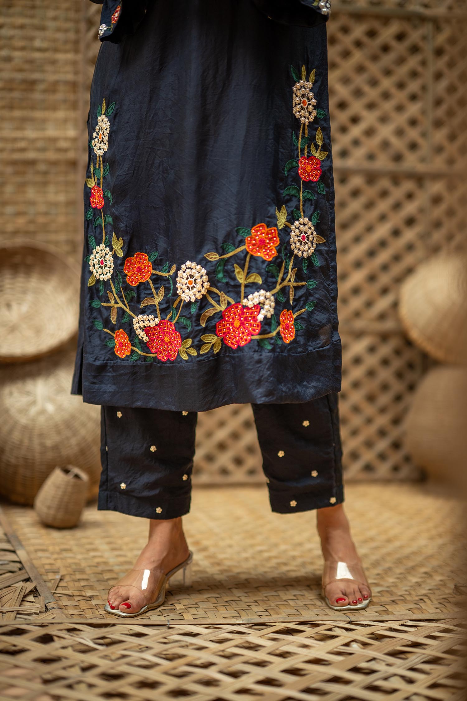 Product Description: Classic straight kurta set crafted in handwoven mulberry silk, hand appliquéd with vibrant flowers. The kurta features gathered sleeves with cutwork embroidery.