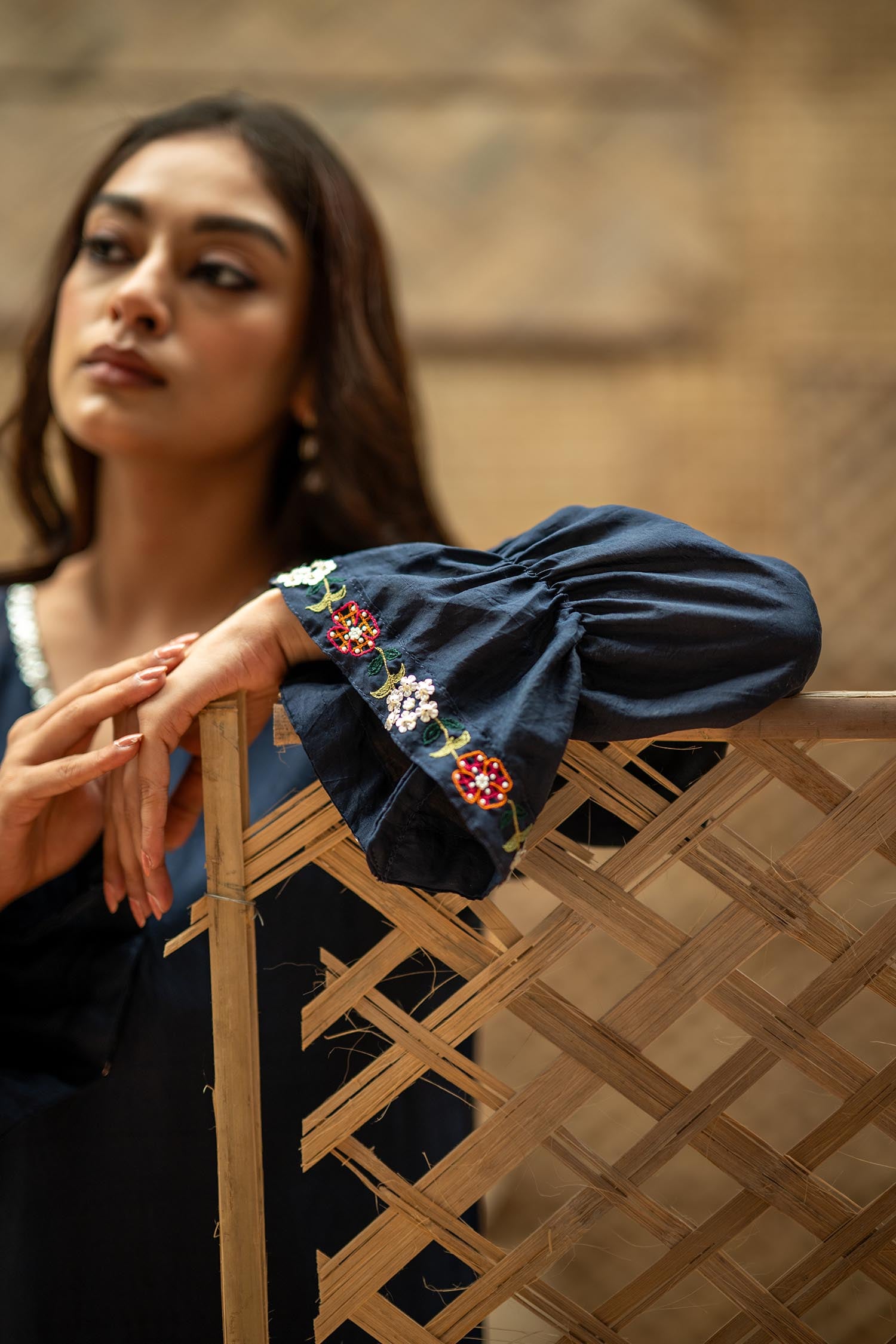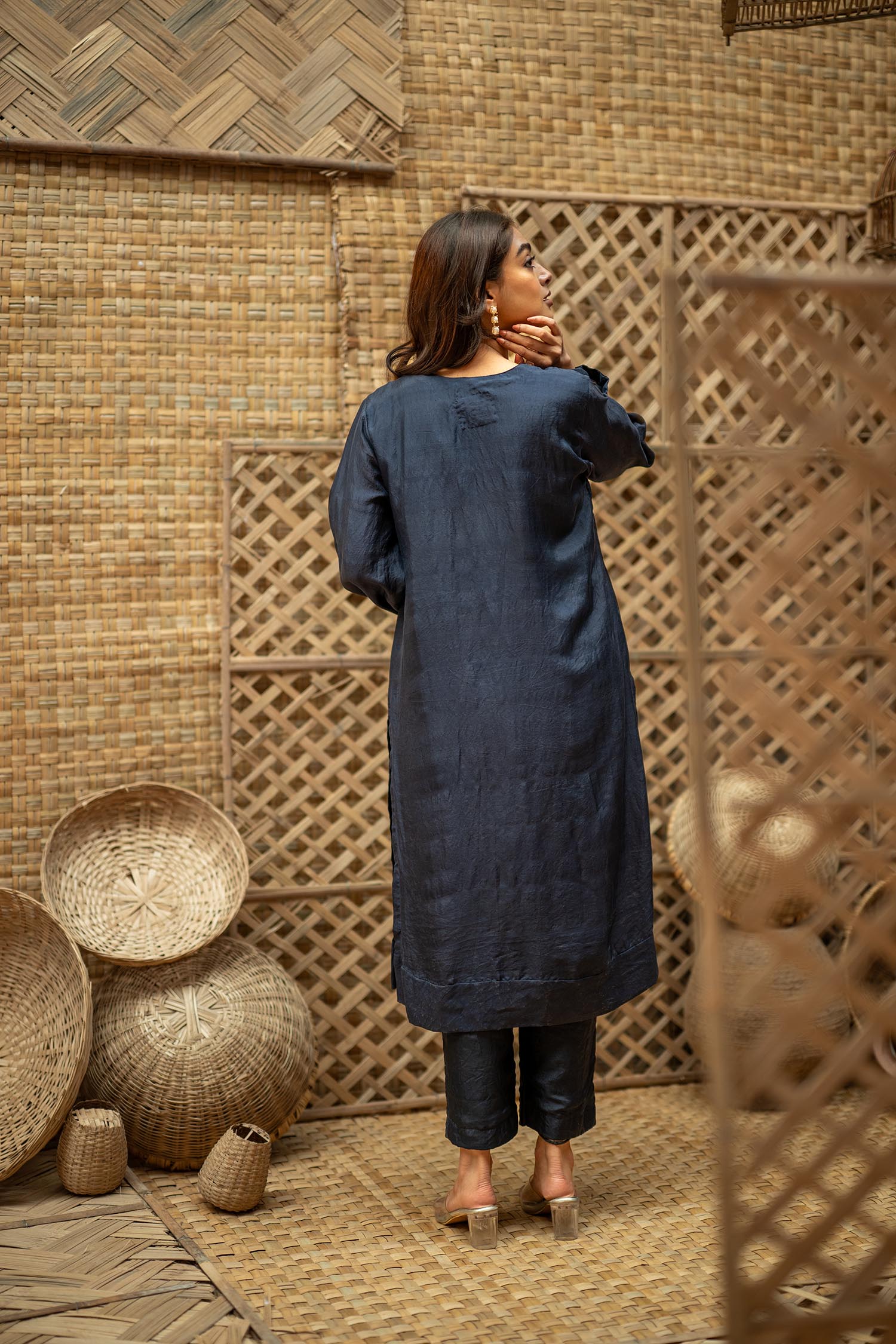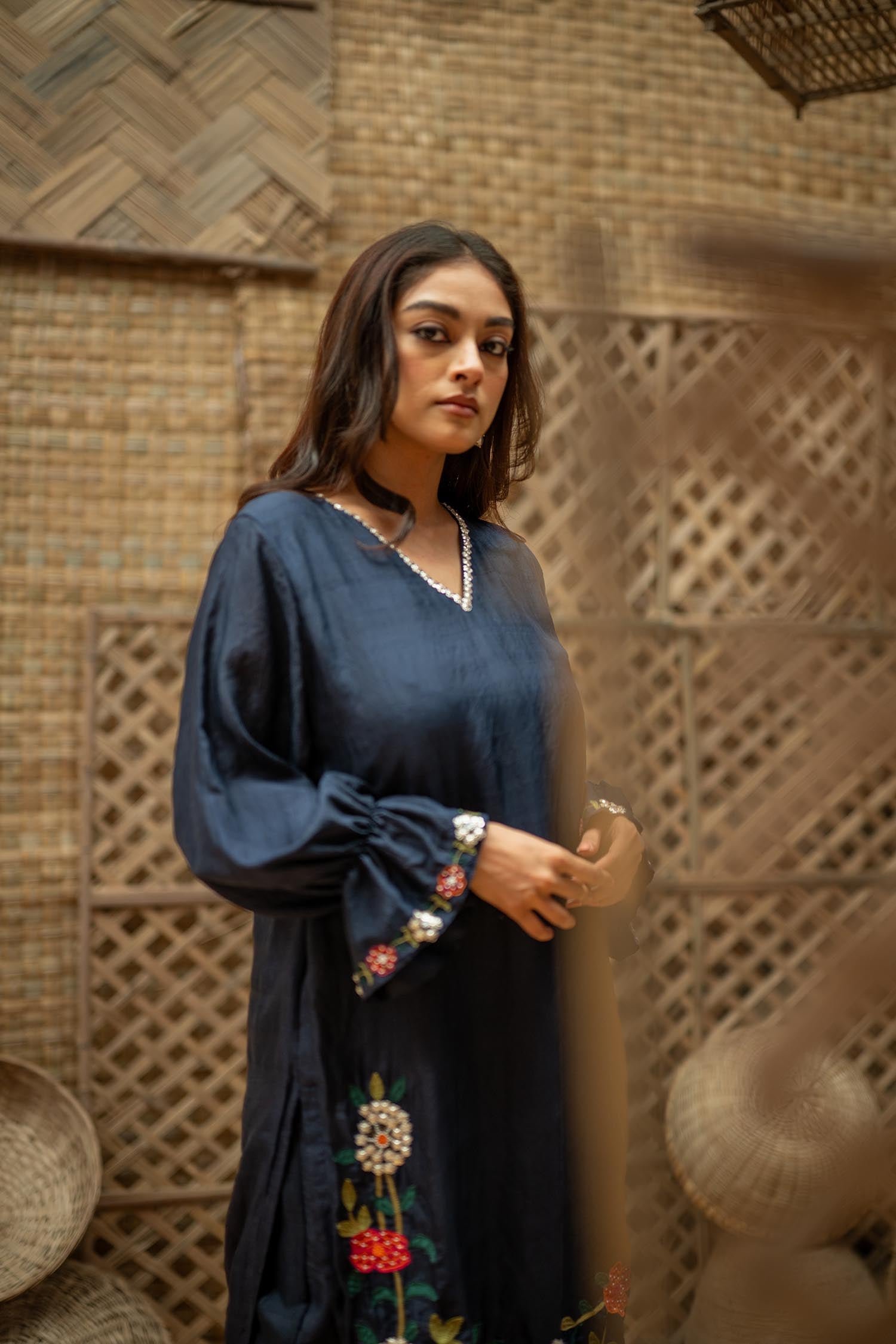 Product Description: Classic straight kurta set crafted in handwoven mulberry silk, hand appliquéd with vibrant flowers. The kurta features gathered sleeves with cutwork embroidery.