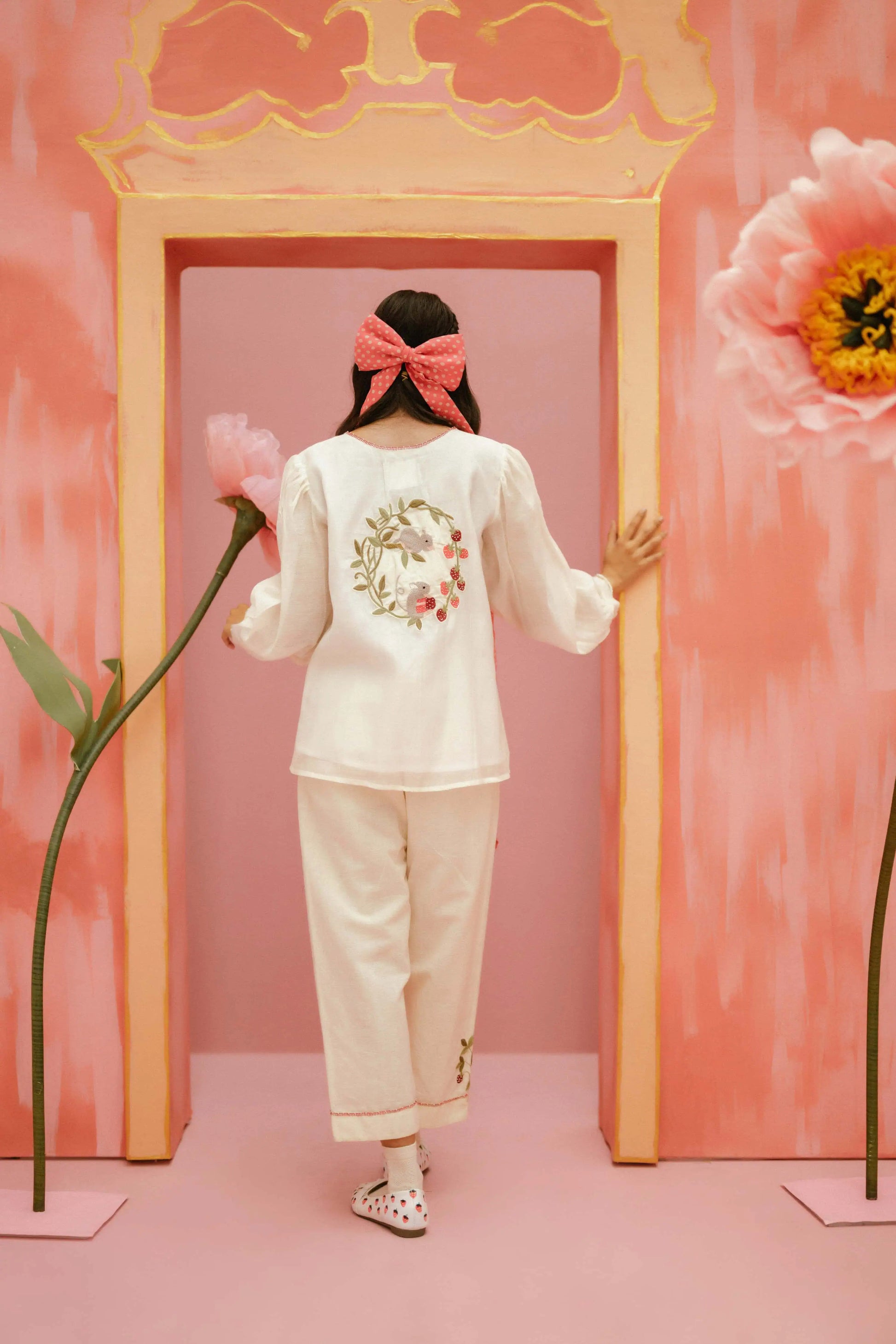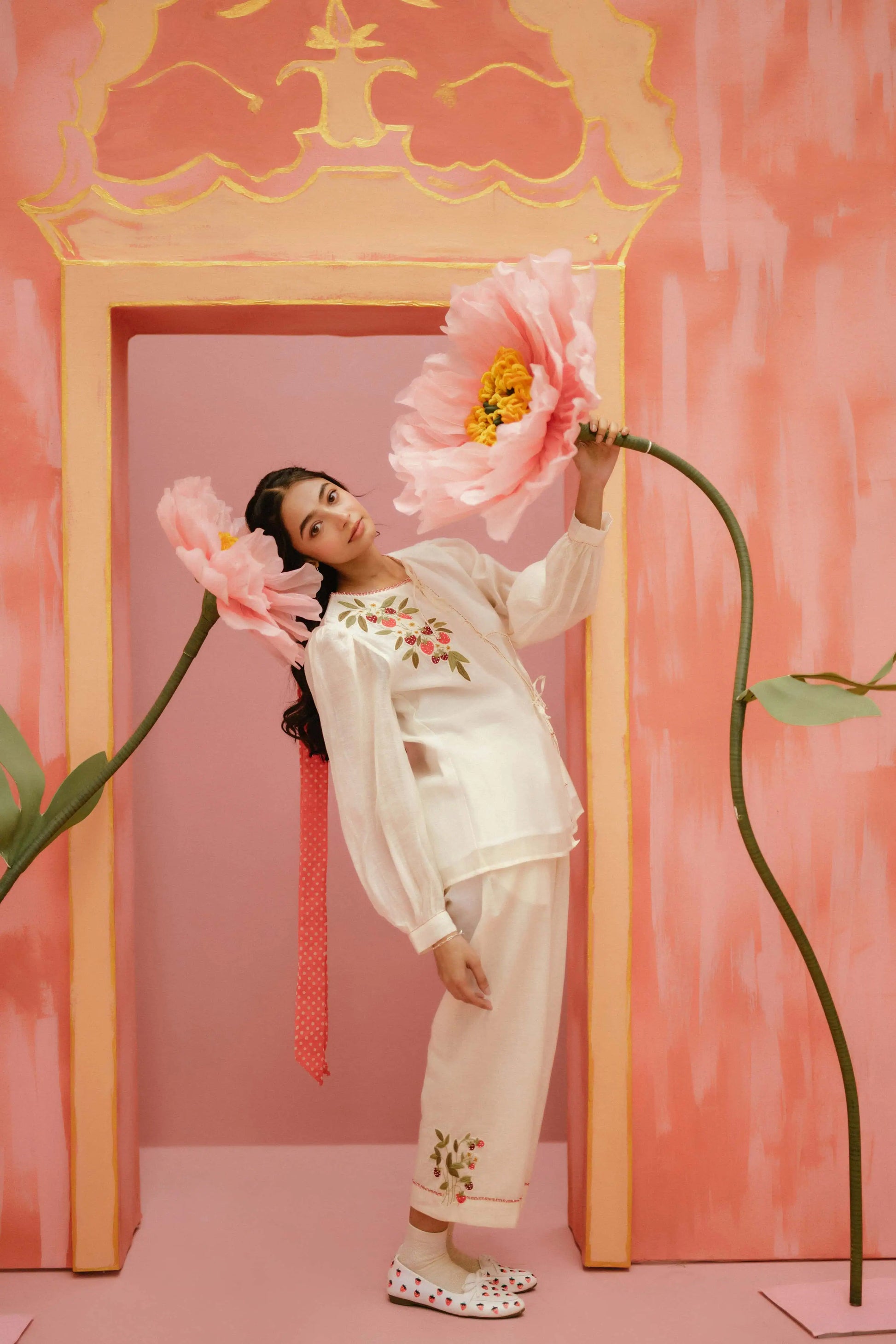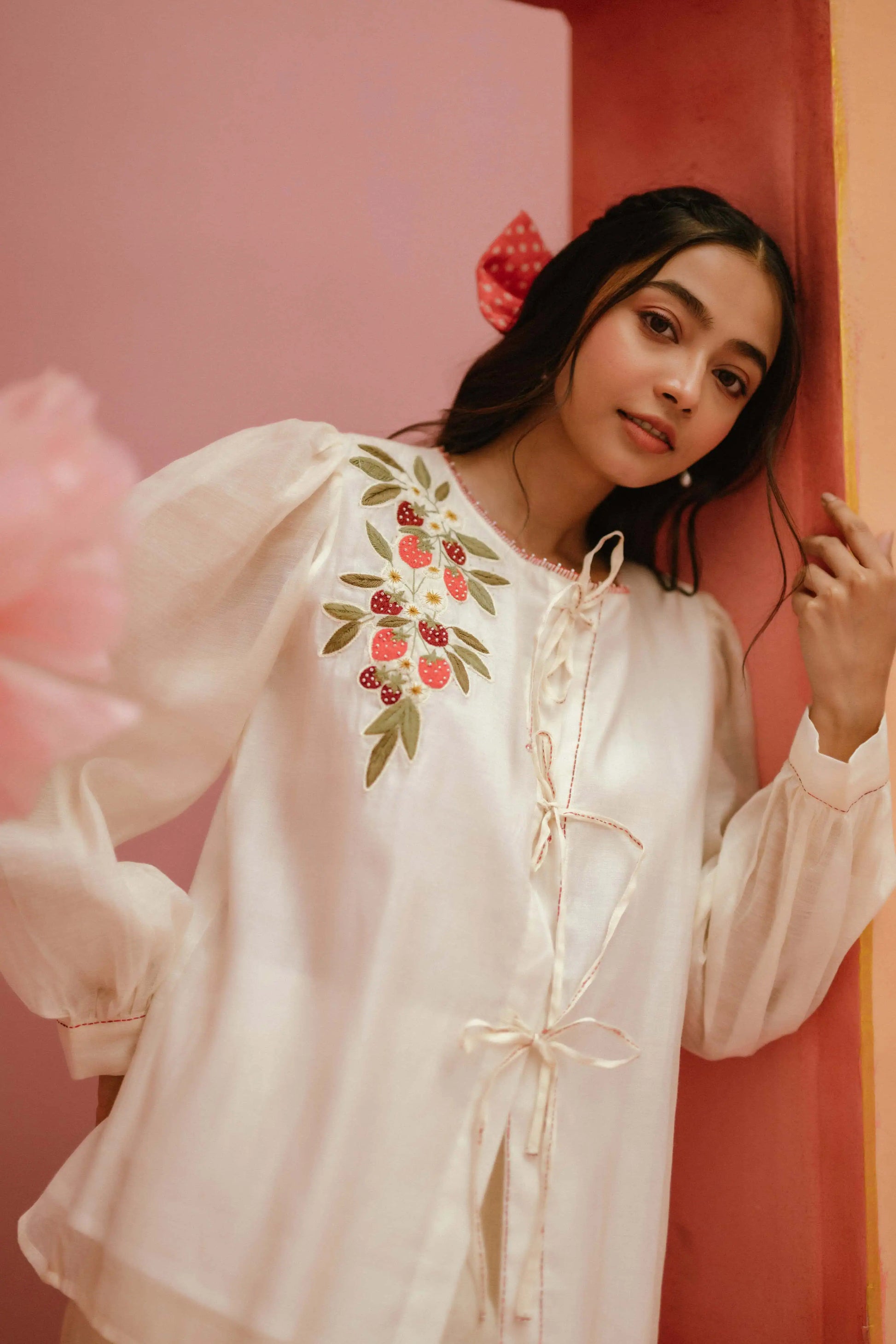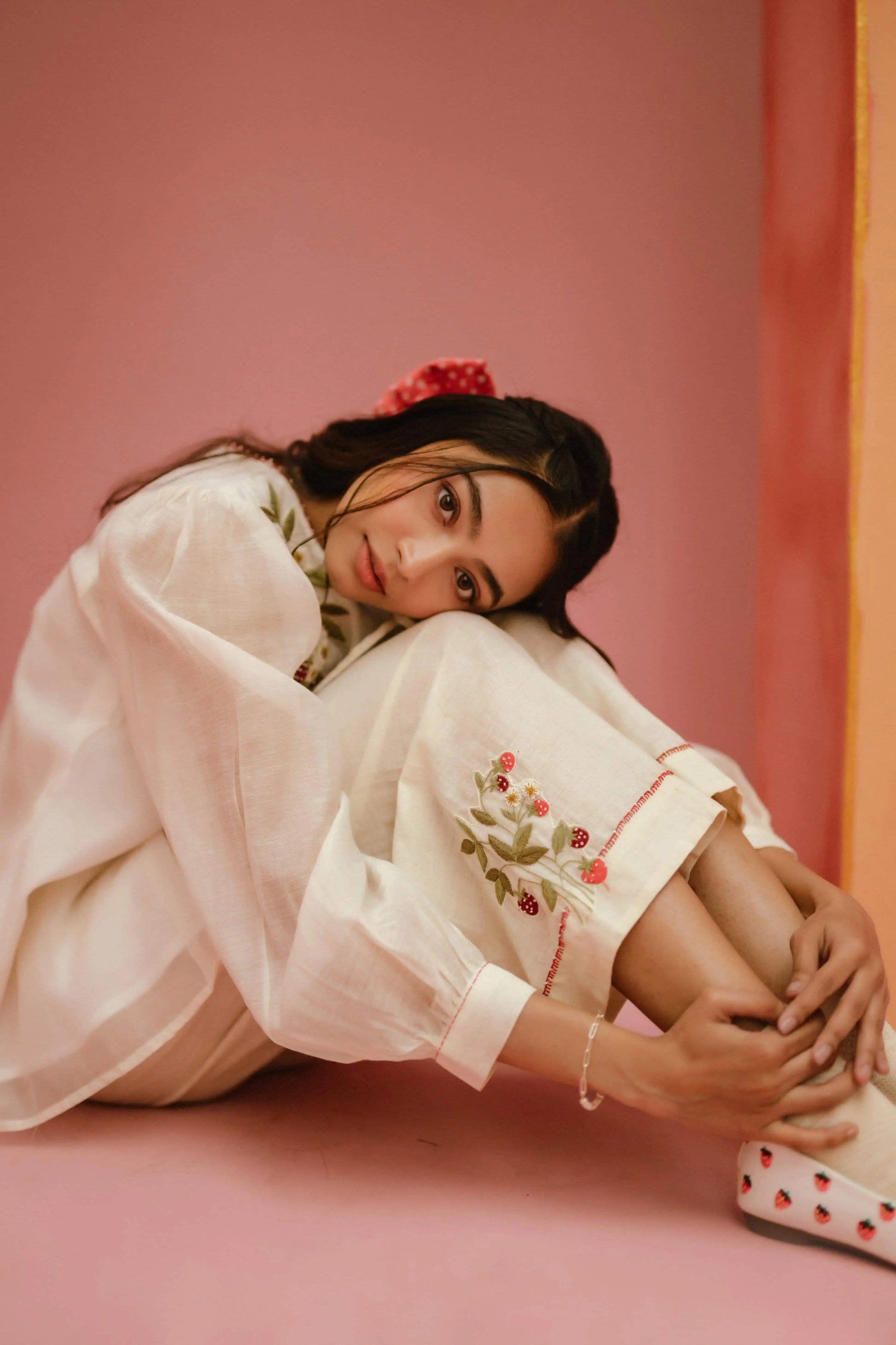 Product Description: The Ellis set comes with a handcrafted oversized, front tie up closure top and wide leg pants. The top and bottom is hand embroidered with etched berry branches.