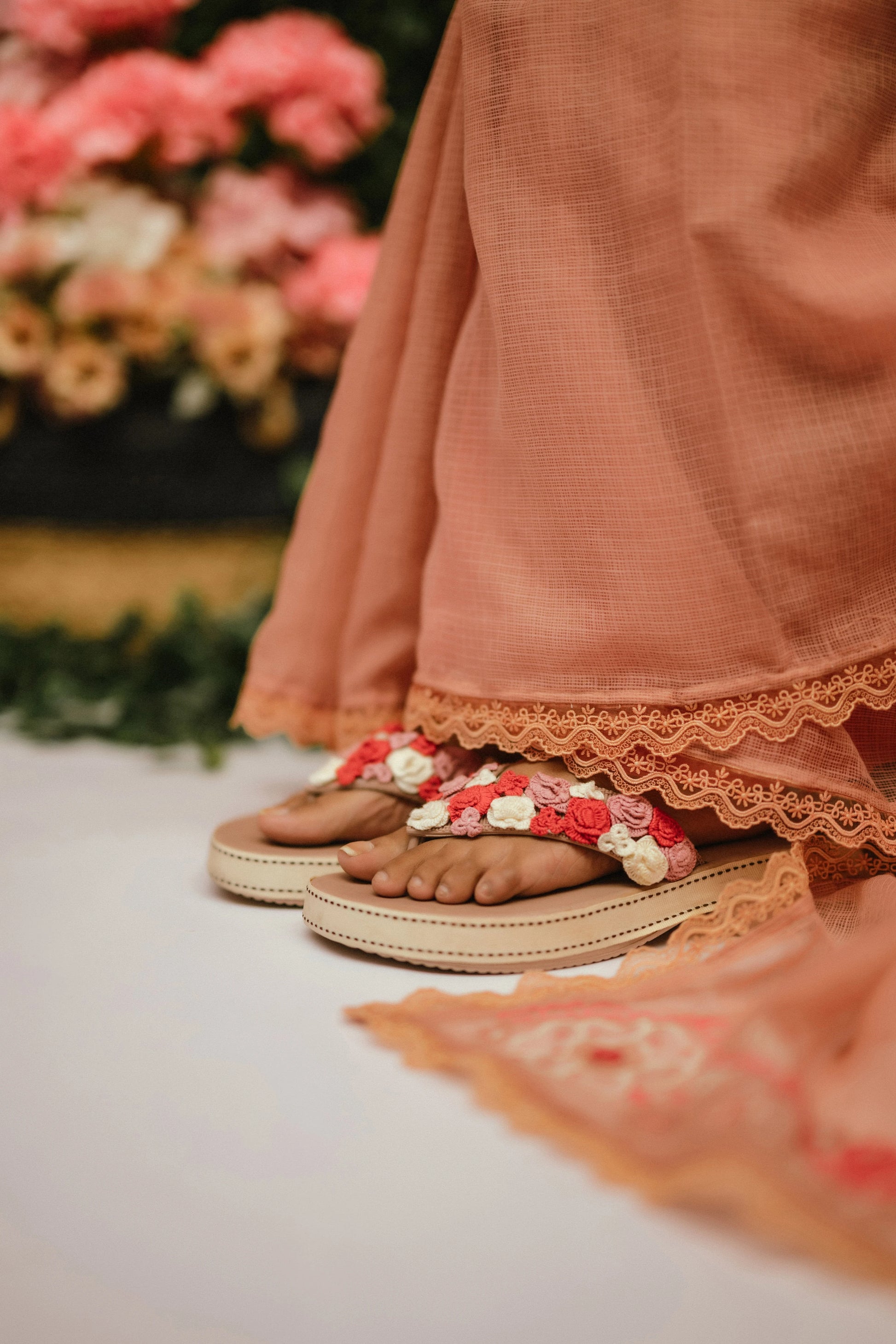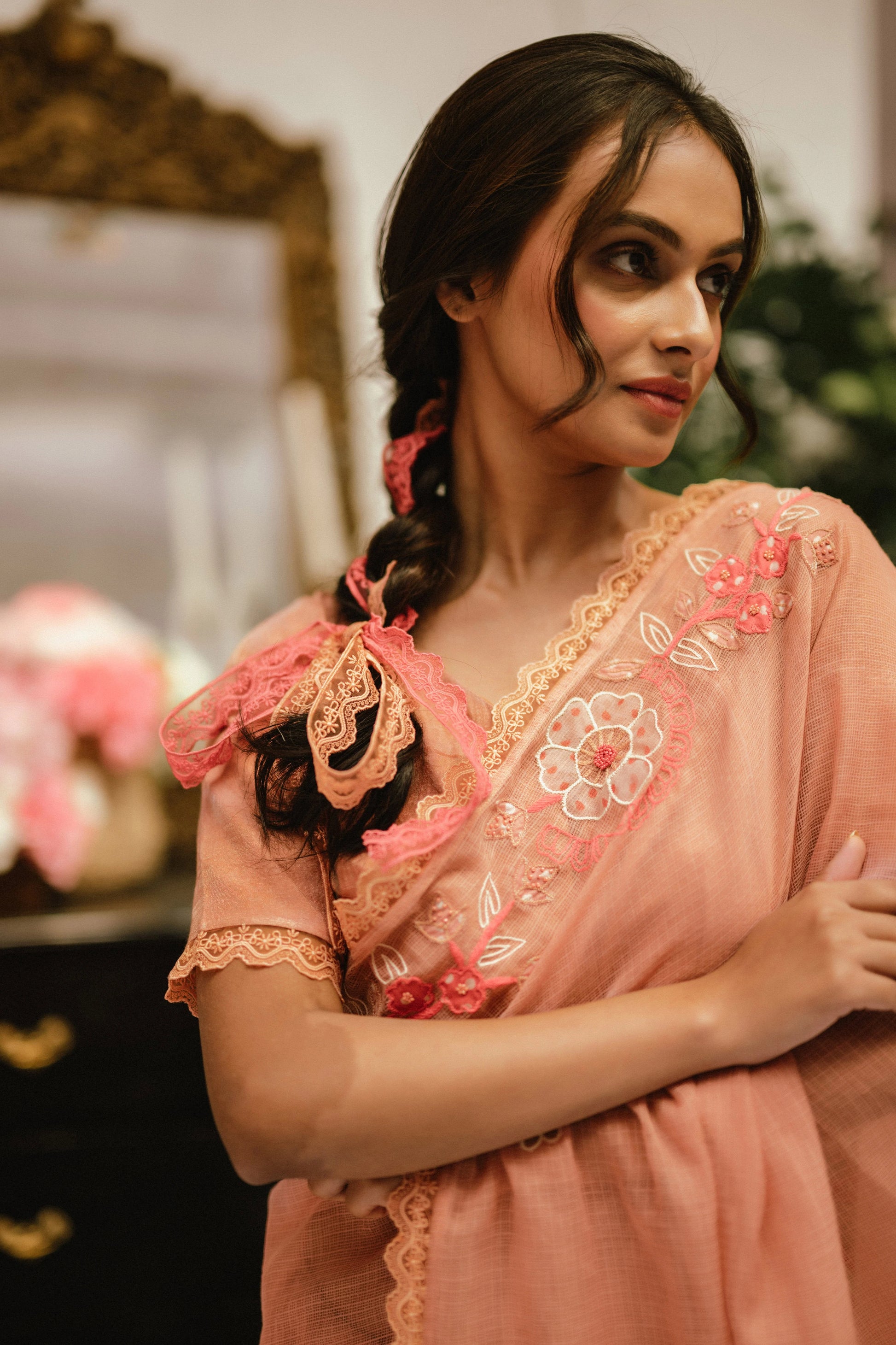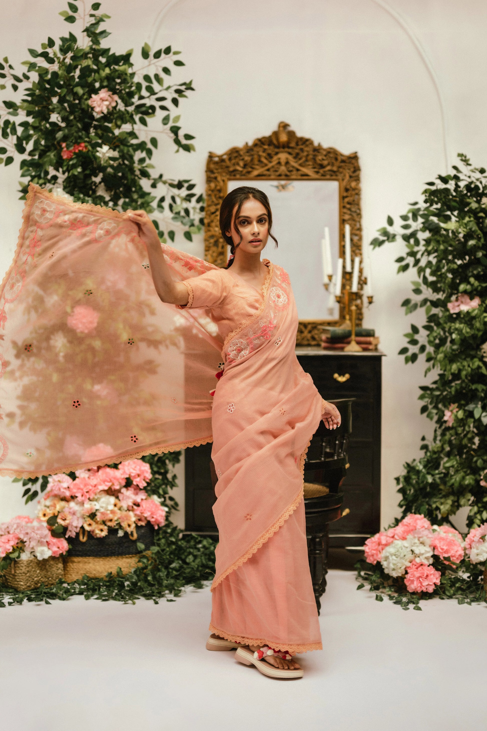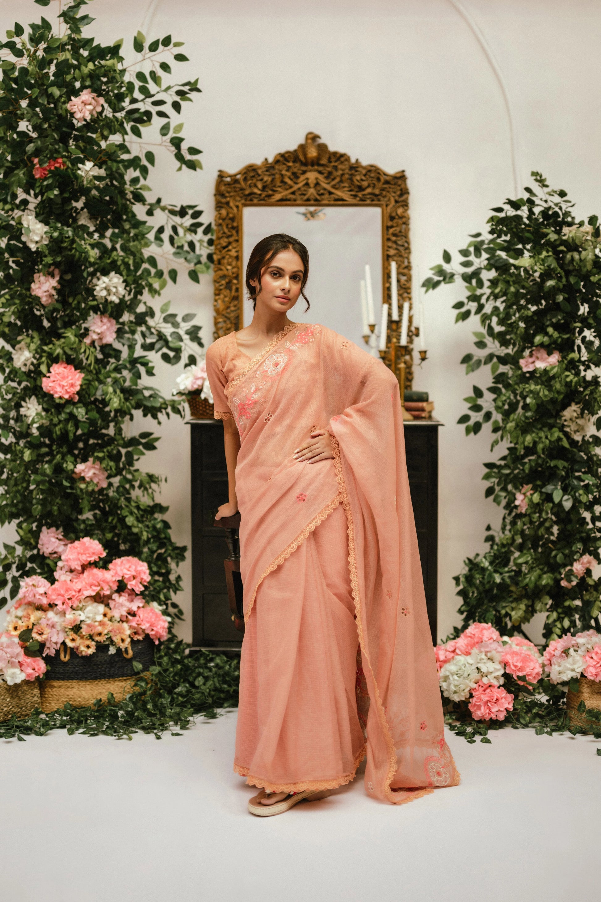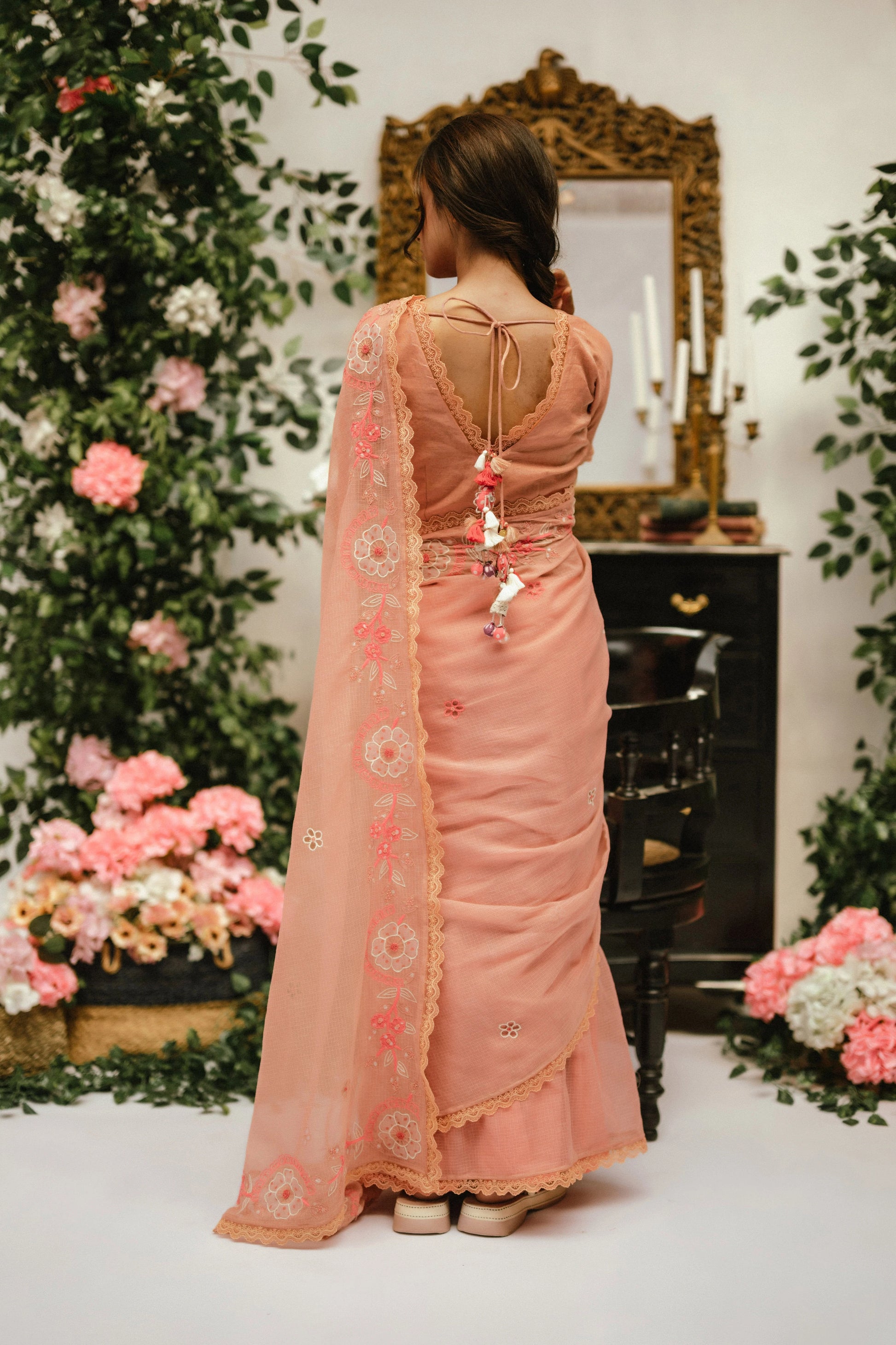 Product Description: Our Esme sari is a statement of romantic and bespoke! Made in the finest variety of kota doria with beautiful hand appliqued flowers, it comes with lace detailing throughout the hemline. Paired with a dreamy, stitched tissue blouse adorned with elaborated tassels at the back.