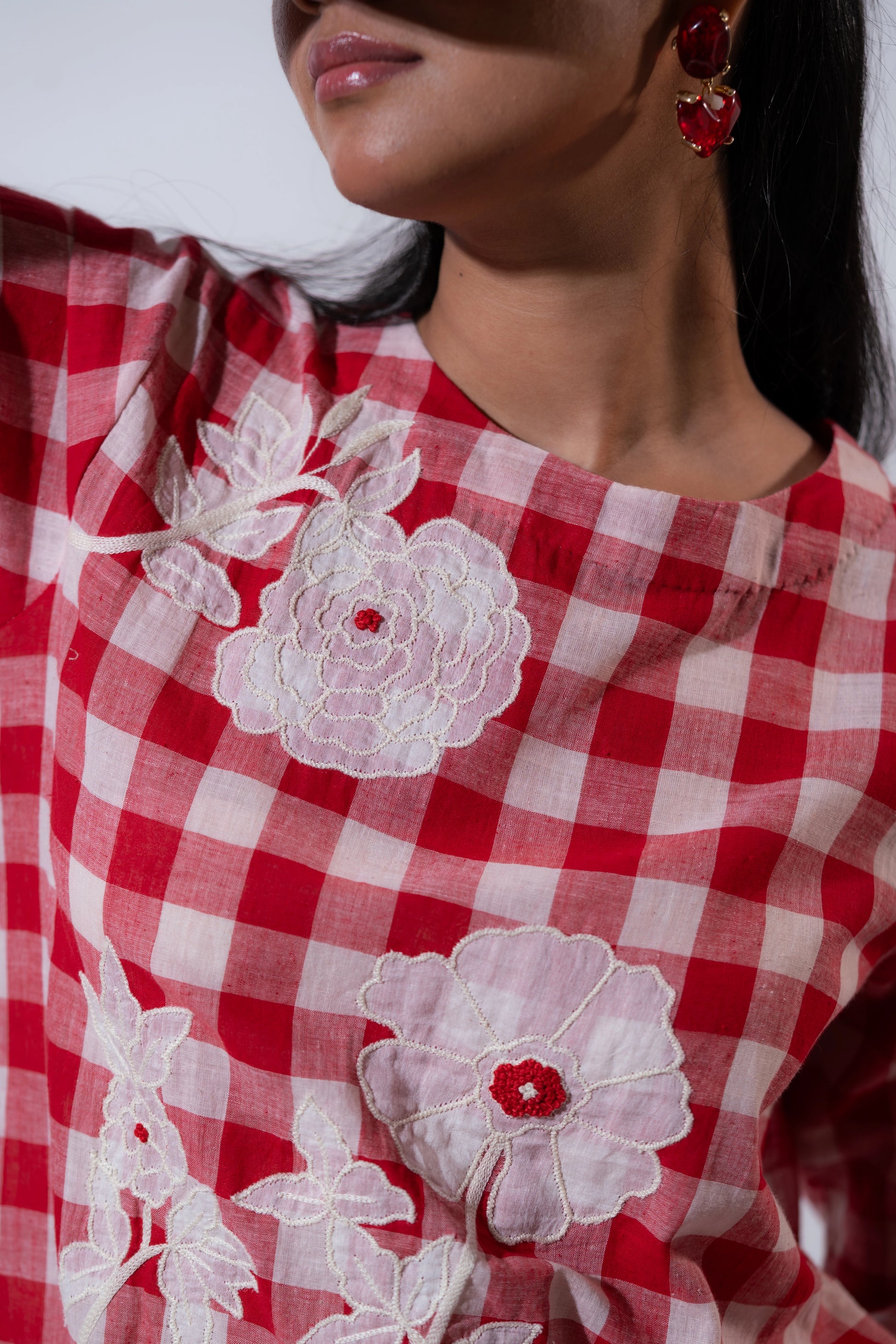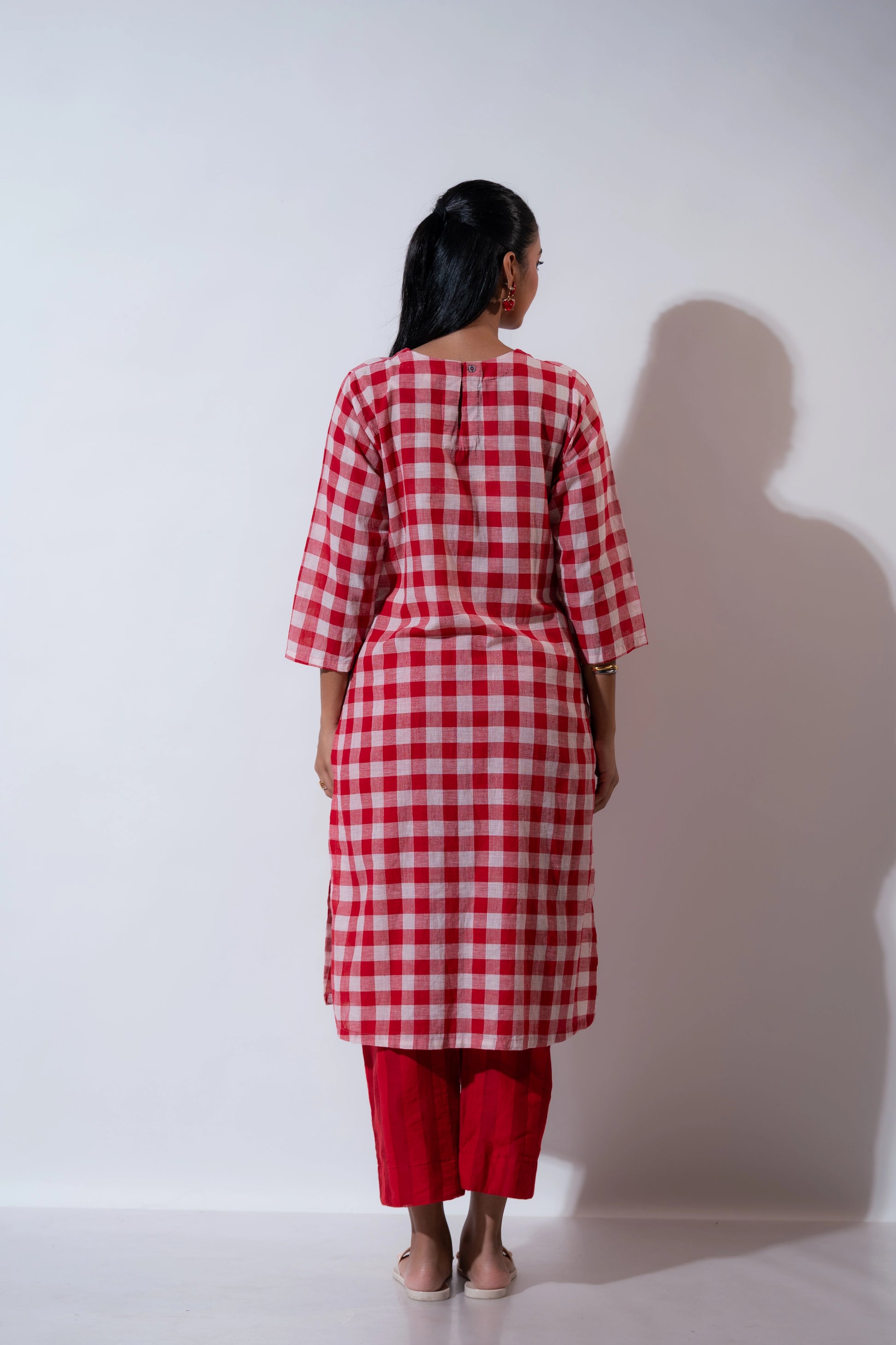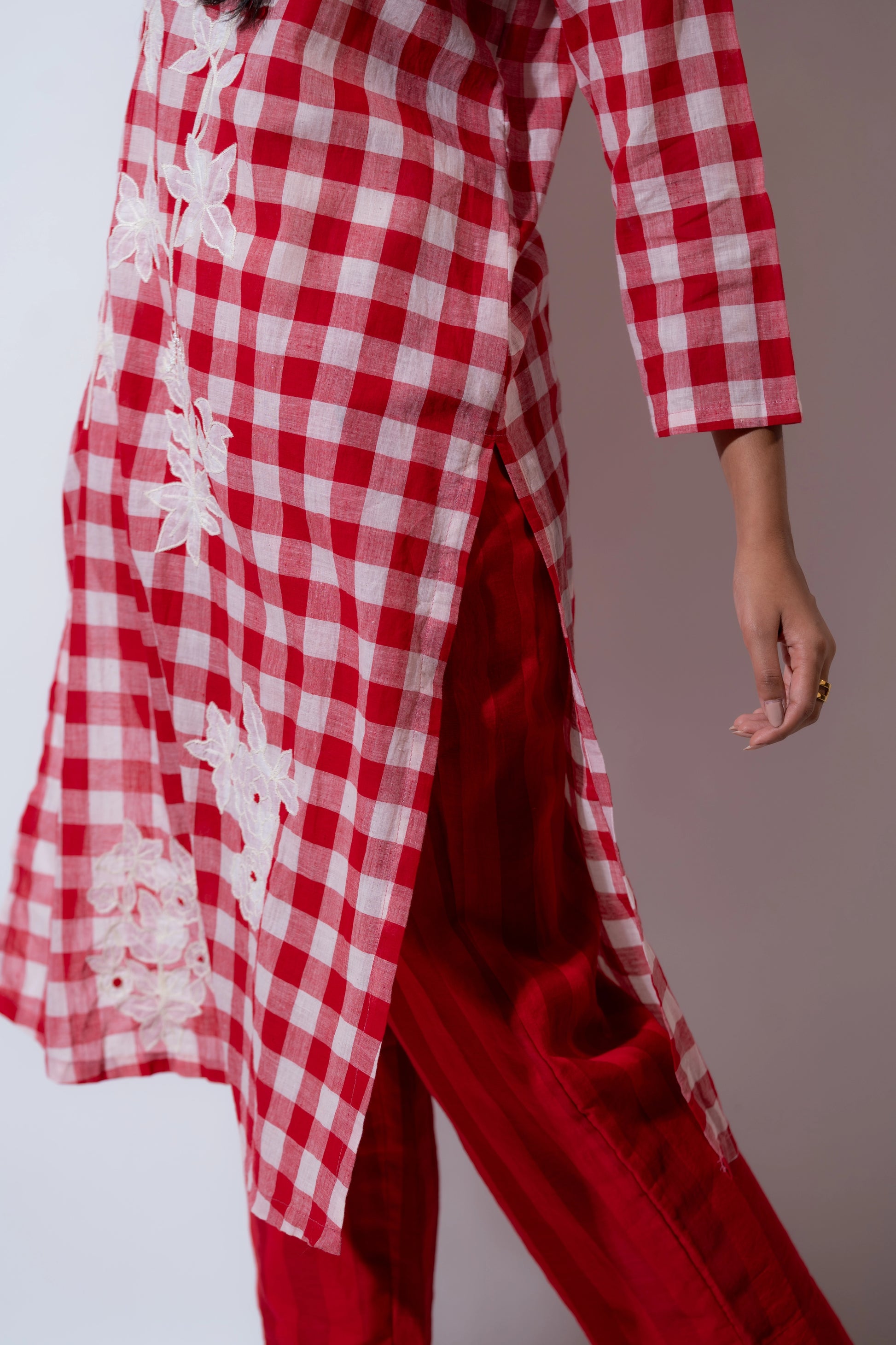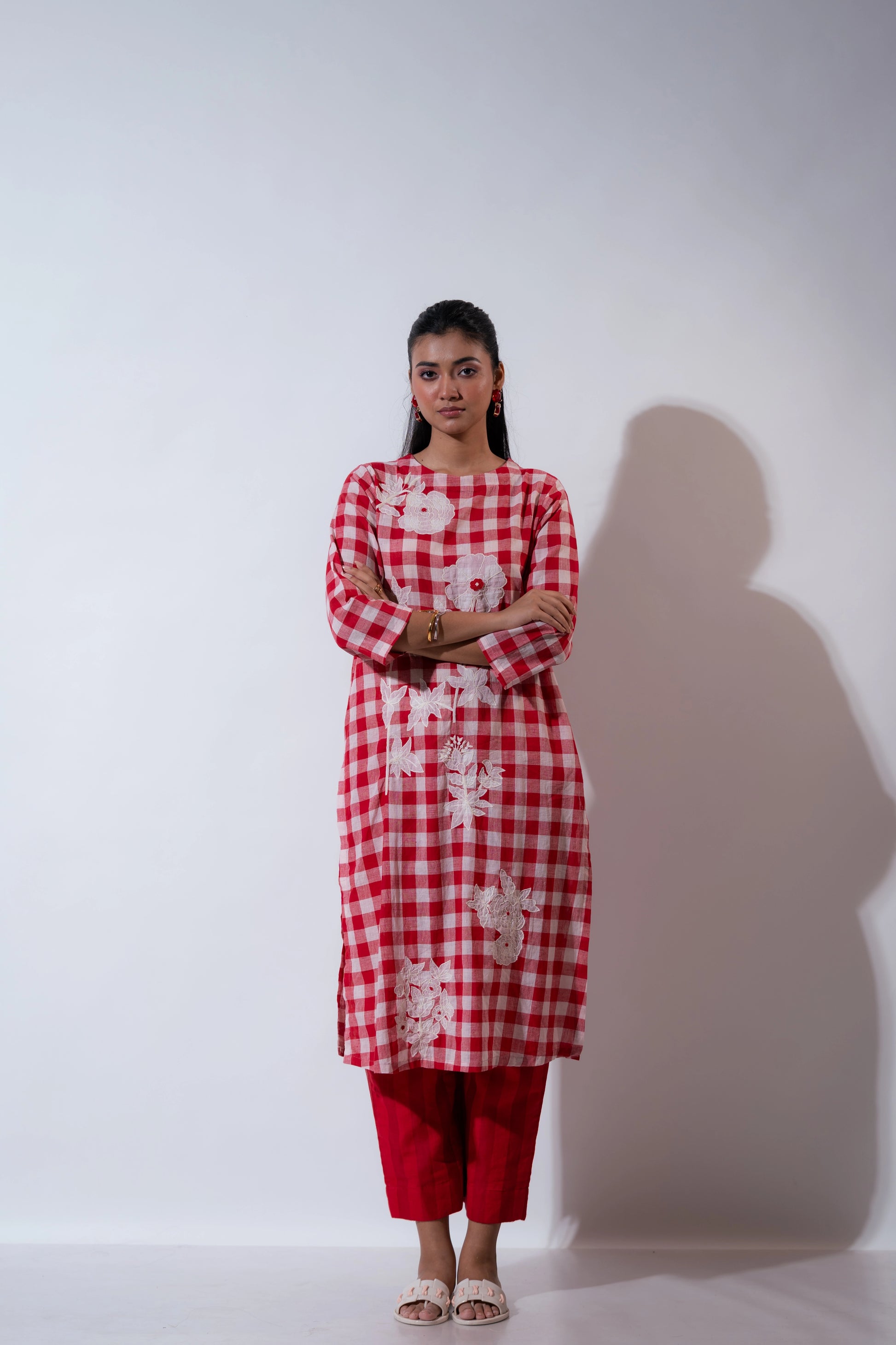 Product Description: This red and white checkered kurta features intricate white floral applique embroidery, a round neckline, and three quarter sleeves, paired with solid red stripe straight pants for a bold yet graceful ensemble.