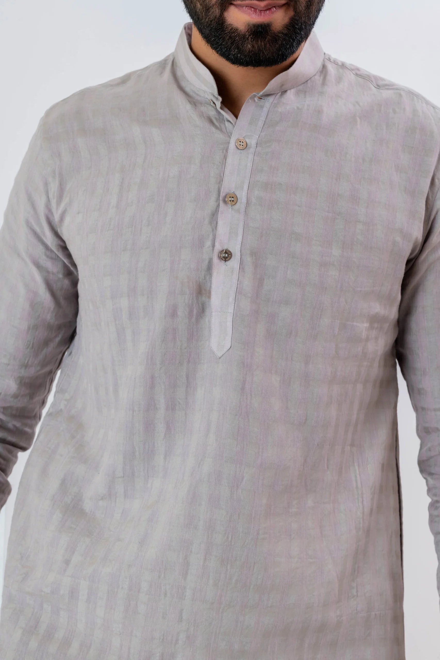 Product Description: Featuring a grey asymmetric kurta in mulberry silk base with self-checks weave. Perfect wear a festive occasion.