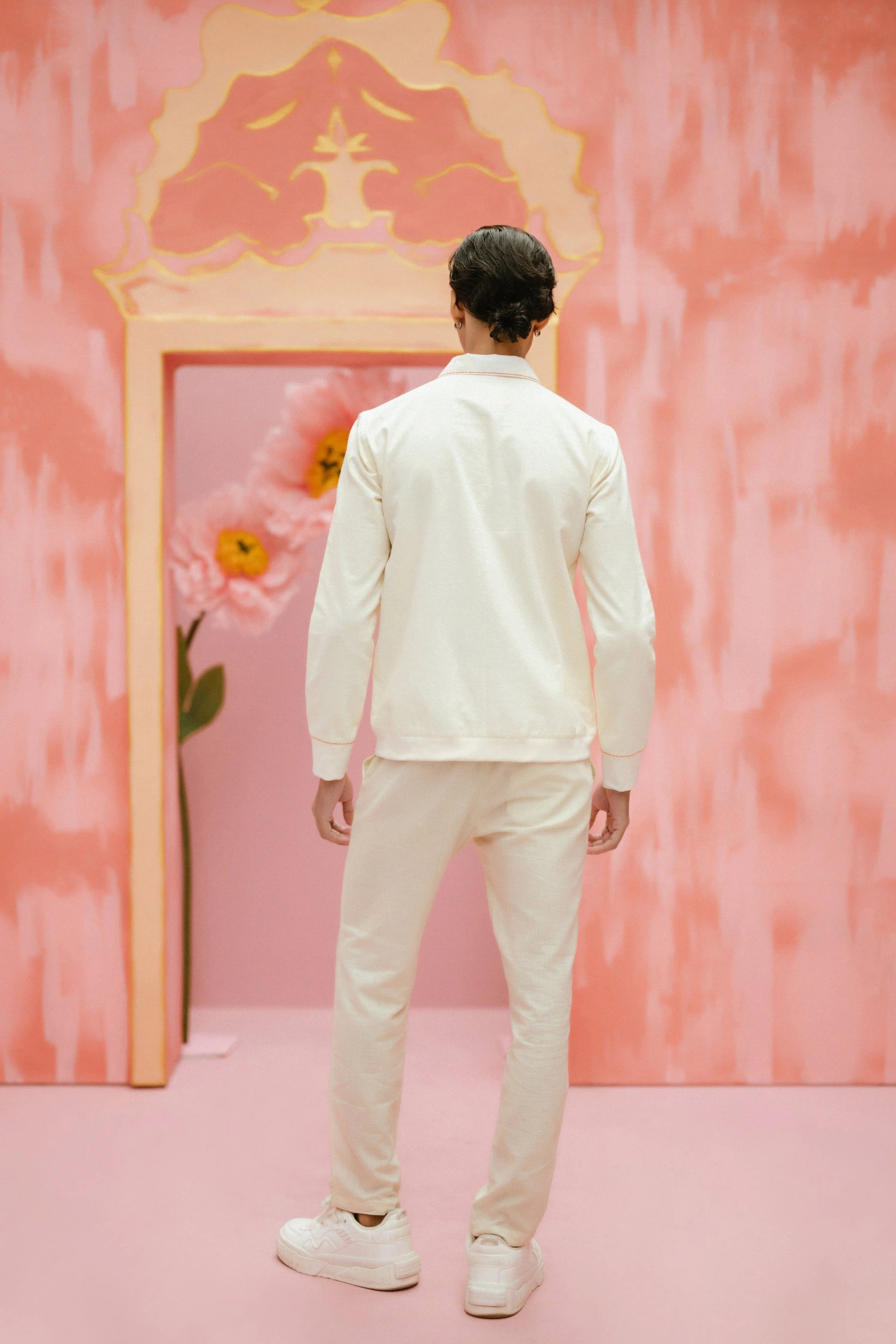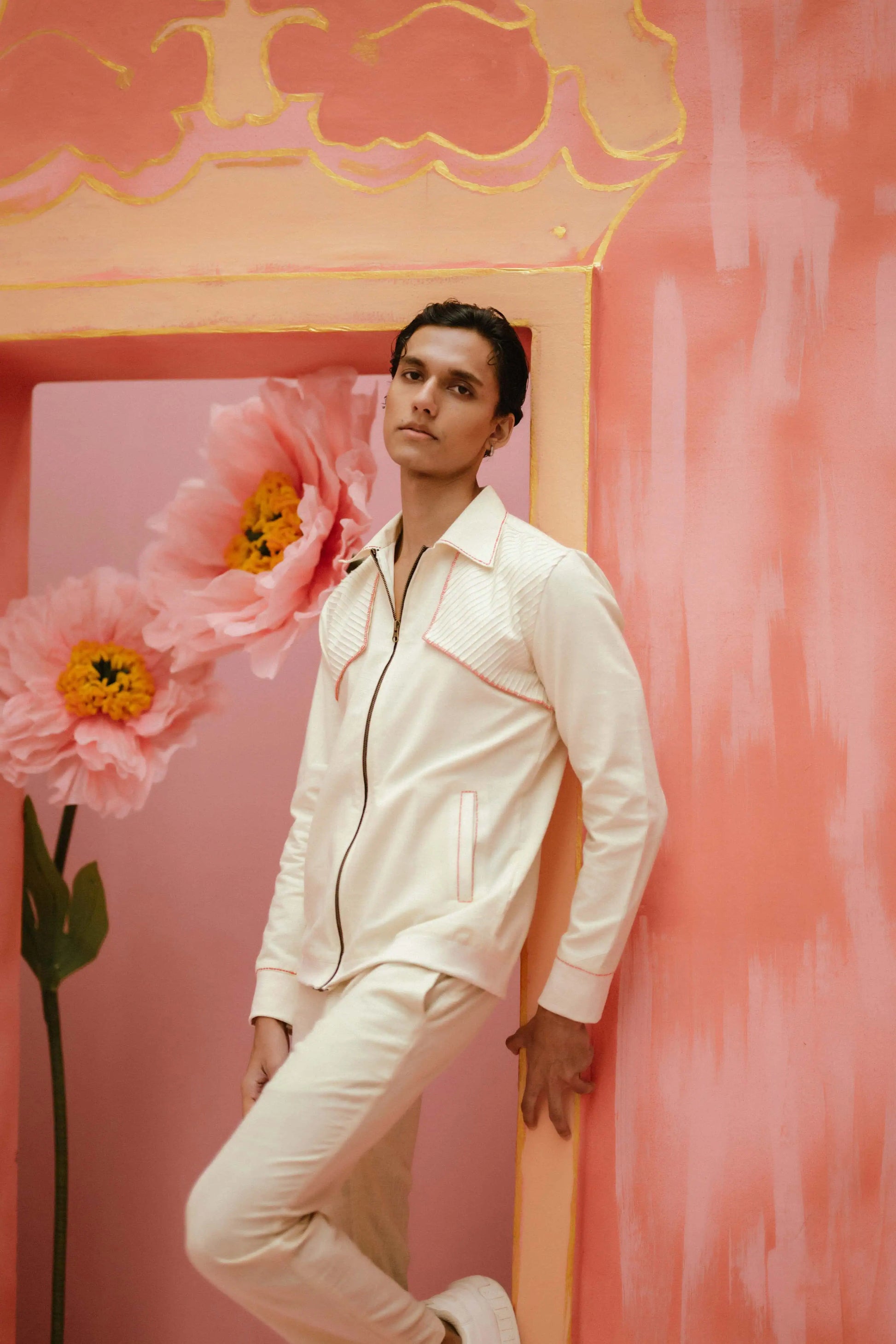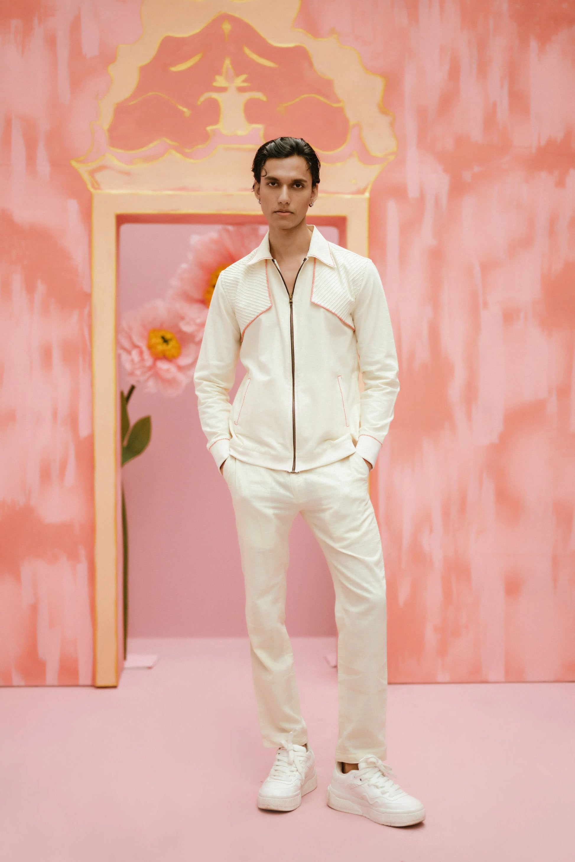 Product Description: Fraze A hand crafted with attention bomber jacket. Tailored with attention, features pink tuck details.