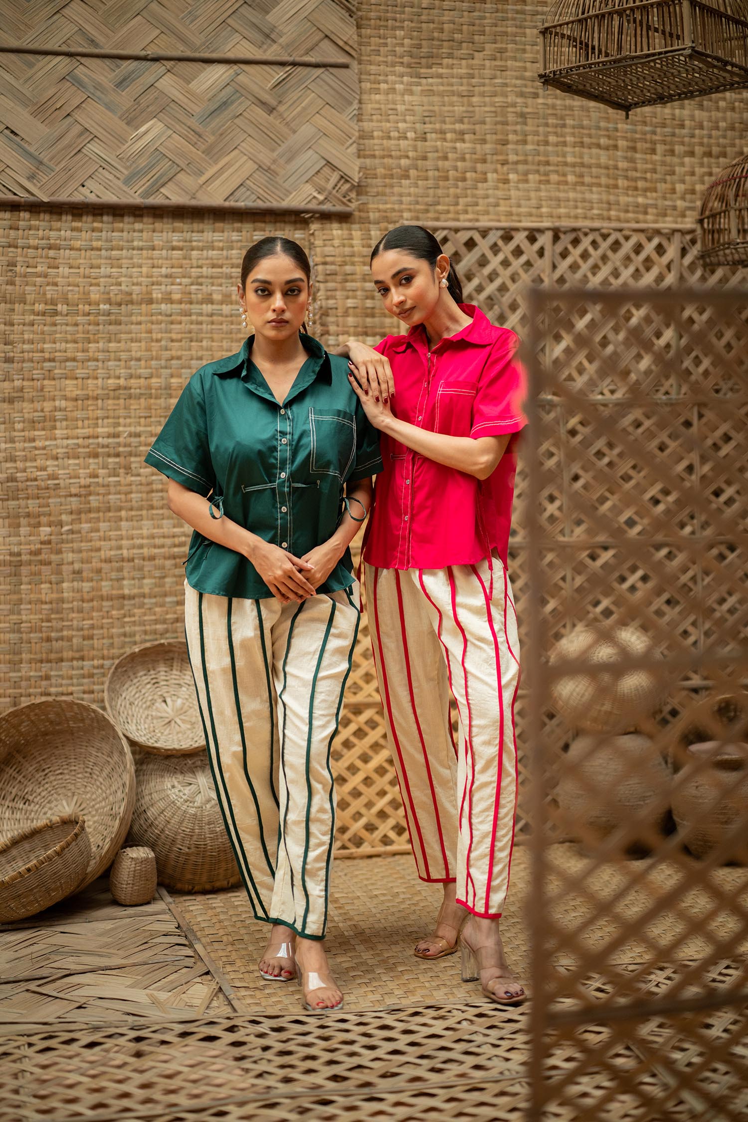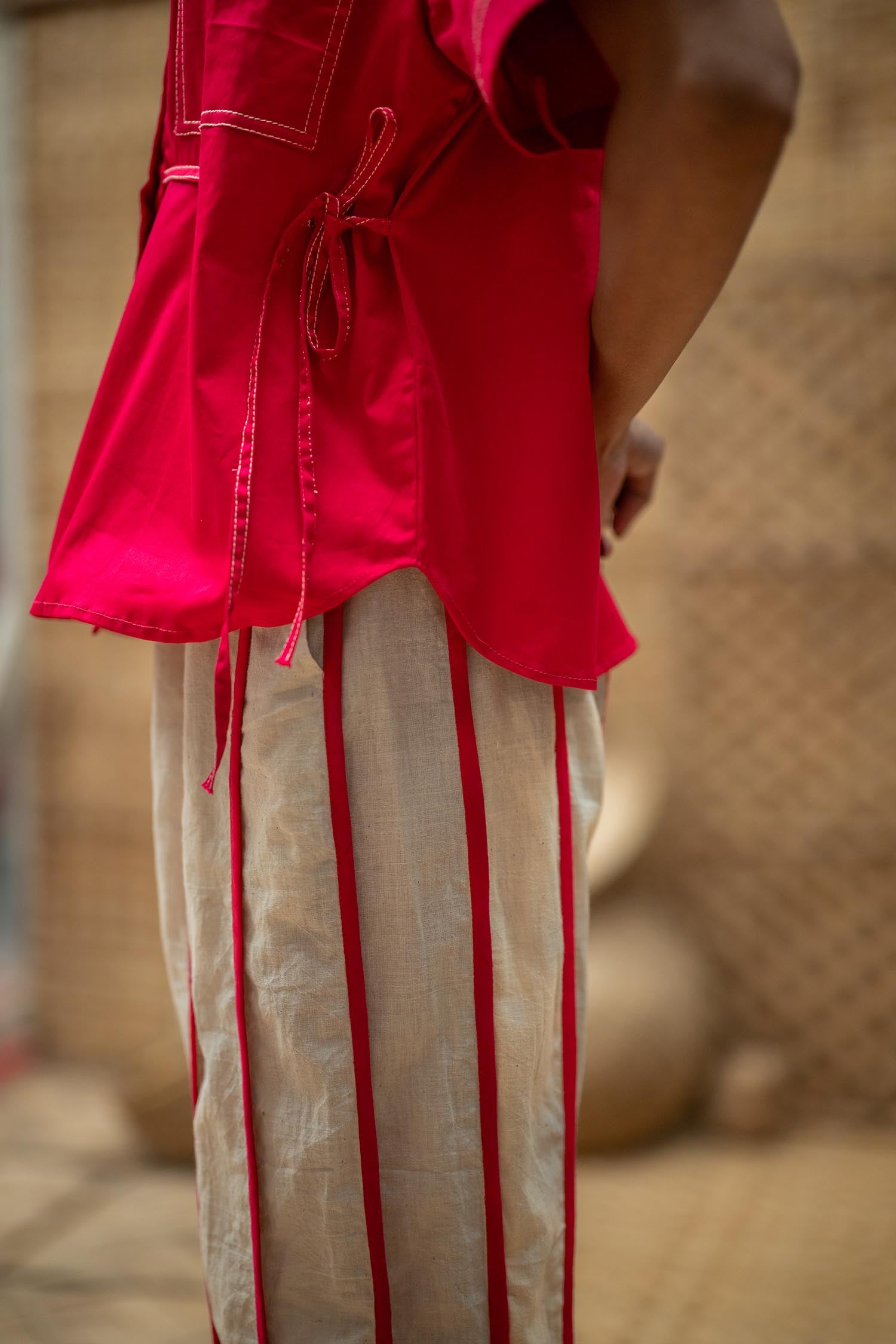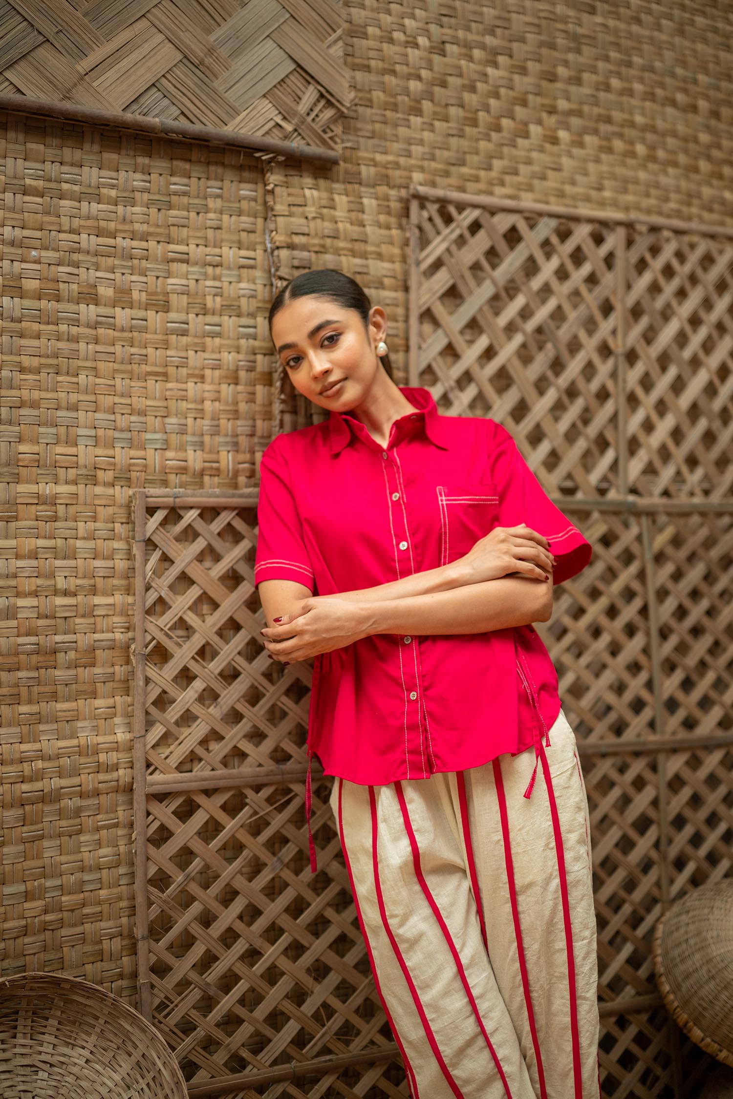 Product Description: Relaxed fit coord set with side tie up on the shirt. The barrel shaped trouser is tailored with contrast cord piping details to reflect a vibrant look.
