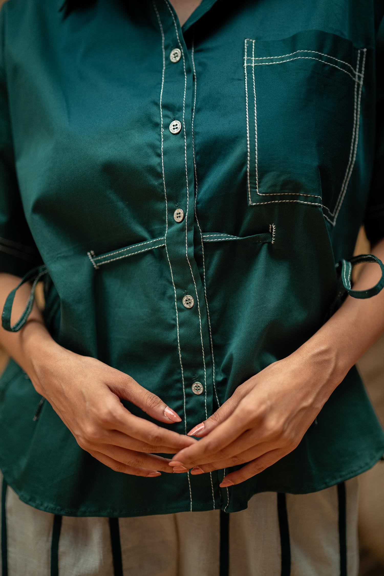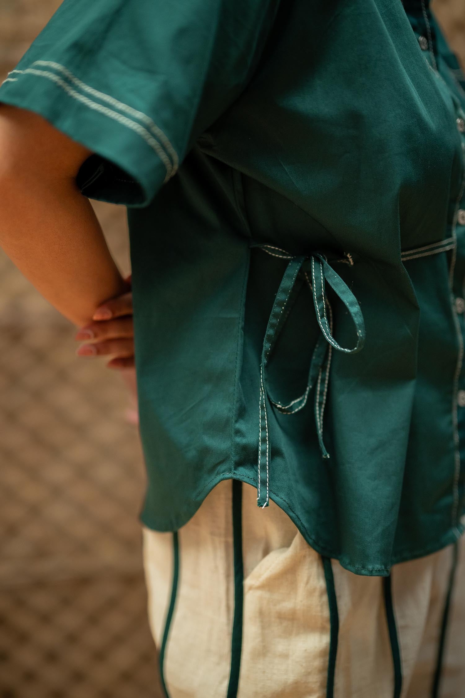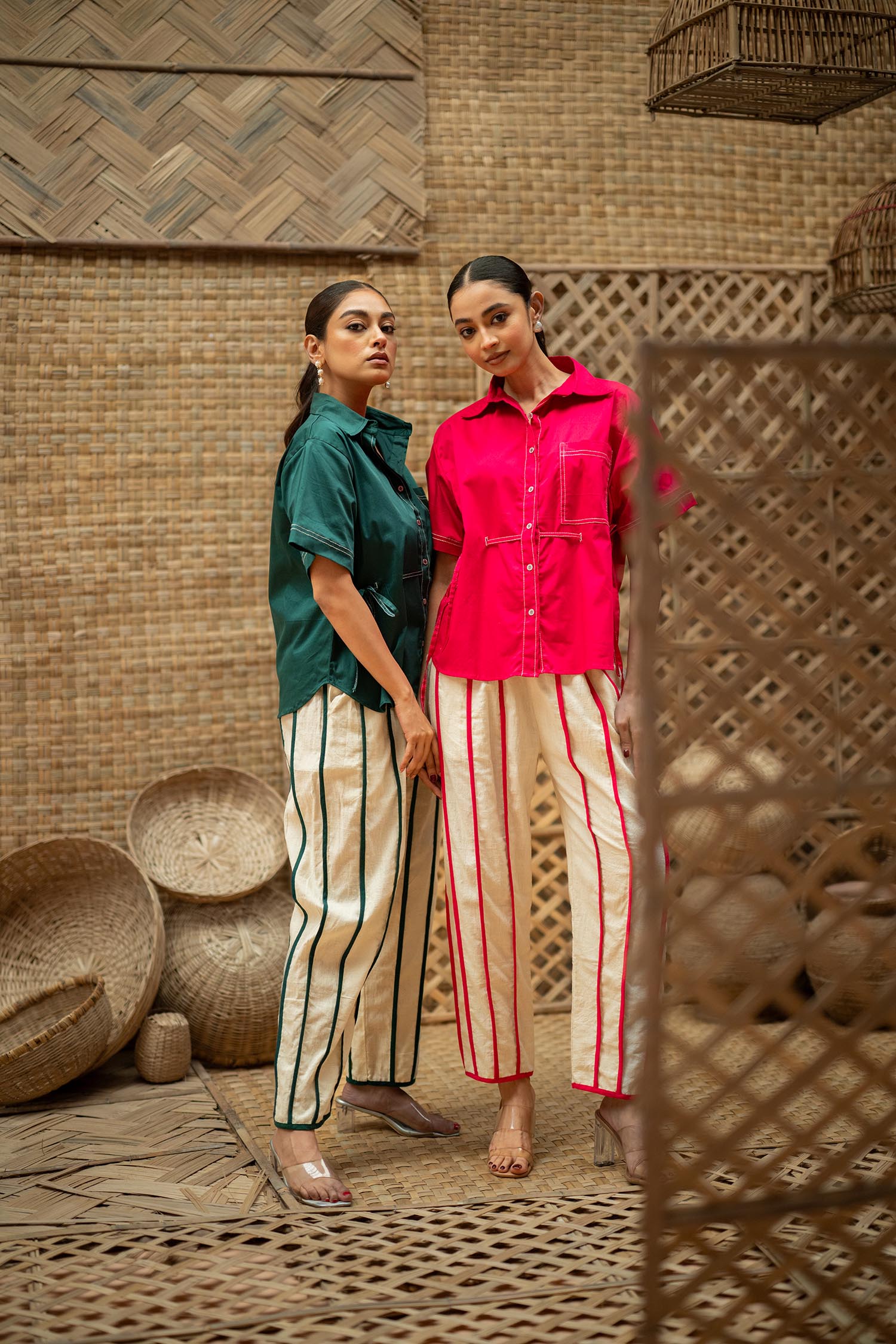 Product Description: Relaxed fit coord set with side tie up on the shirt. The barrel shaped trouser is tailored with contrast cord piping details to reflect a vibrant look.