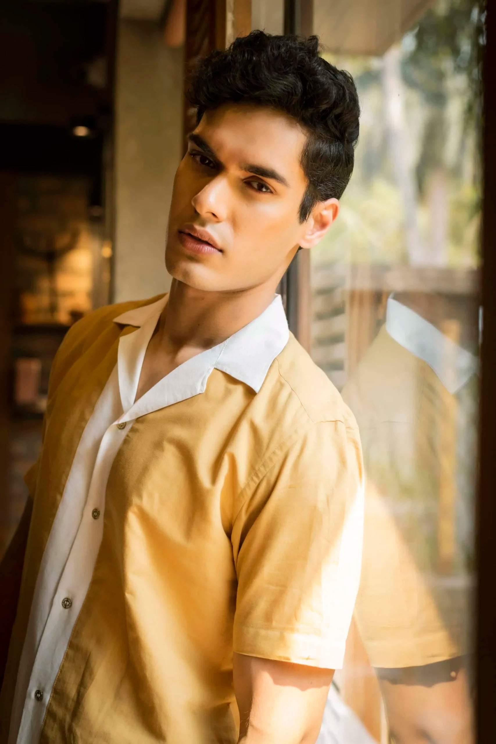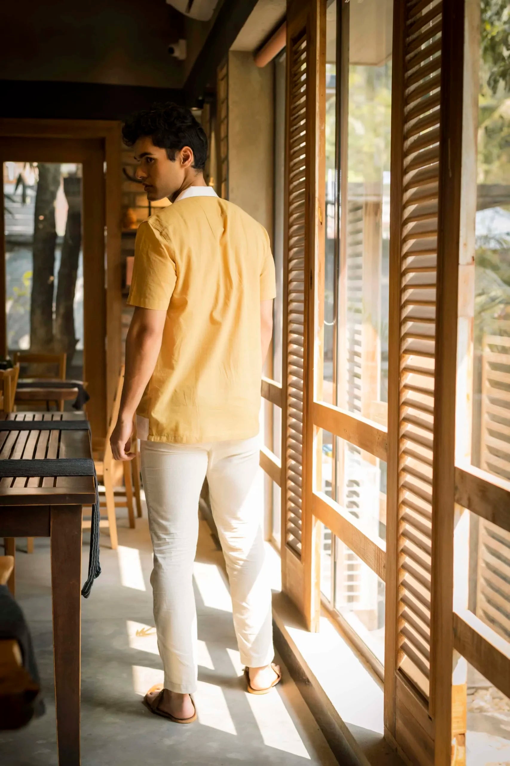 Product Description: Off-white & honey handwoven cotton & cotton silk shirt with color blocking.