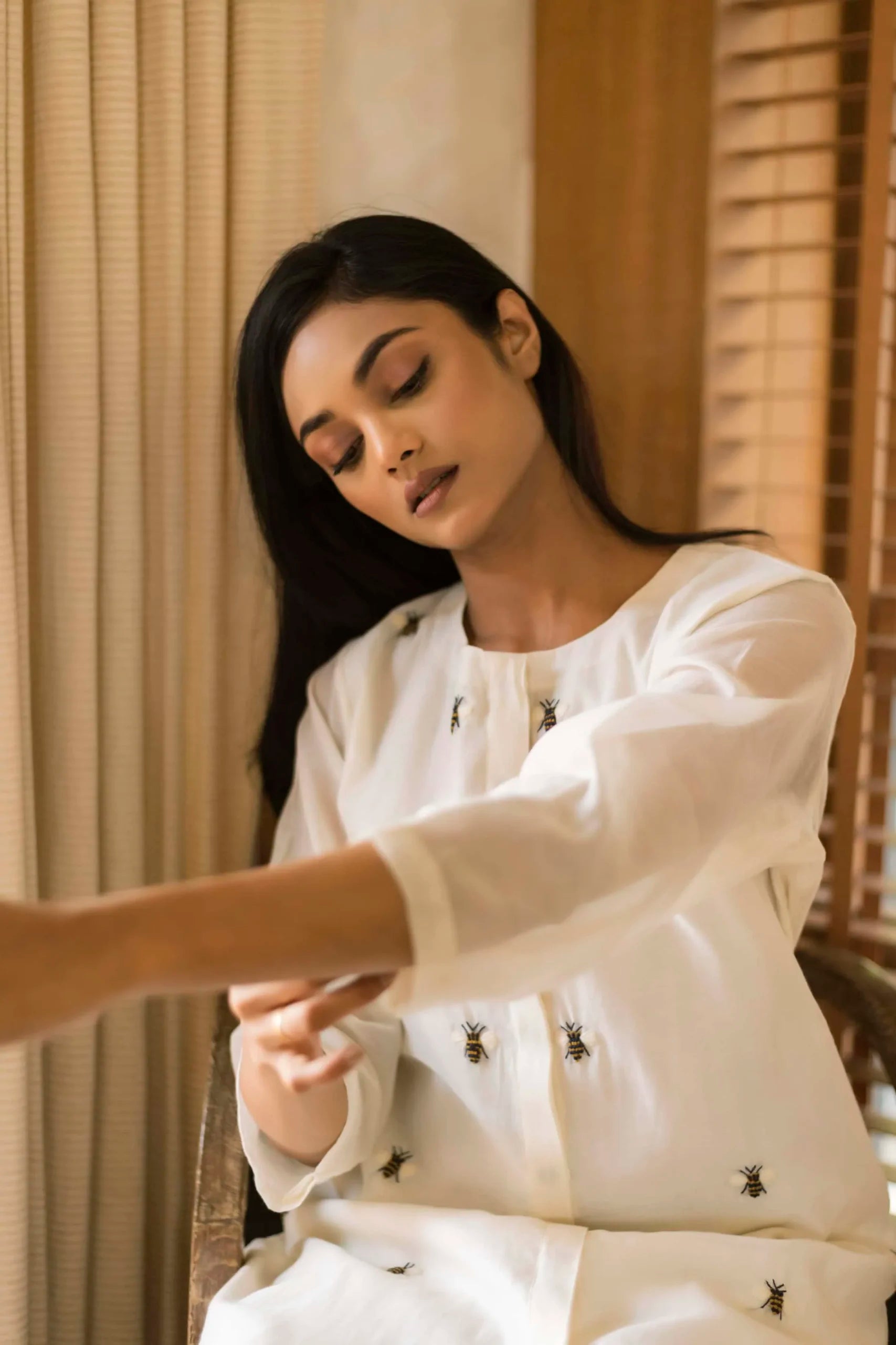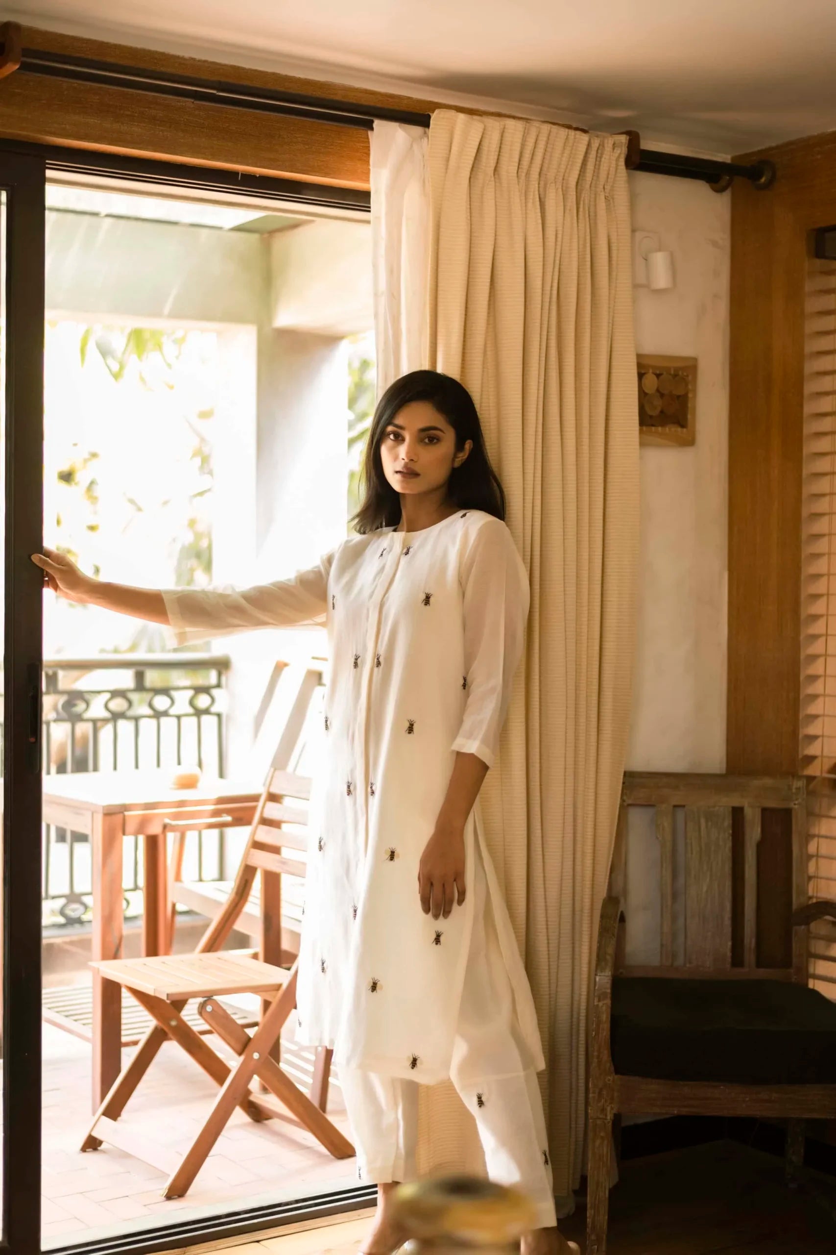 Product Description: Ivory handwoven malai chanderi straight kurta with thread embroidered bees. Comes with pant.
