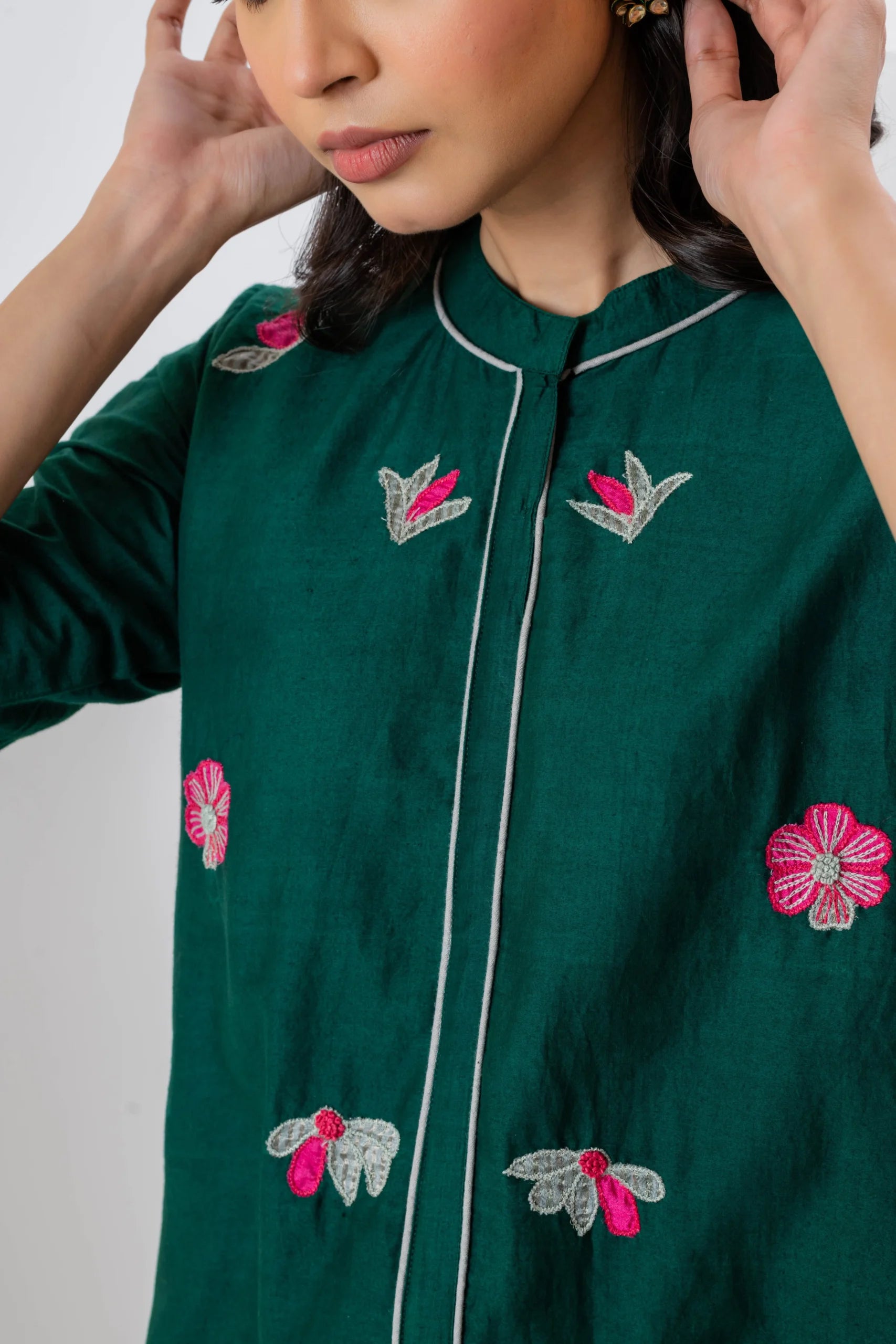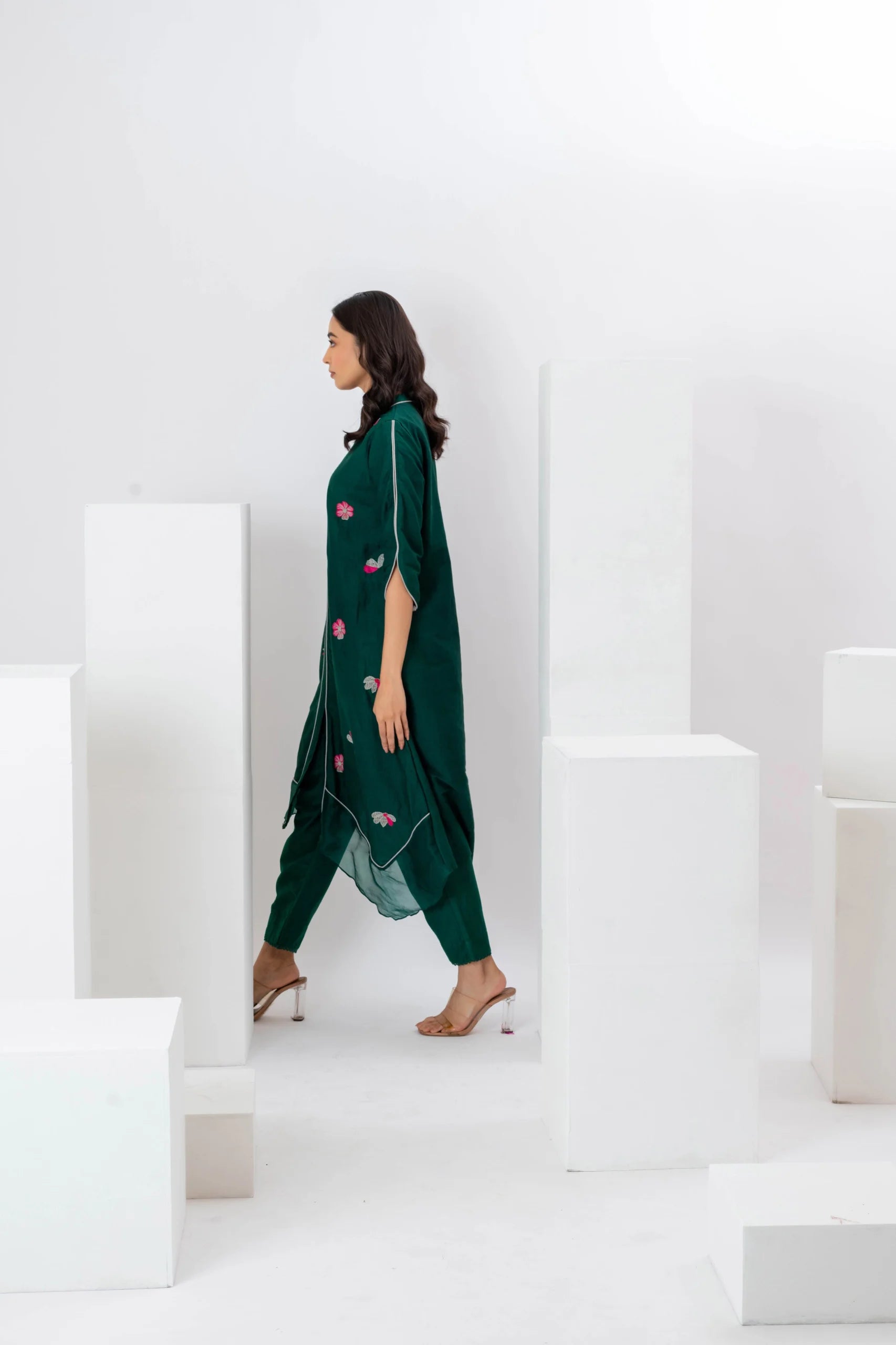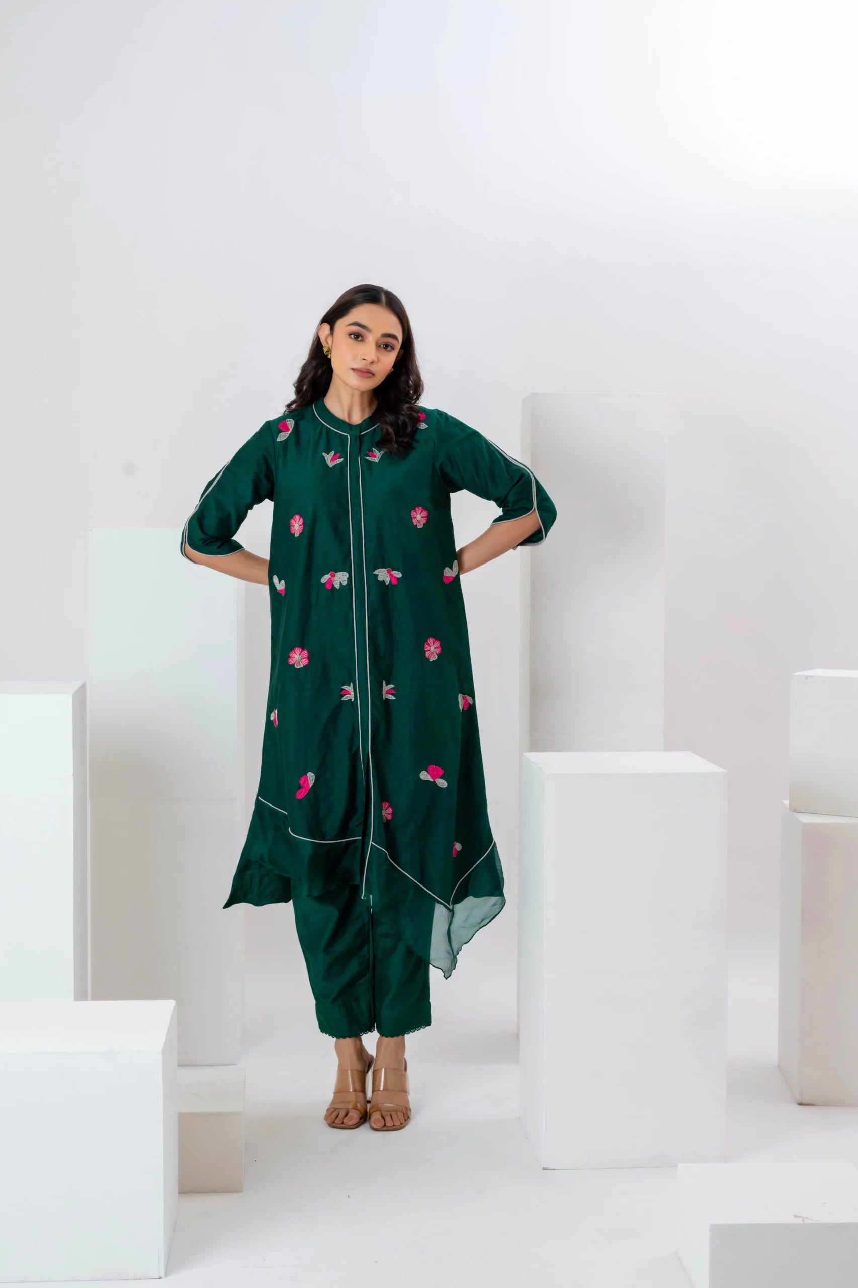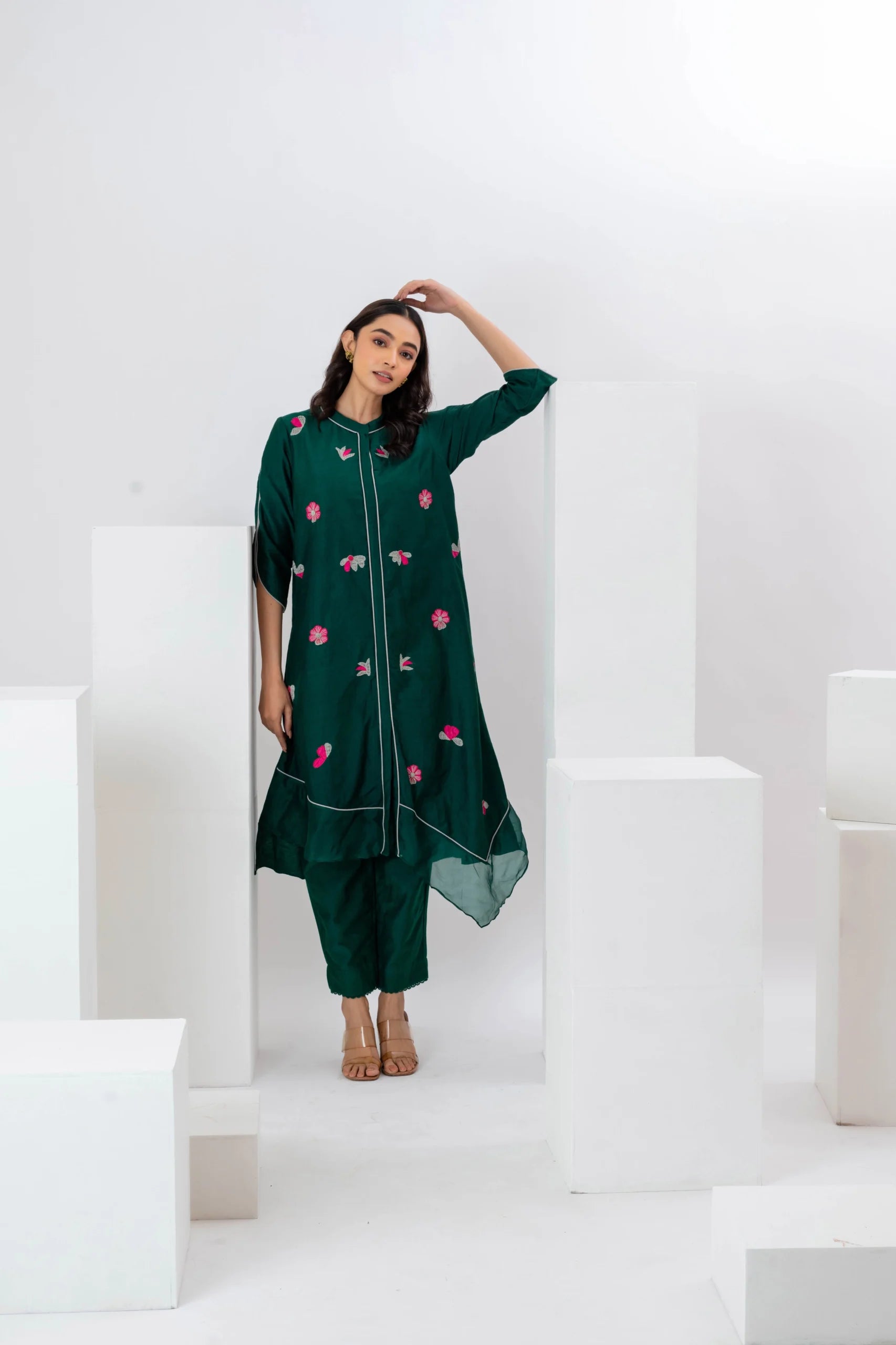 Product Description: Featuring a green asymmetrical kurta in handwoven cotton silk and organza base with applique hand embroidery. It is paired with straight pants. Style it with nude or ivory accessories or statement earrings and bracelets for a touch of elegance.