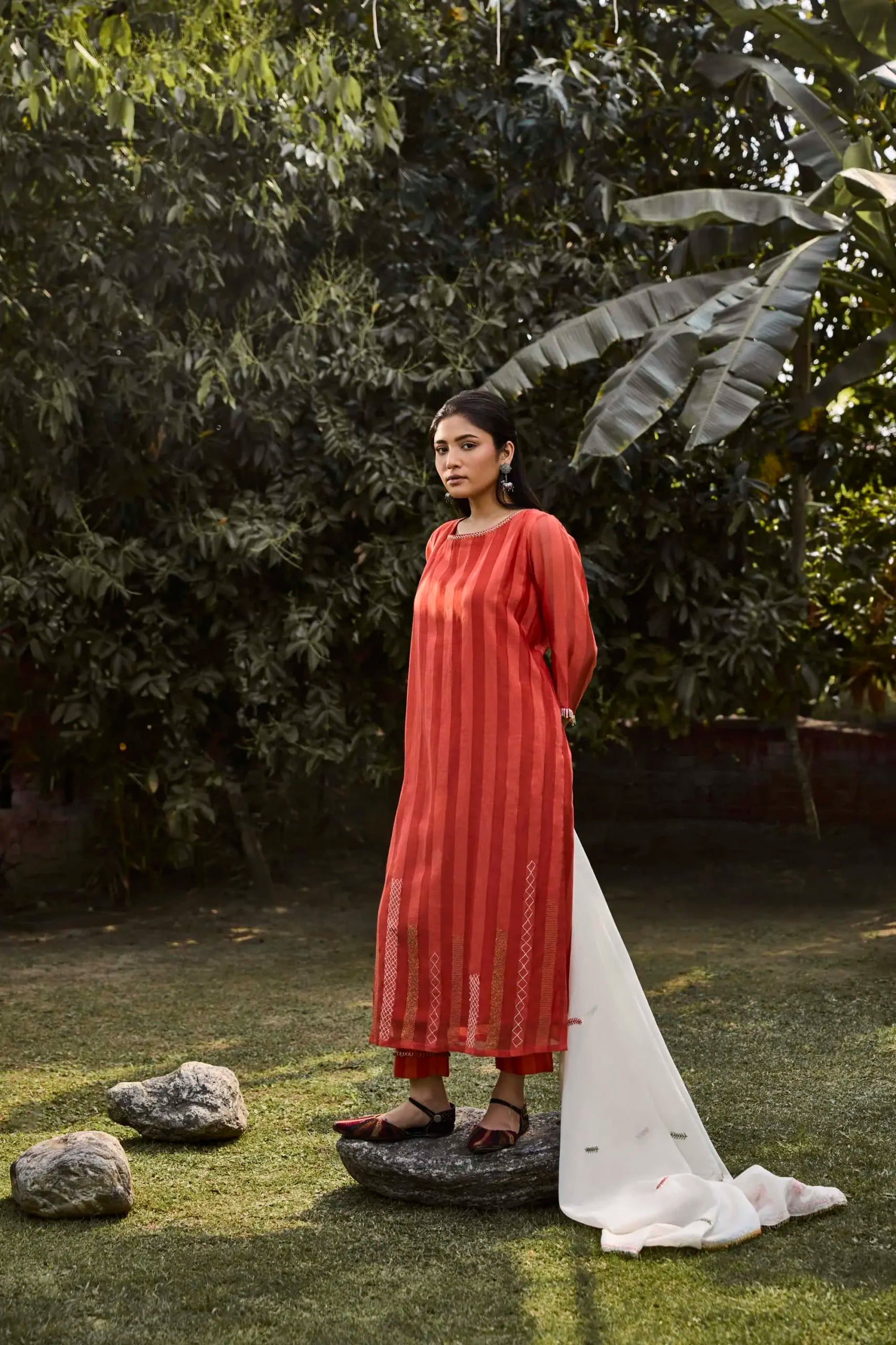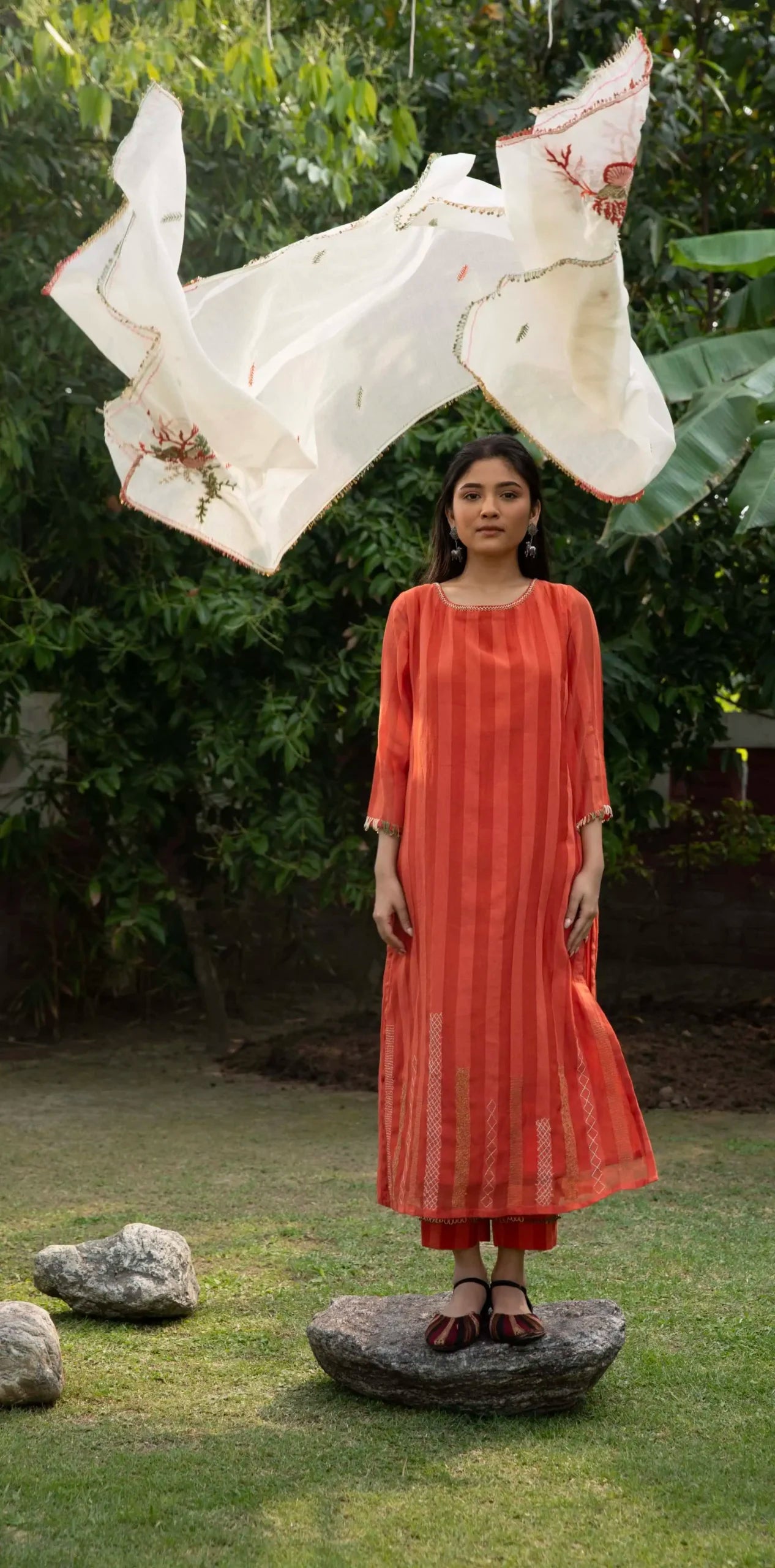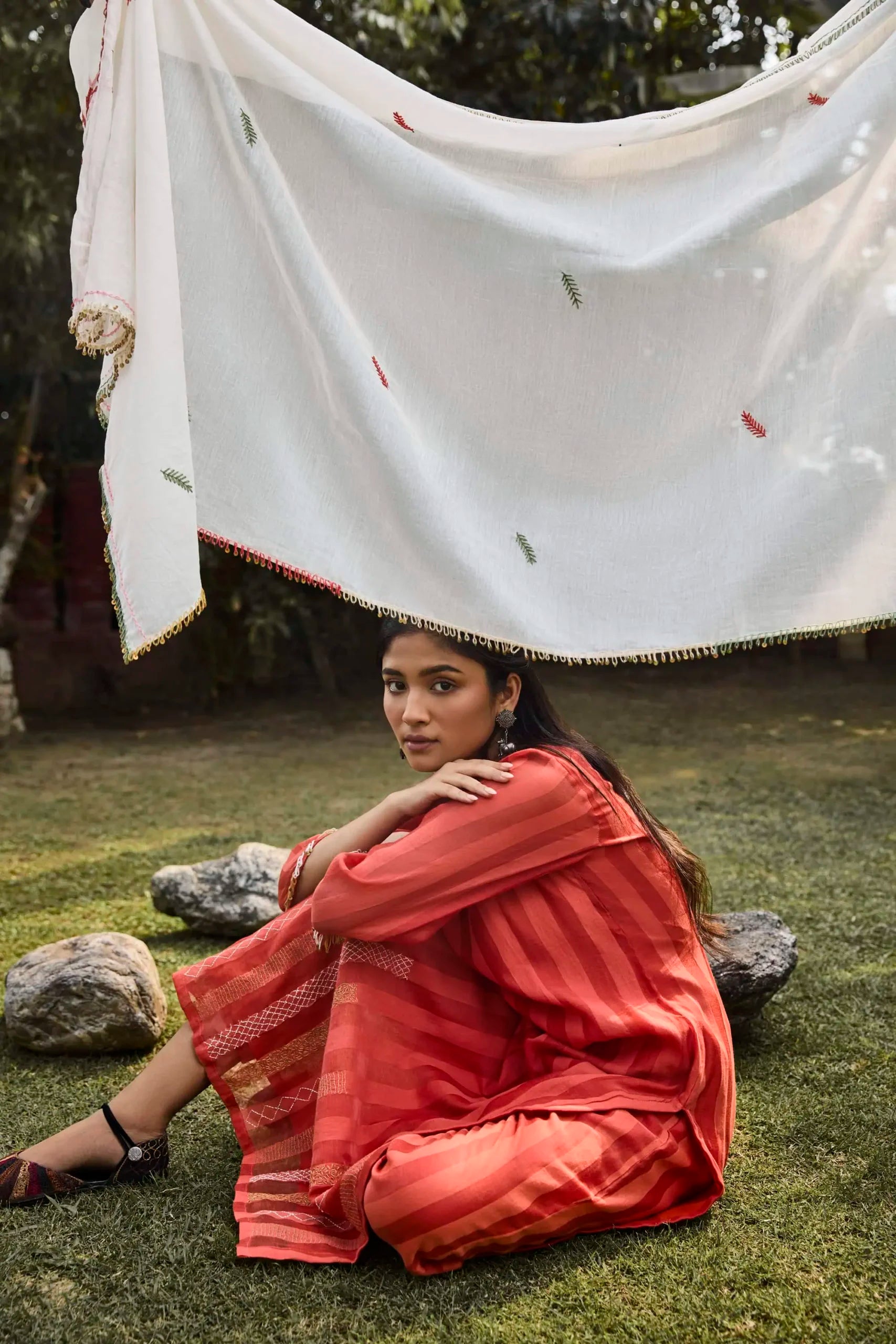 Product Description: Rust & ivory handwoven stripe cotton silk kurta with kantha embroidery. Comes with trouser and a chanderi dupatta.