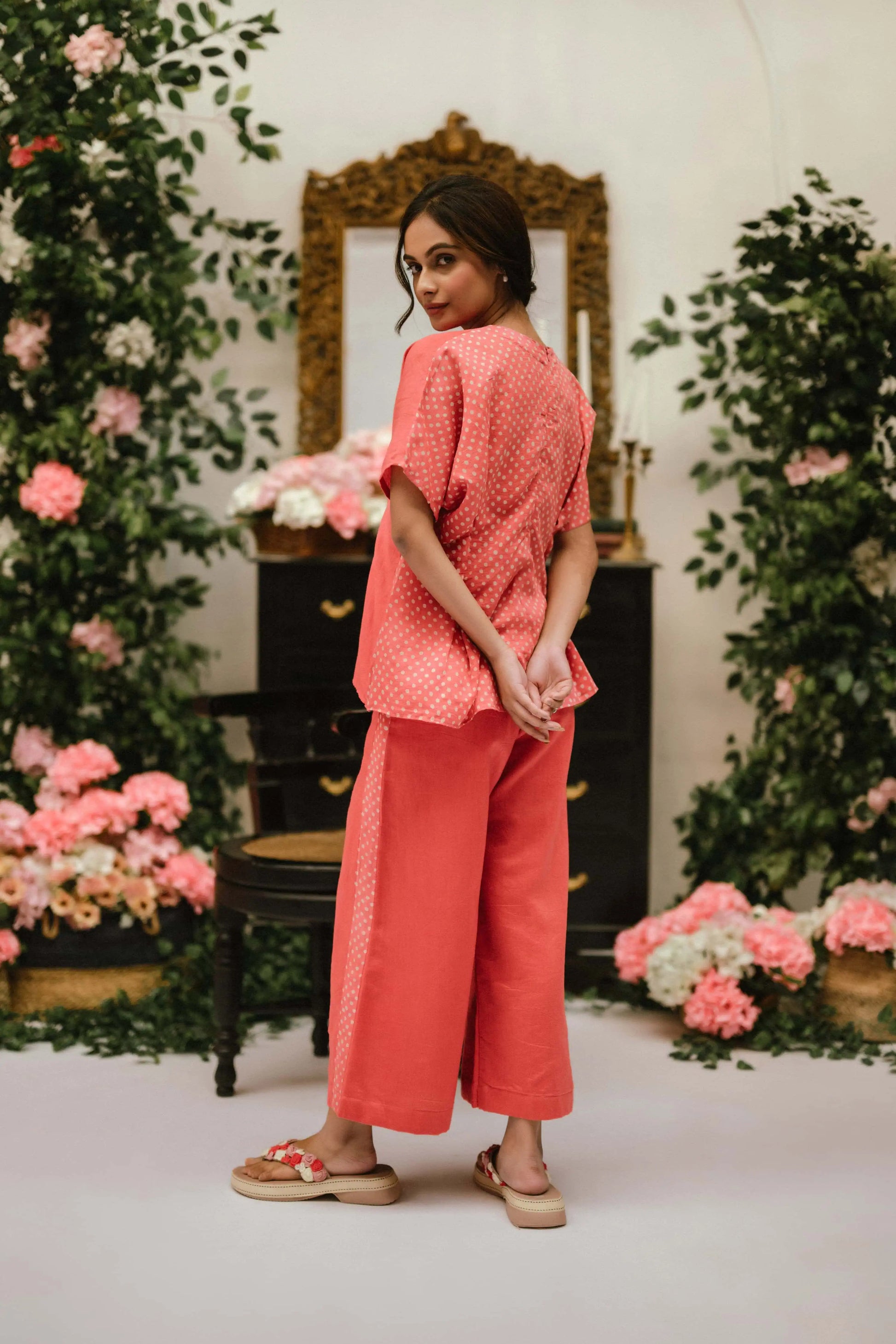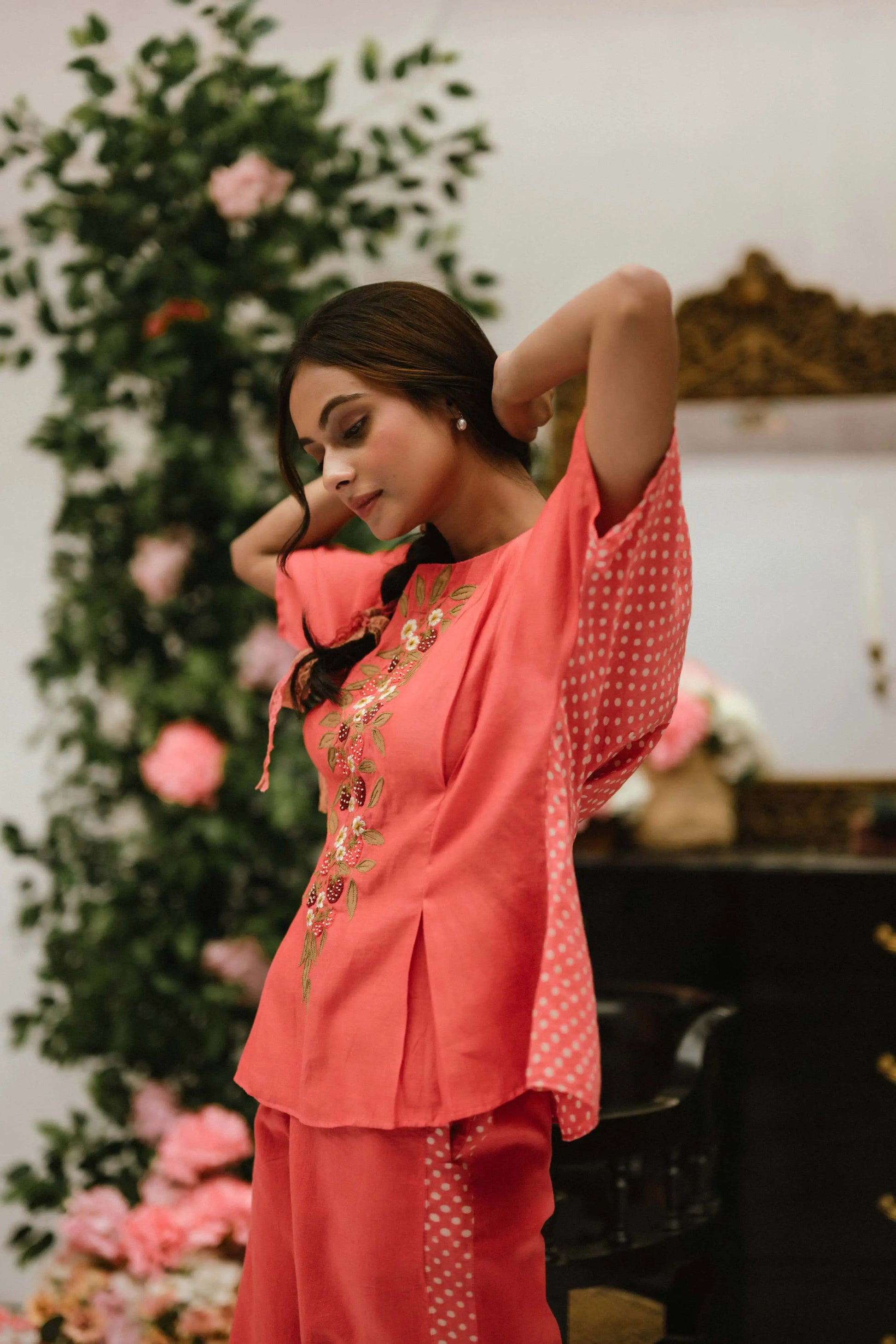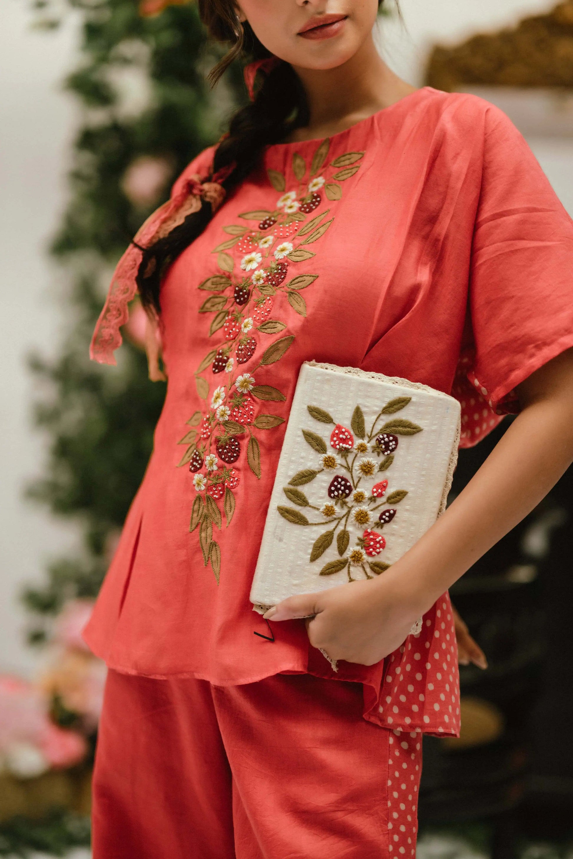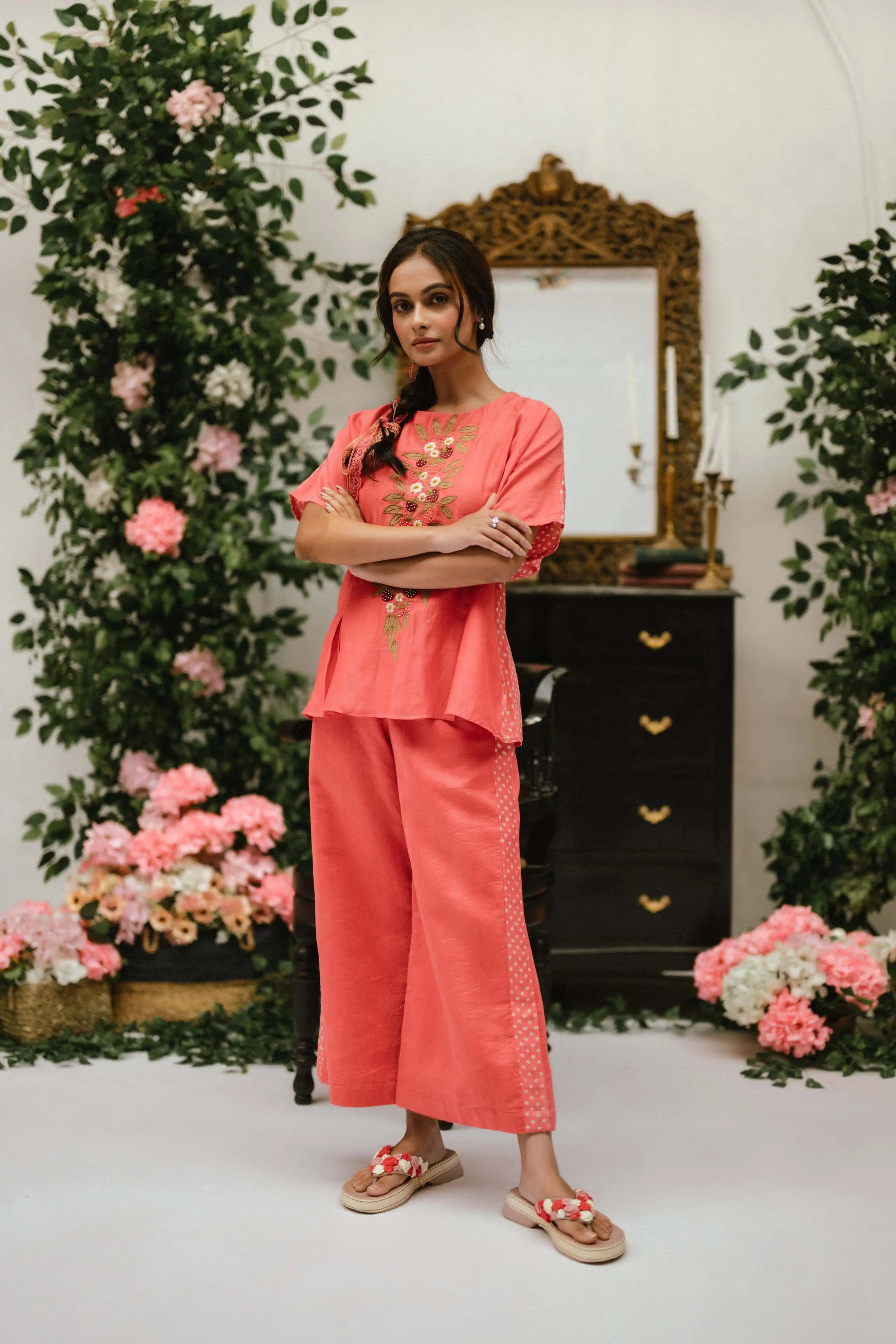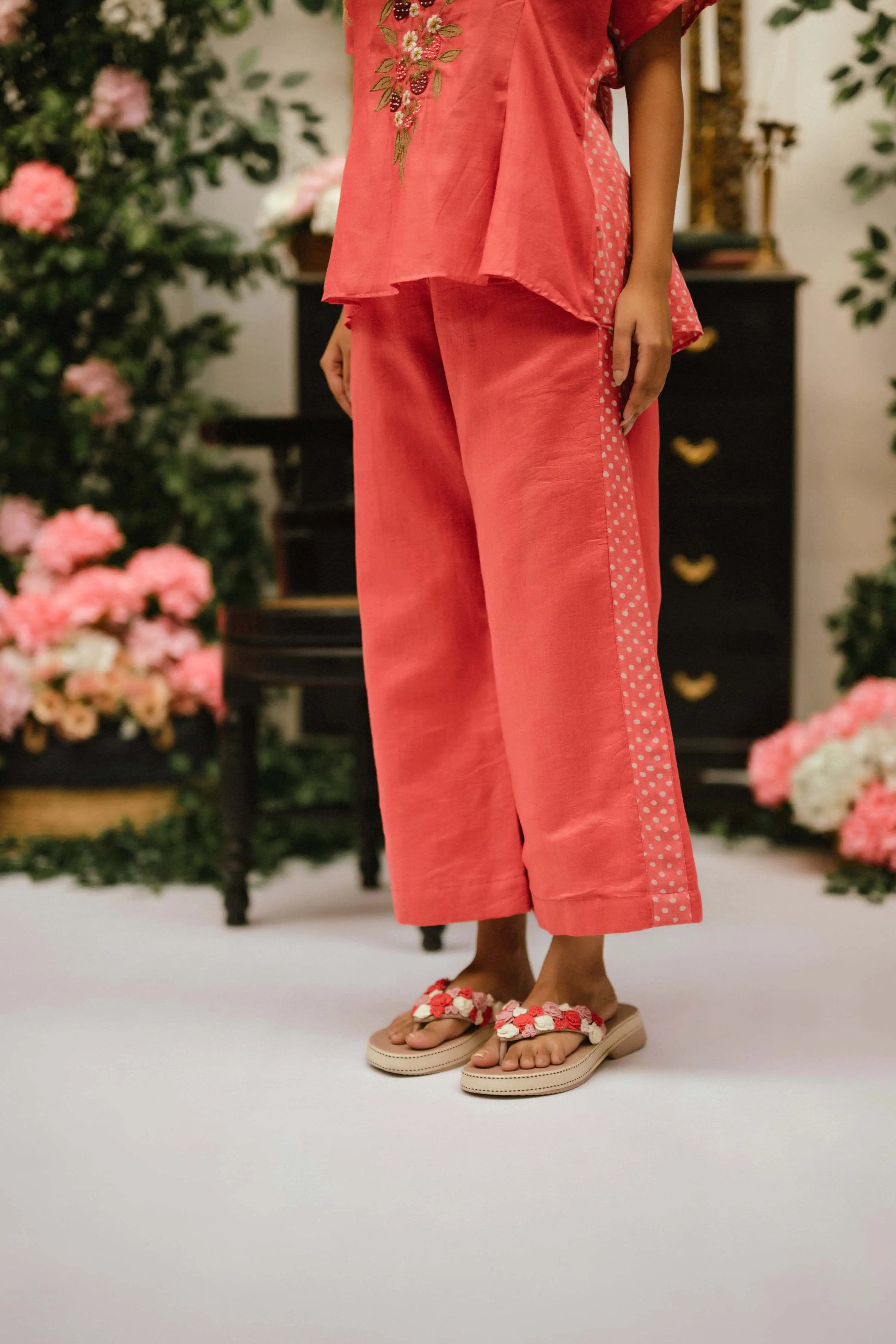 Product Description: Marlow is crafted in handwoven chanderi.The top is hand embroidered with berry branches detailing.Comes with flared trouser.
