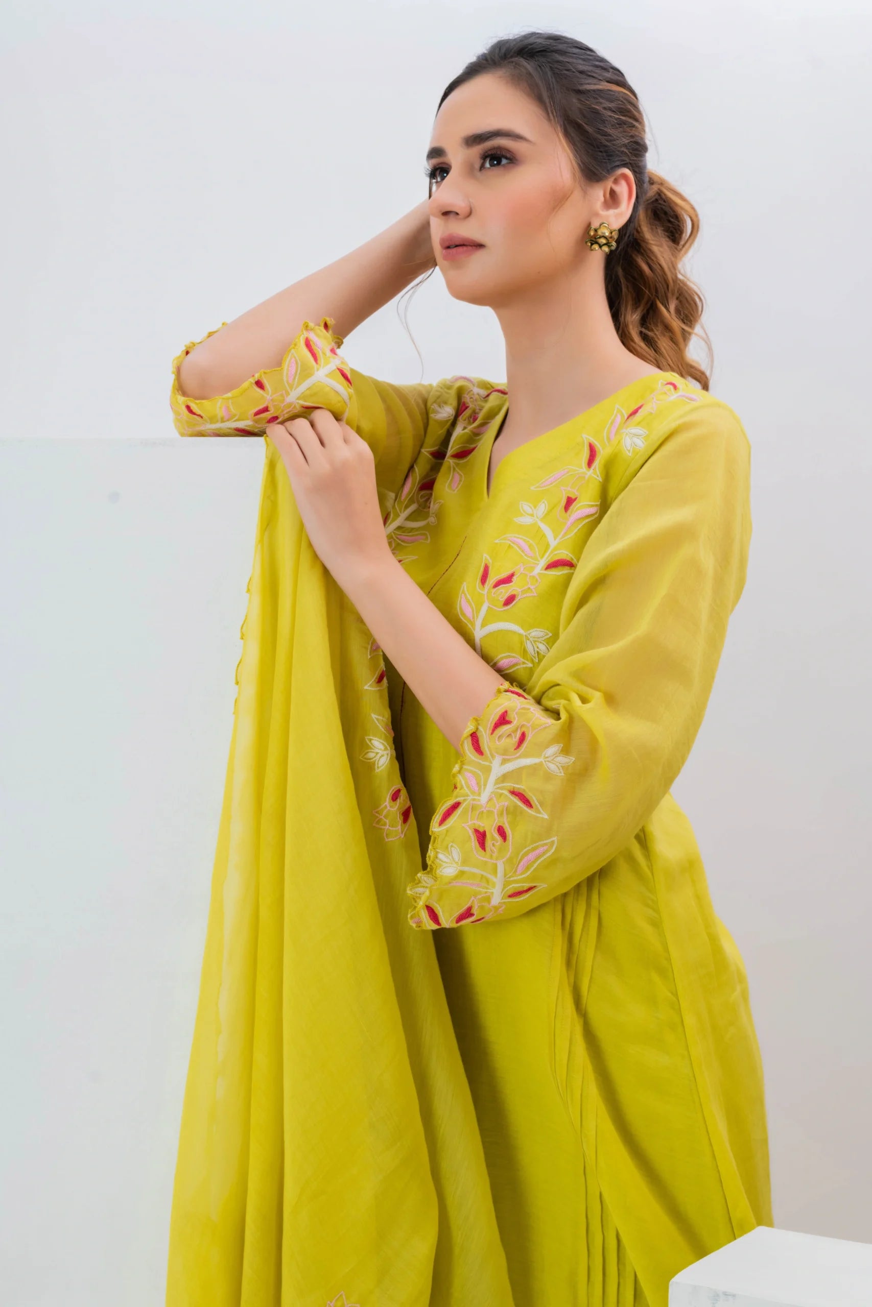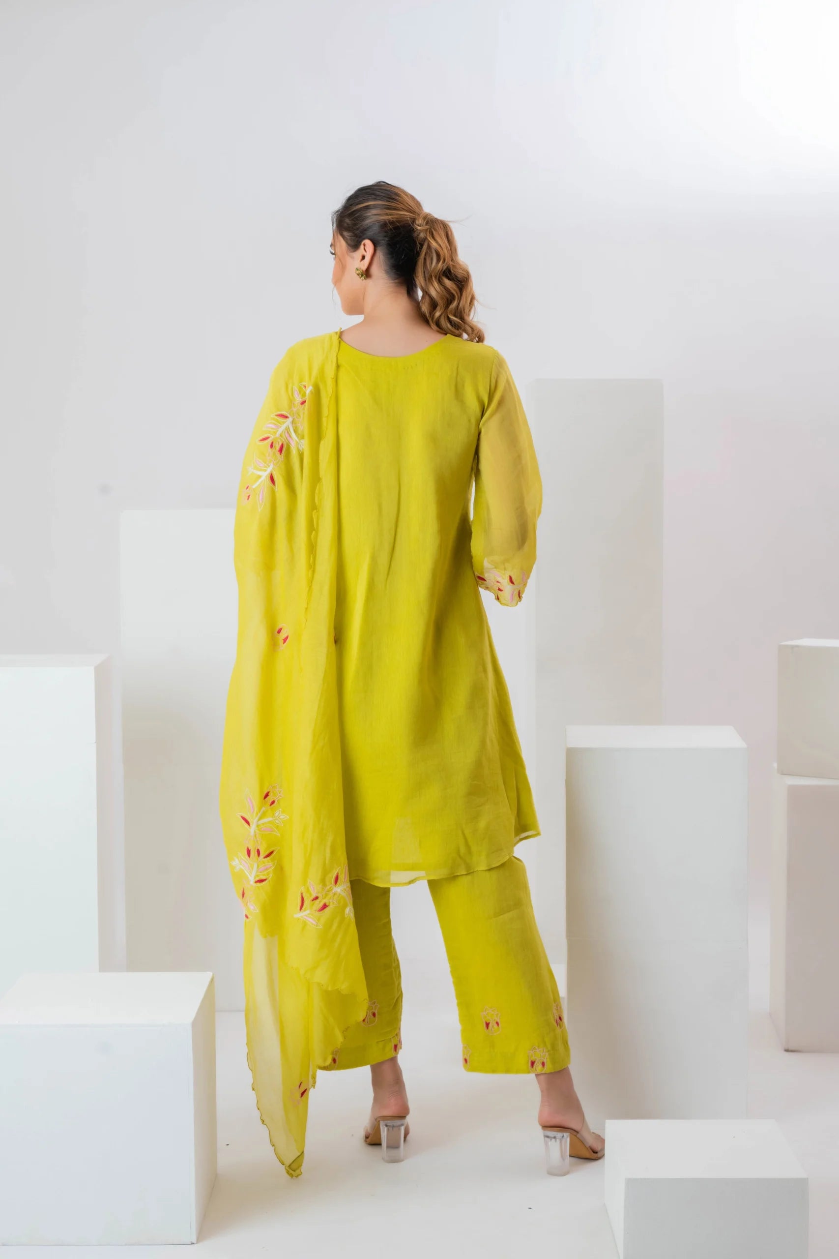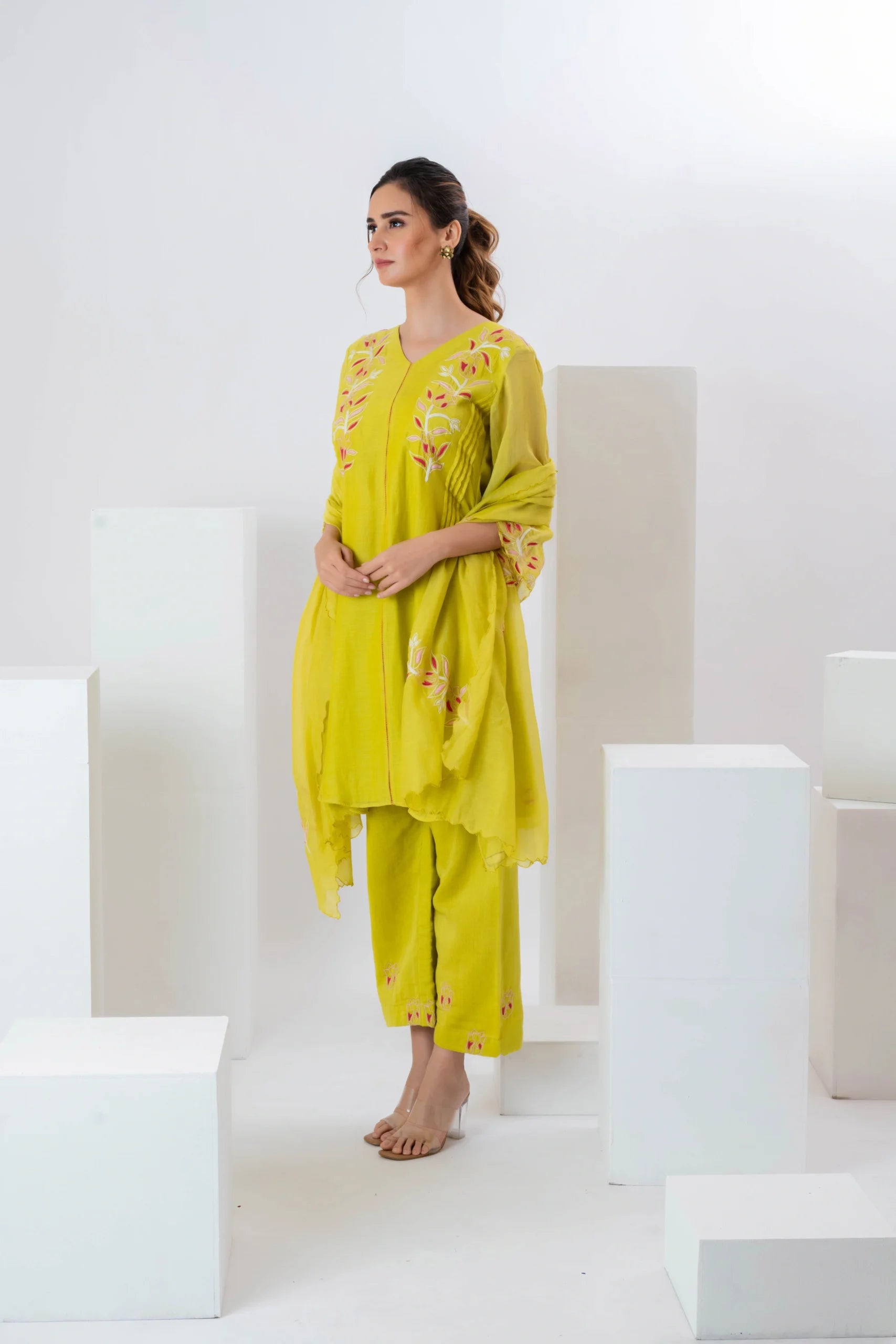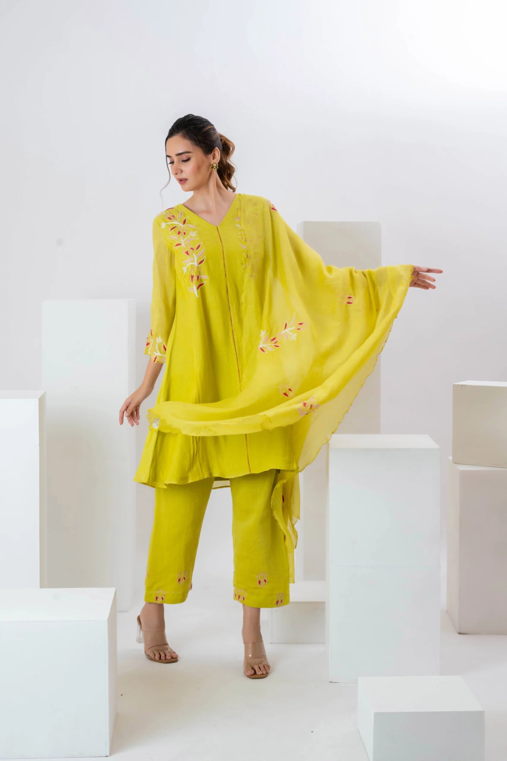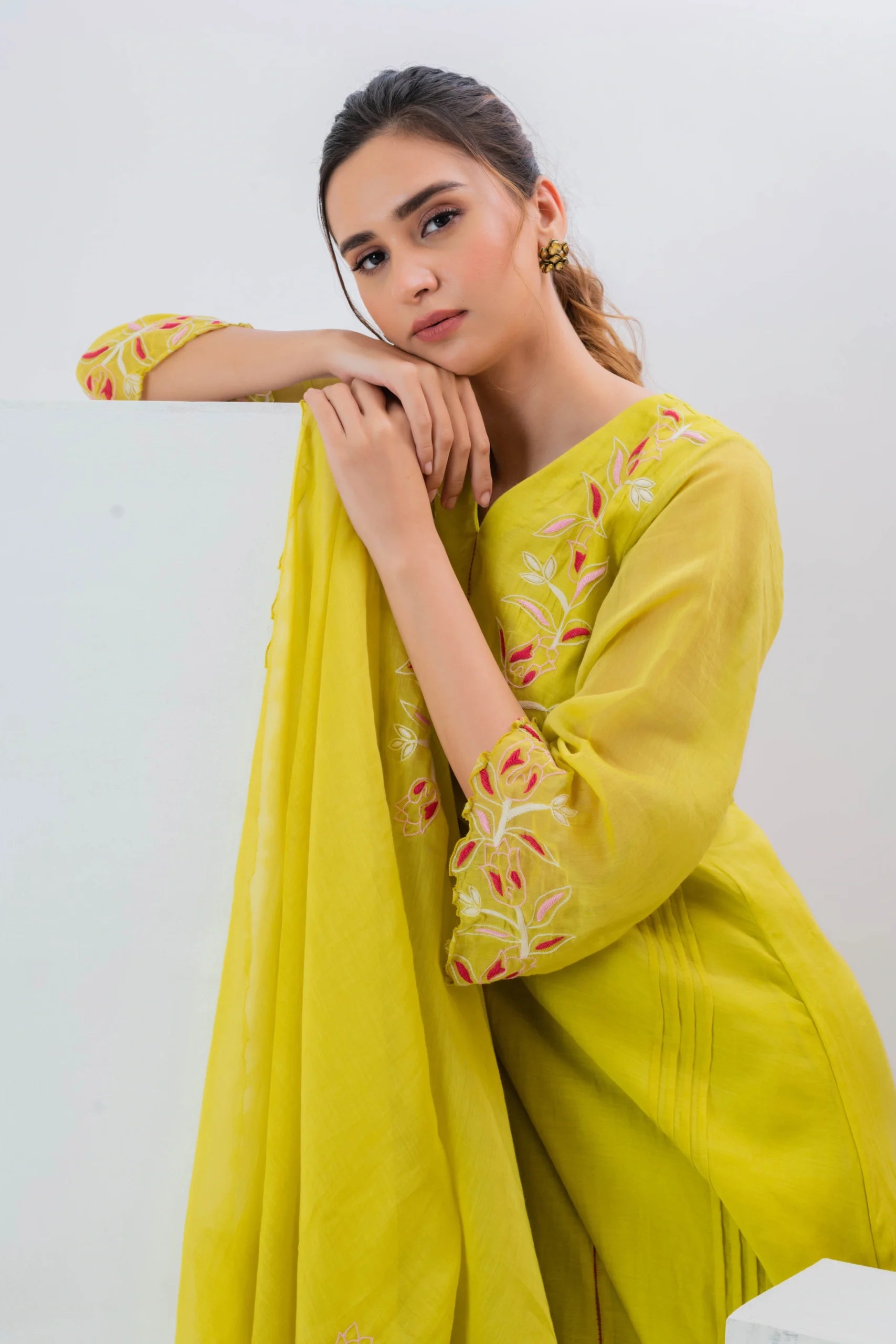 Product Description: Featuring a yellow pleated kurta in malai chanderi base with a v-neckline and cutwork embroidery. It is paired with pants having thread embroidery and a cutwork dupatta. To embrace the vibrant and traditional look style it with gold or silver jhumkas and bangles to complement the embroidery. Add some strappy sandals or juttis for a touch of elegance.