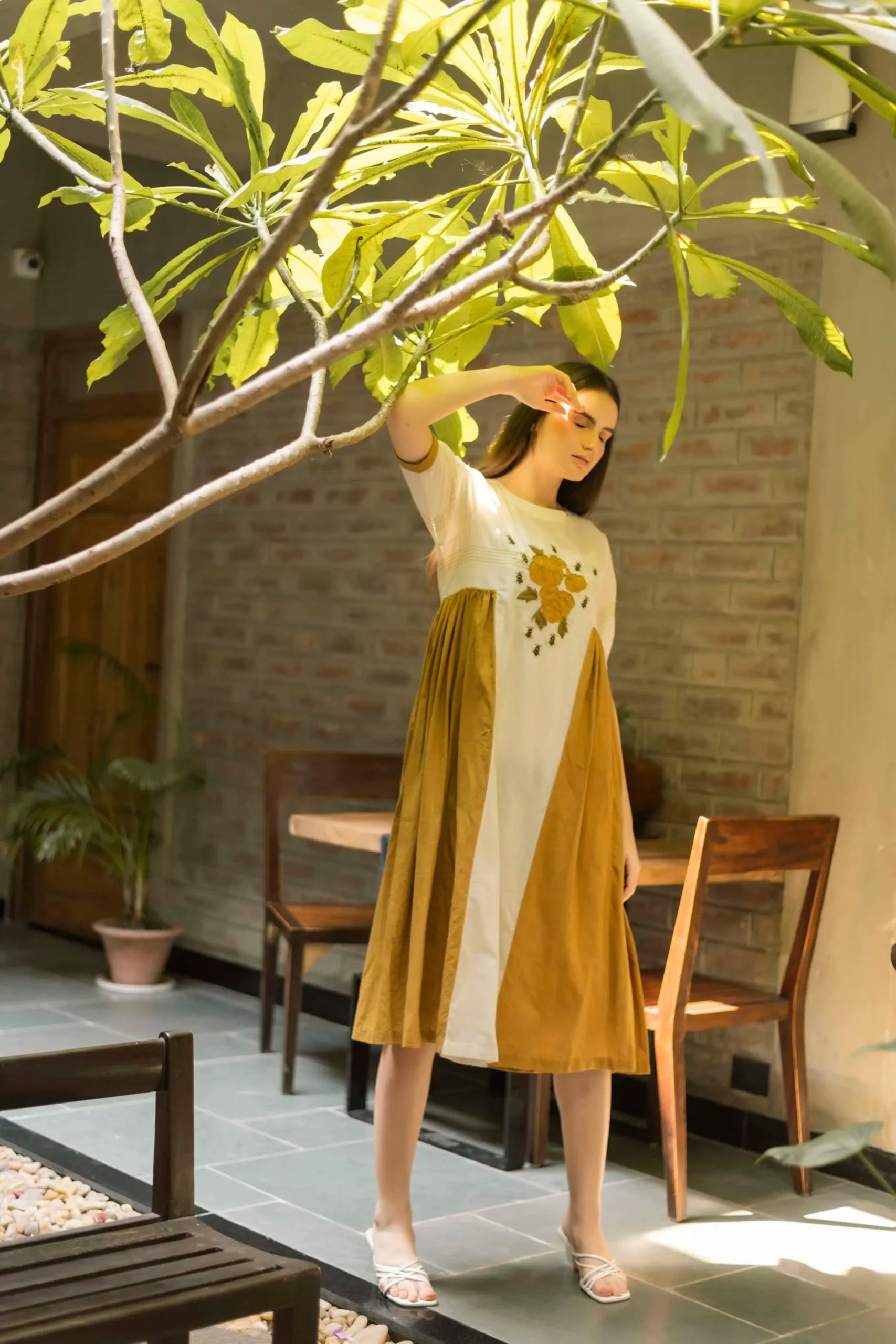 Product Description: Ivory & honey handwoven cotton knee-length A-line dress with thread applique embroidery.