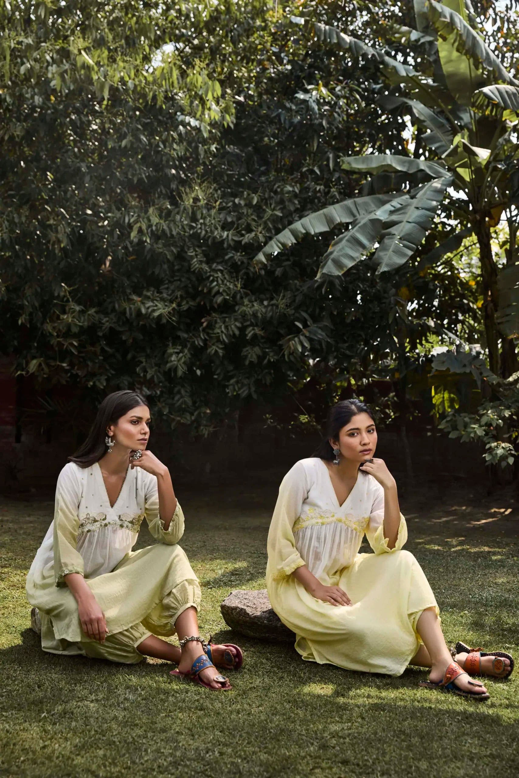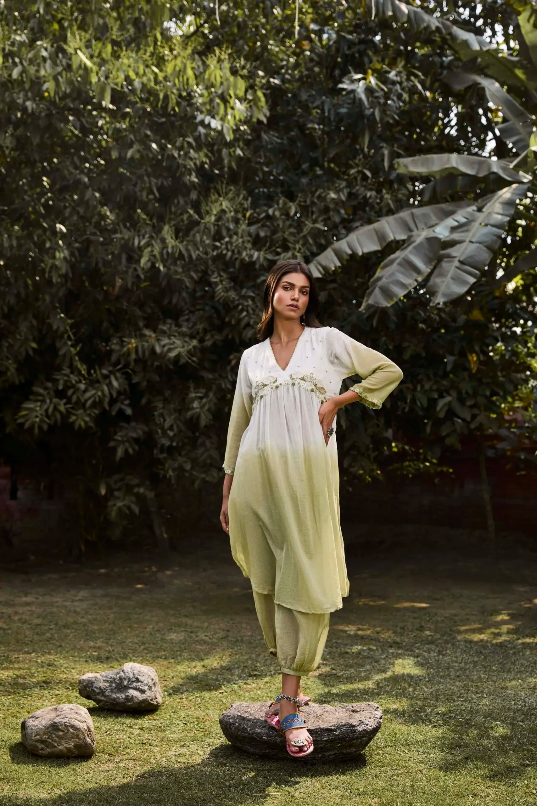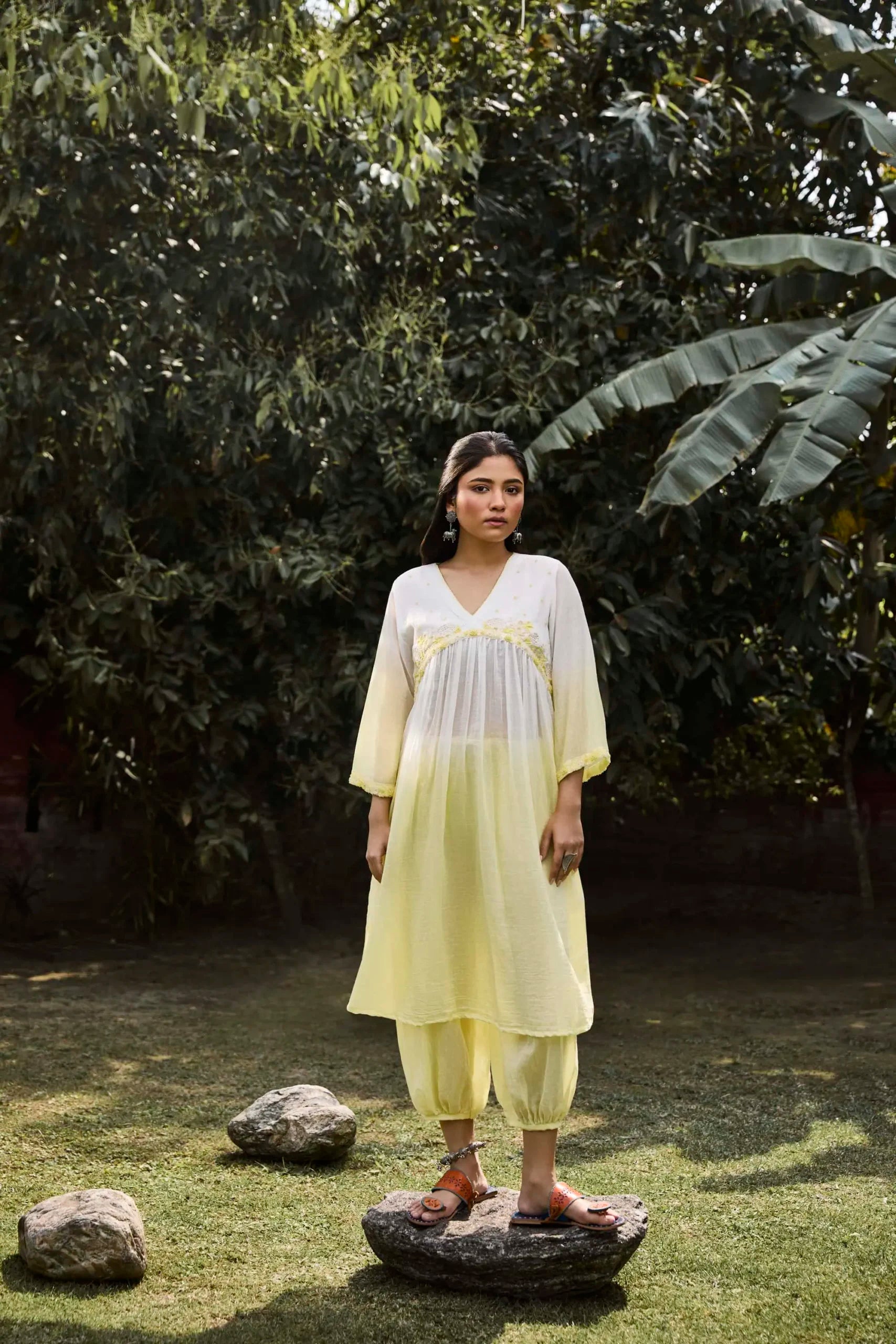 Product Description: Yellow & green handwoven cotton silk tunic with floral applique hand embroidered yoke. Comes with salwar.