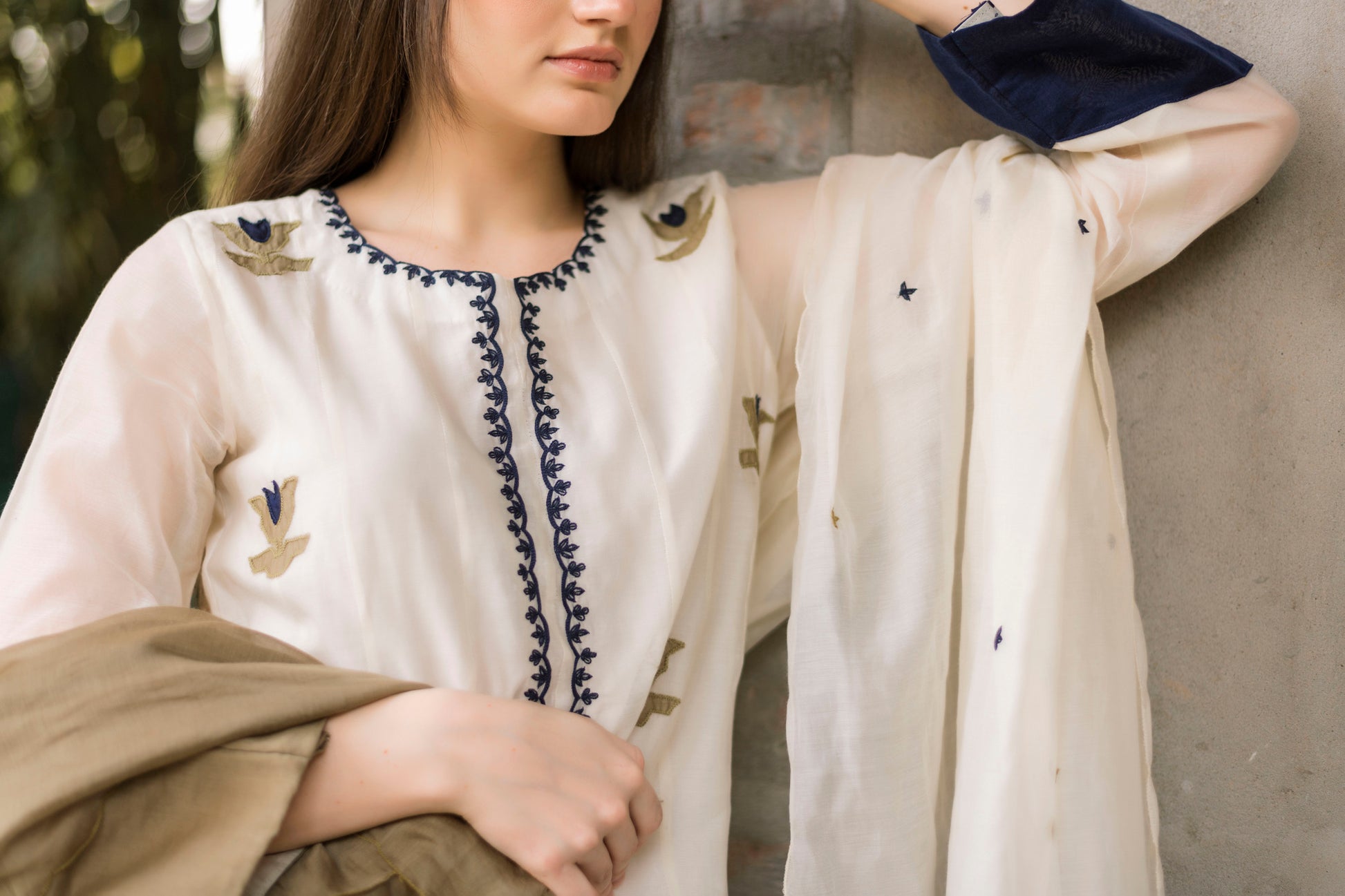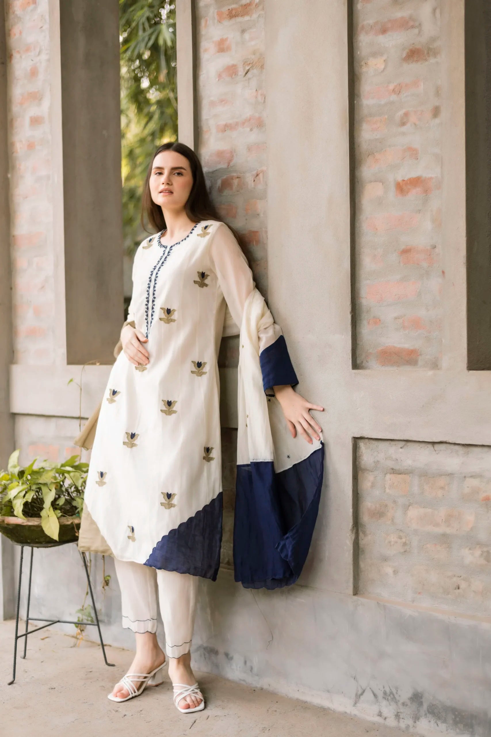 Product Description: Ivory handwoven malai chanderi A-line kurta with olive & blue extensions on sleeve hems and thread applique embroidery. Comes with pant.