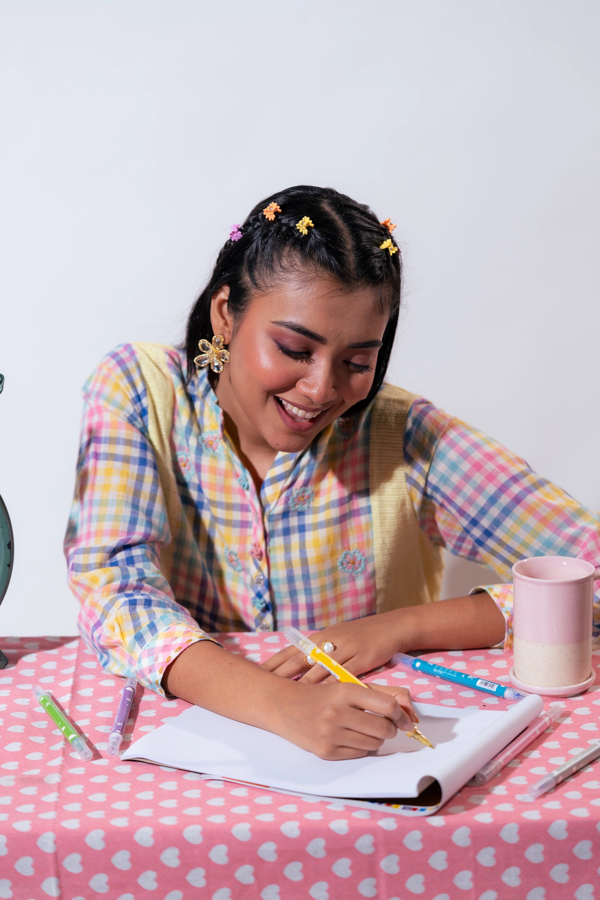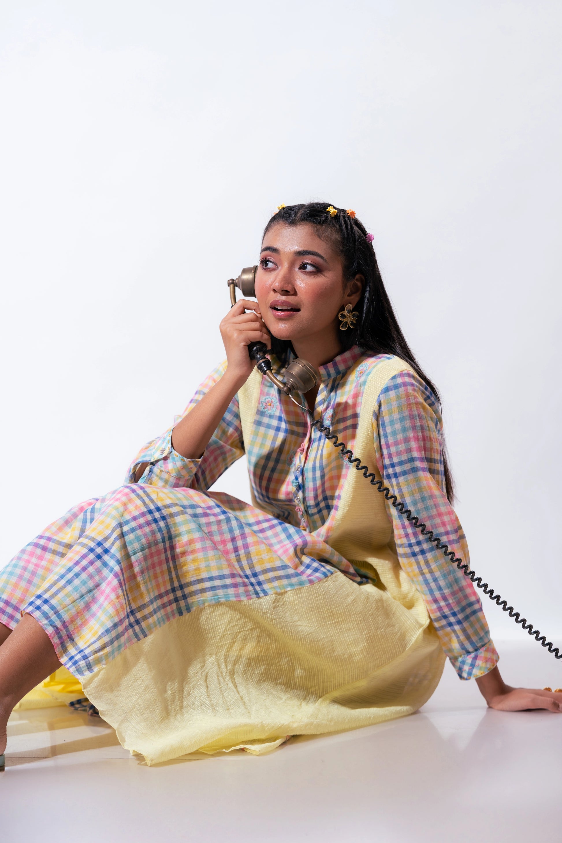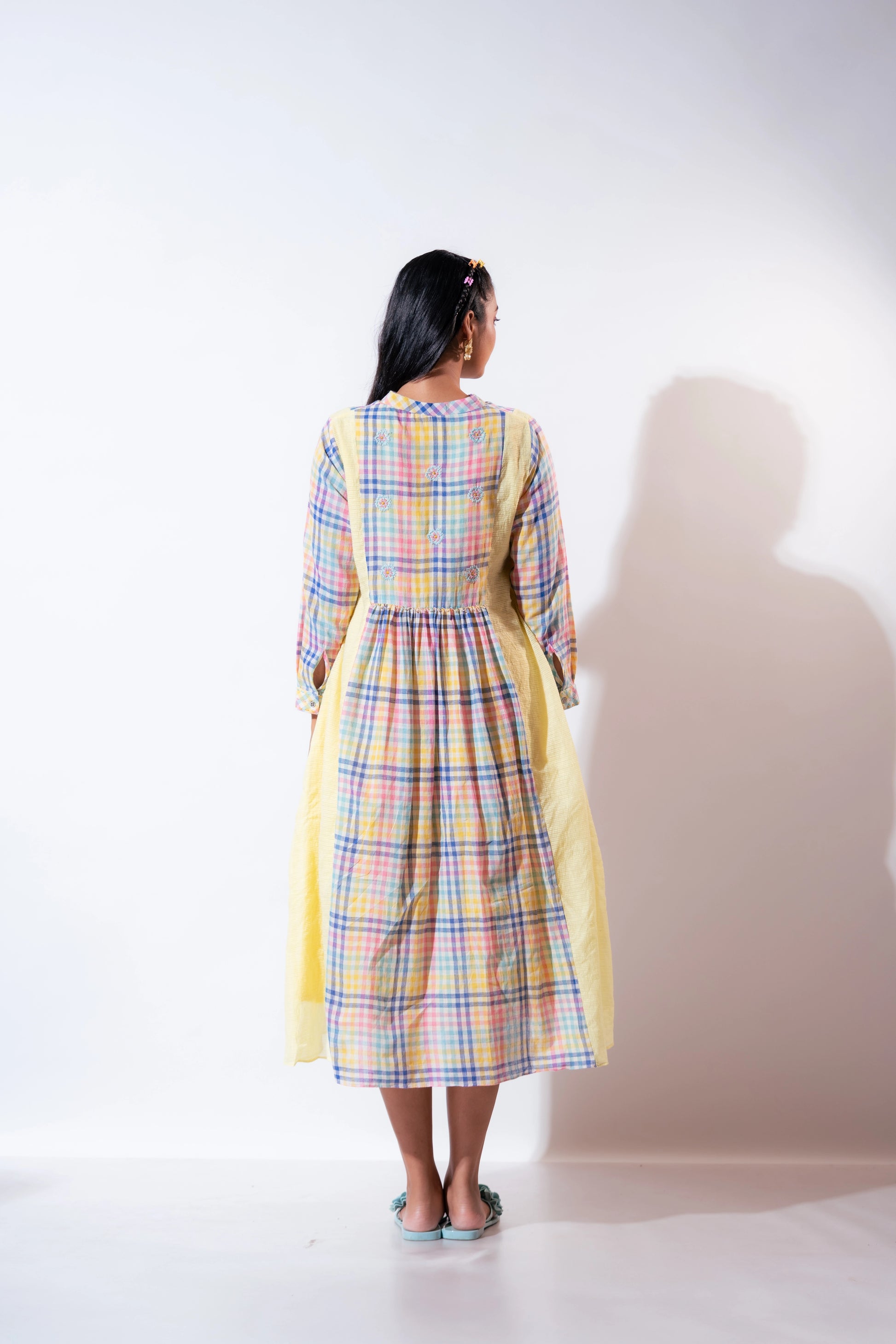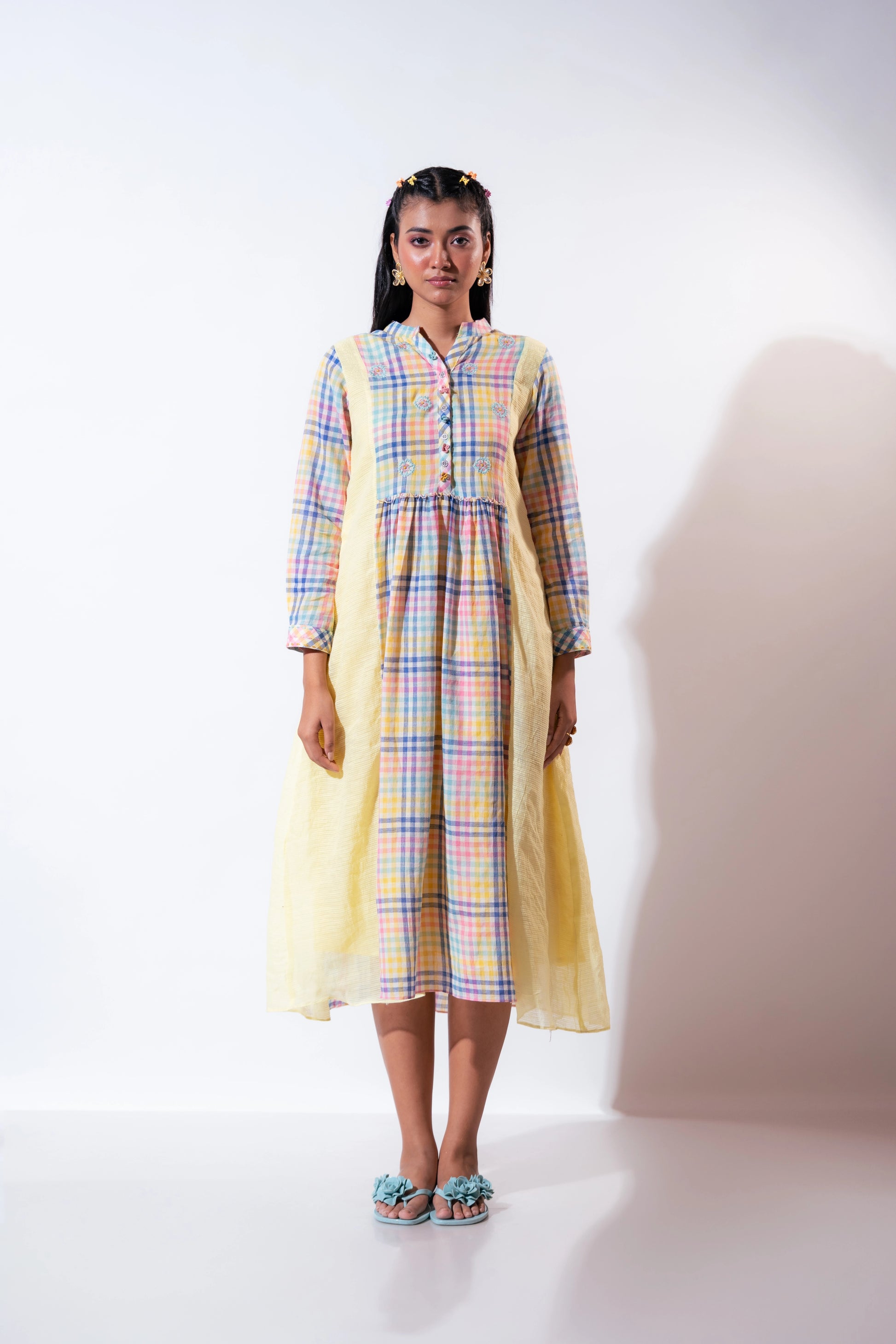Product Description: This midi dress showcases a vibrant multicolored plaid pattern with a buttoned front and gathered waist. Sheer yellow panels on the sides add a breezy, layered effect and playful charm.