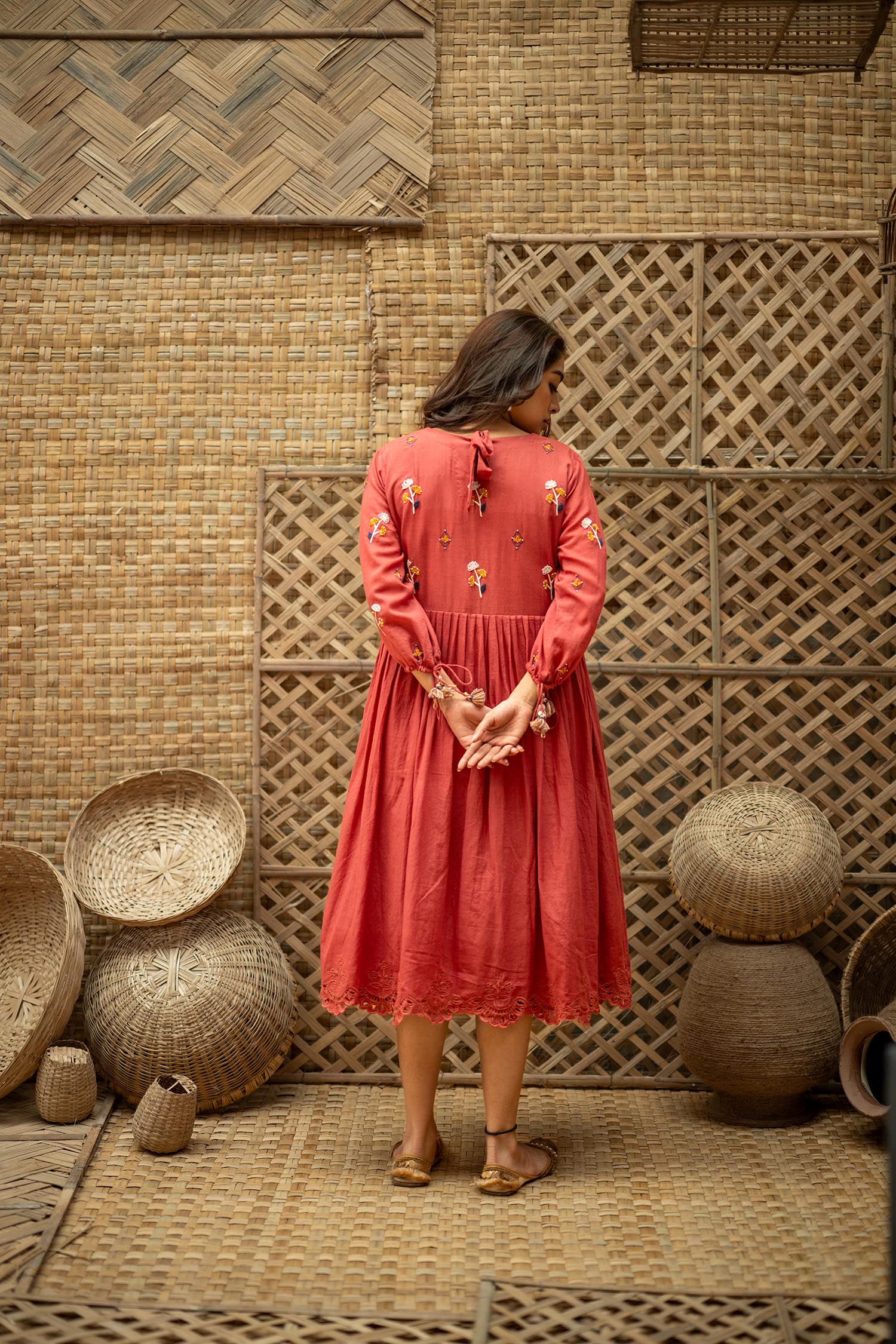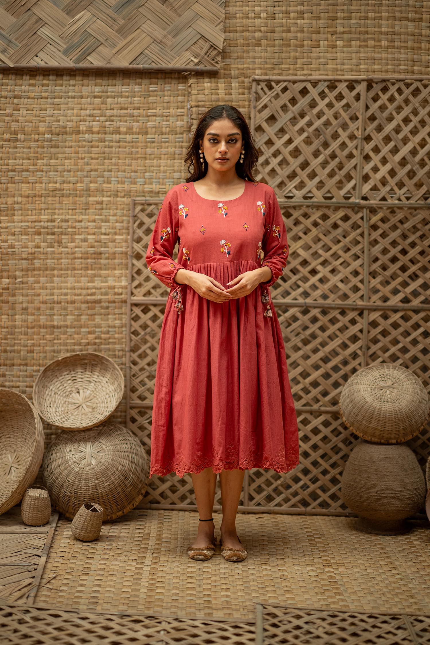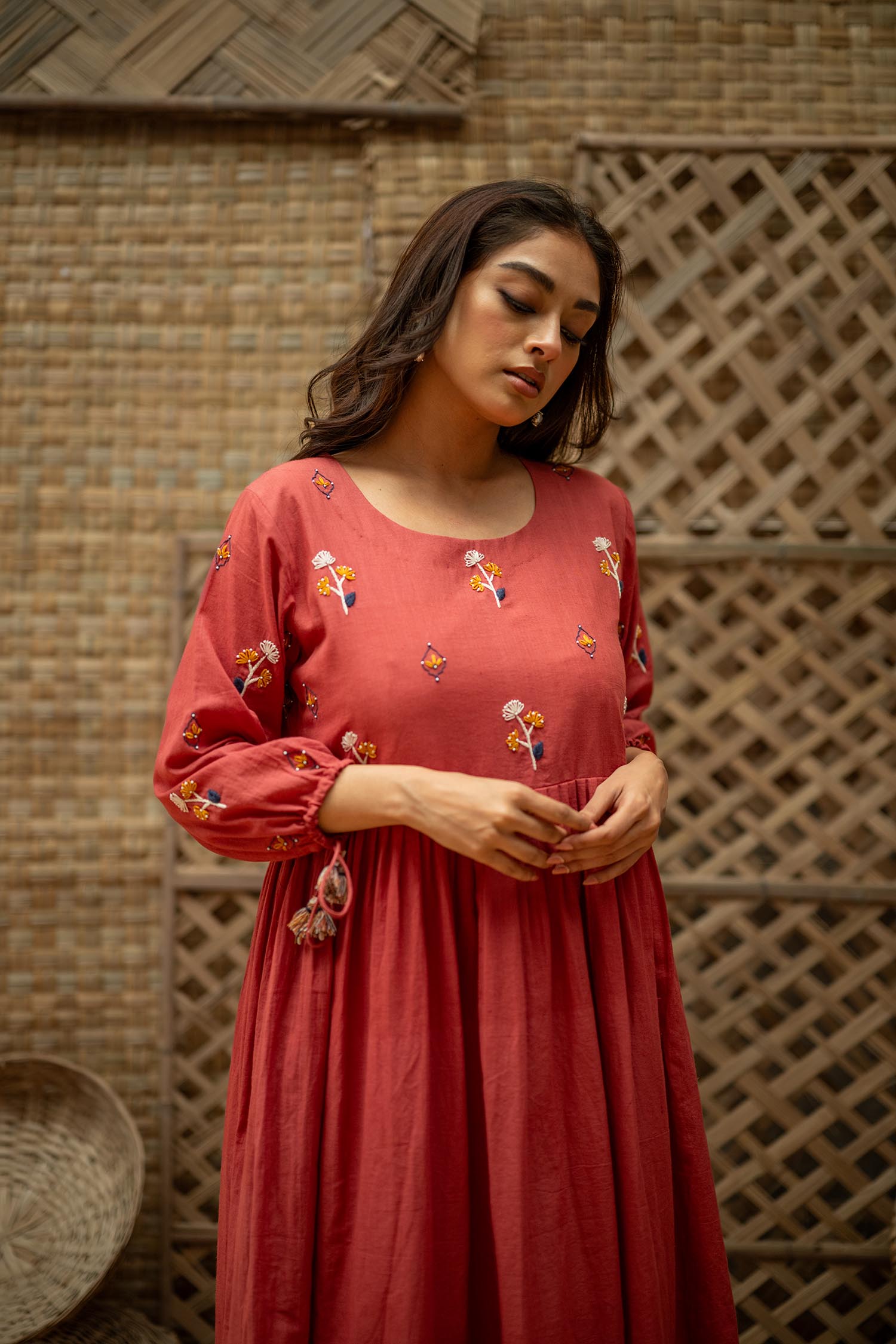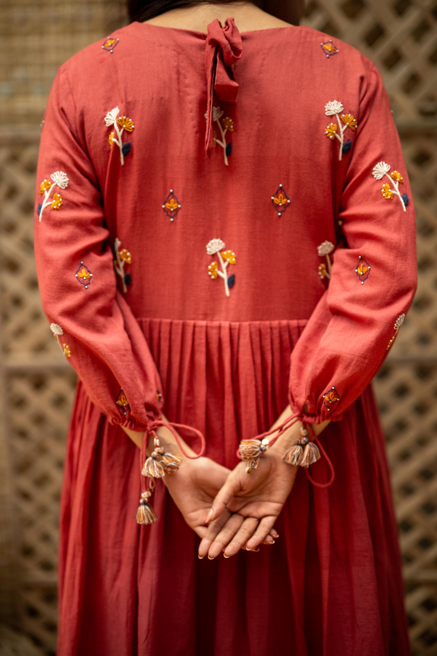 Product Description: Dreamy Midi Dress for the eased out festive season. Hand embroidered yoke, gathered tassels on the sleeve and an aesthetic bow tie up at the back of the neck. The dress is a fit and flare silhouette with knife pleat details at the waist.