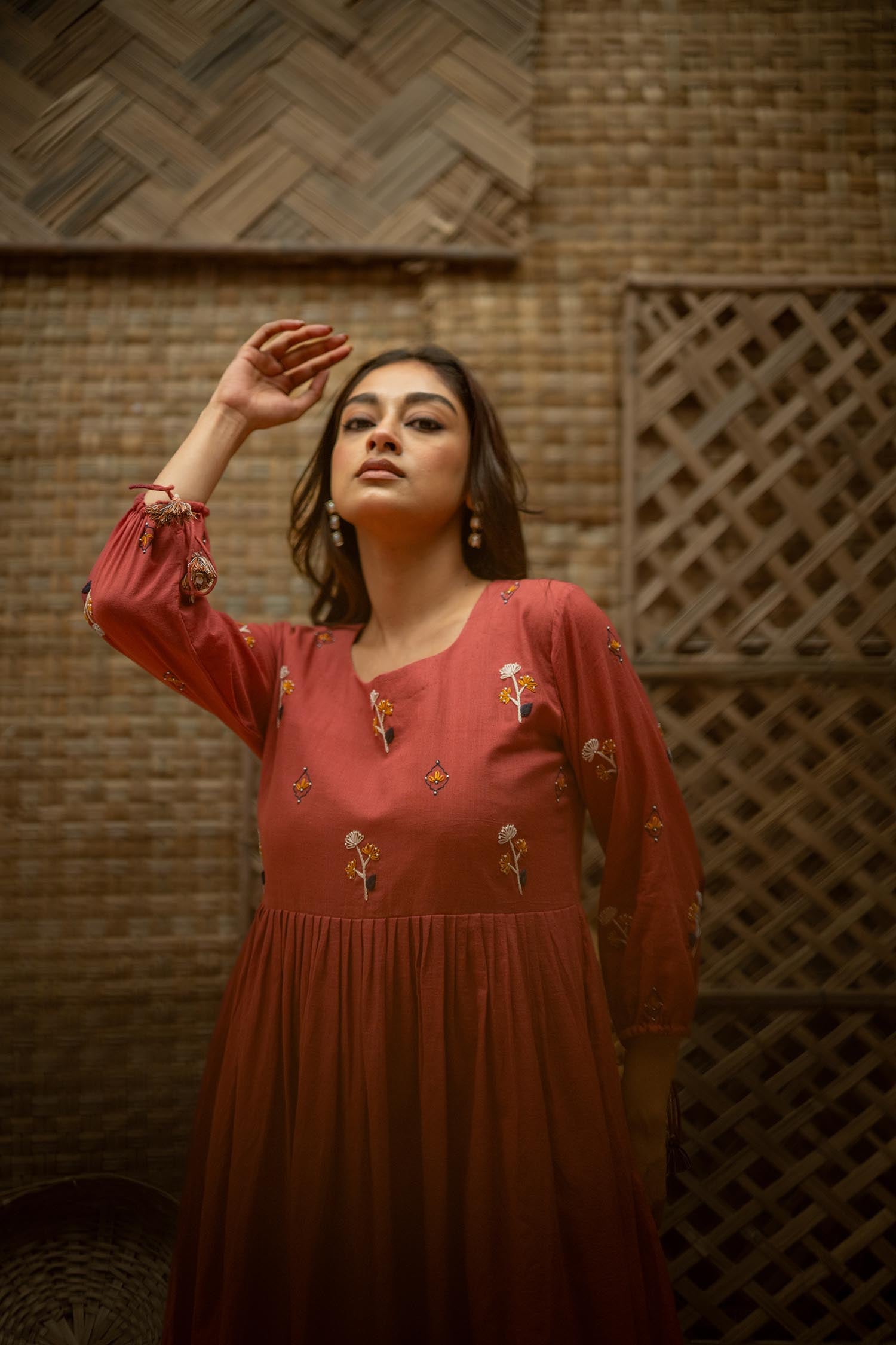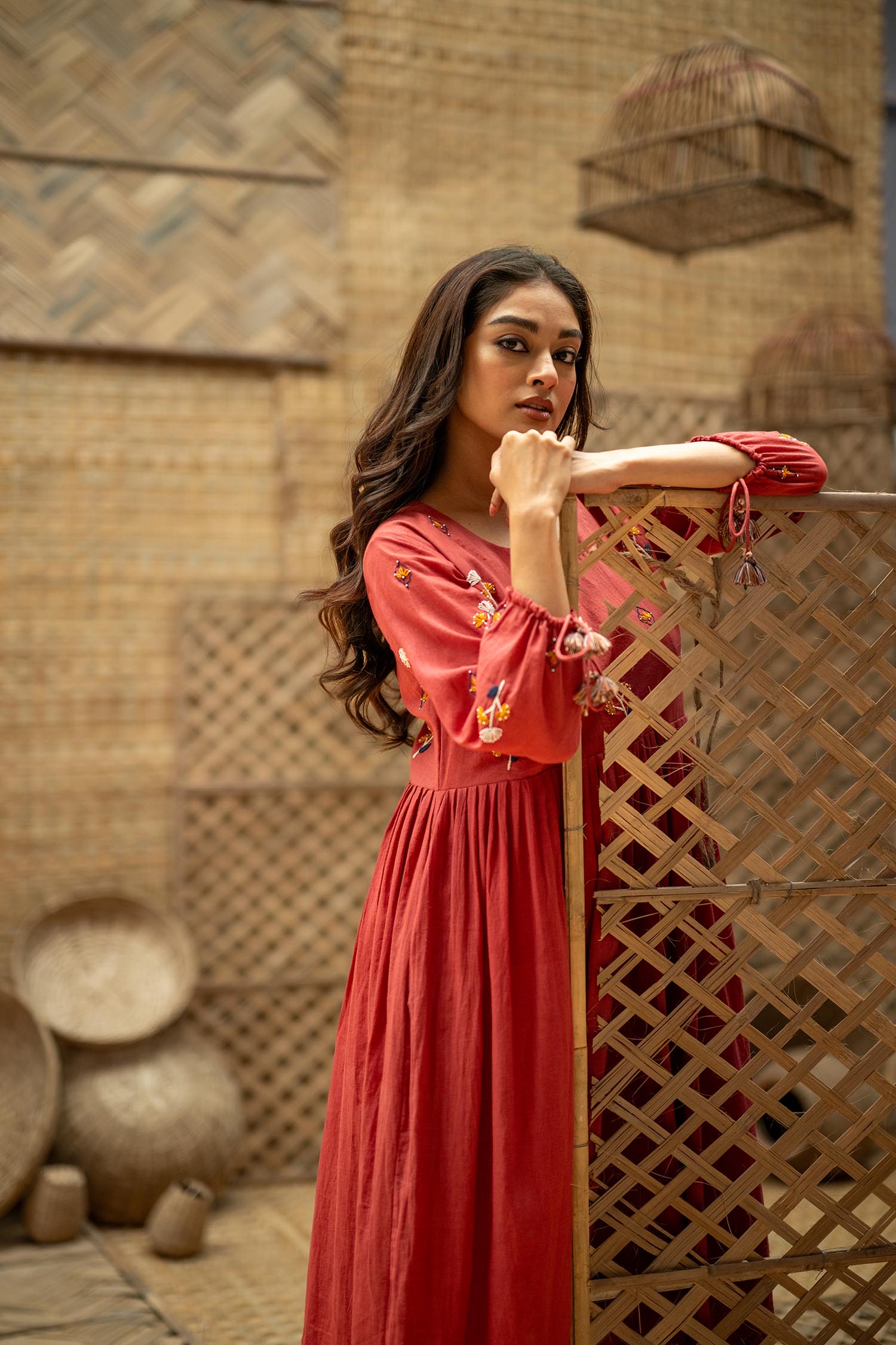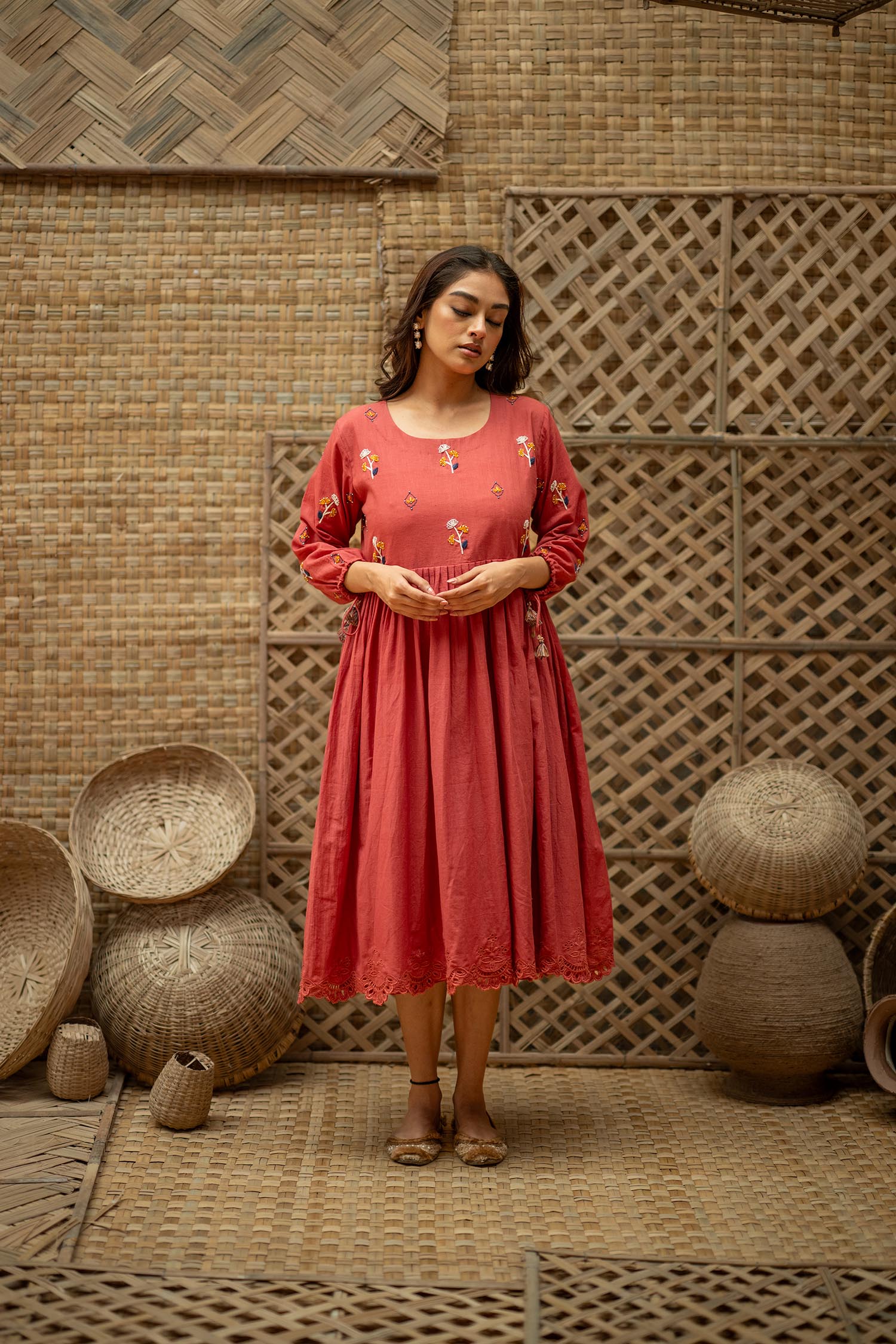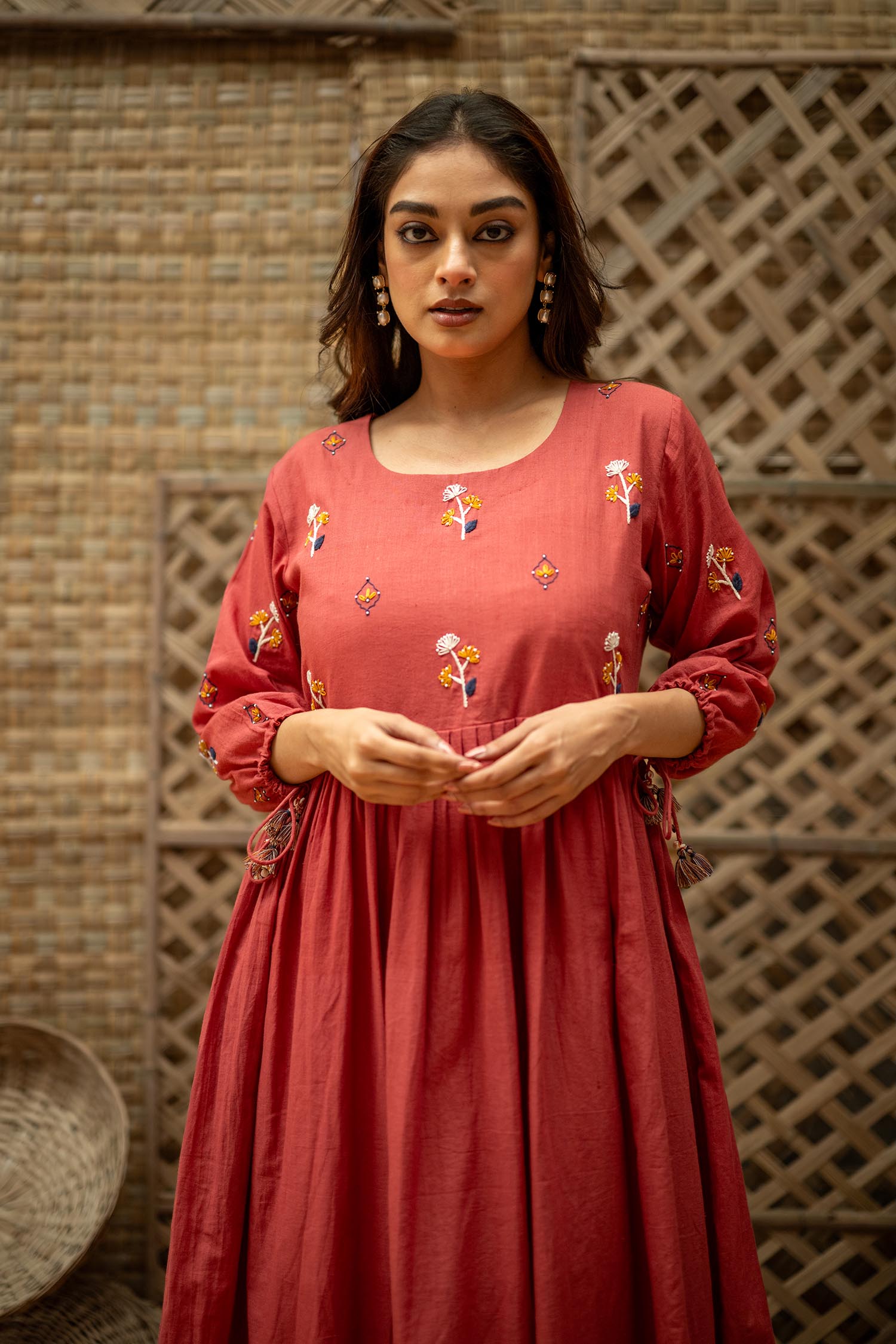 Product Description: Dreamy Midi Dress for the eased out festive season. Hand embroidered yoke, gathered tassels on the sleeve and an aesthetic bow tie up at the back of the neck. The dress is a fit and flare silhouette with knife pleat details at the waist.