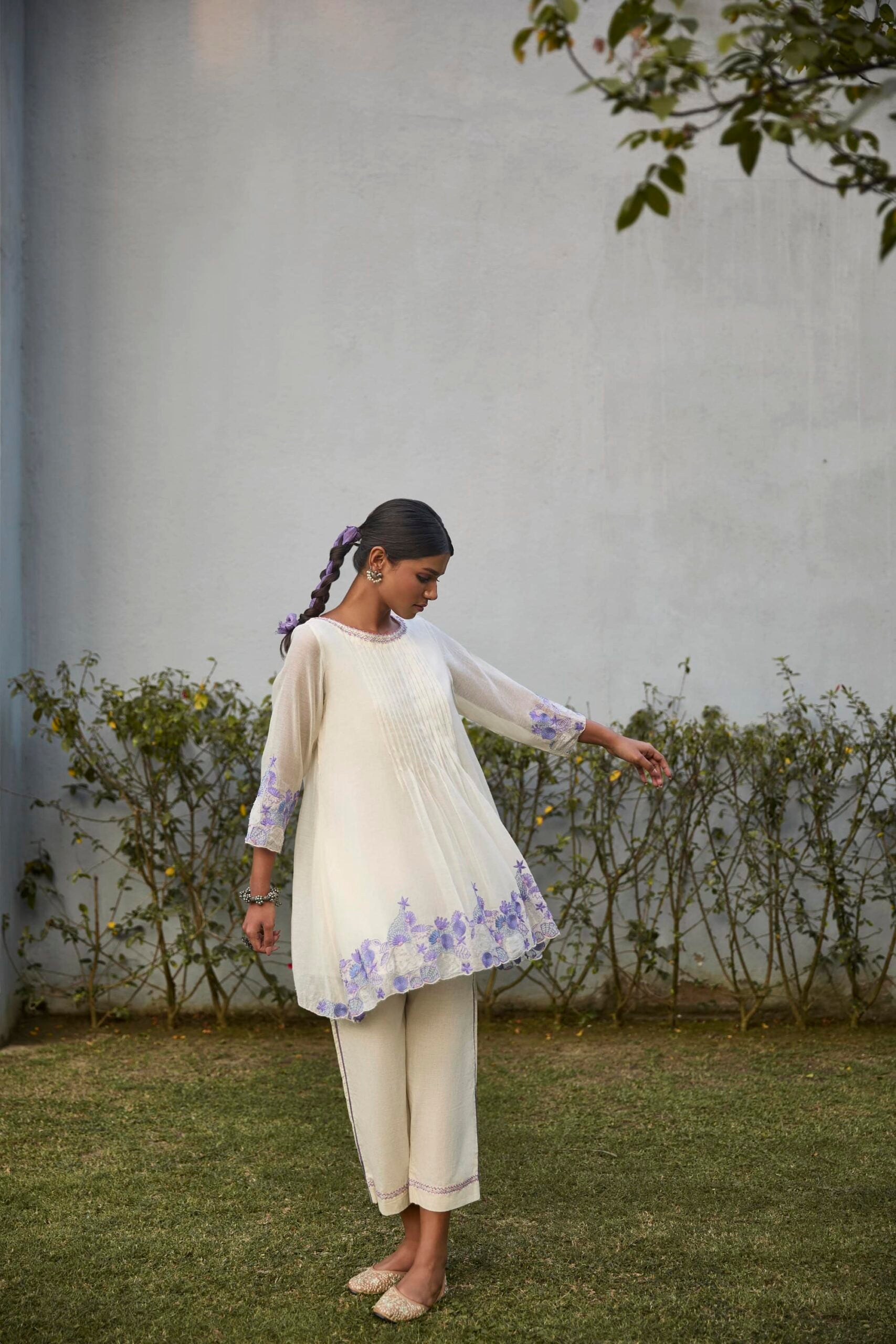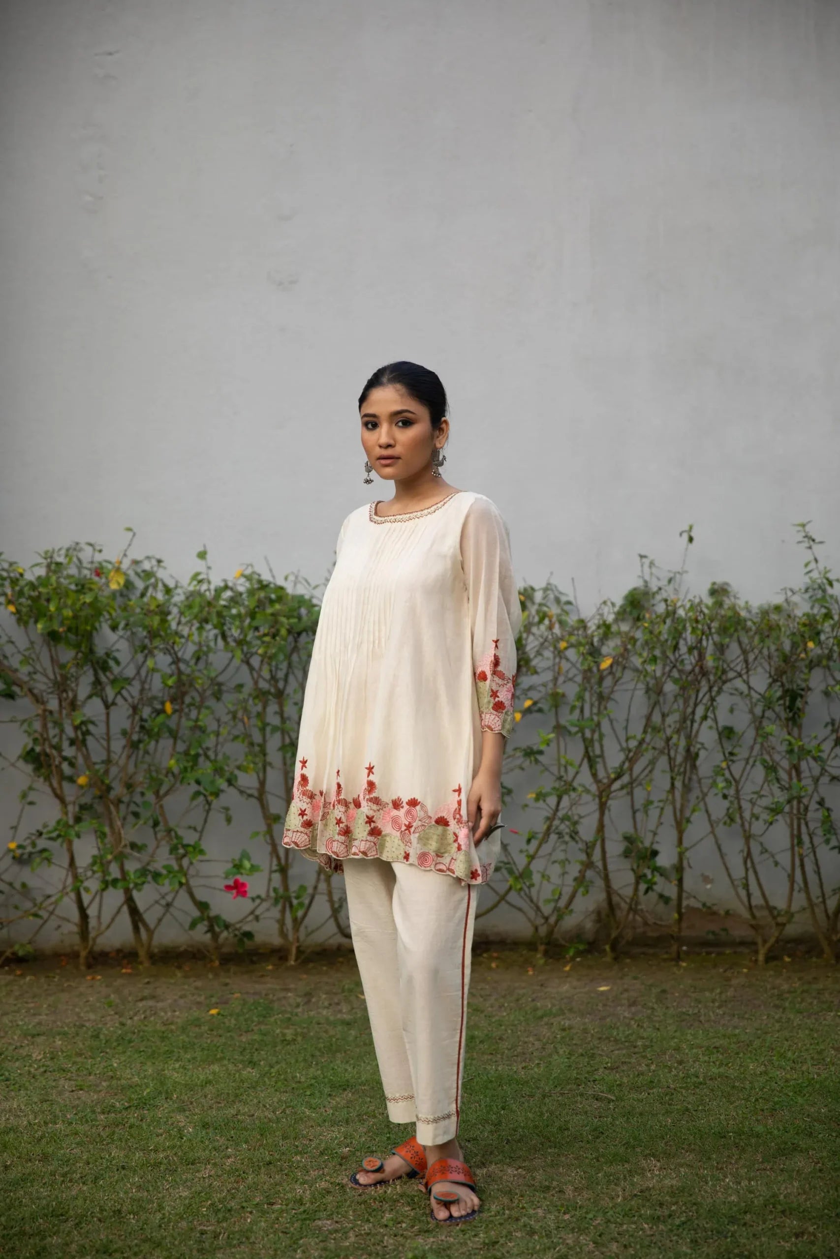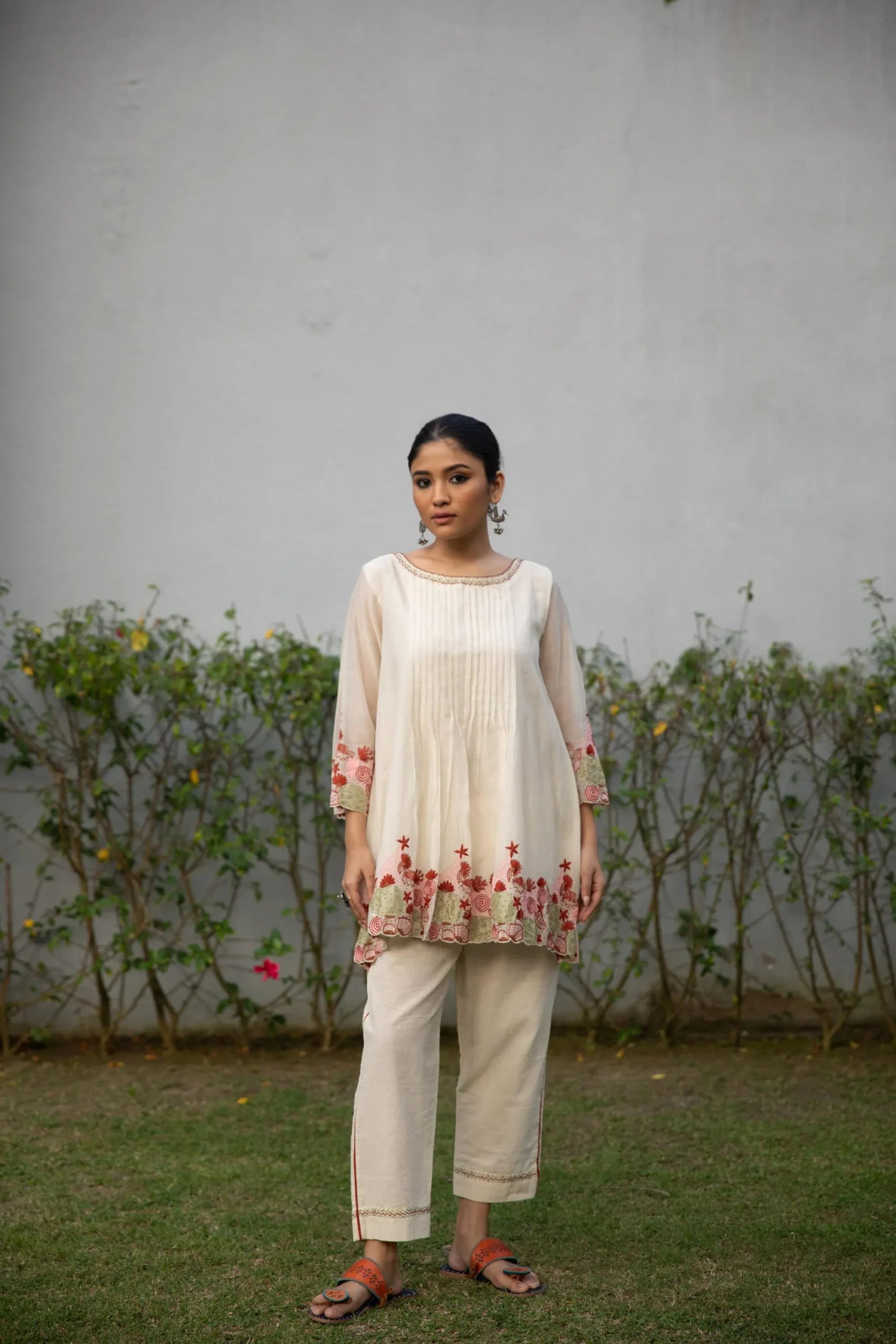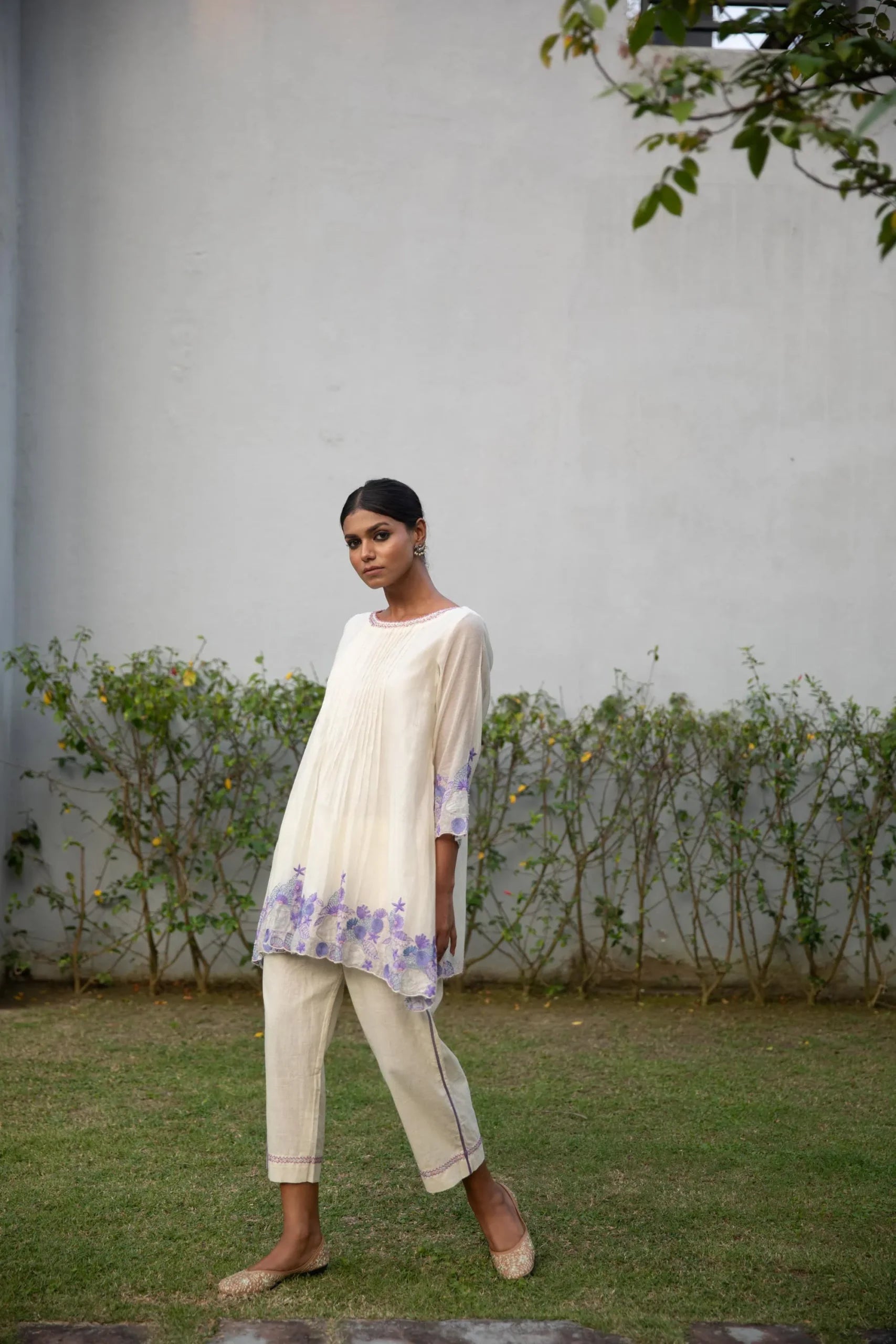 Product Description: Featuring an ivory and rust/blue short tunic in handwoven cotton silk with hand embroidery. It is paired with Handwoven cotton straight pant. Accentuate it with minimal jewelry and heels for a complete look.