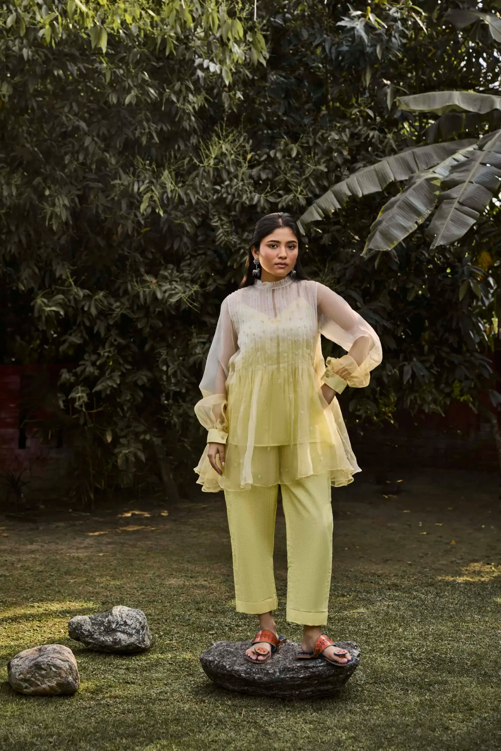 Product Description: Featuring a Rust/Ivory or Yellow/Ivory tunic in handwoven organza base with French knot detailing. It is paired with handwoven striped cotton trousers and an inner. Accentuate it with minimal jewelry and heels for a complete look.