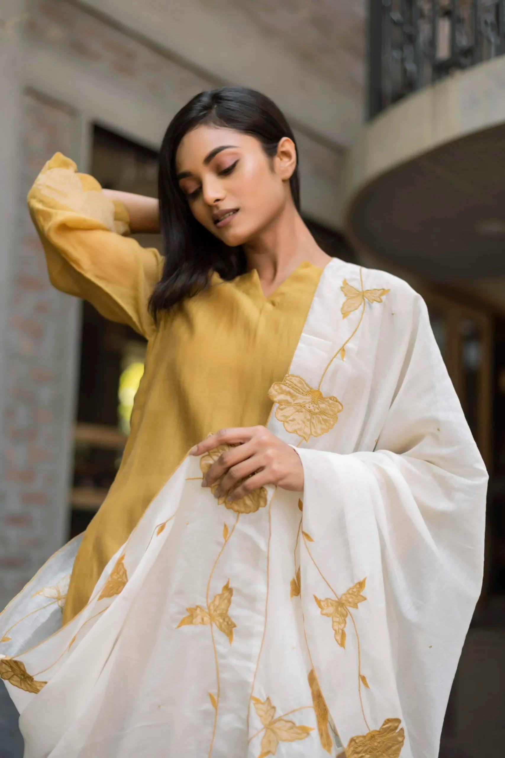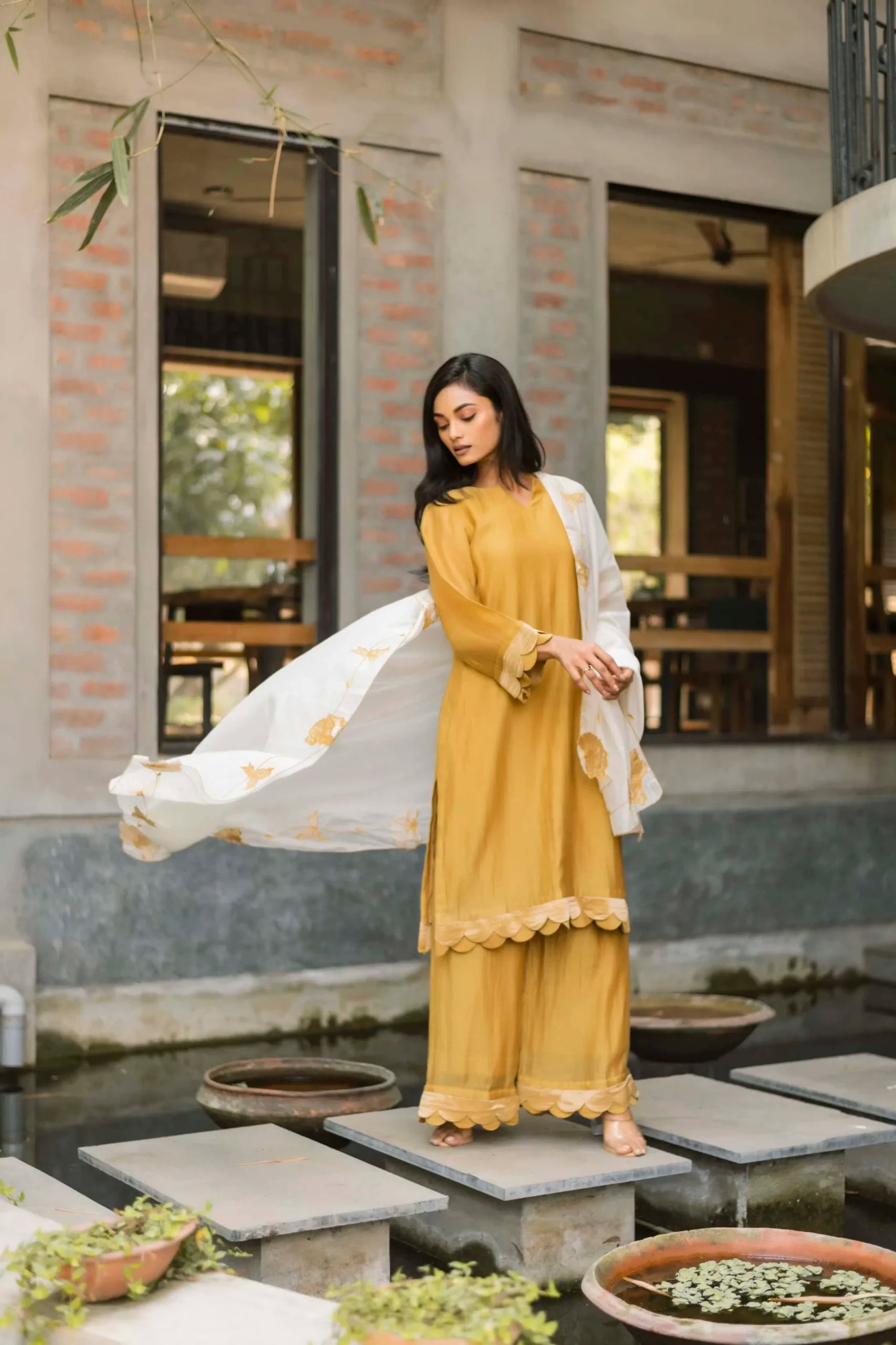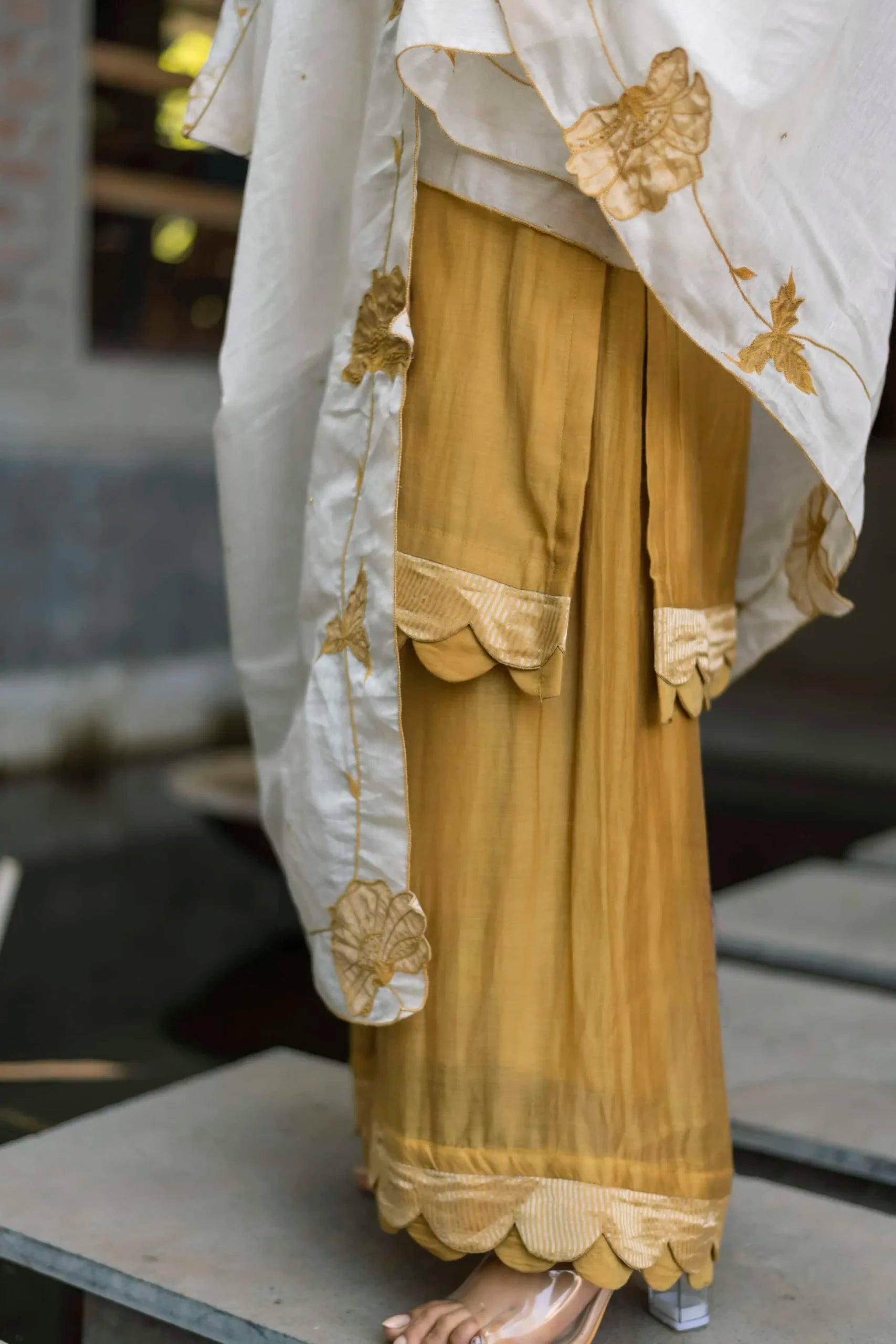 Product Description: Honey handwoven malai chanderi kurta with scalloped detailing on borders. Comes with flared pant.